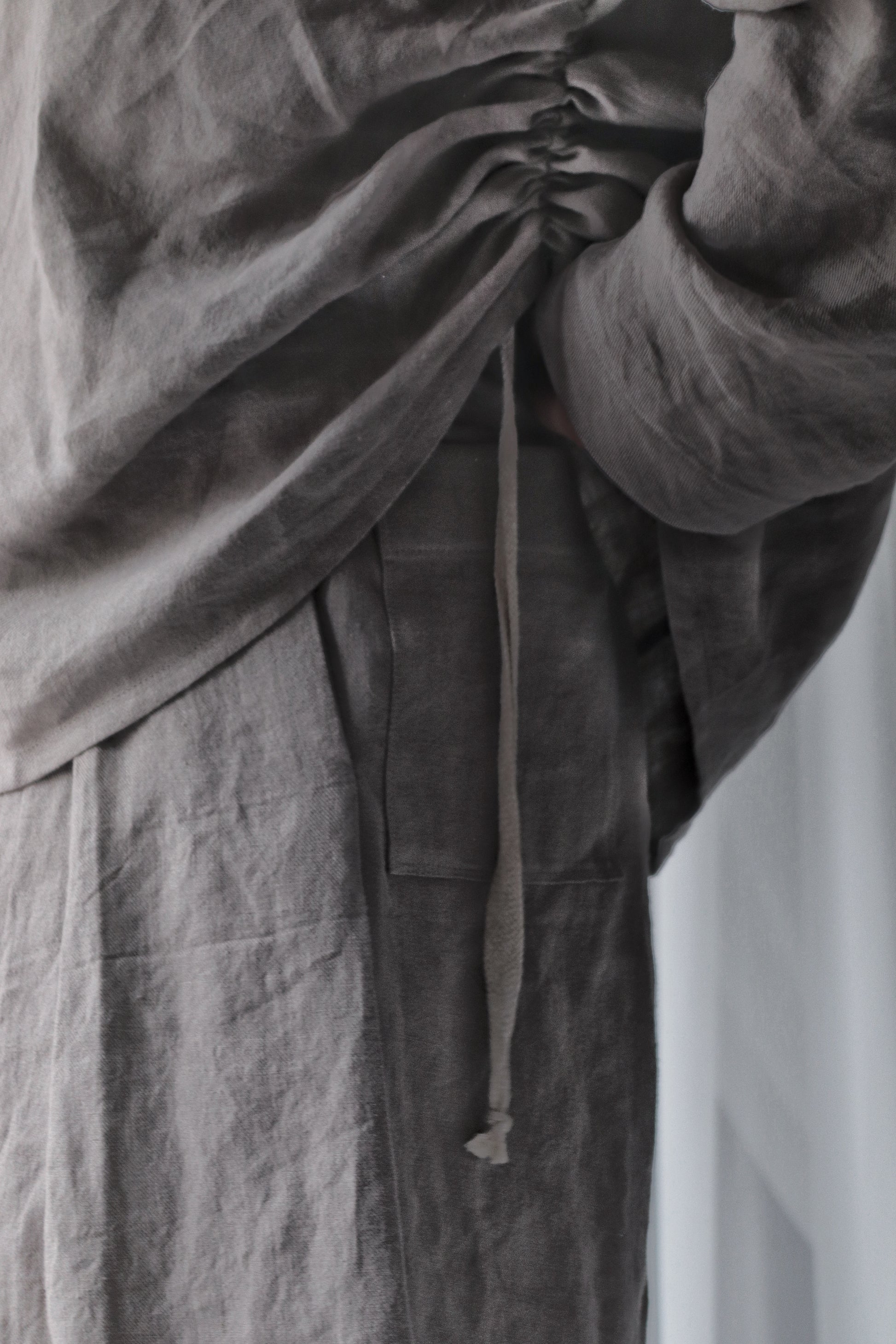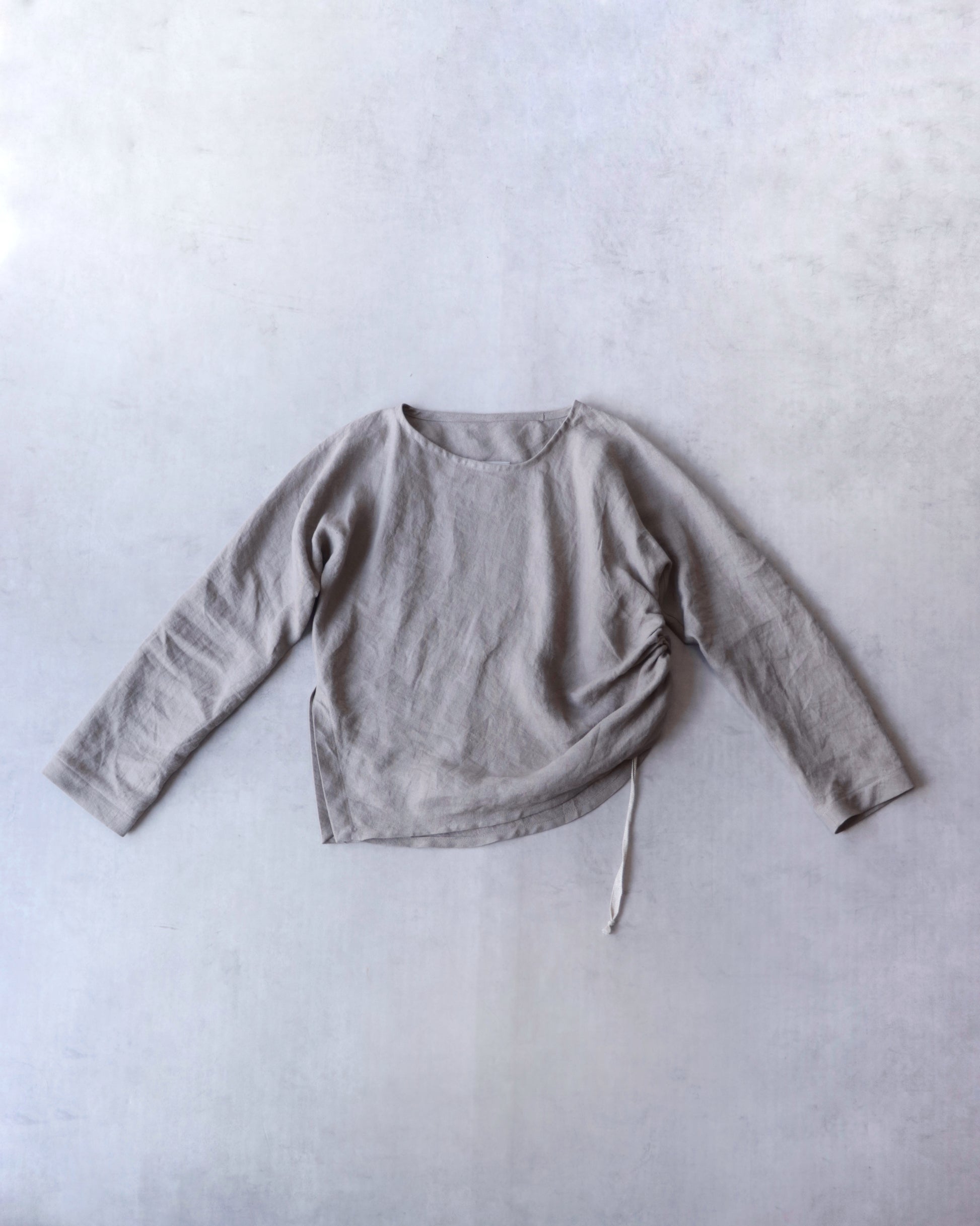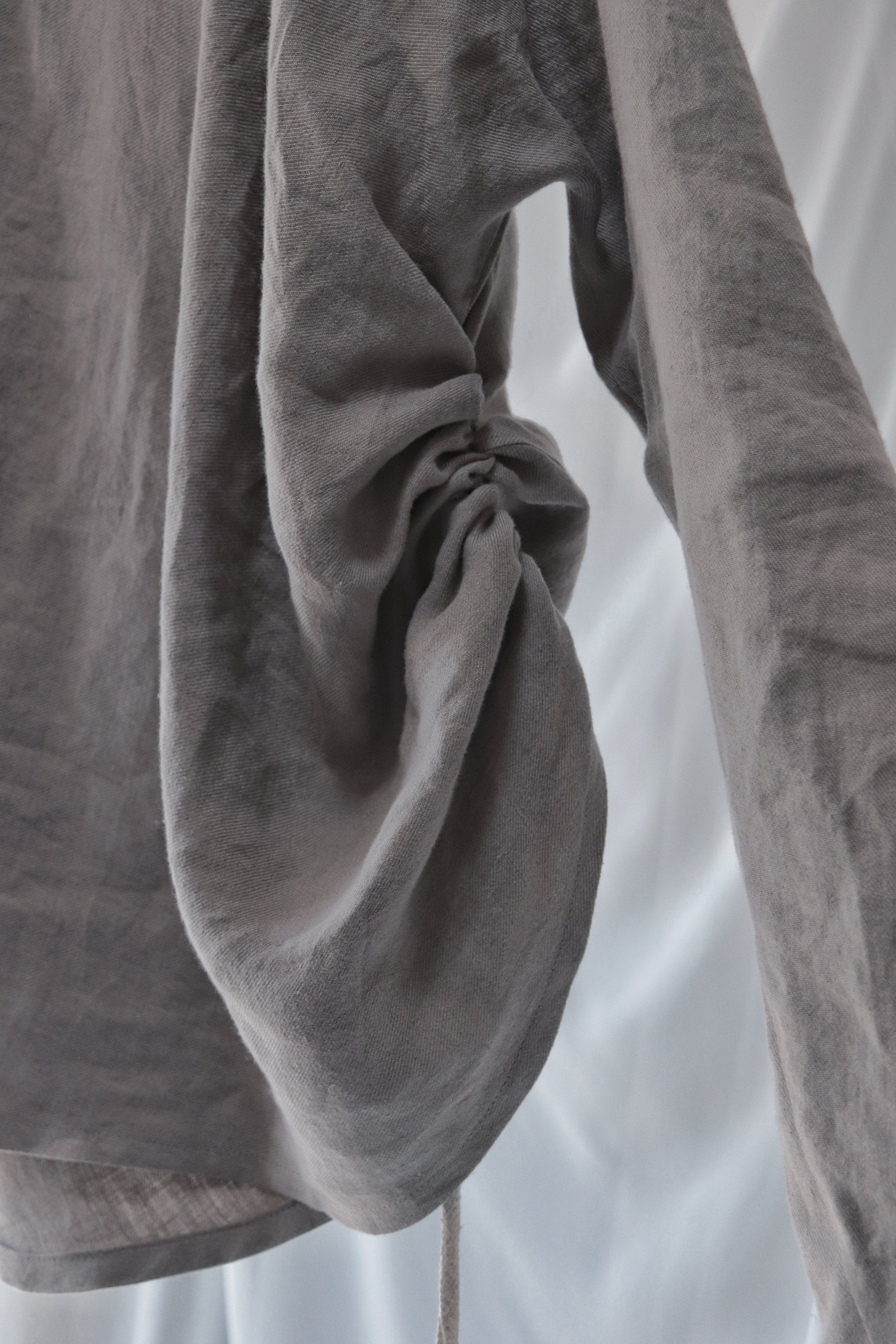 右脇は僅かなスリットがあり、左脇は通してある紐を絞ることでドレープが生まれます。