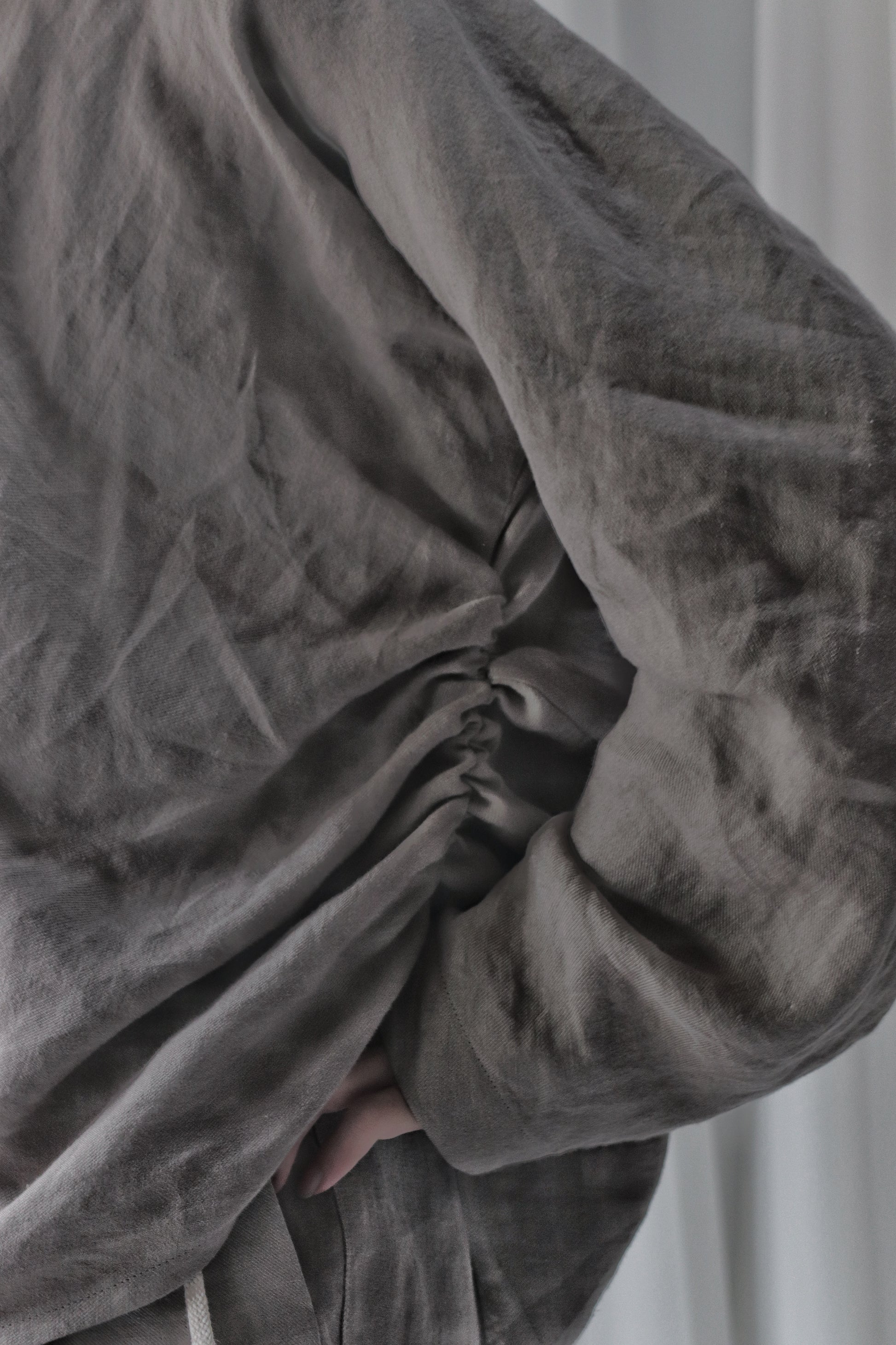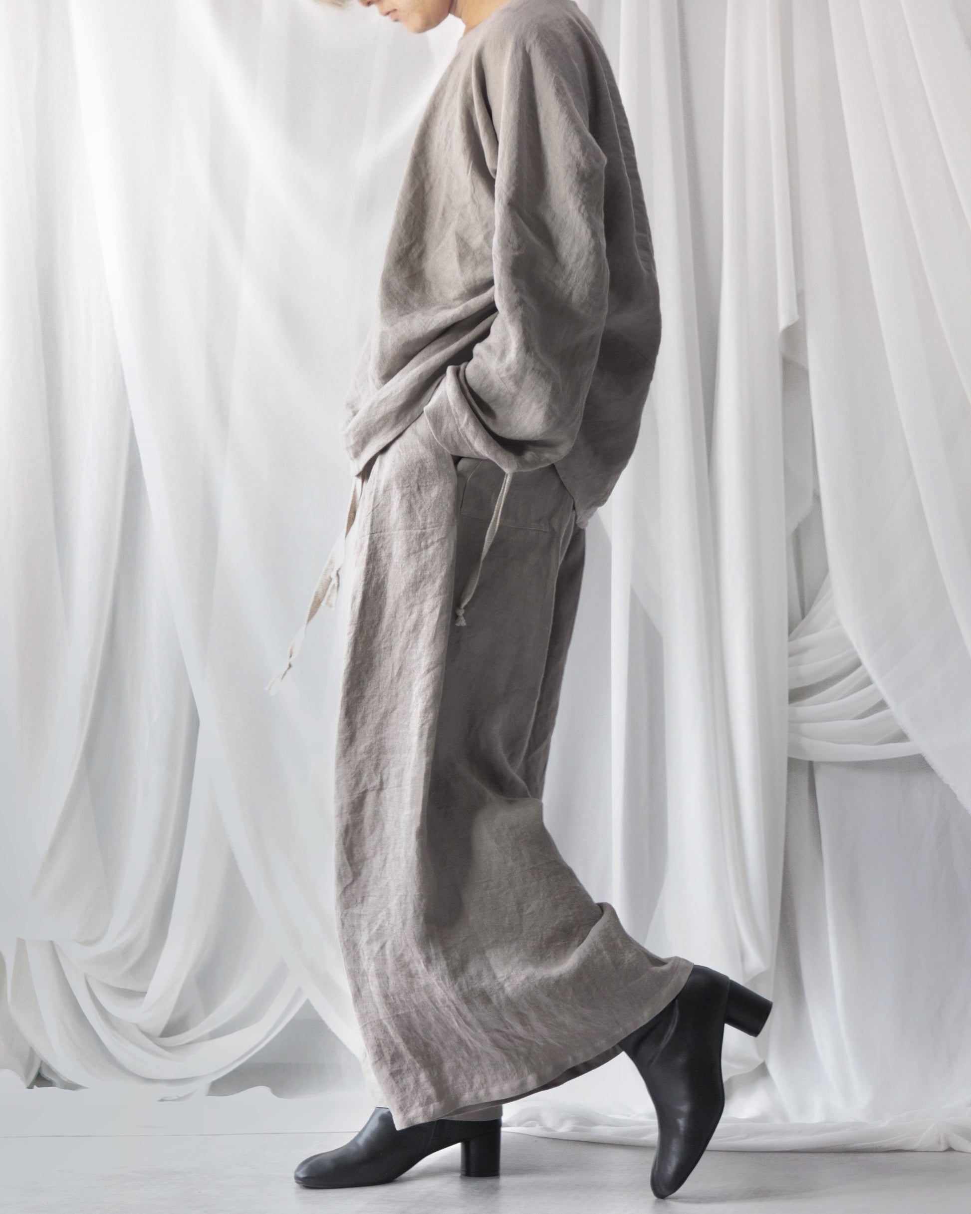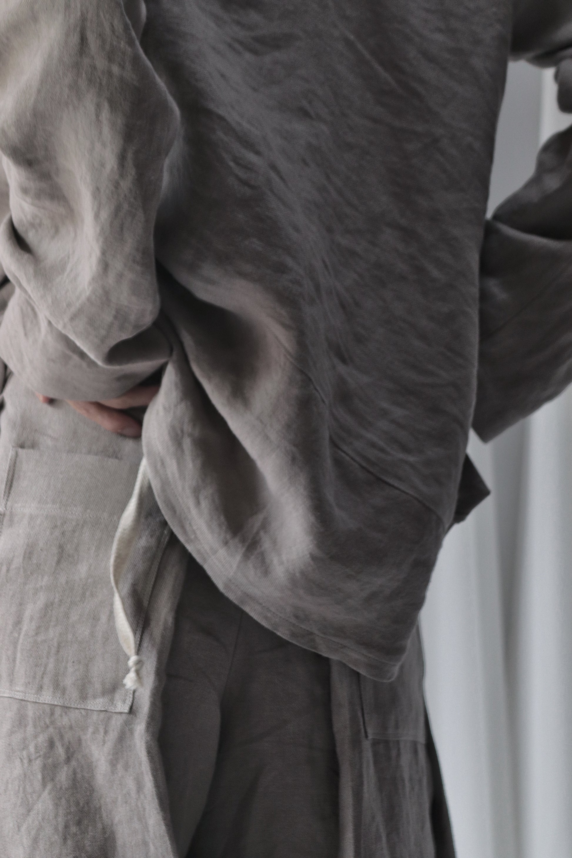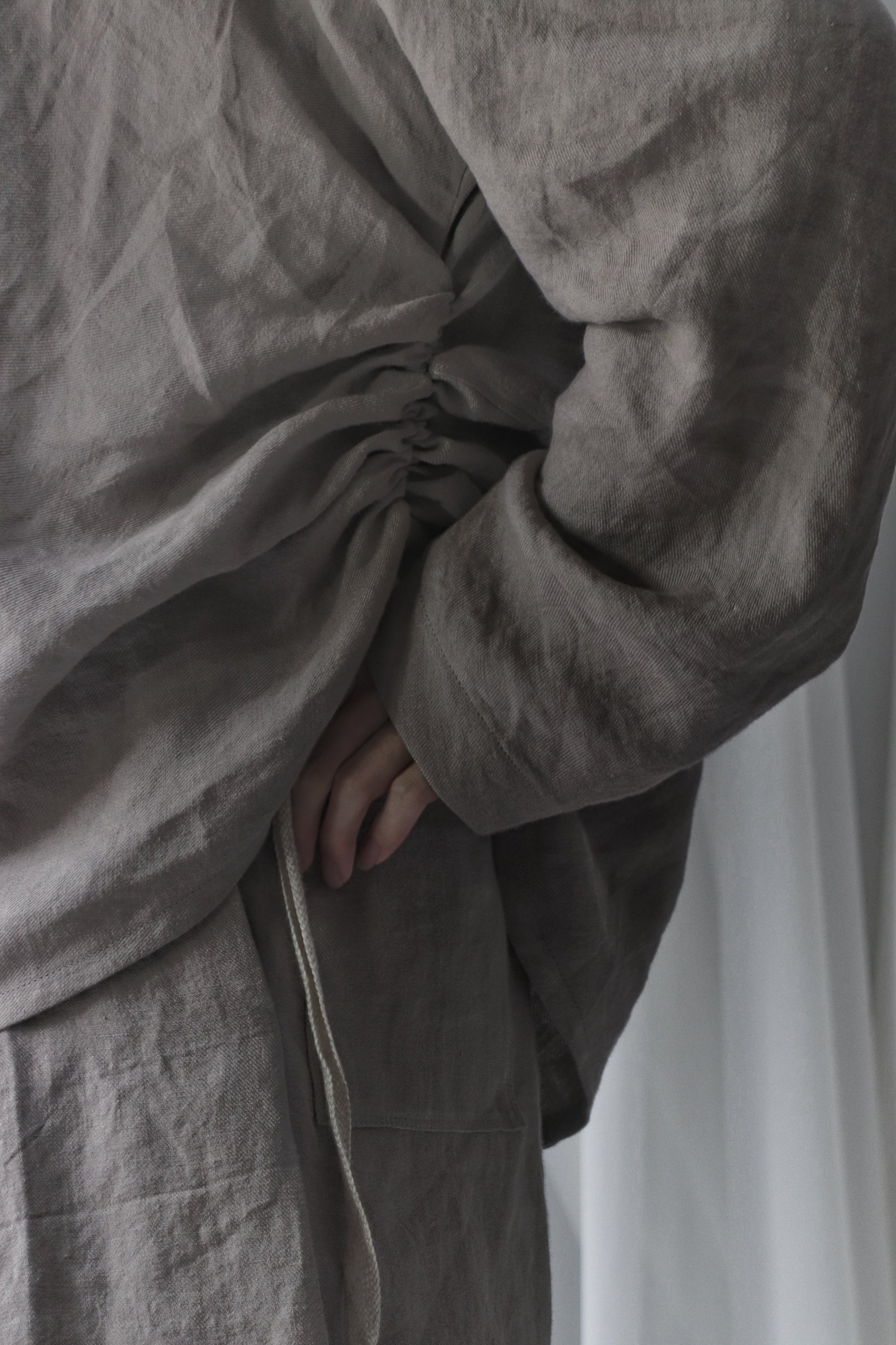右脇は僅かなスリットがあり、左脇は通してある紐を絞ることでドレープが生まれます。