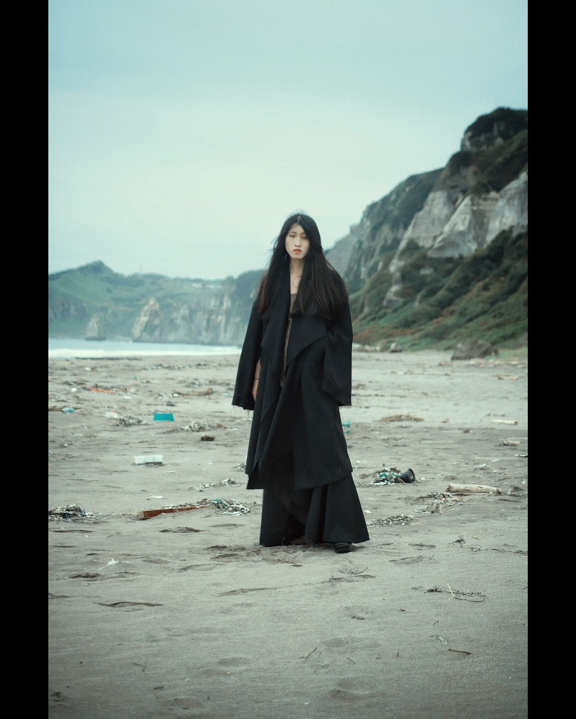 Likewise, the right front panel is also double-layered with wool and linen, finished with raw edges.