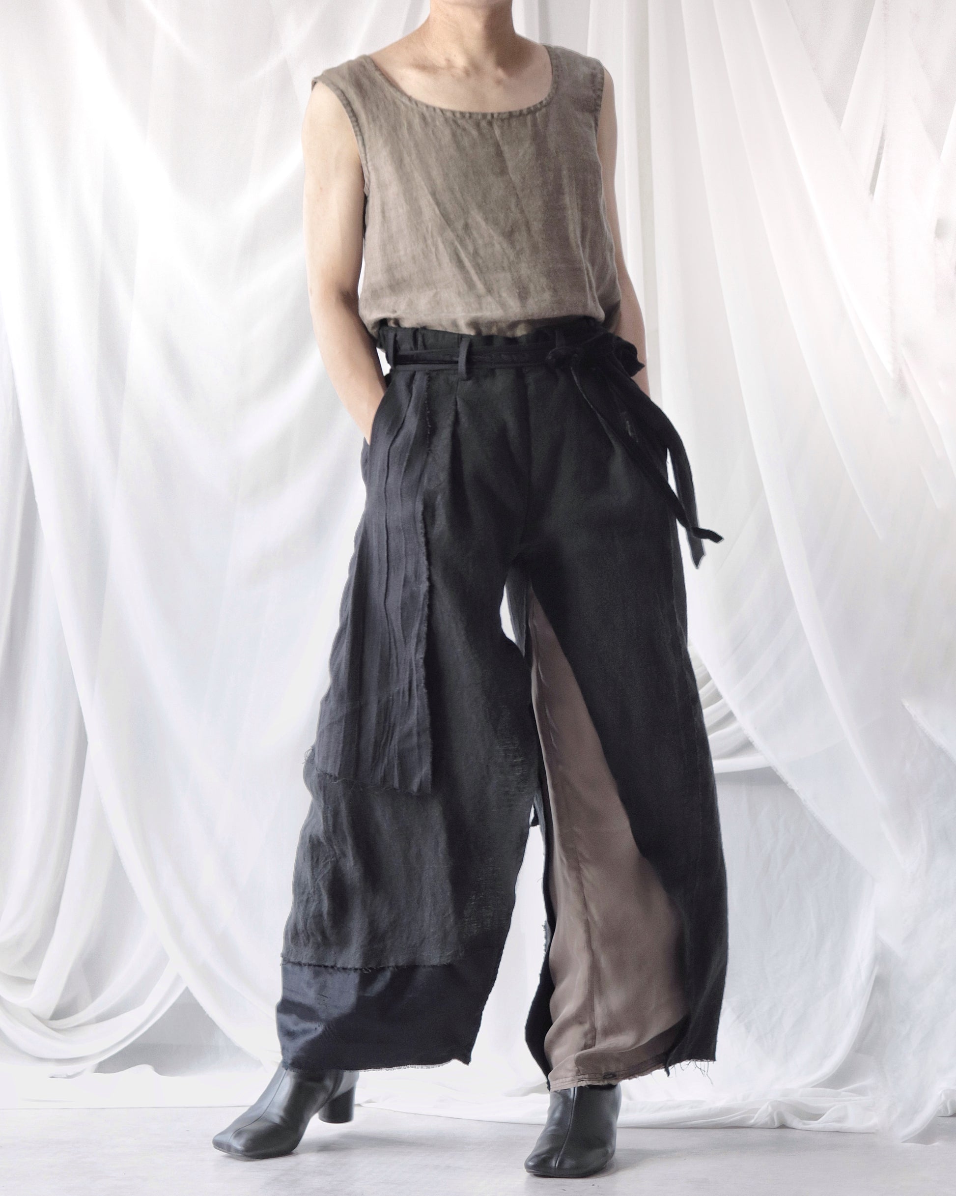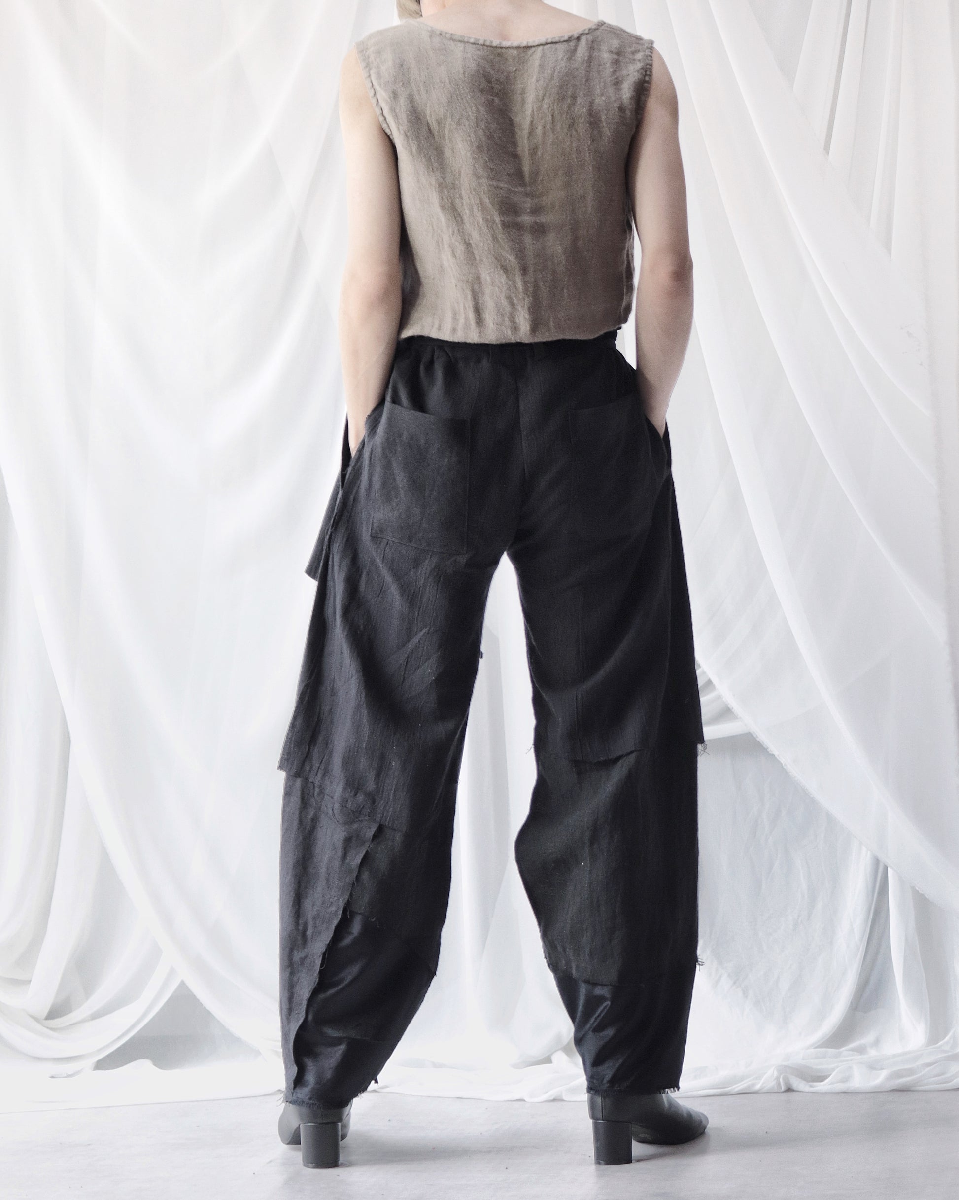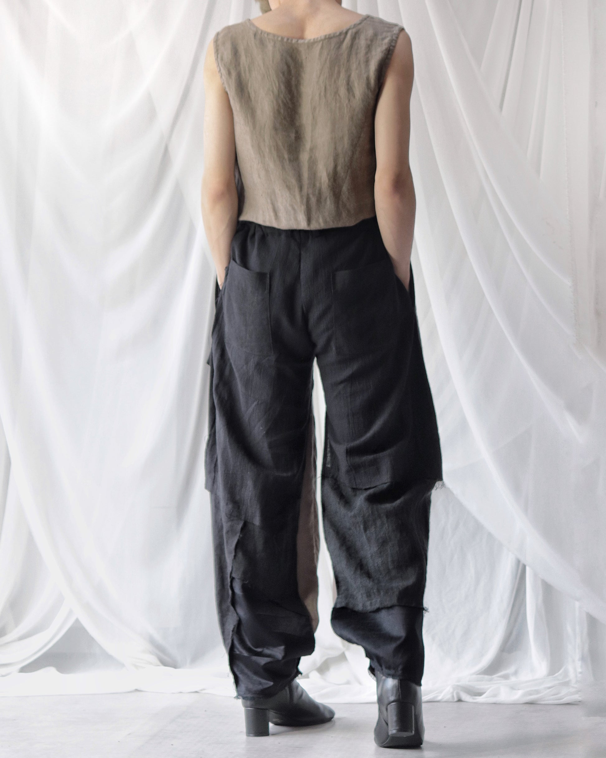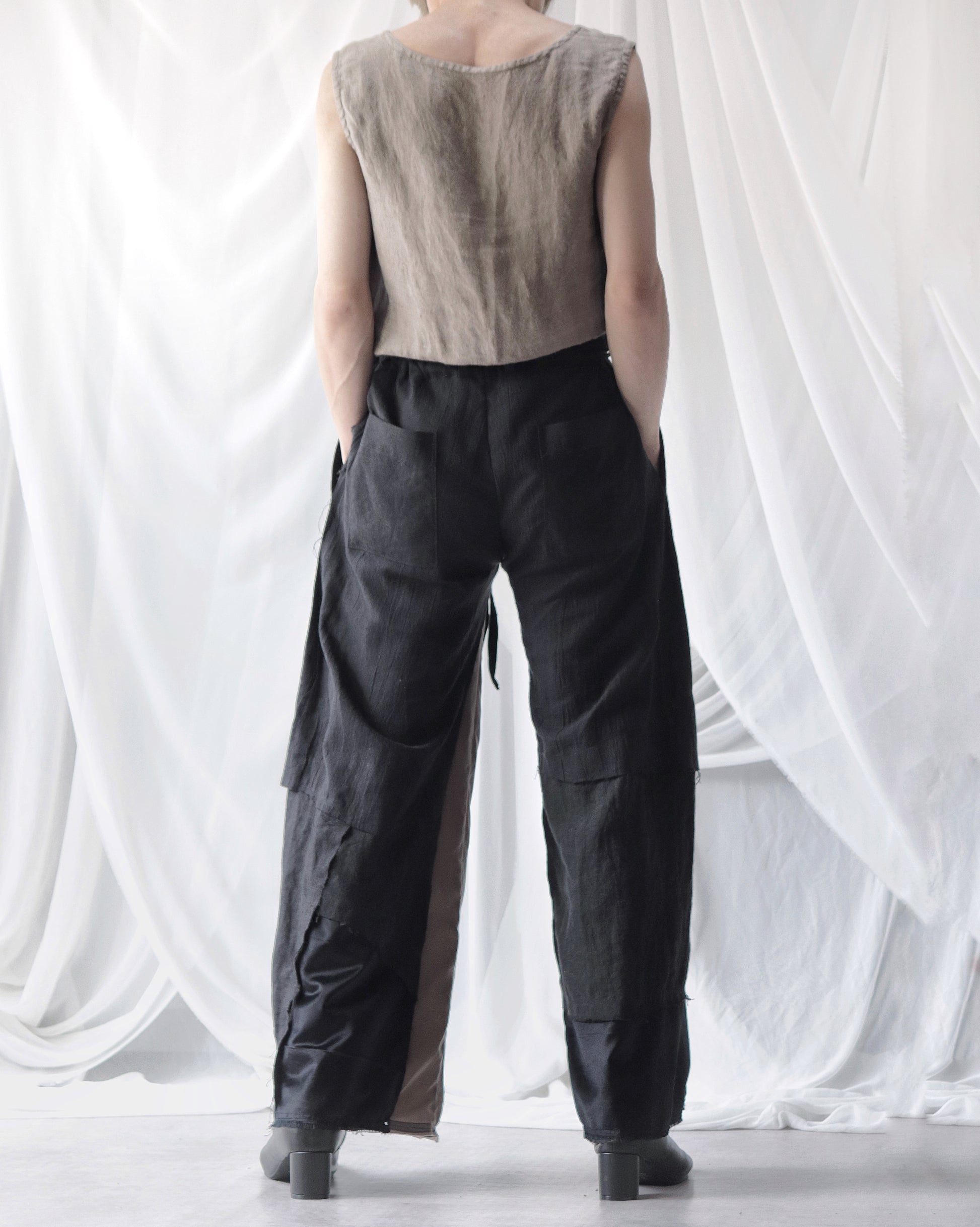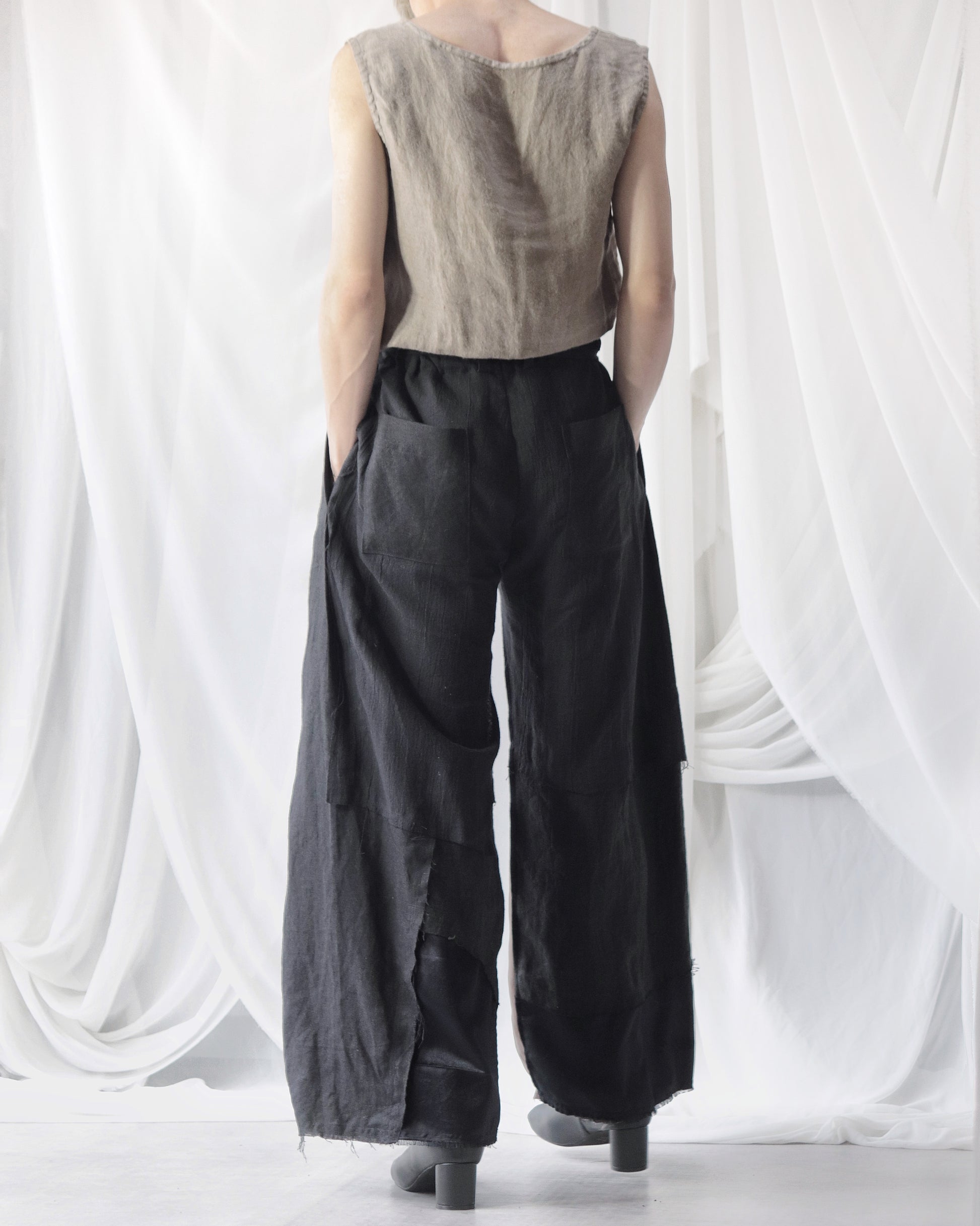Made from patchworked remnants of cotton, cotton-linen, and linen, then cut and tailored.