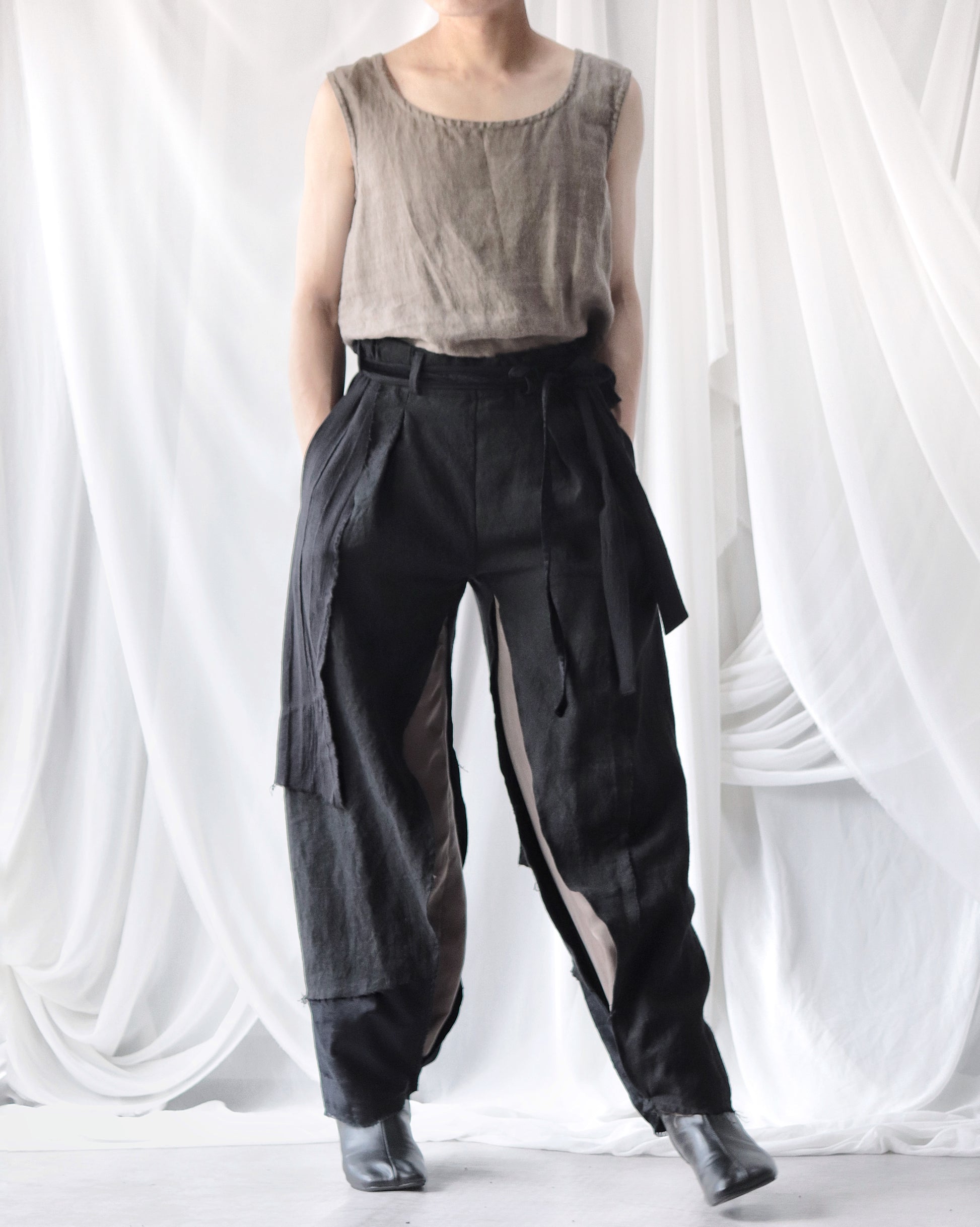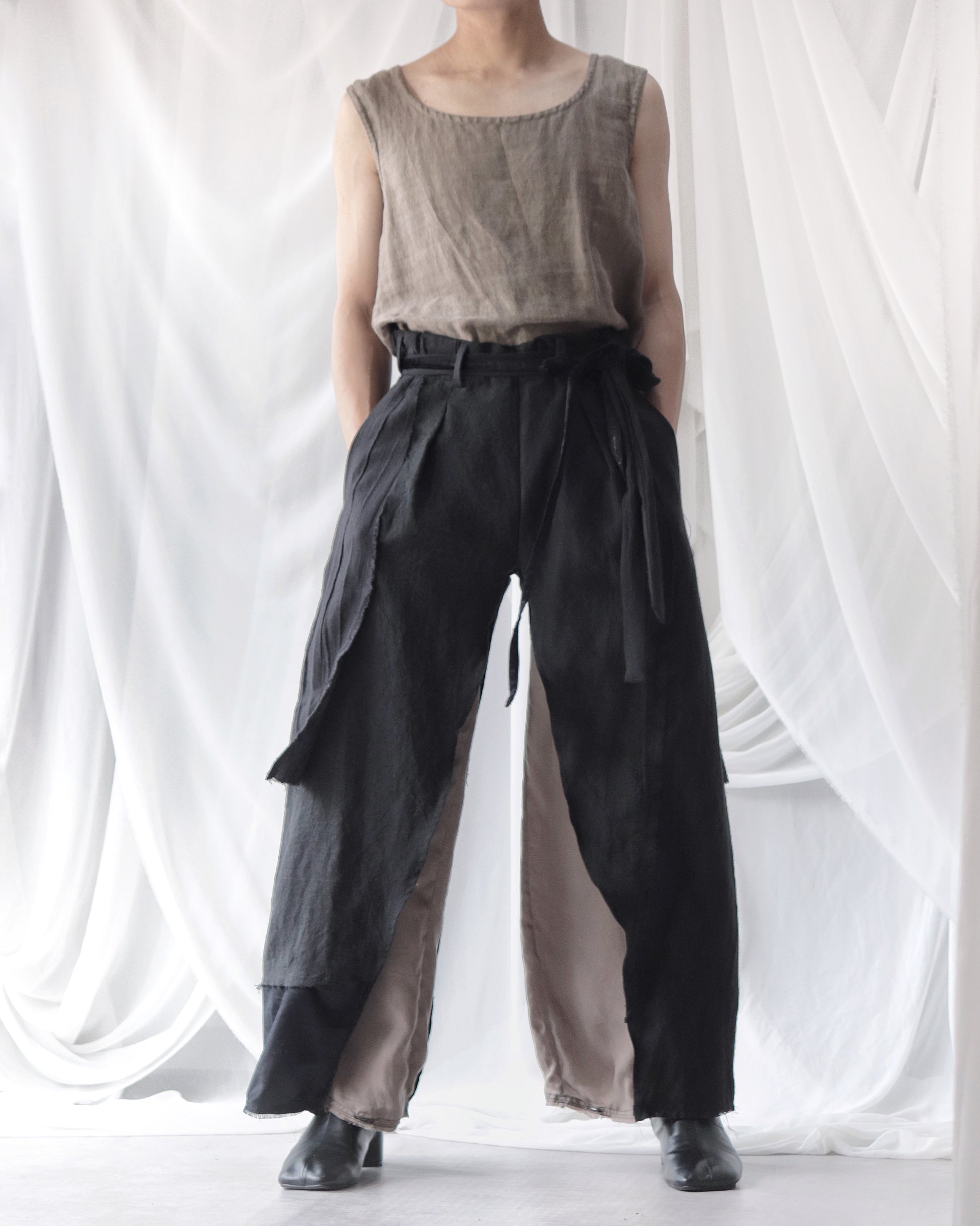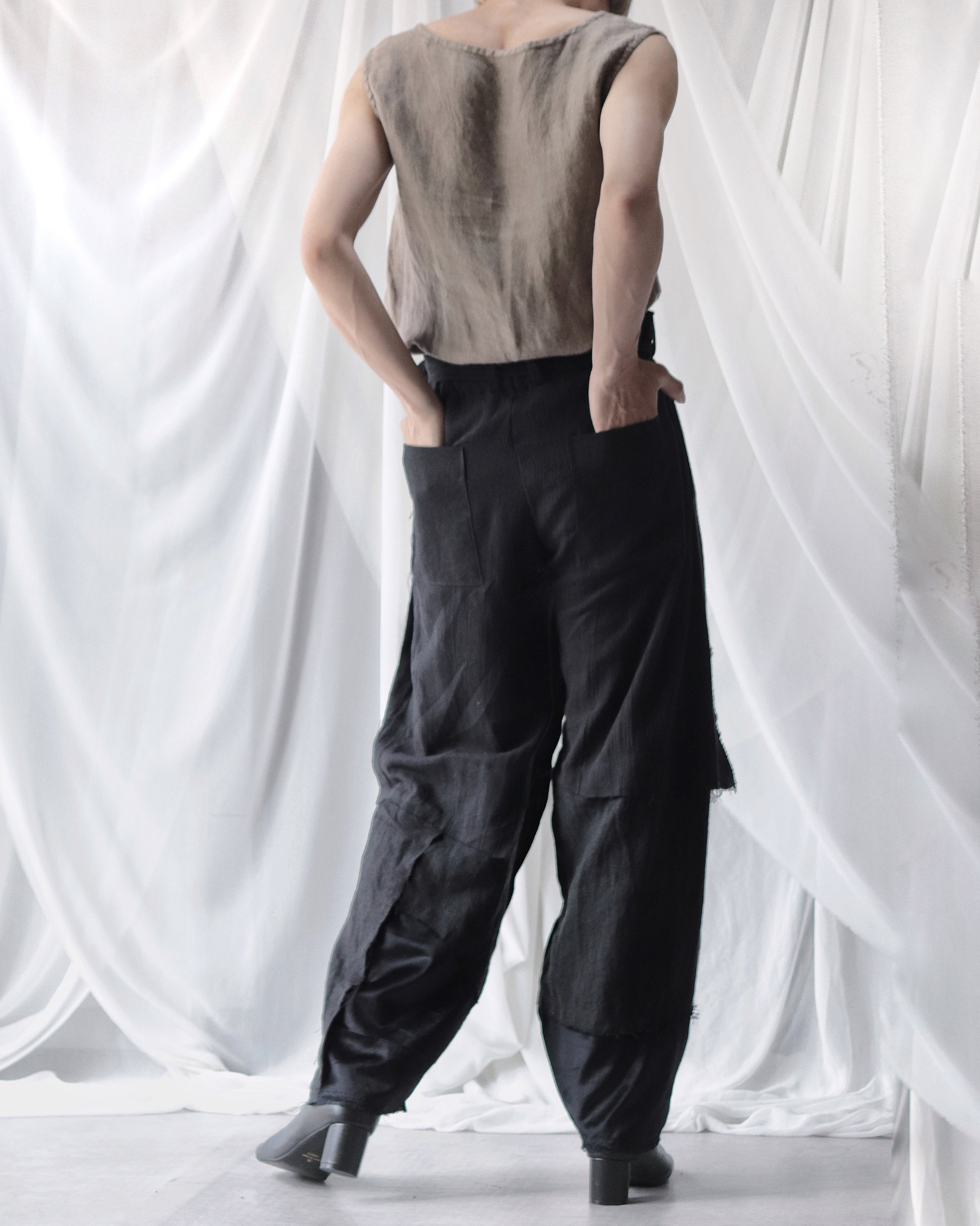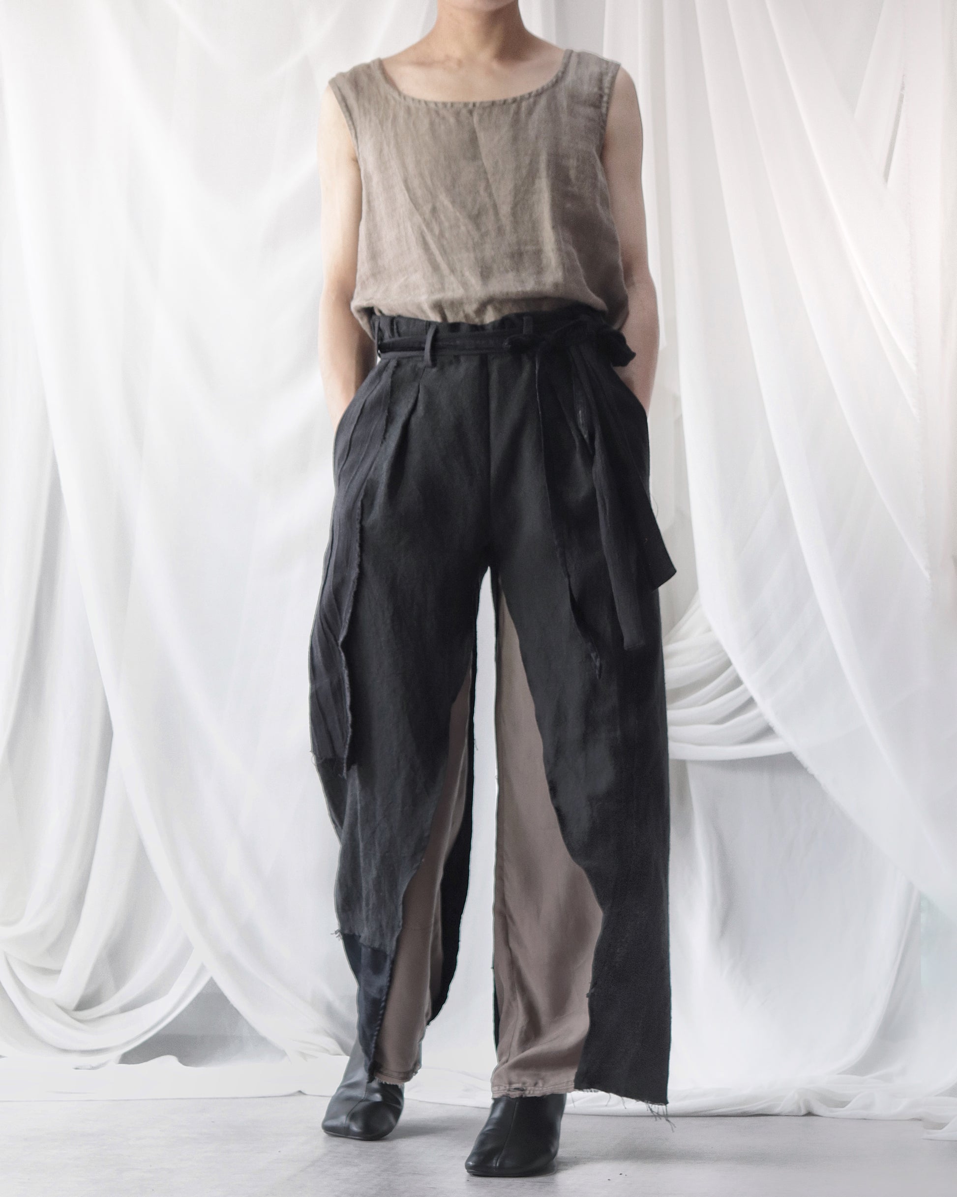 Made from patchworked remnants of cotton, cotton-linen, and linen, then cut and tailored.