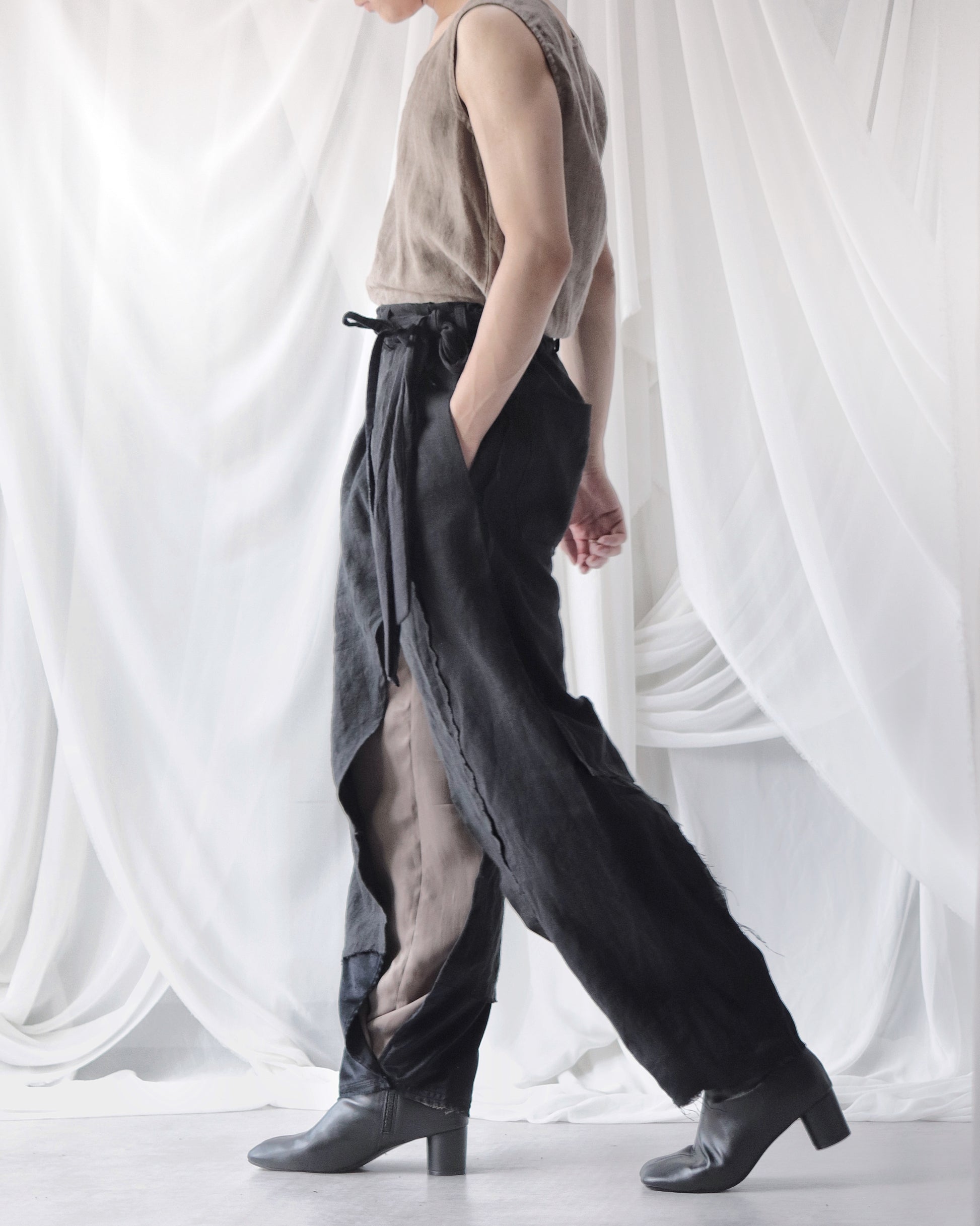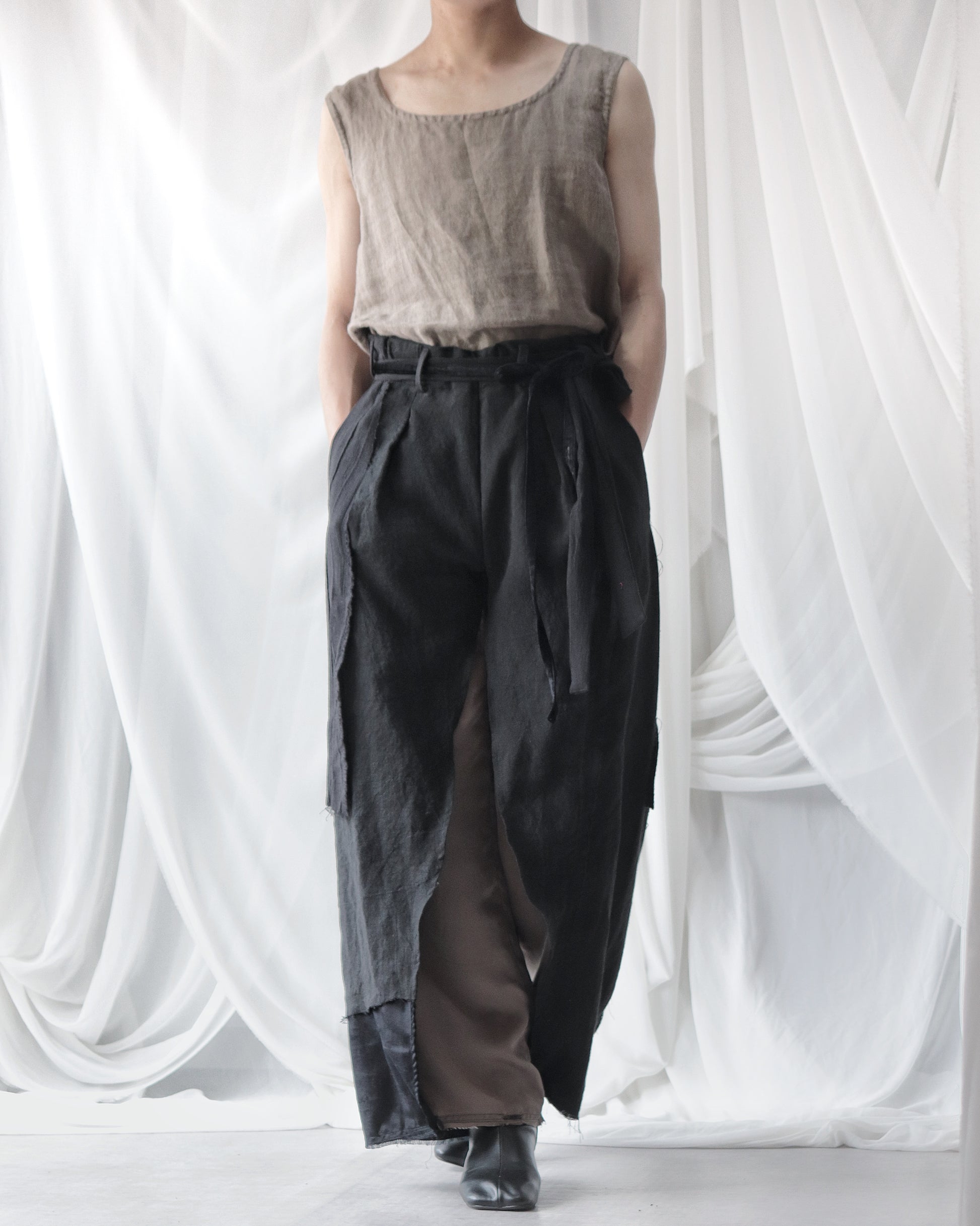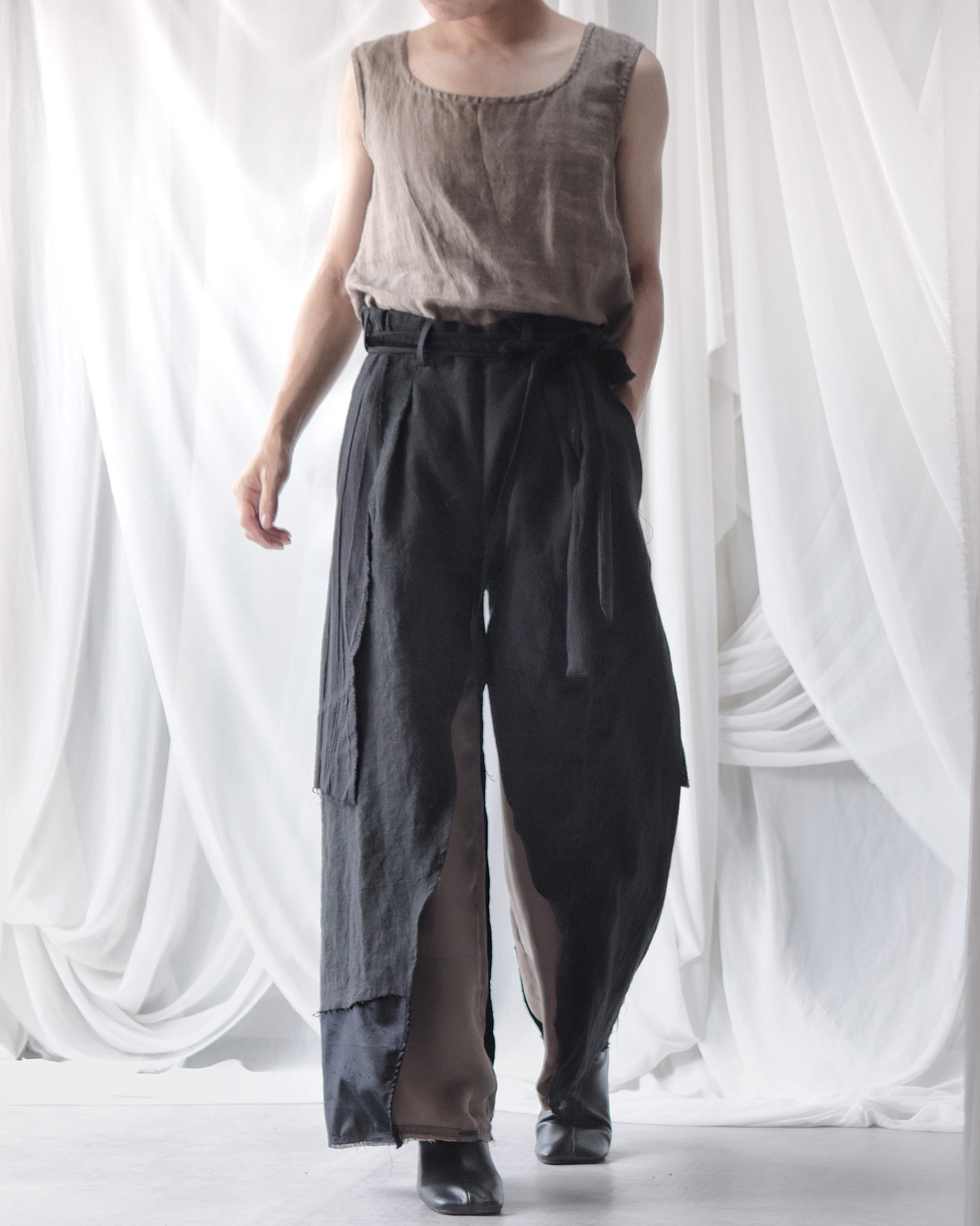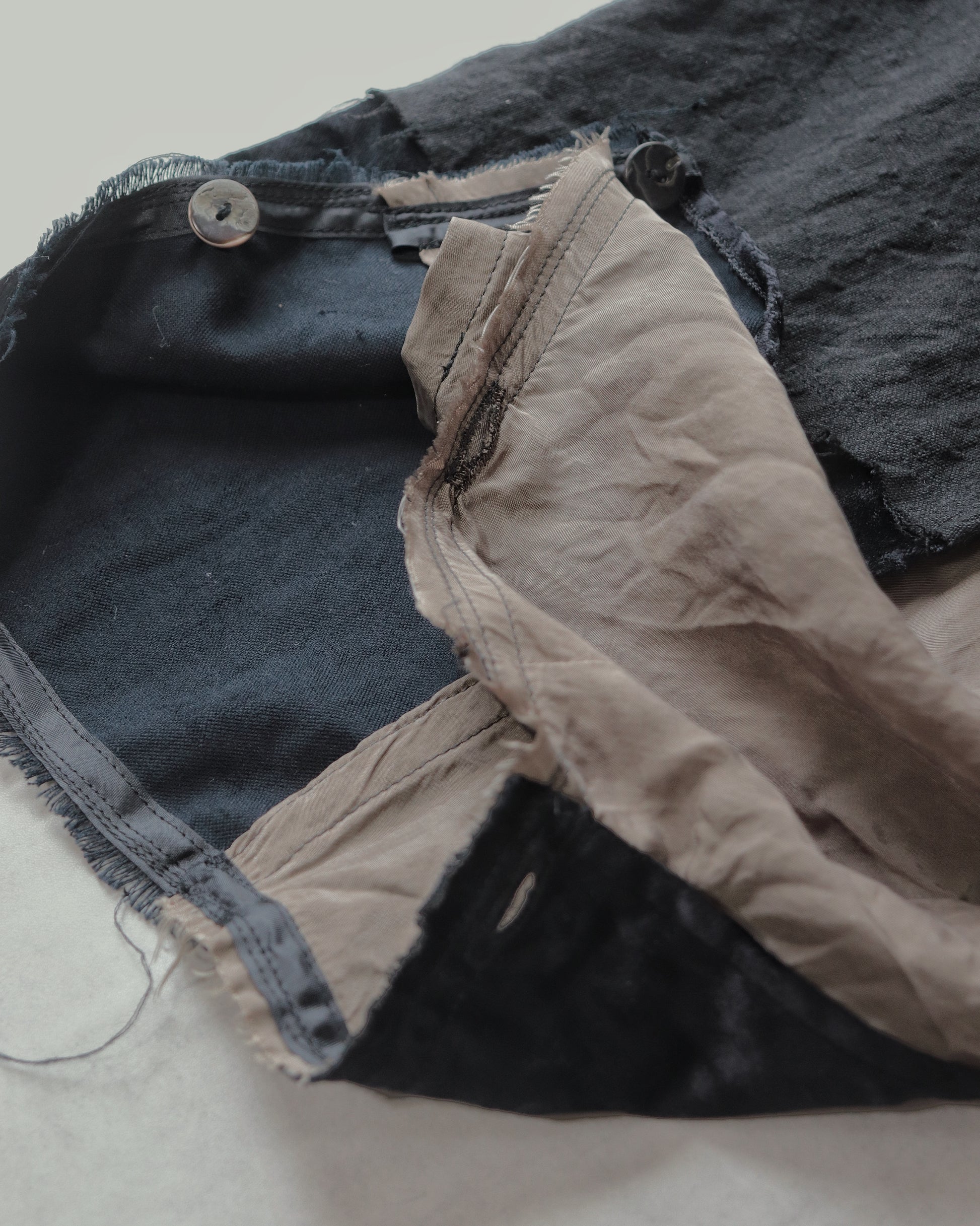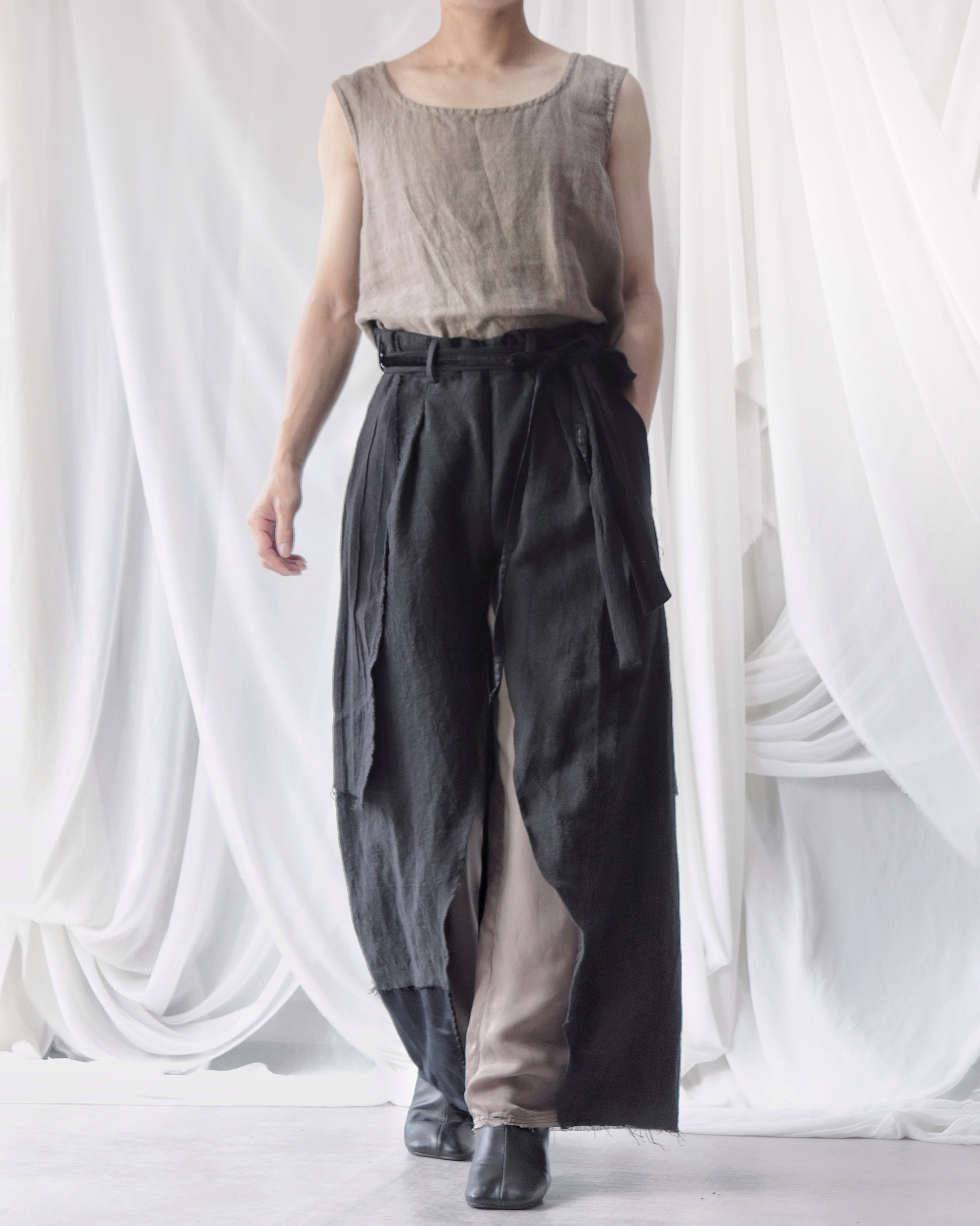 Made from patchworked remnants of cotton, cotton-linen, and linen, then cut and tailored.