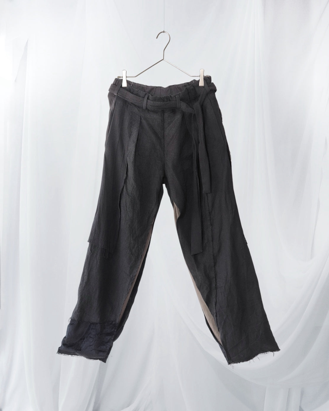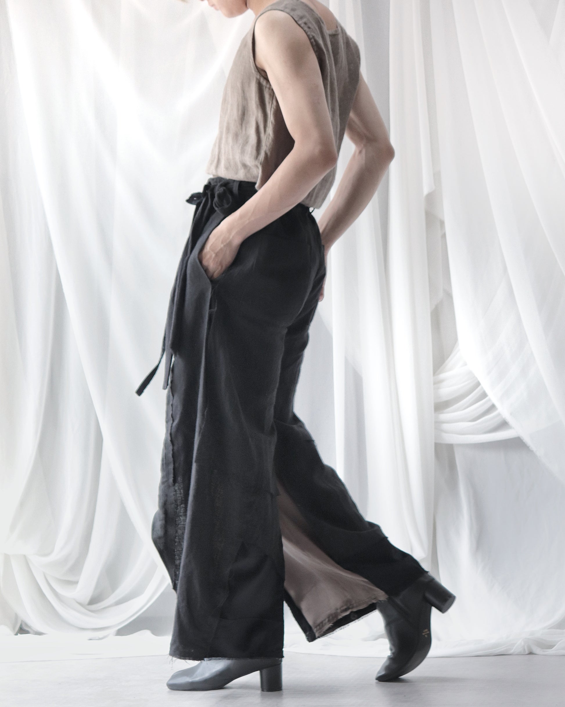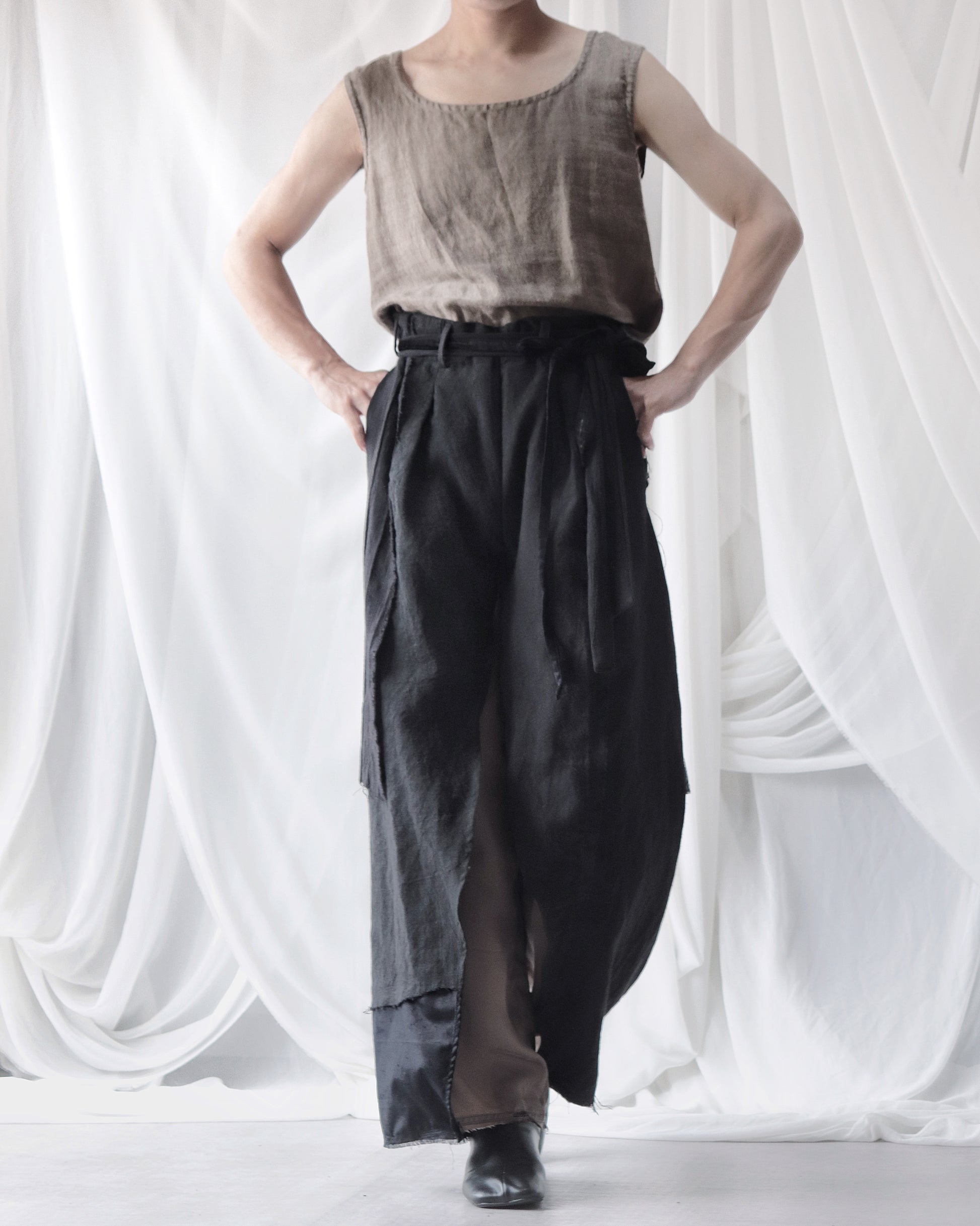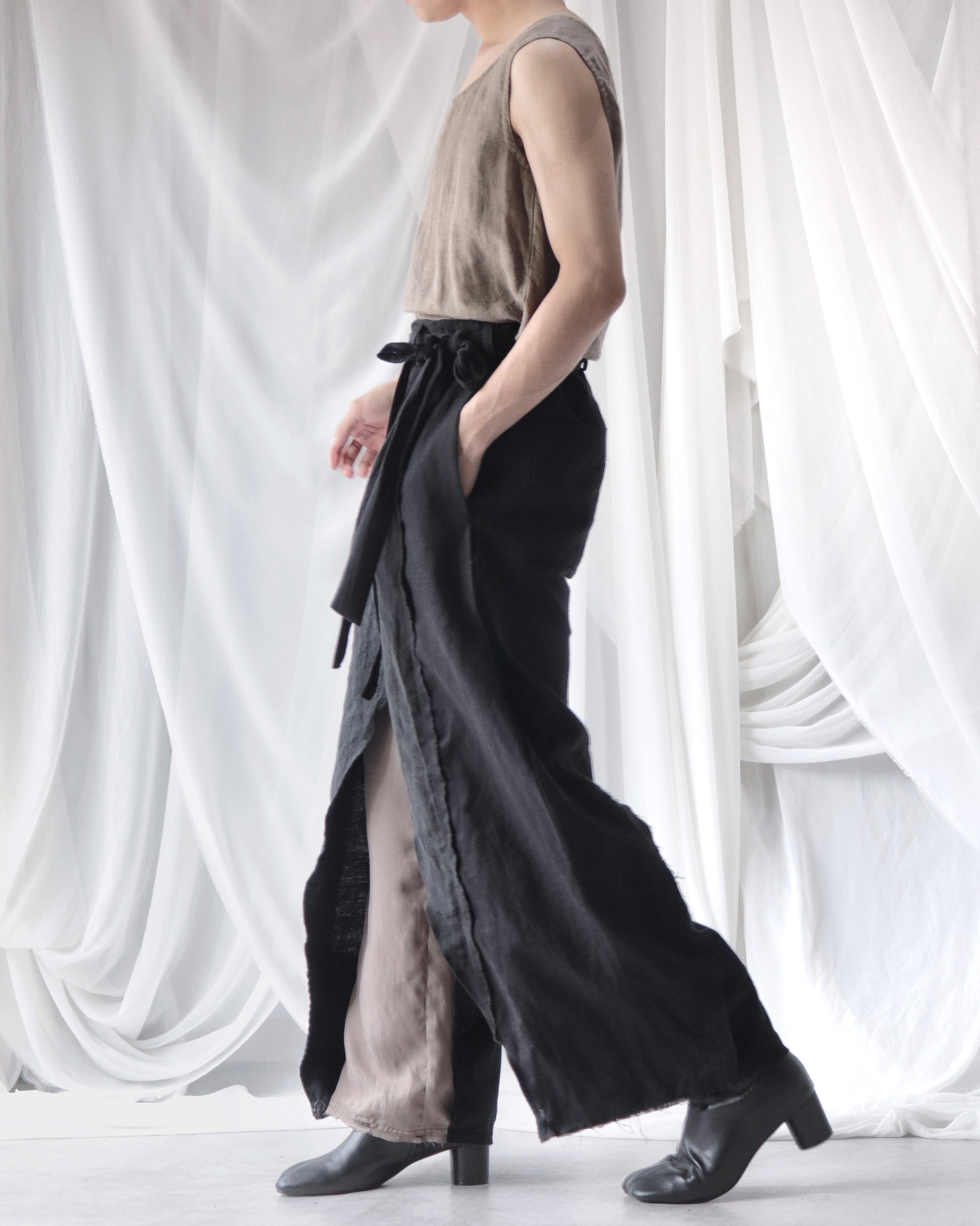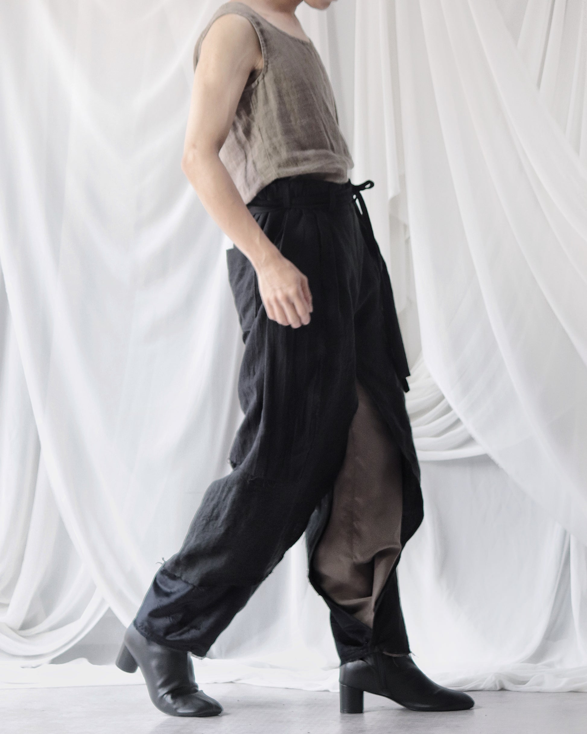 Made from patchworked remnants of cotton, cotton-linen, and linen, then cut and tailored.