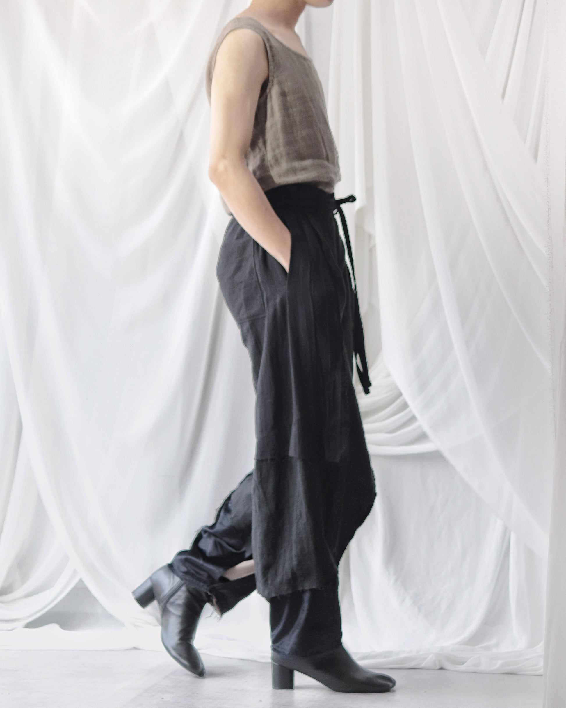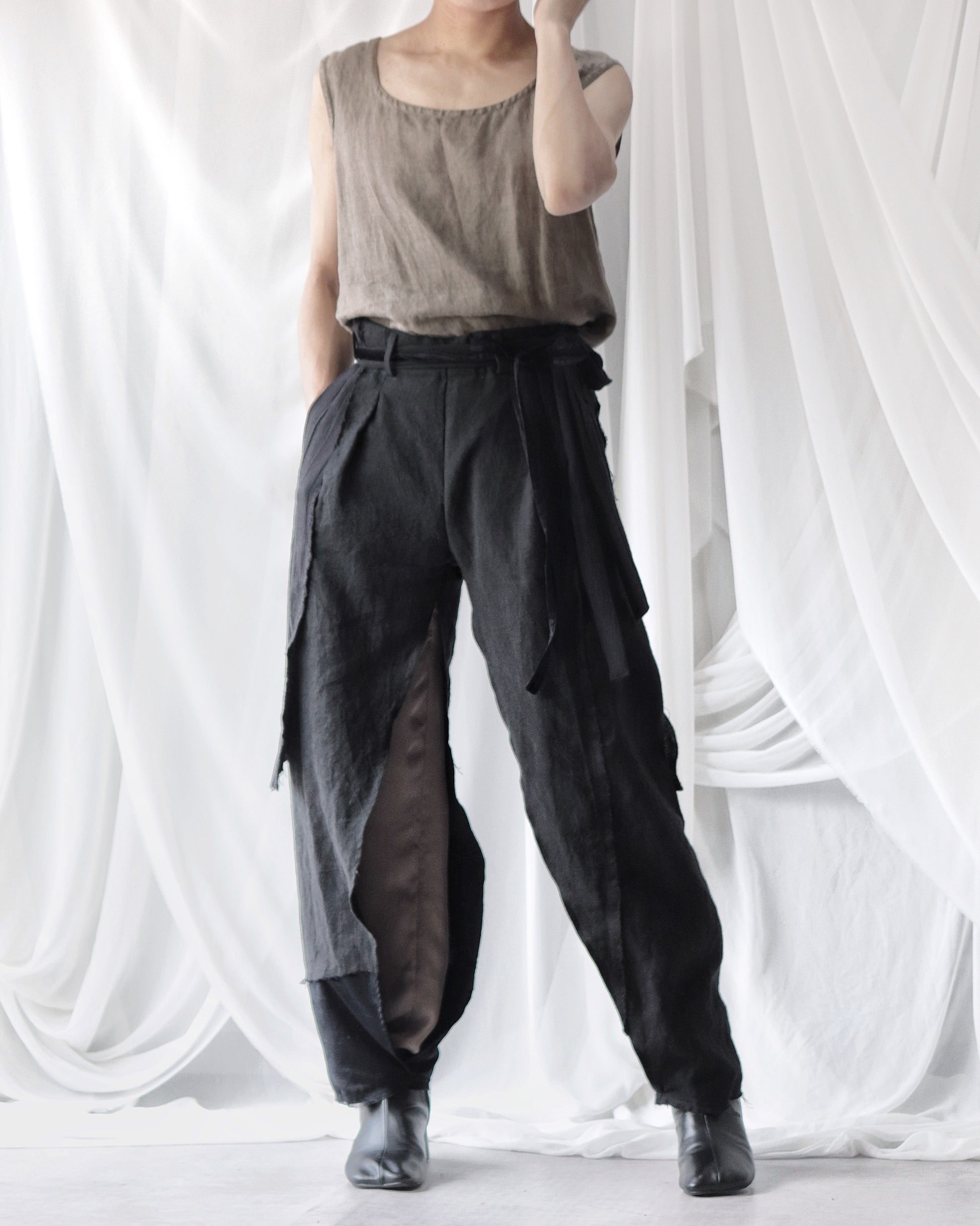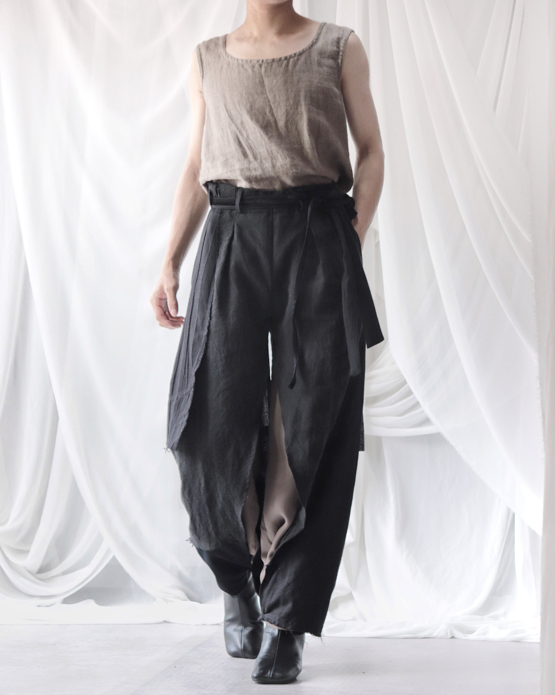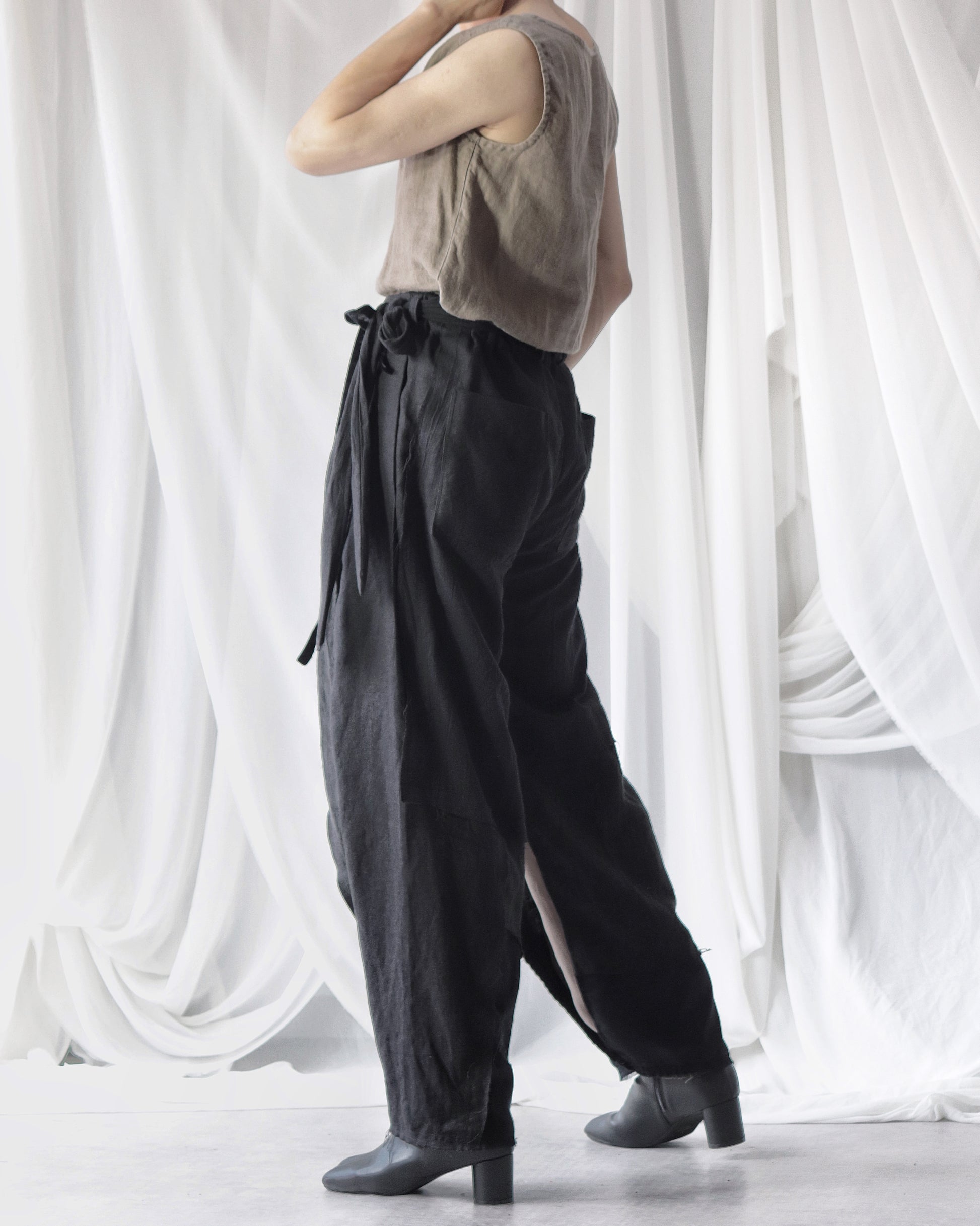 Made from patchworked remnants of cotton, cotton-linen, and linen, then cut and tailored.