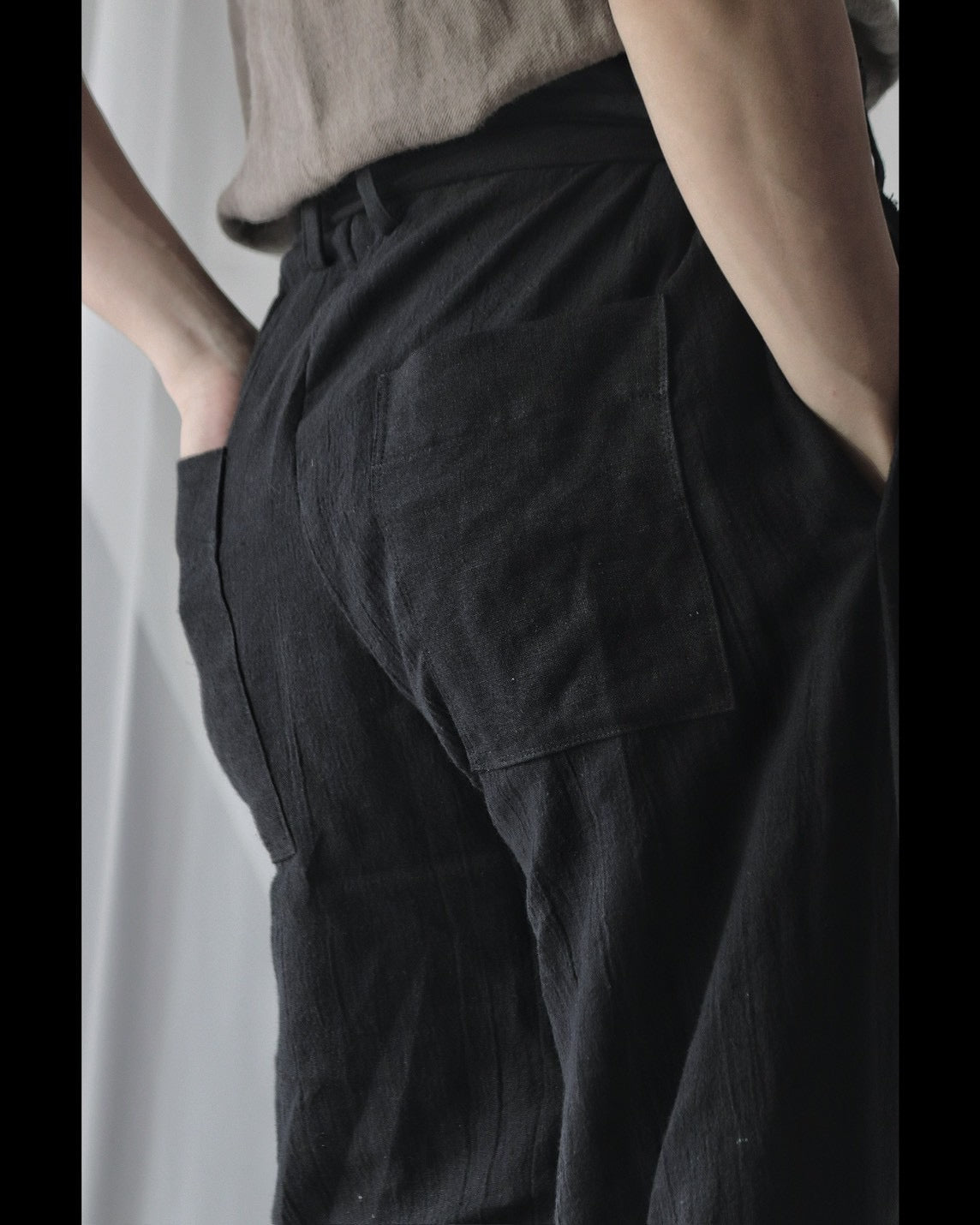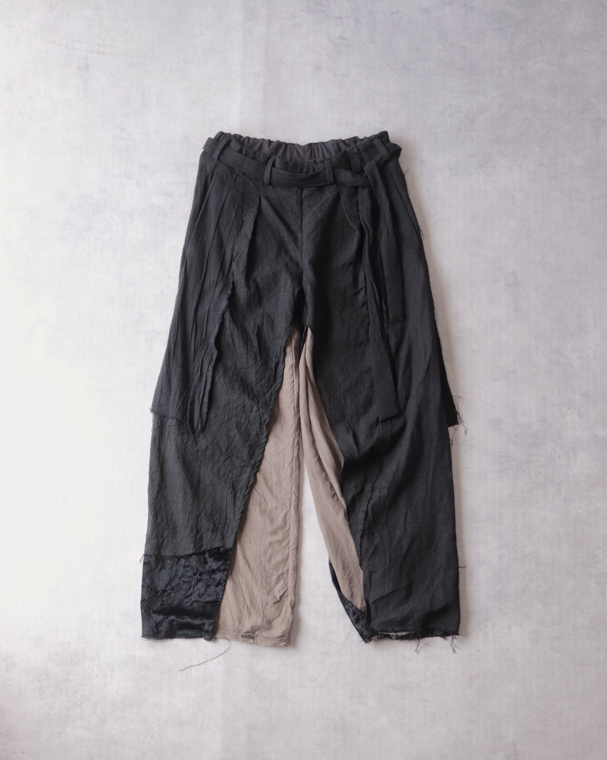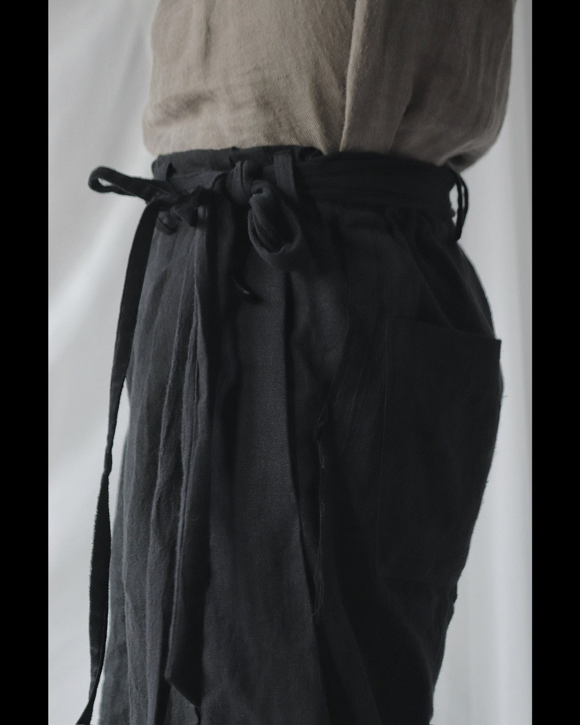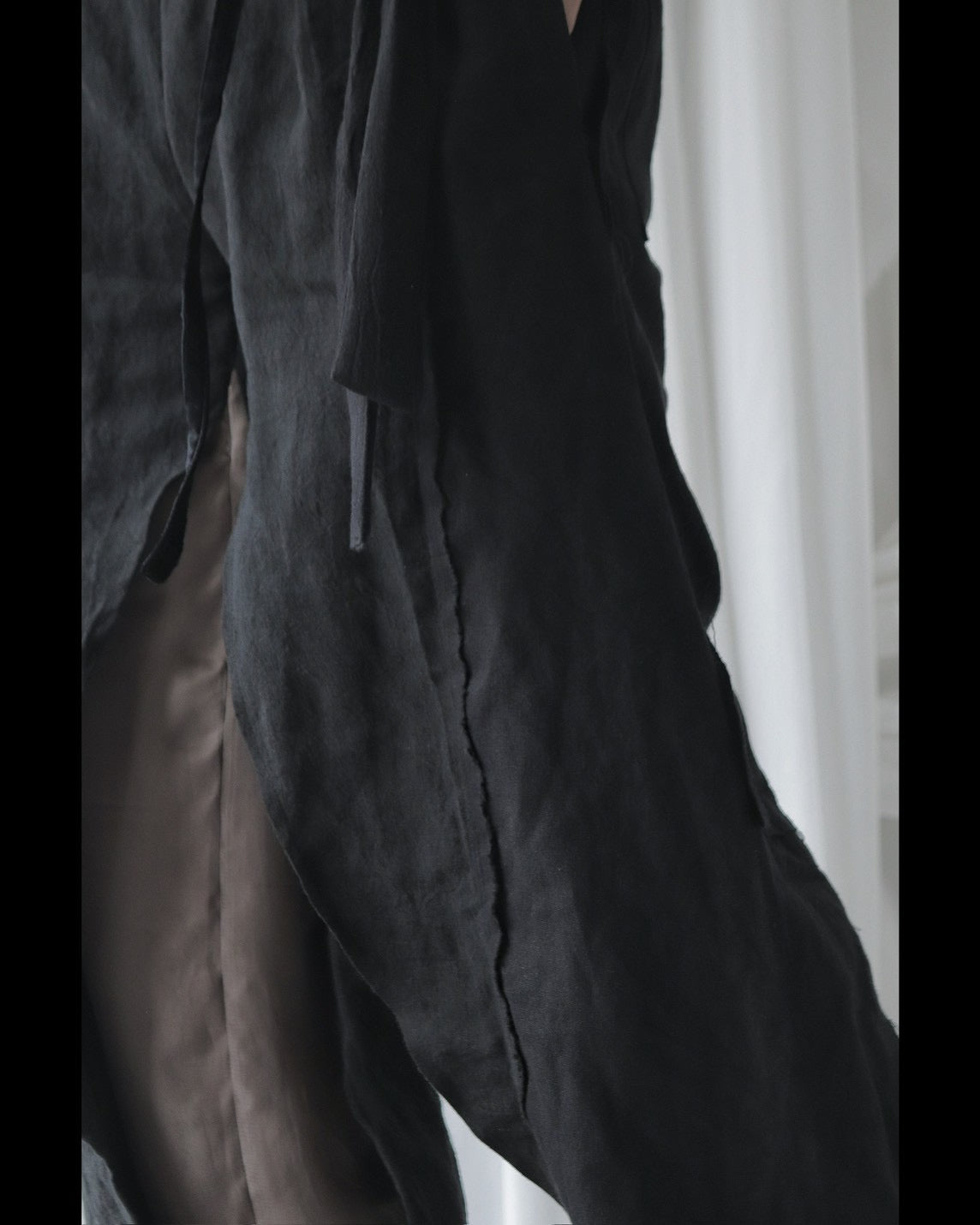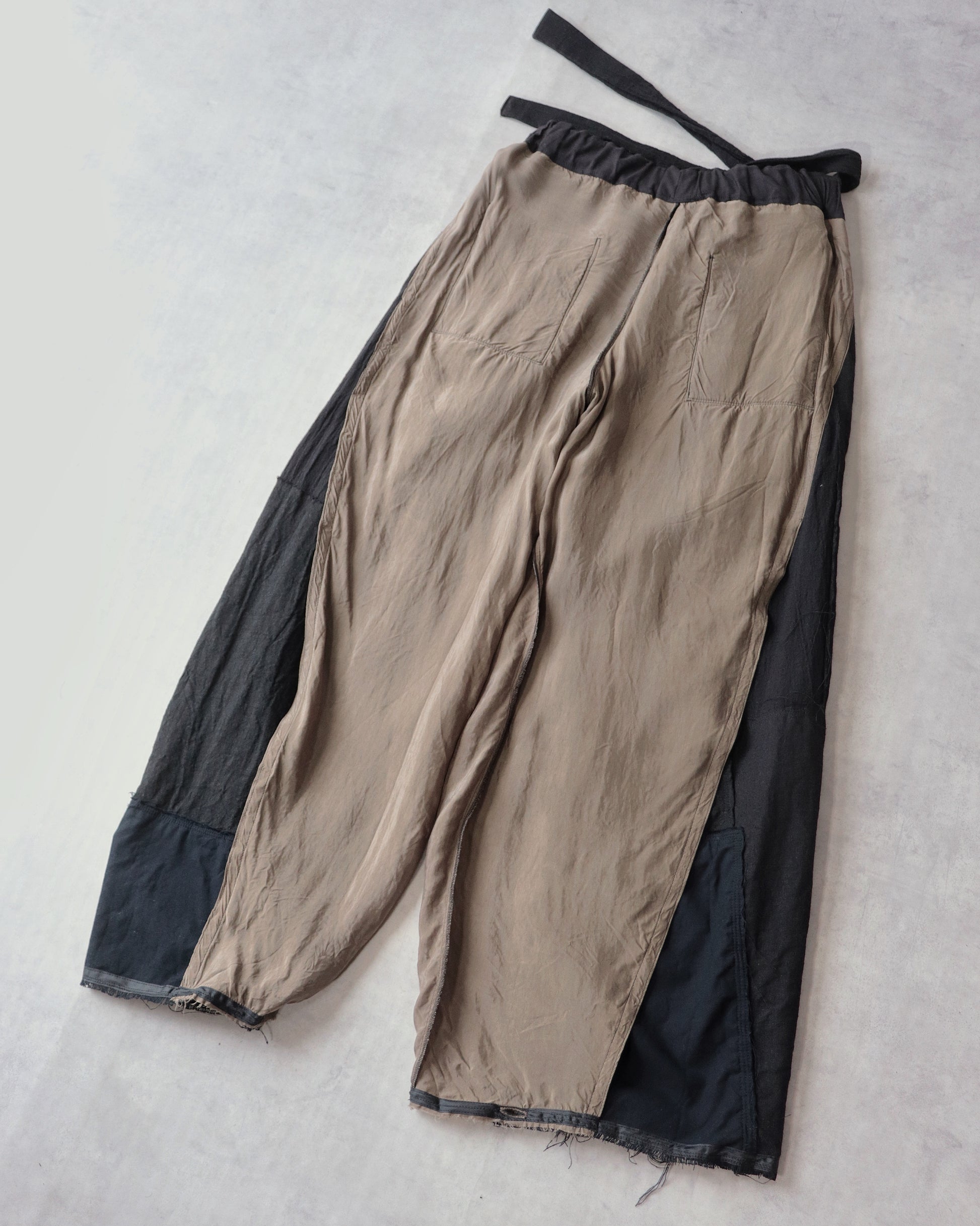 Made from patchworked remnants of cotton, cotton-linen, and linen, then cut and tailored.