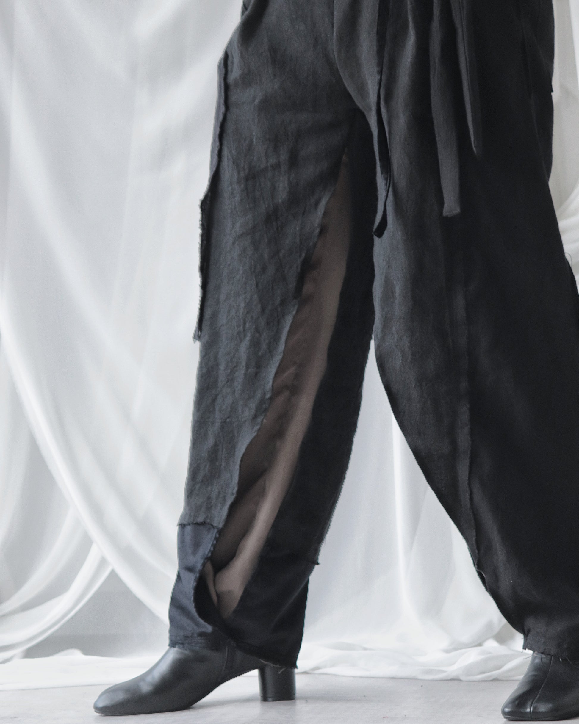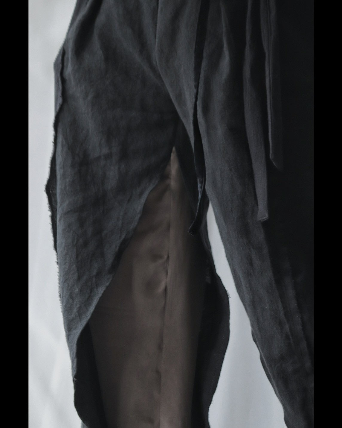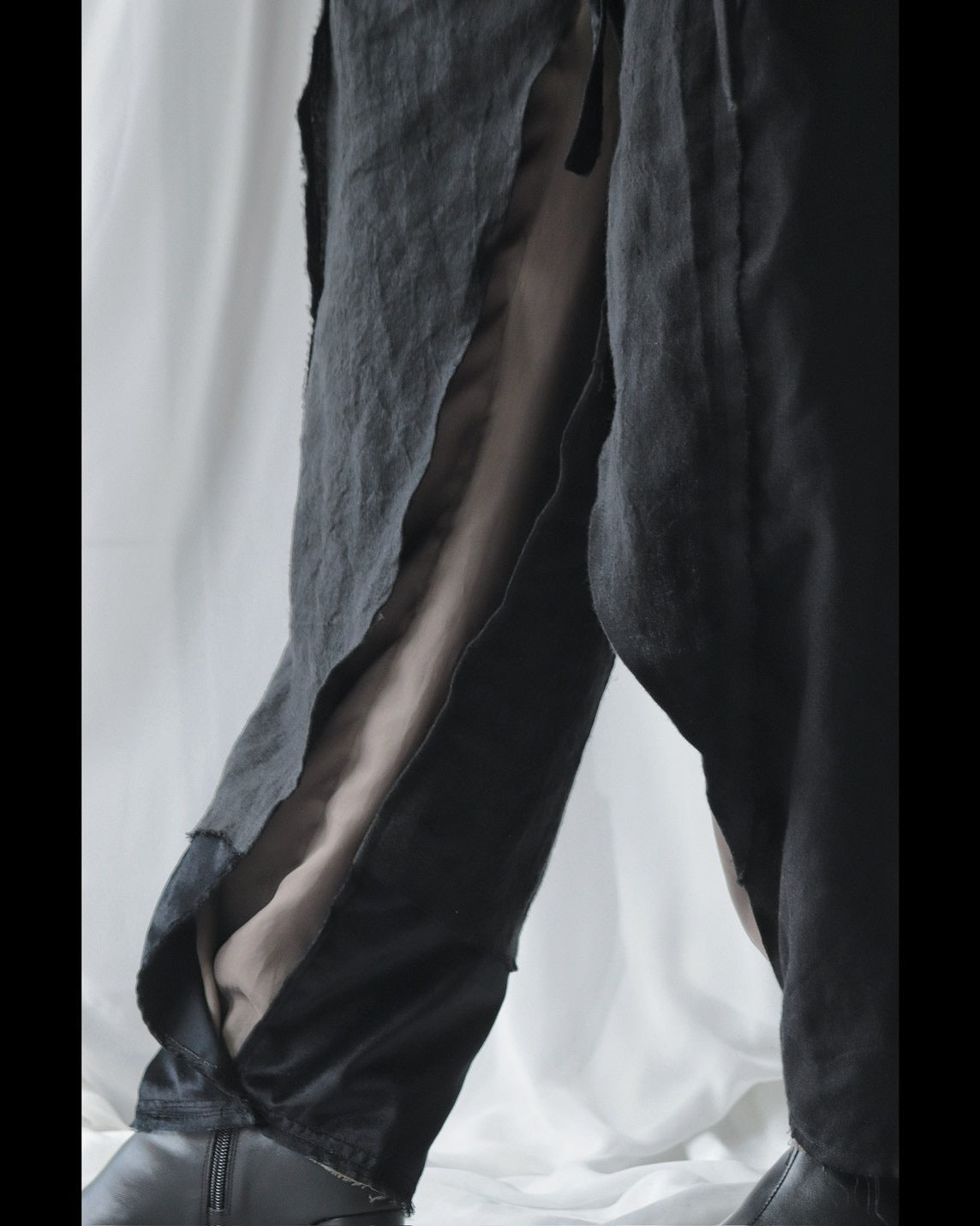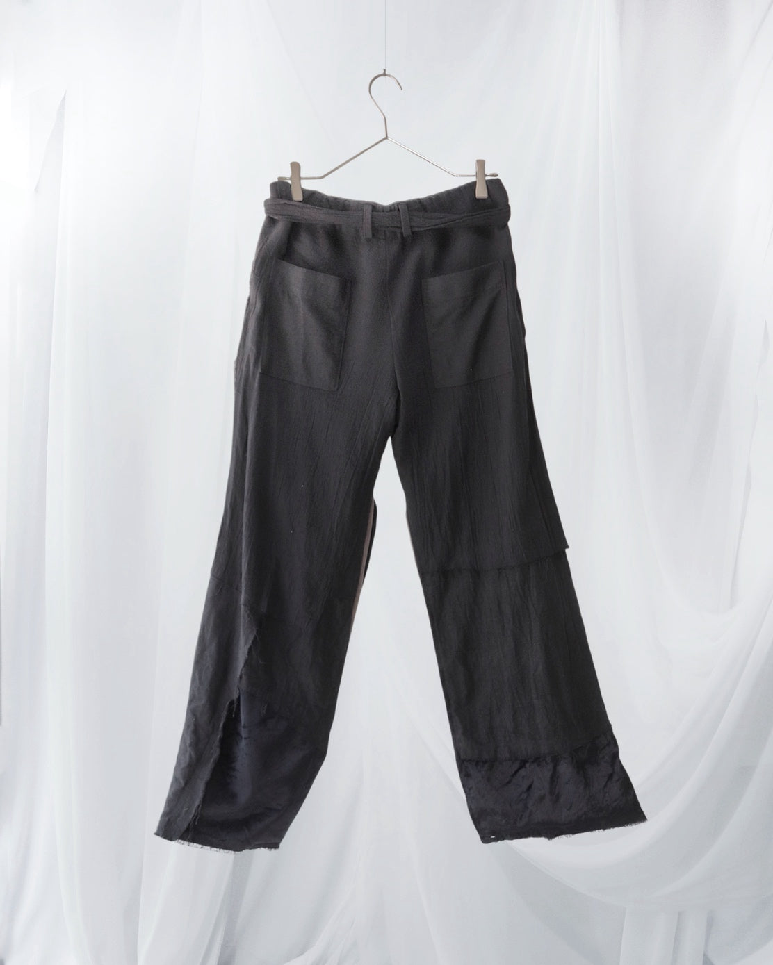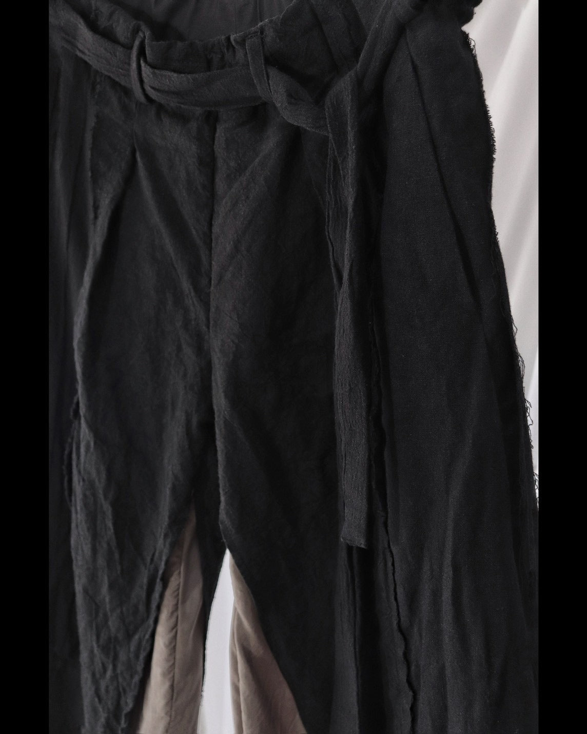 Made from patchworked remnants of cotton, cotton-linen, and linen, then cut and tailored.