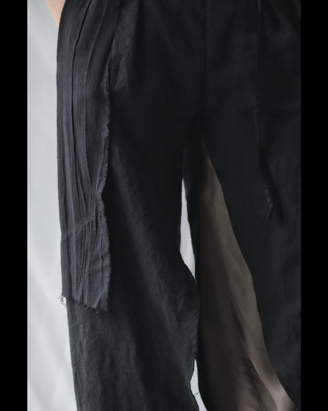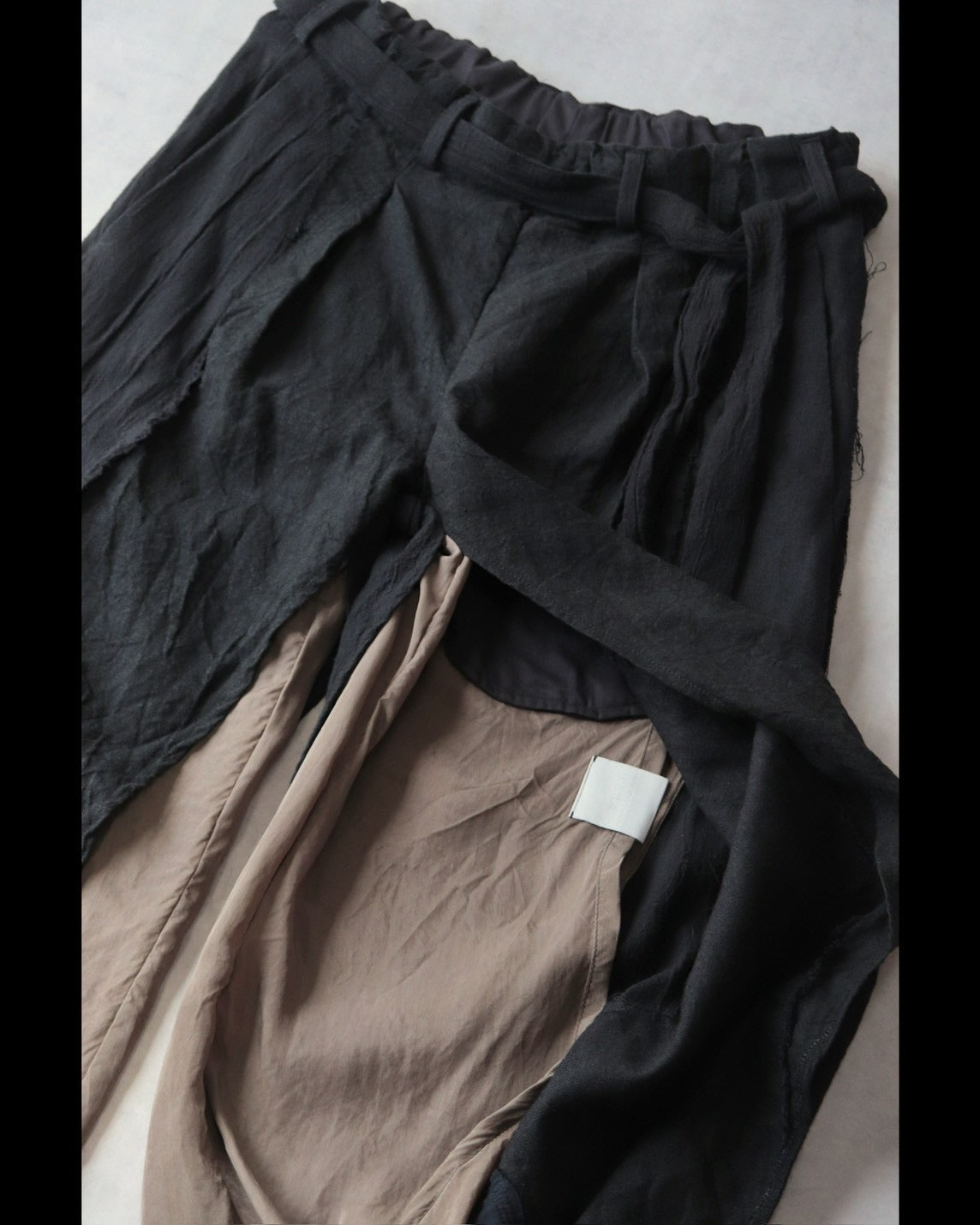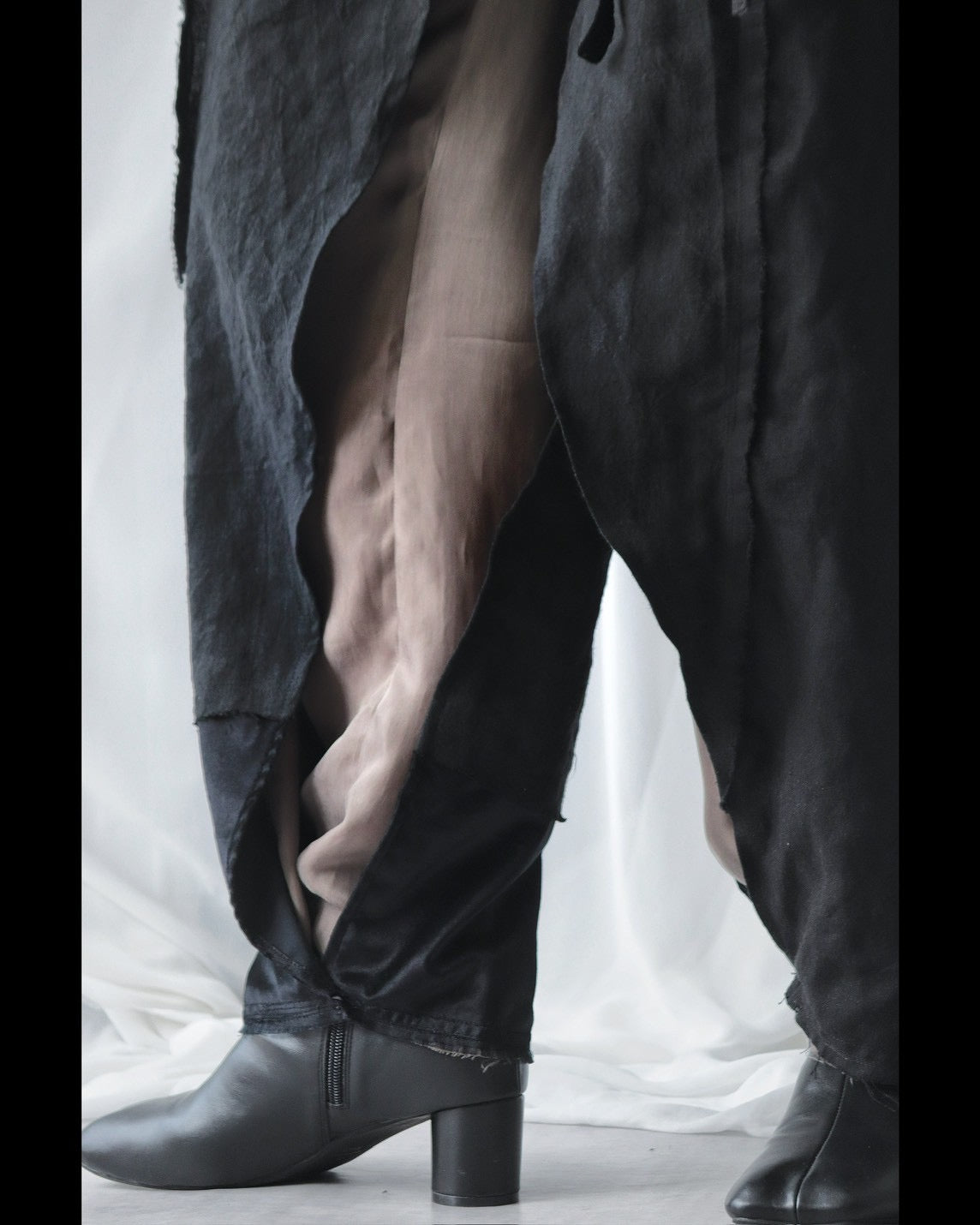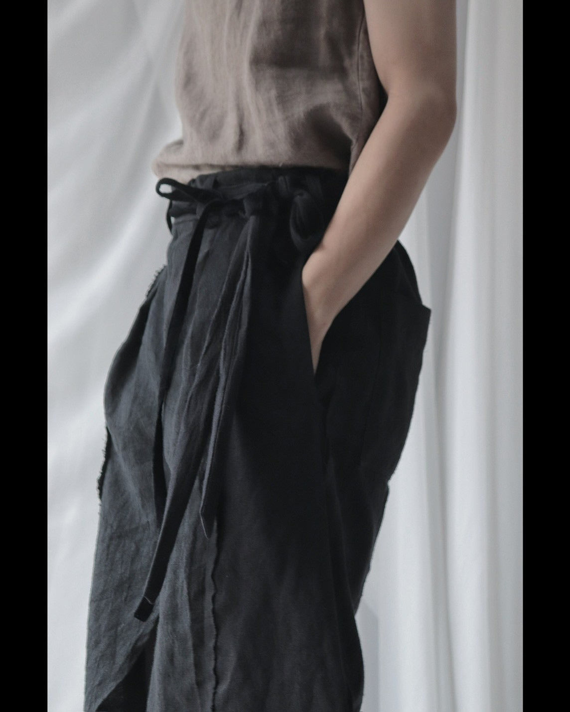 Made from patchworked remnants of cotton, cotton-linen, and linen, then cut and tailored.