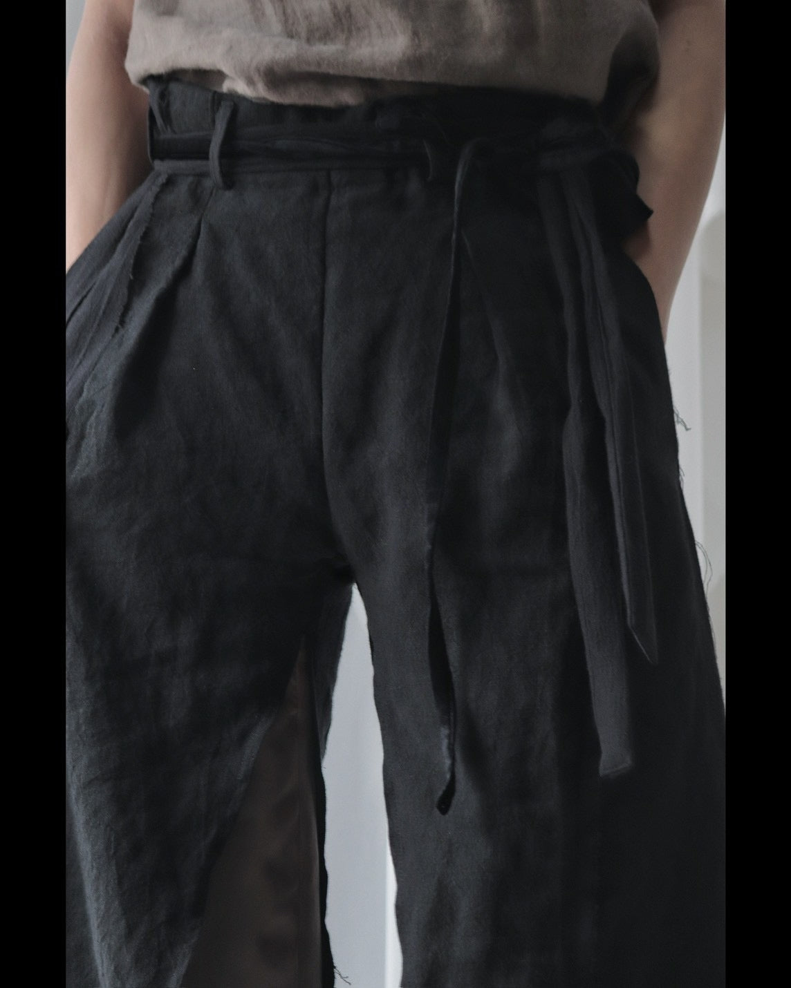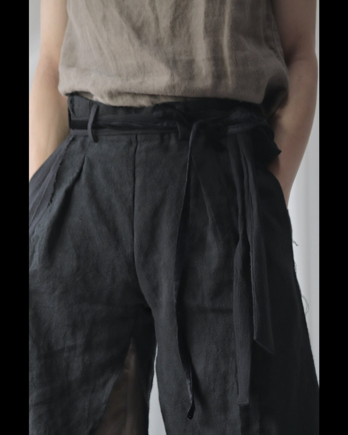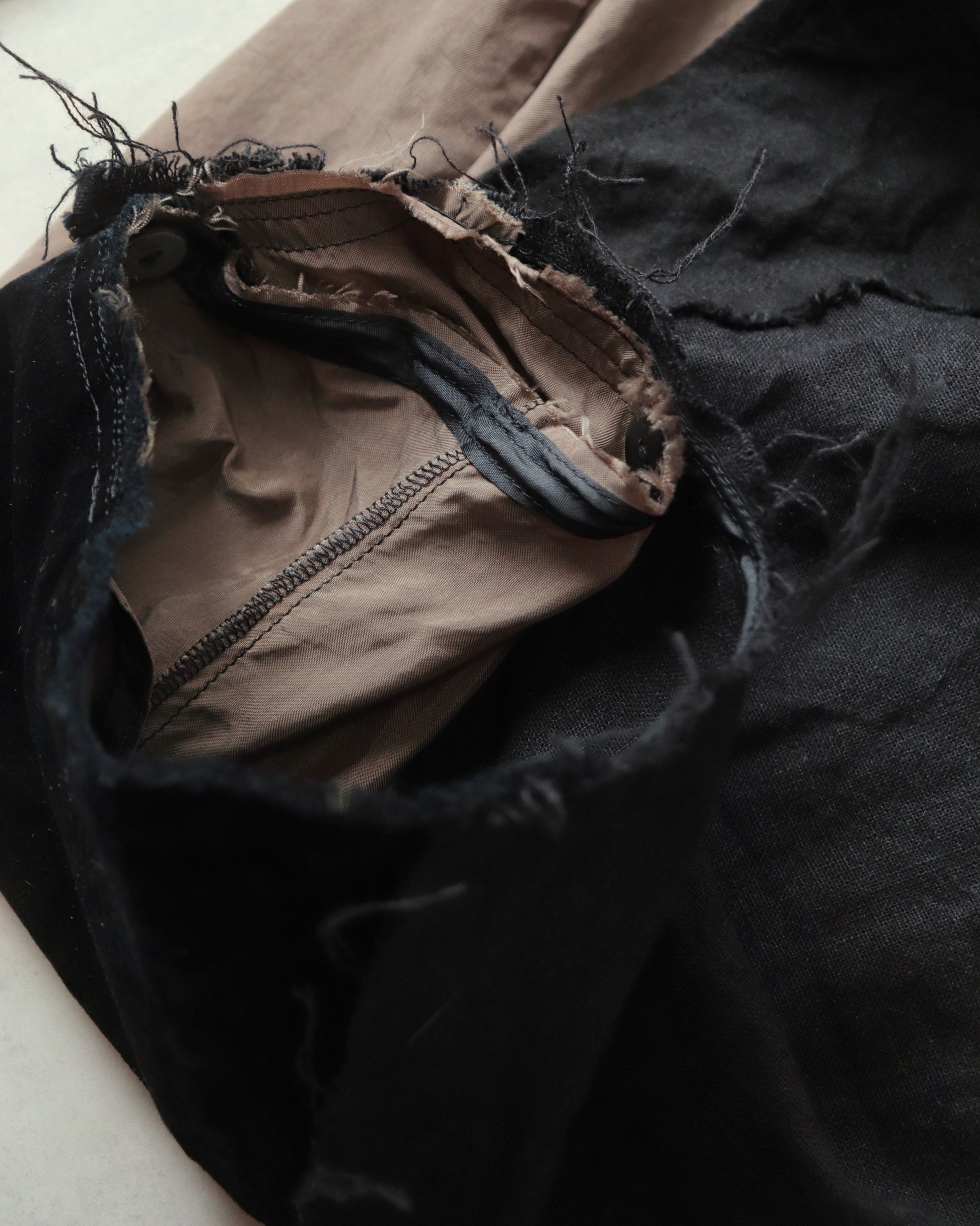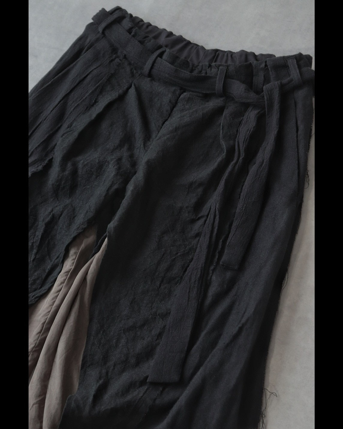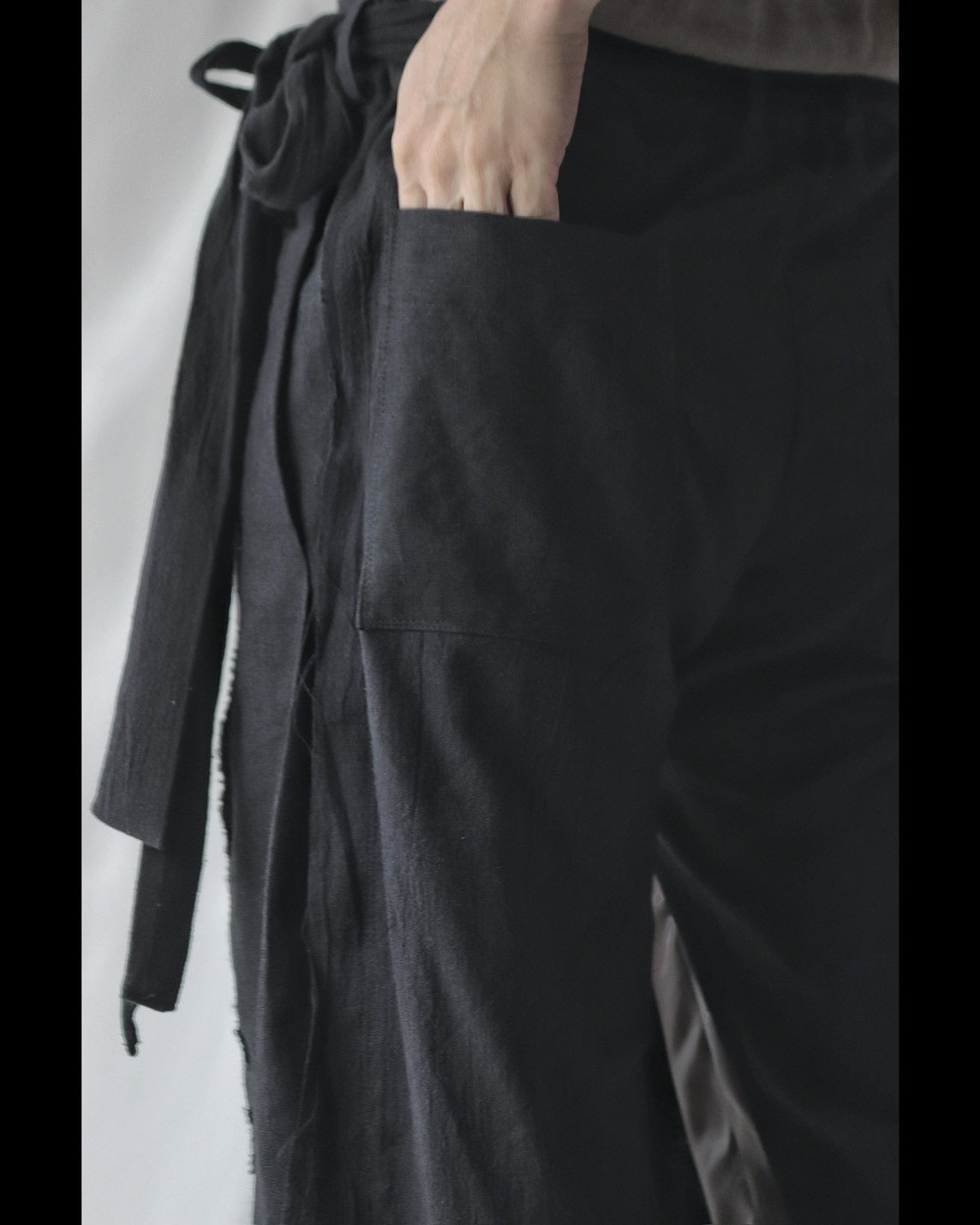 Made from patchworked remnants of cotton, cotton-linen, and linen, then cut and tailored.