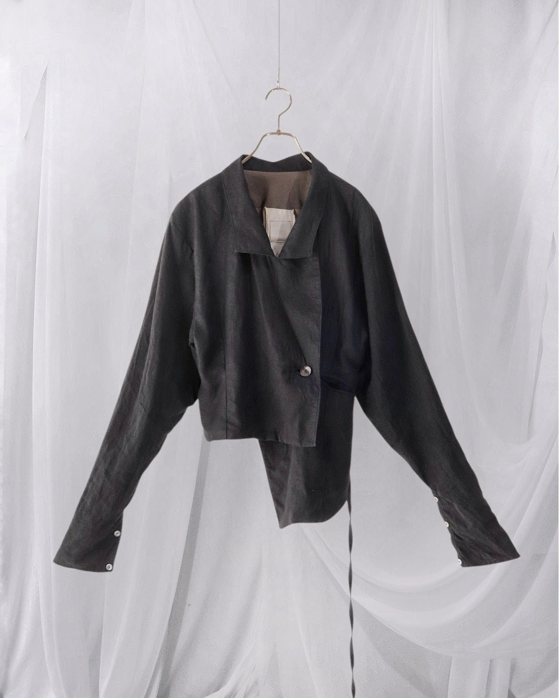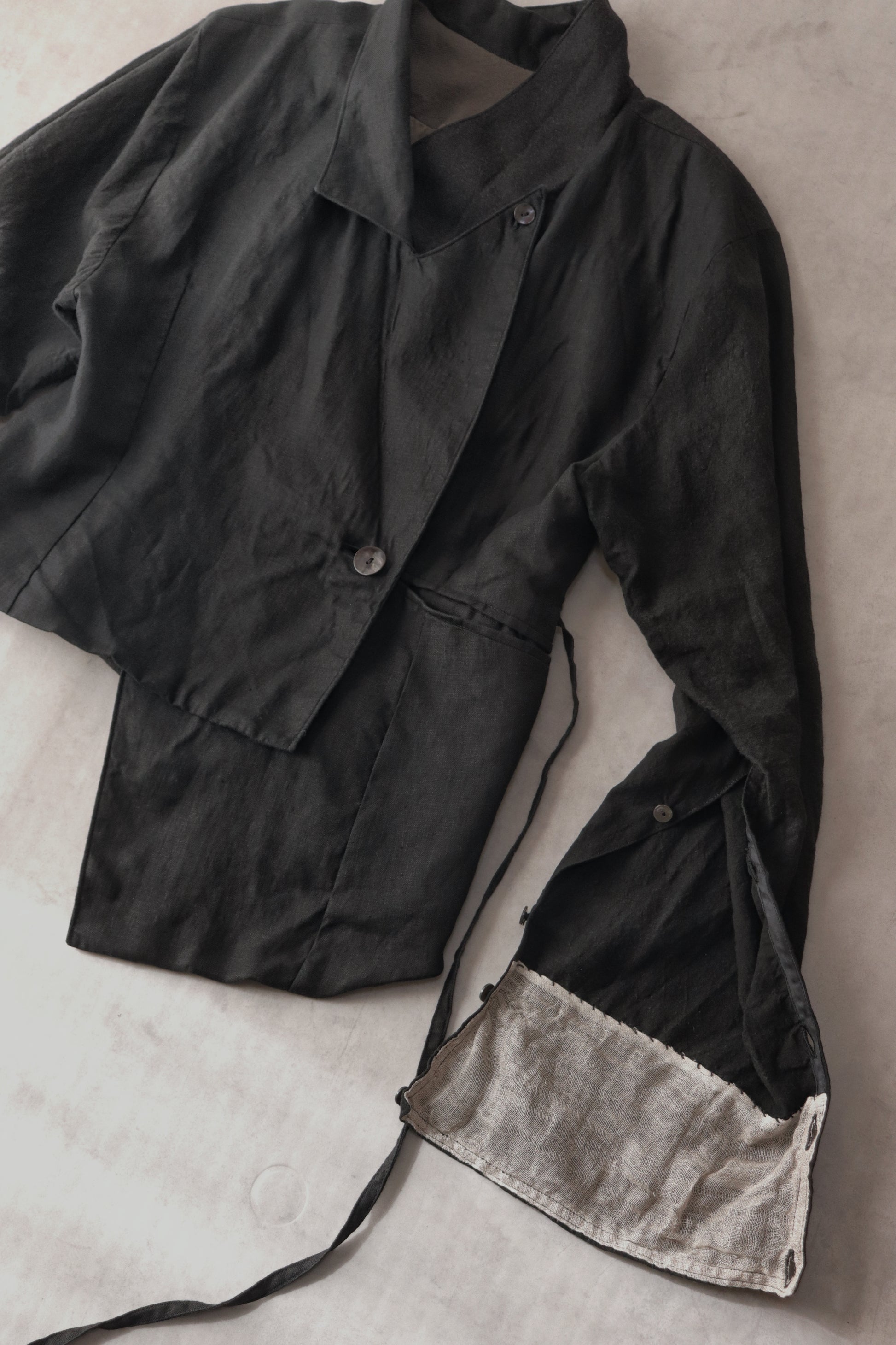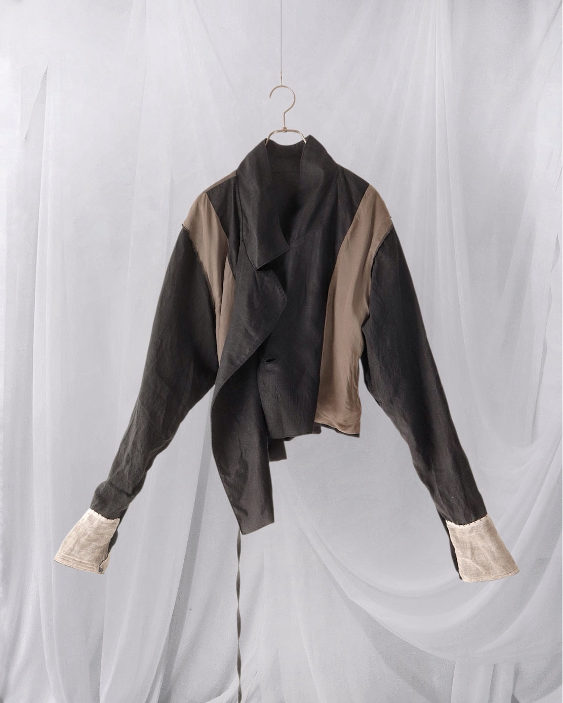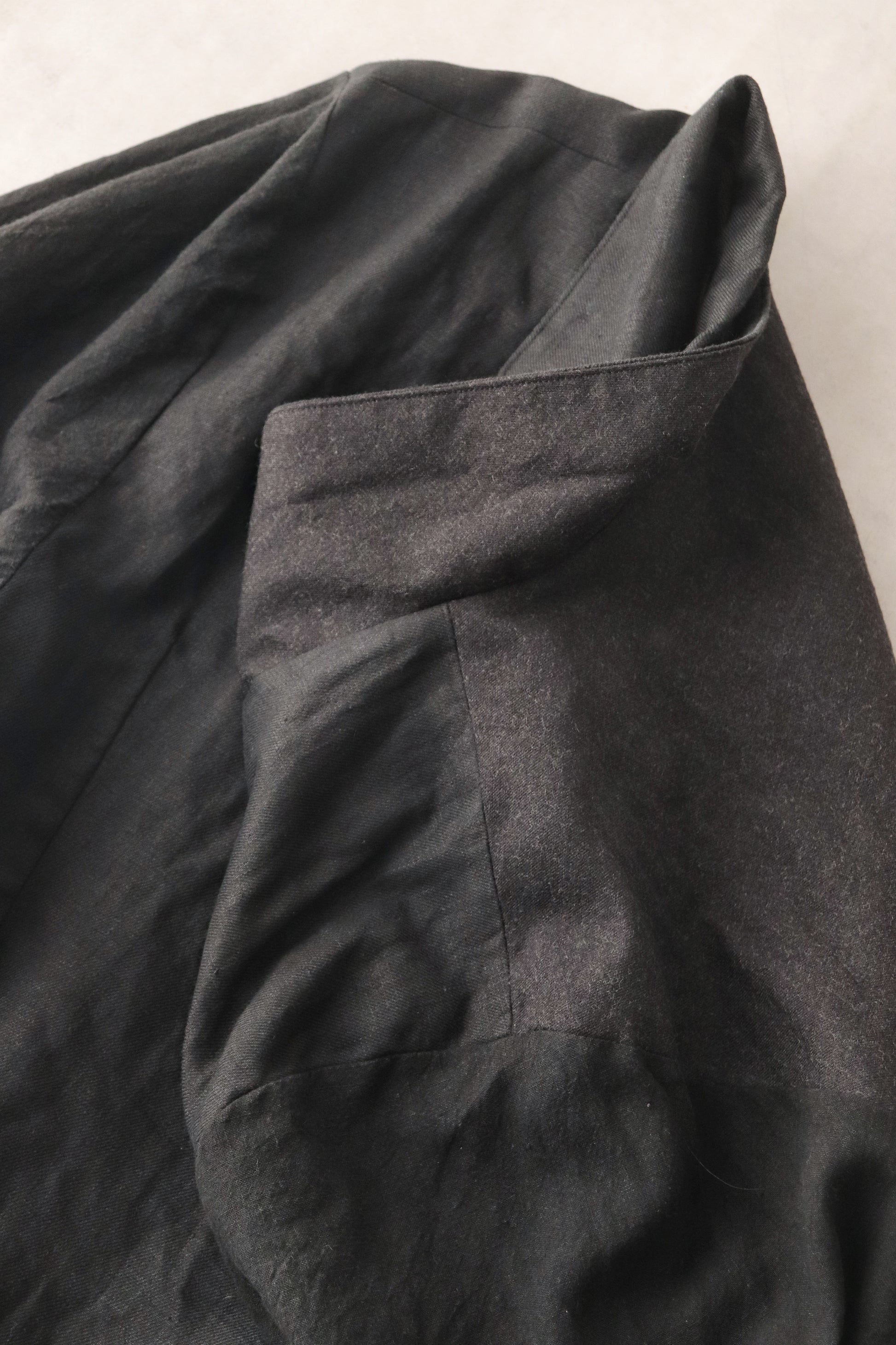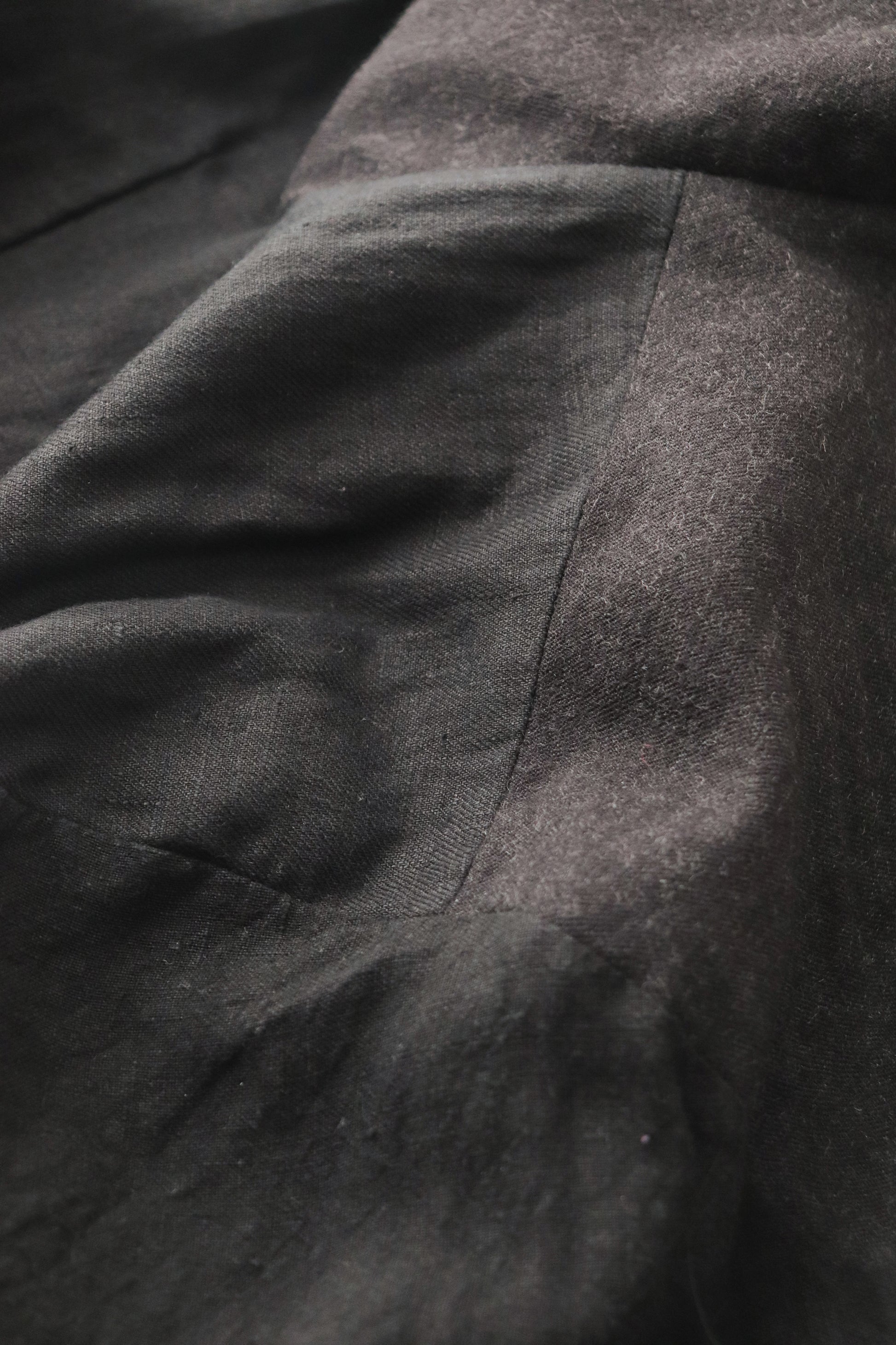 The front body, sleeves, and outer collar are made from different linen fabrics, while the back body and inner collar are made from dark grey wool. Each fabric is relatively lightweight and suitable for wear from spring through autumn.