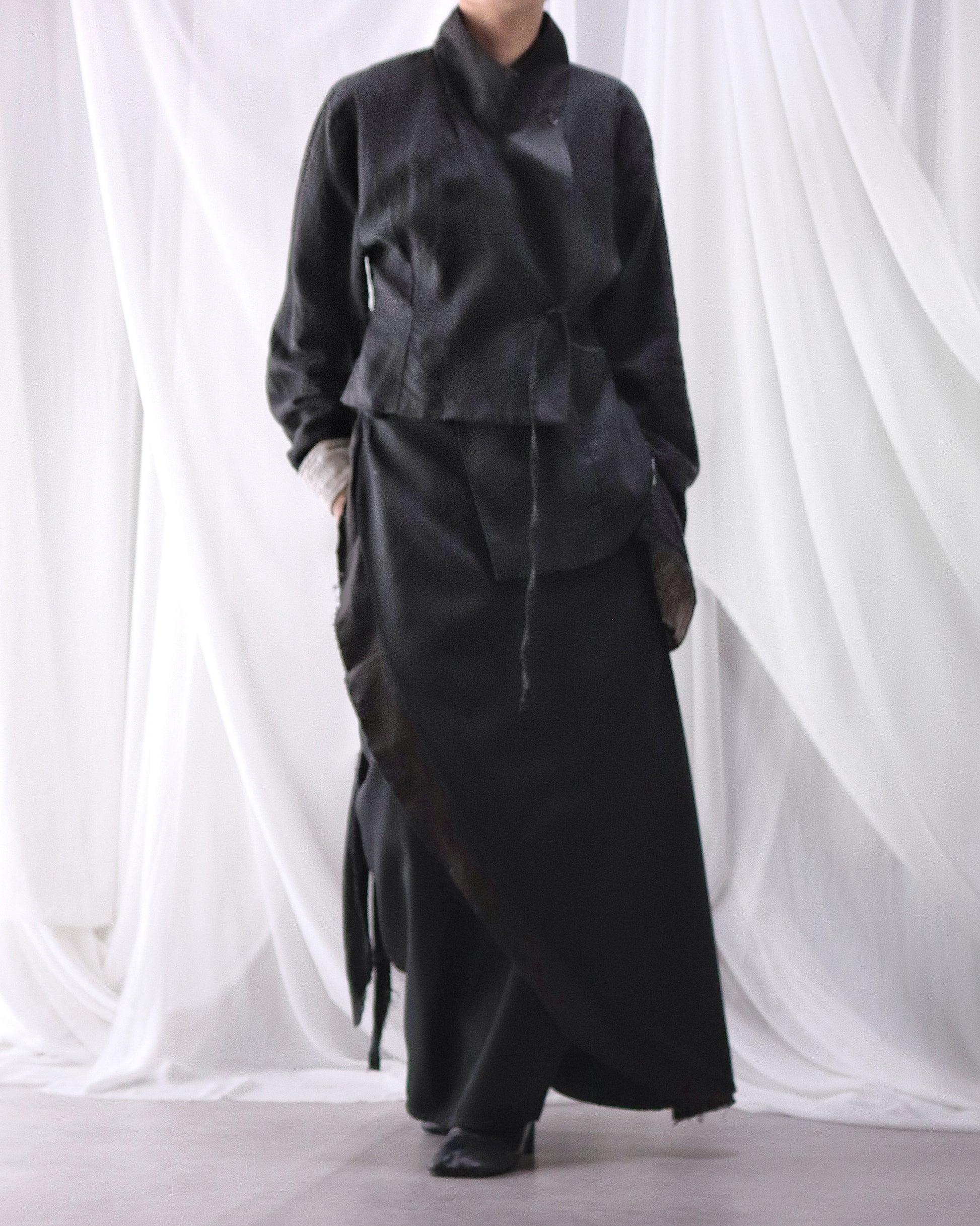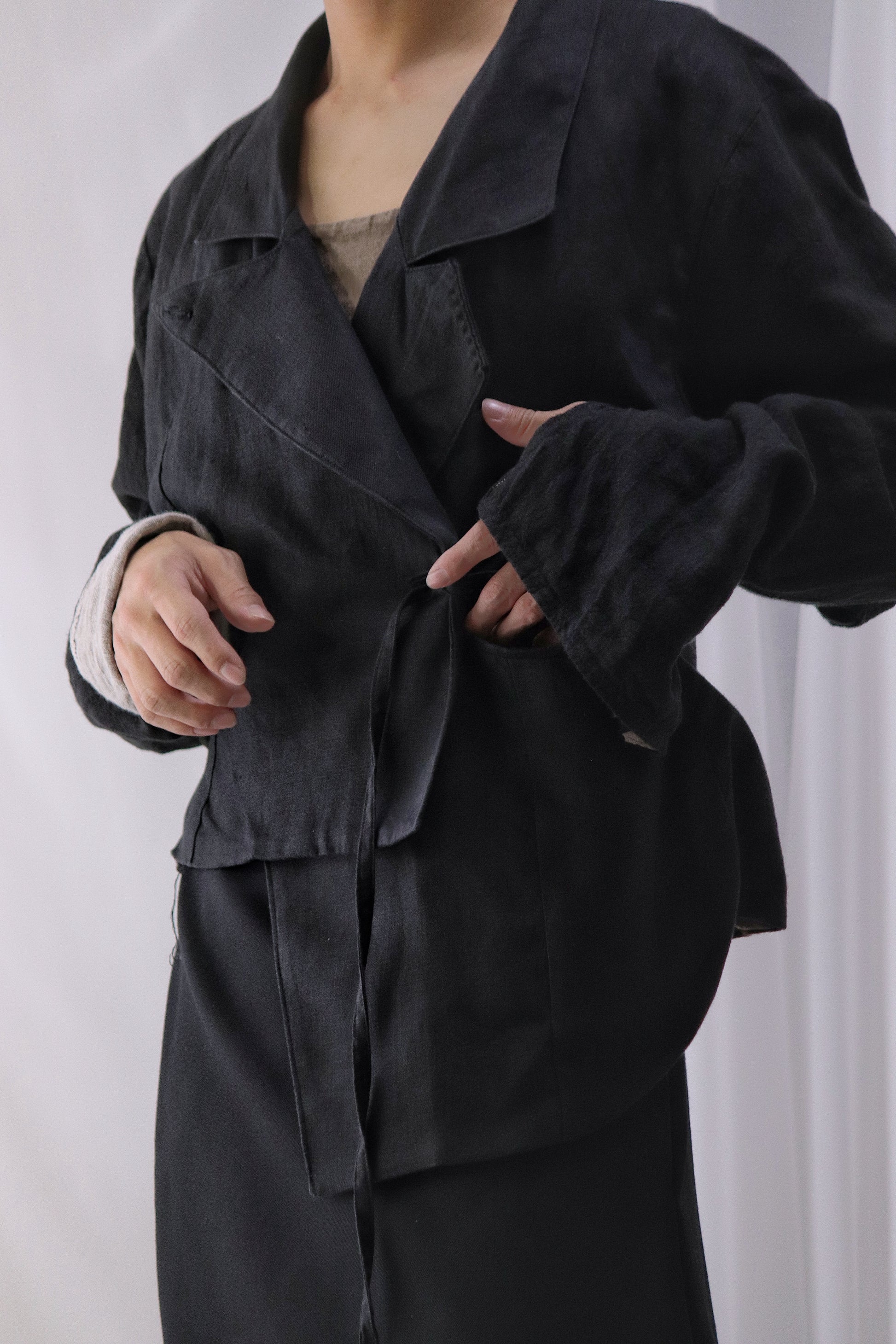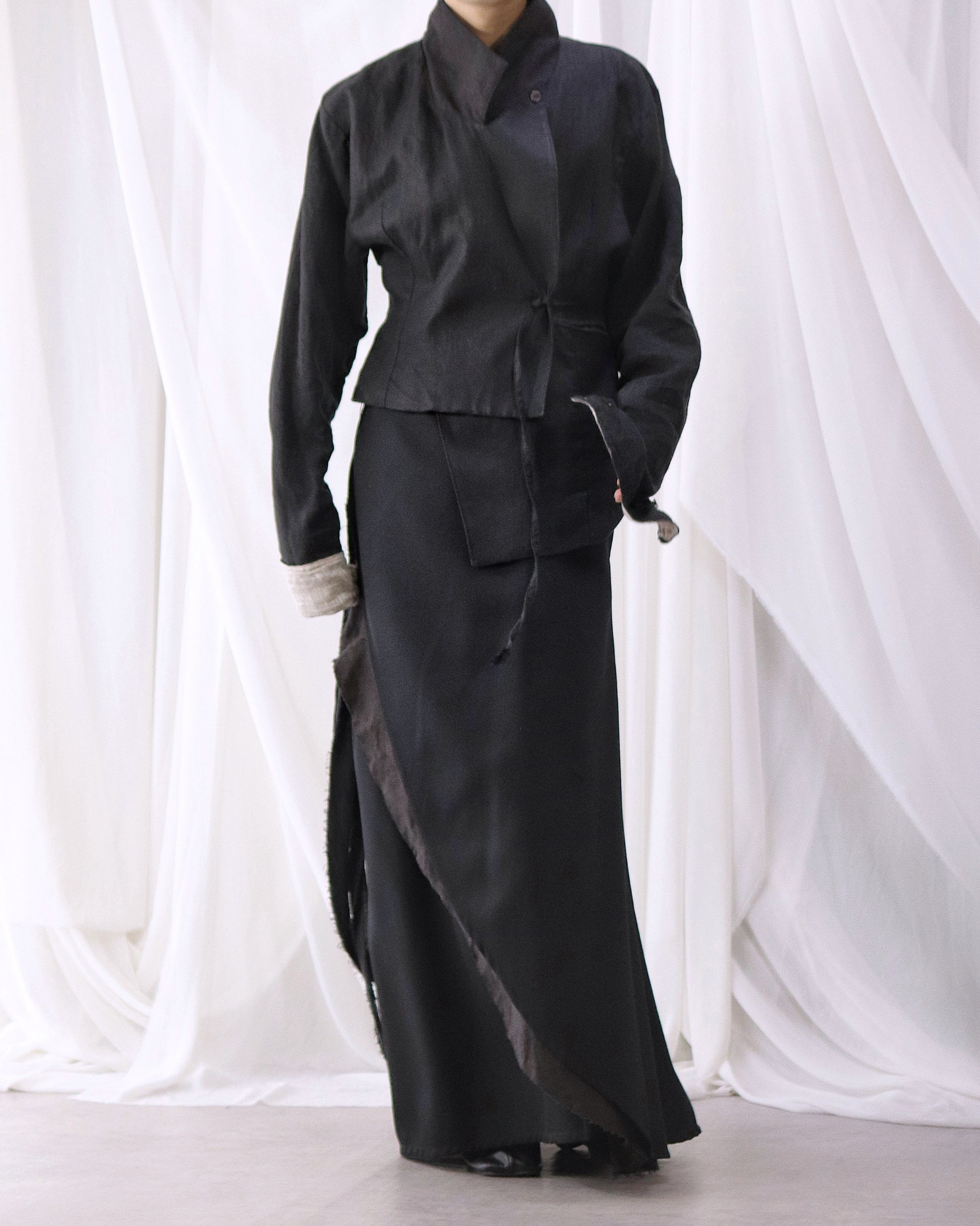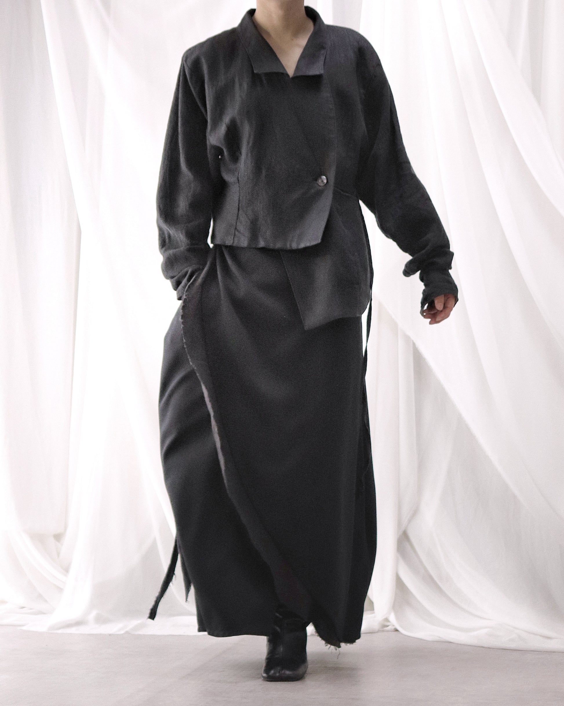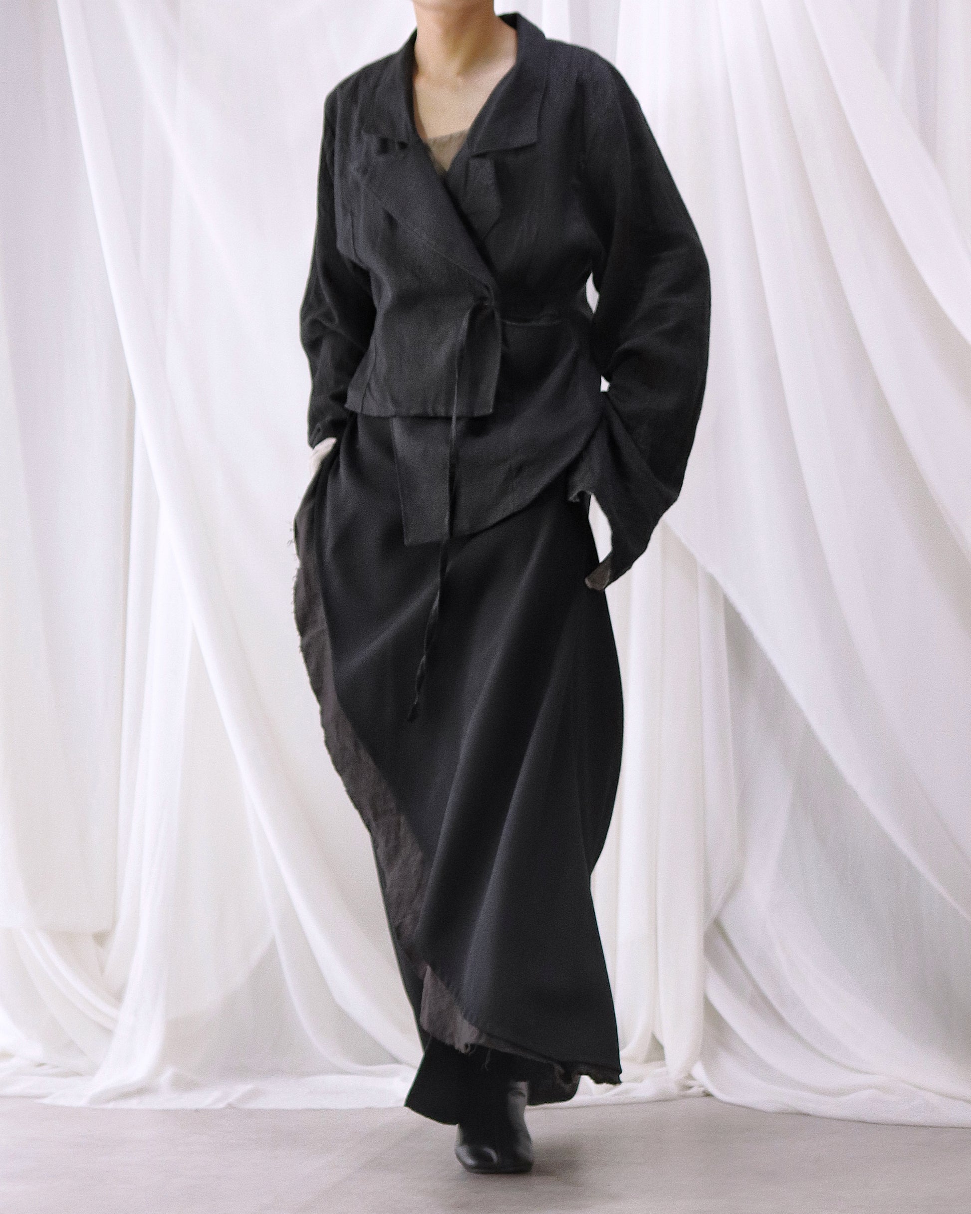 The front body, sleeves, and outer collar are made from different linen fabrics, while the back body and inner collar are made from dark grey wool. Each fabric is relatively lightweight and suitable for wear from spring through autumn.