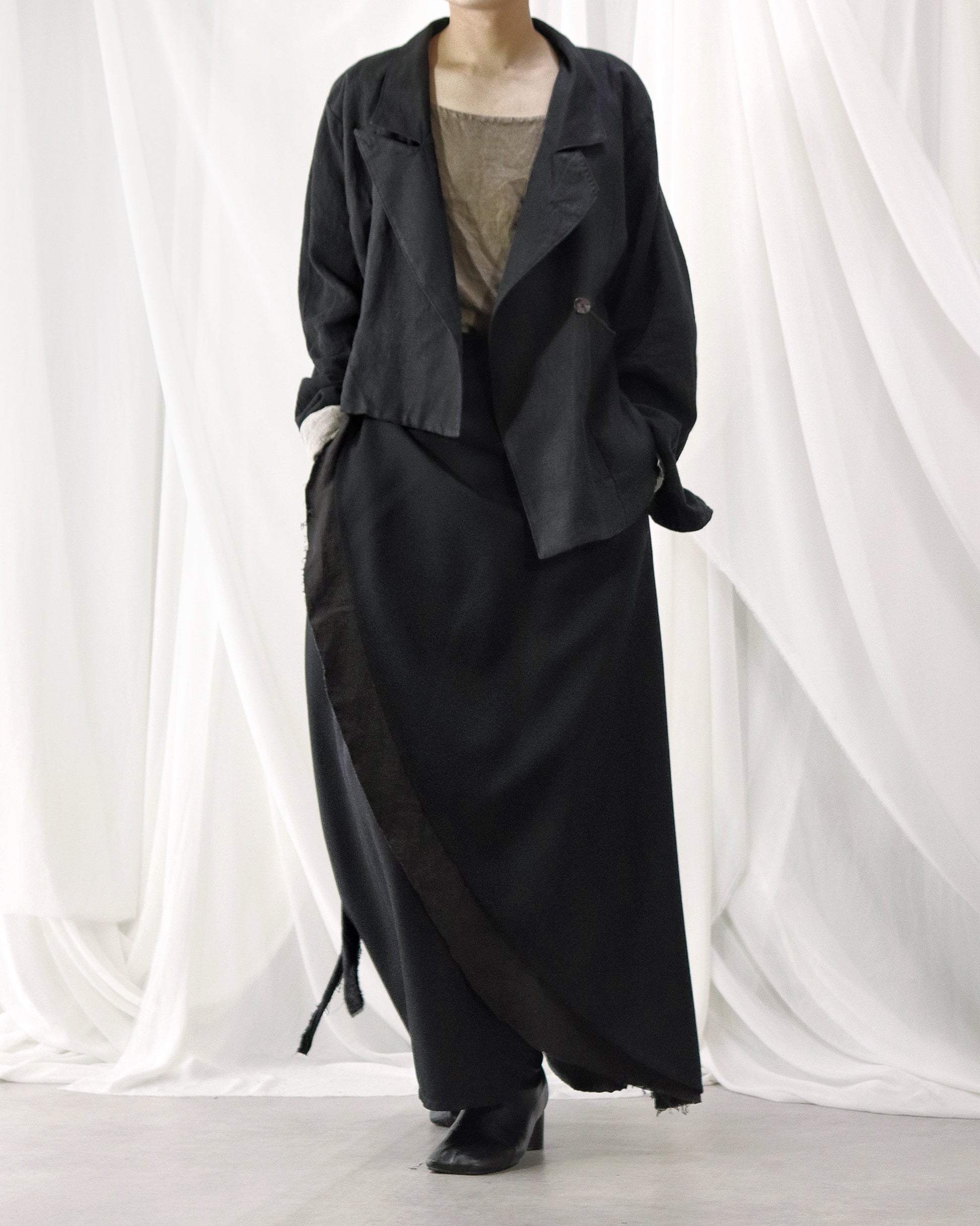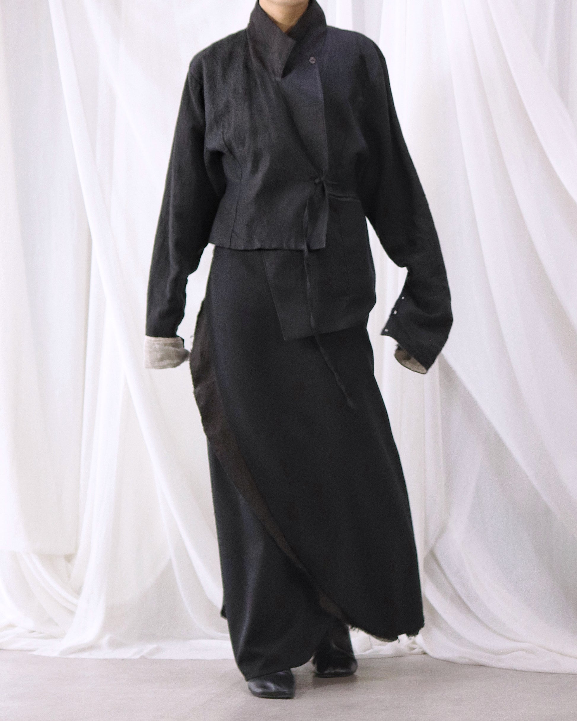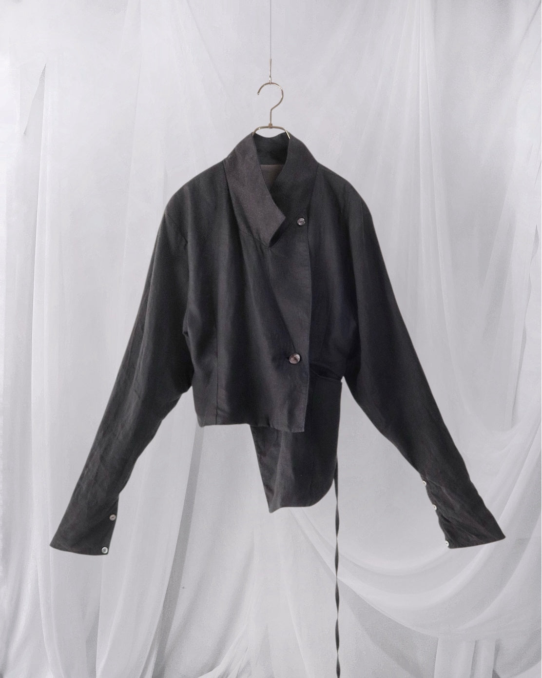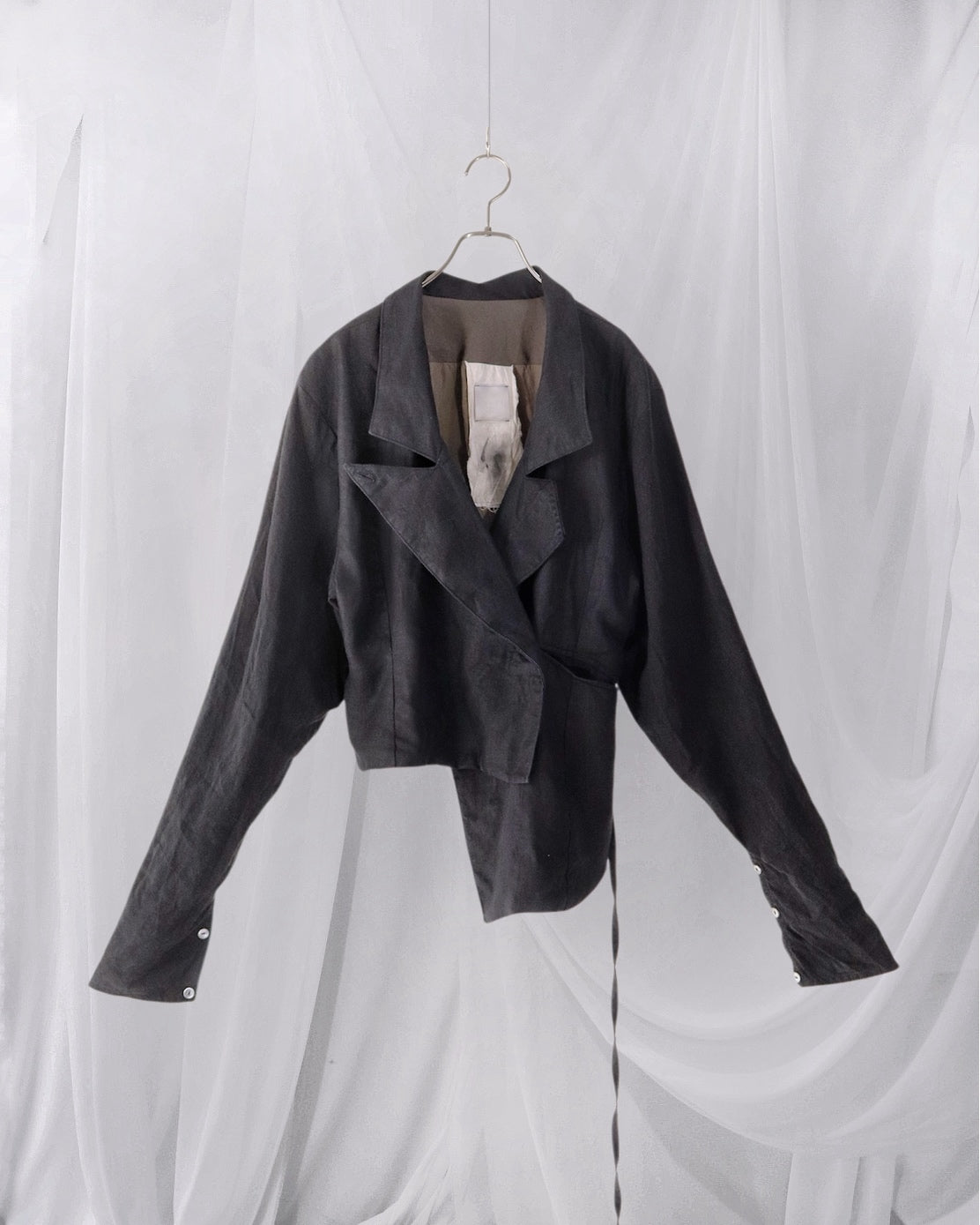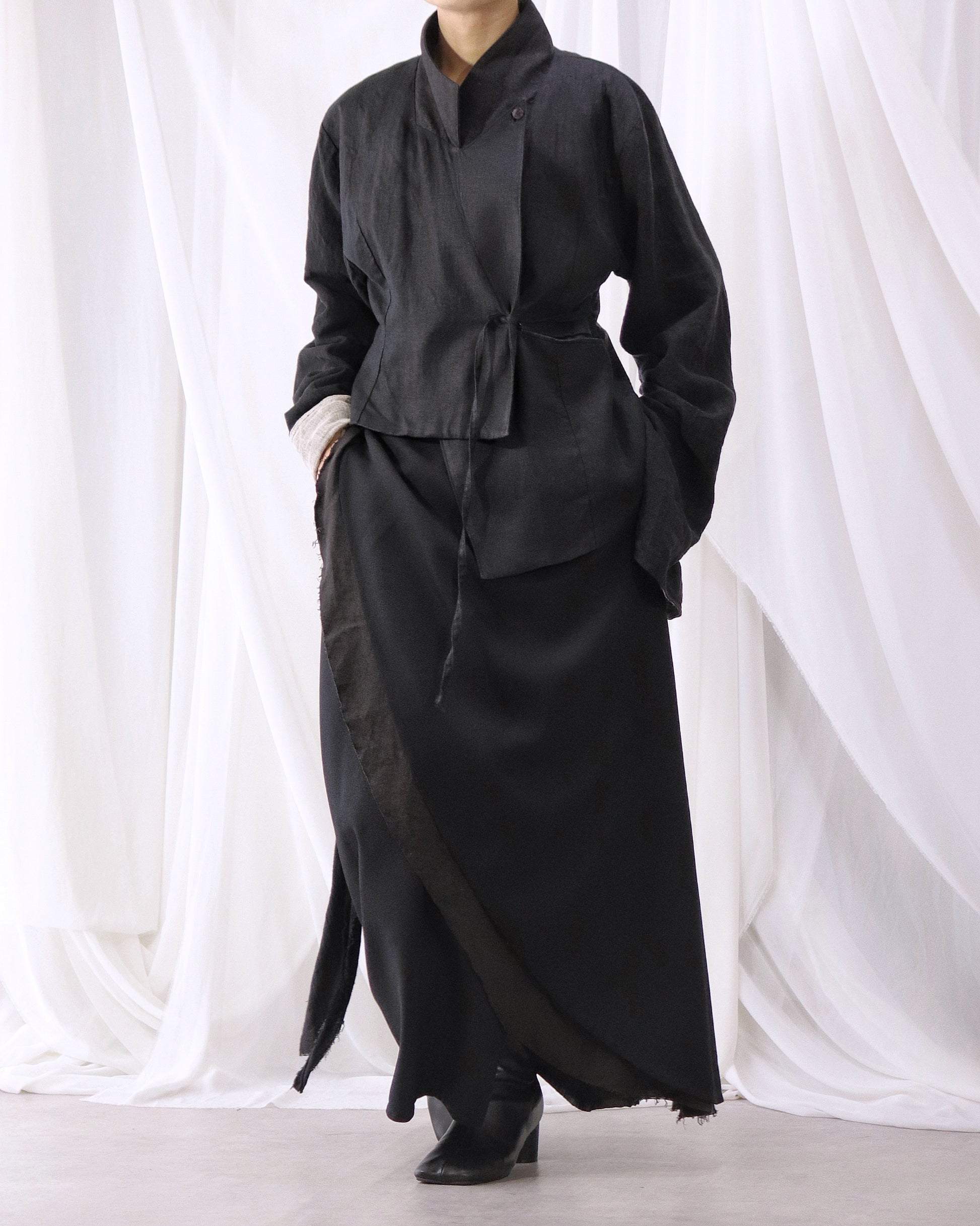 The front body, sleeves, and outer collar are made from different linen fabrics, while the back body and inner collar are made from dark grey wool. Each fabric is relatively lightweight and suitable for wear from spring through autumn.