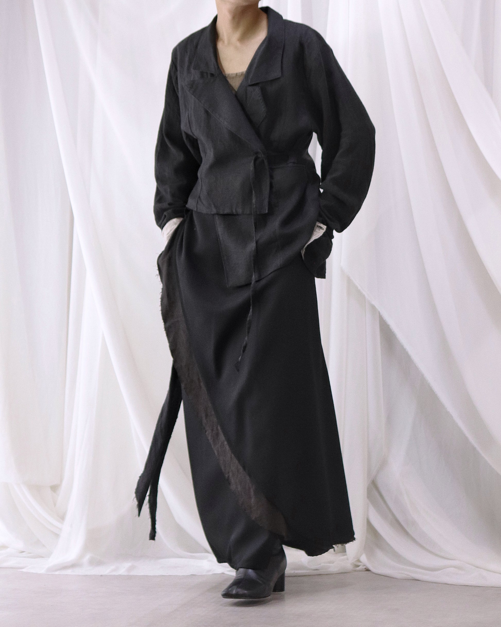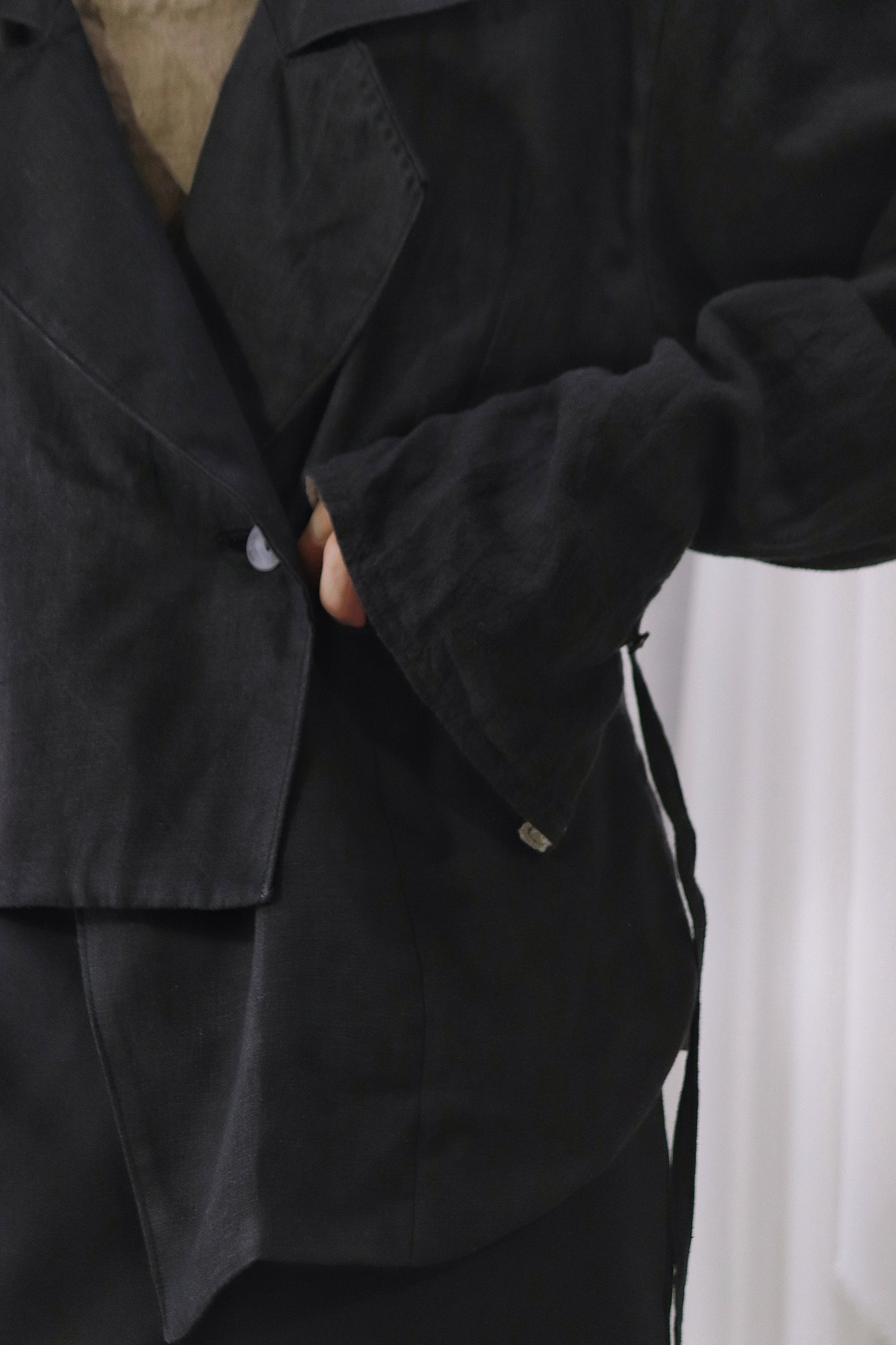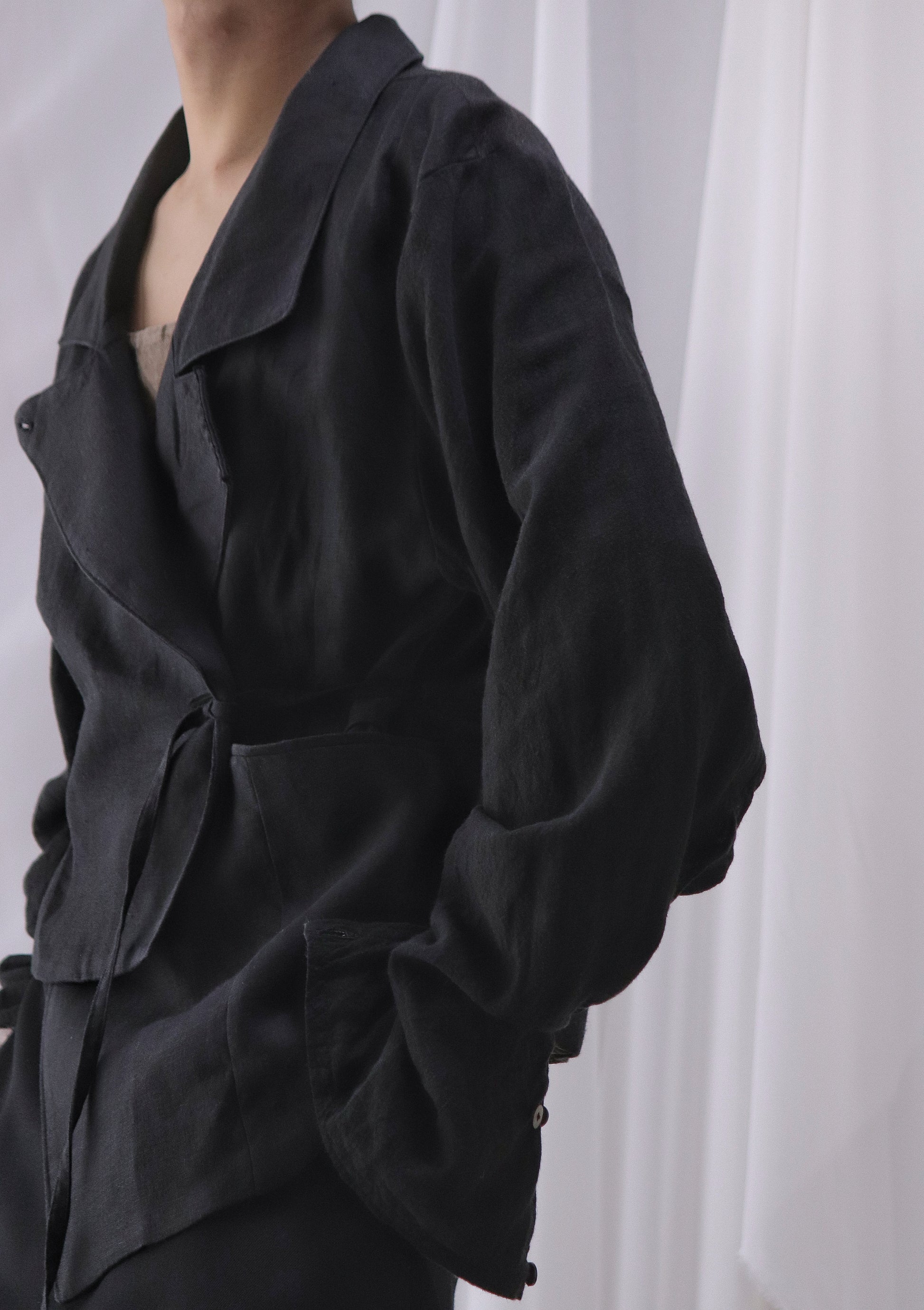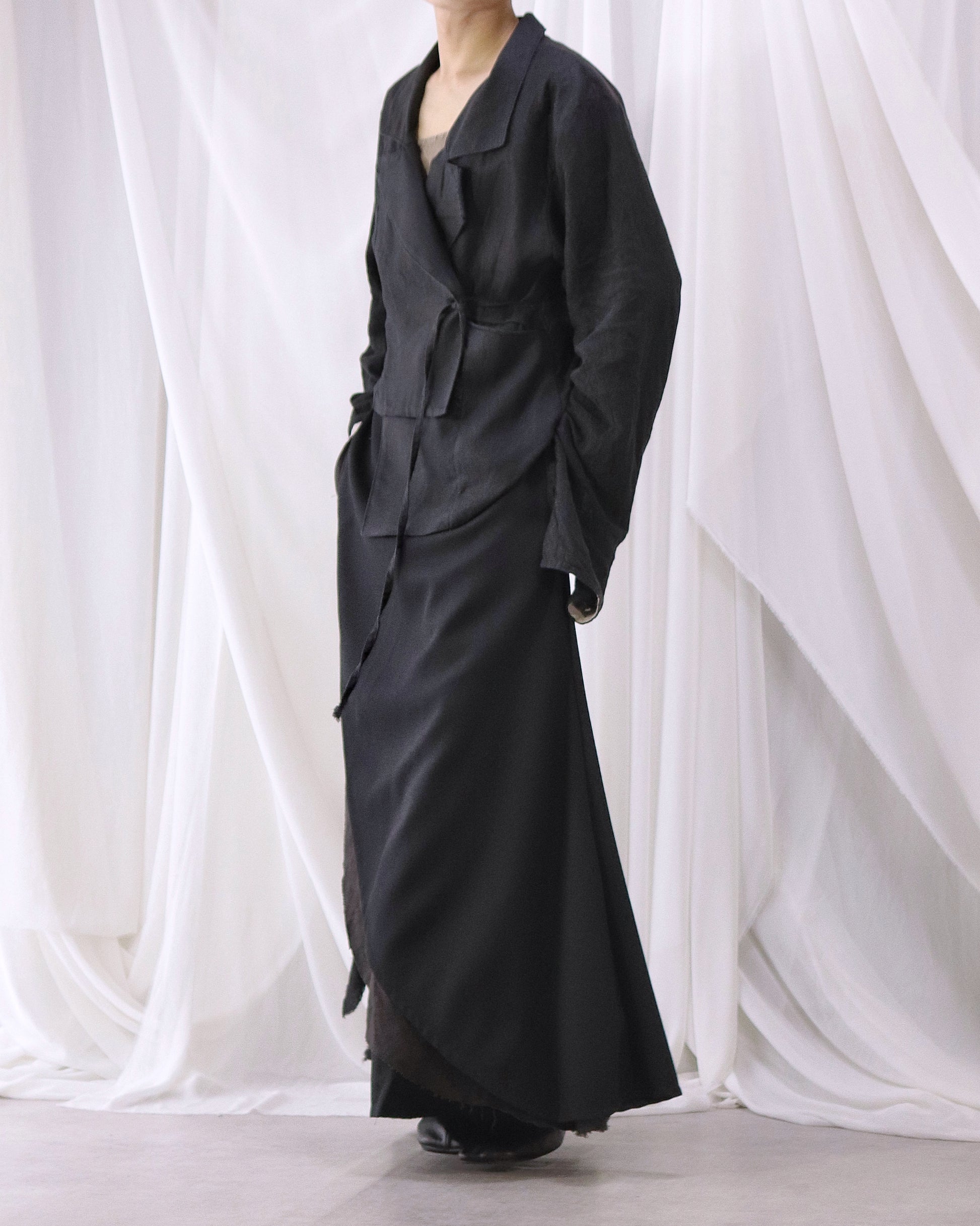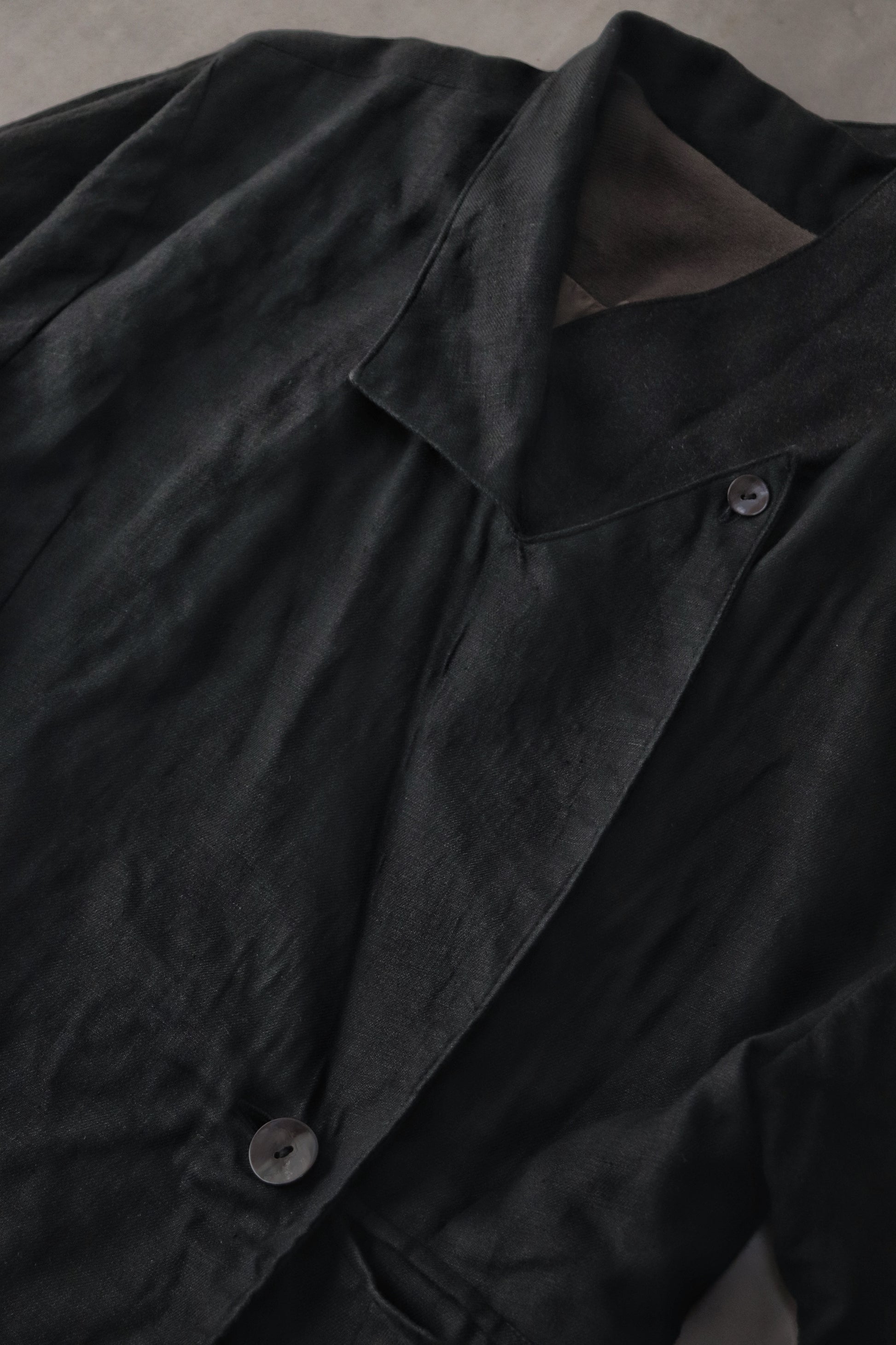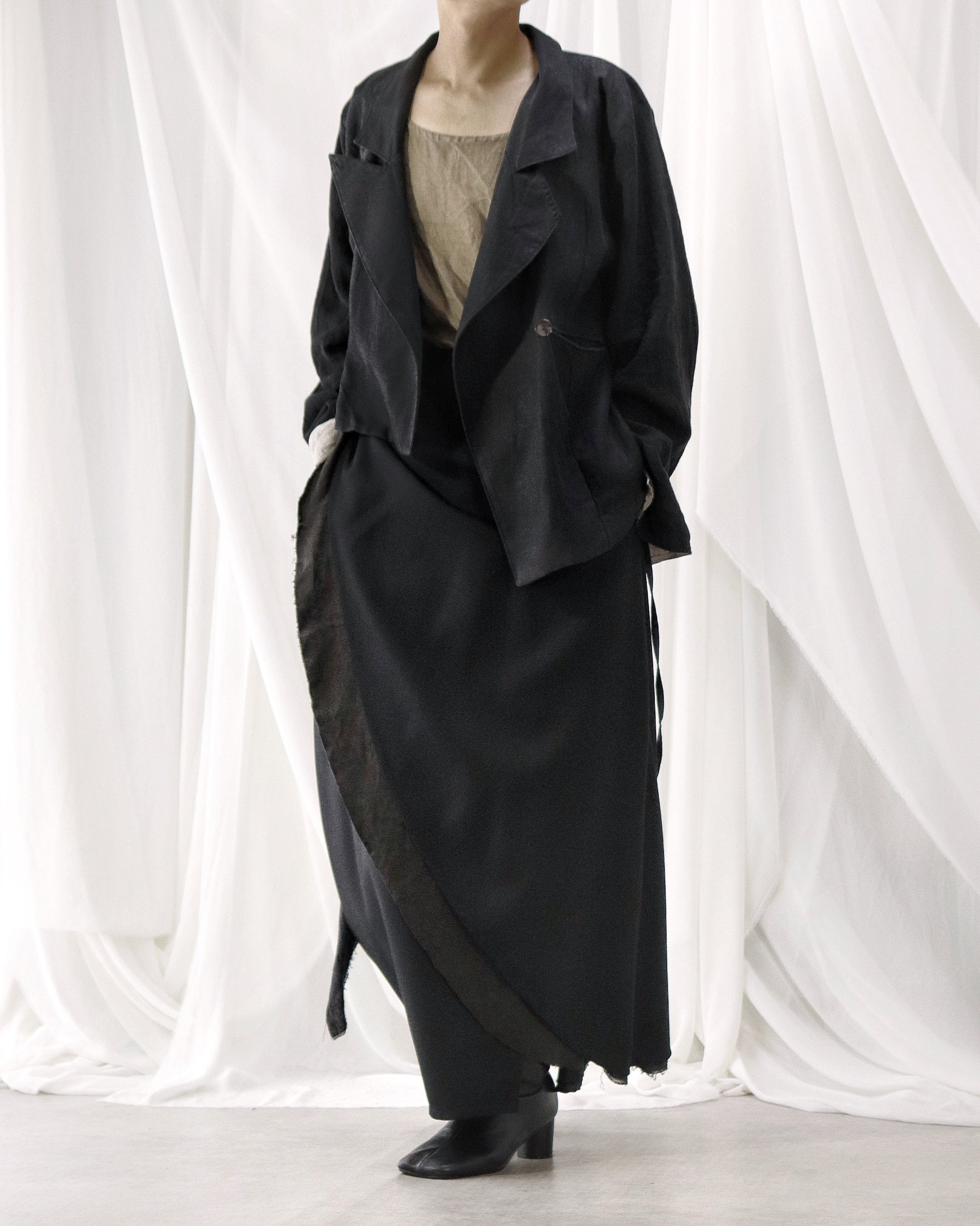 The front body, sleeves, and outer collar are made from different linen fabrics, while the back body and inner collar are made from dark grey wool. Each fabric is relatively lightweight and suitable for wear from spring through autumn.