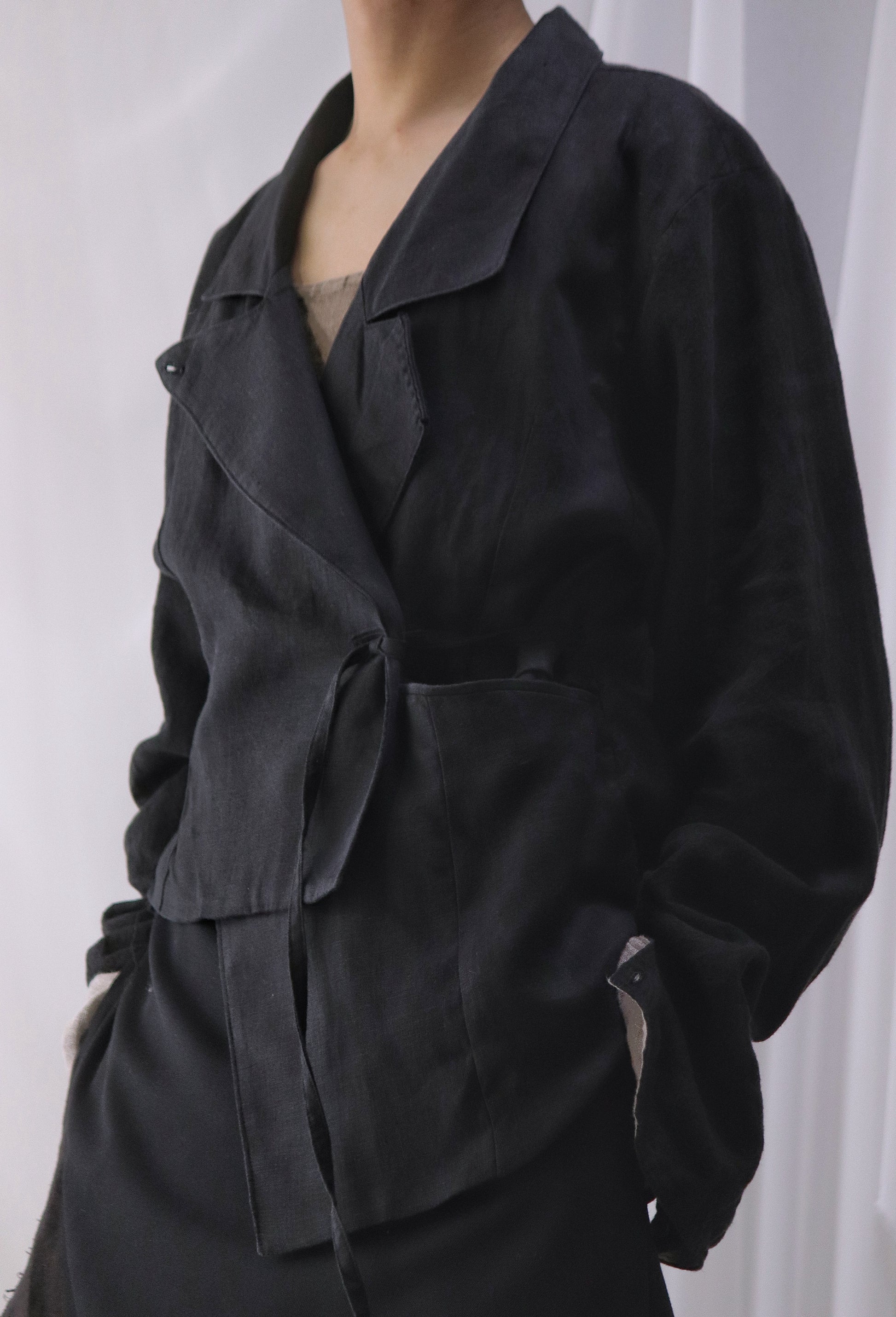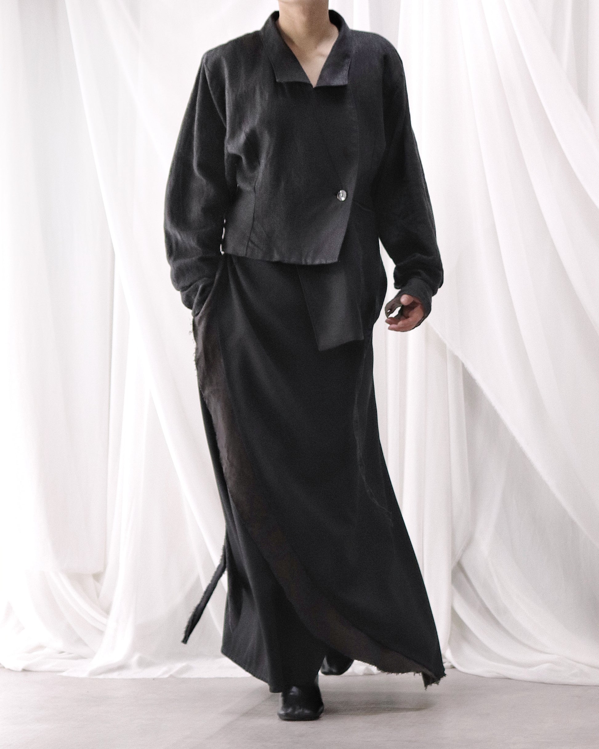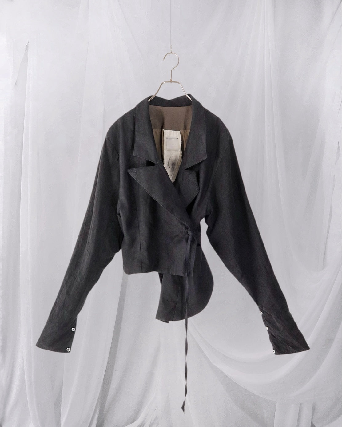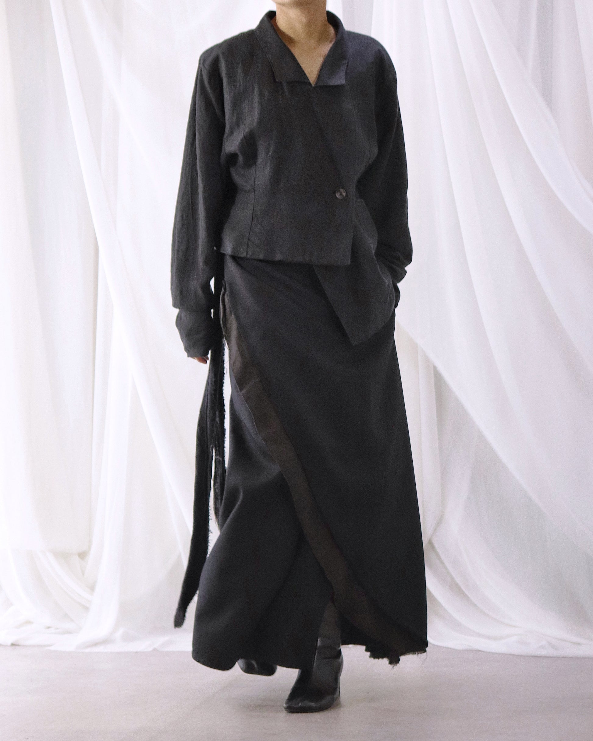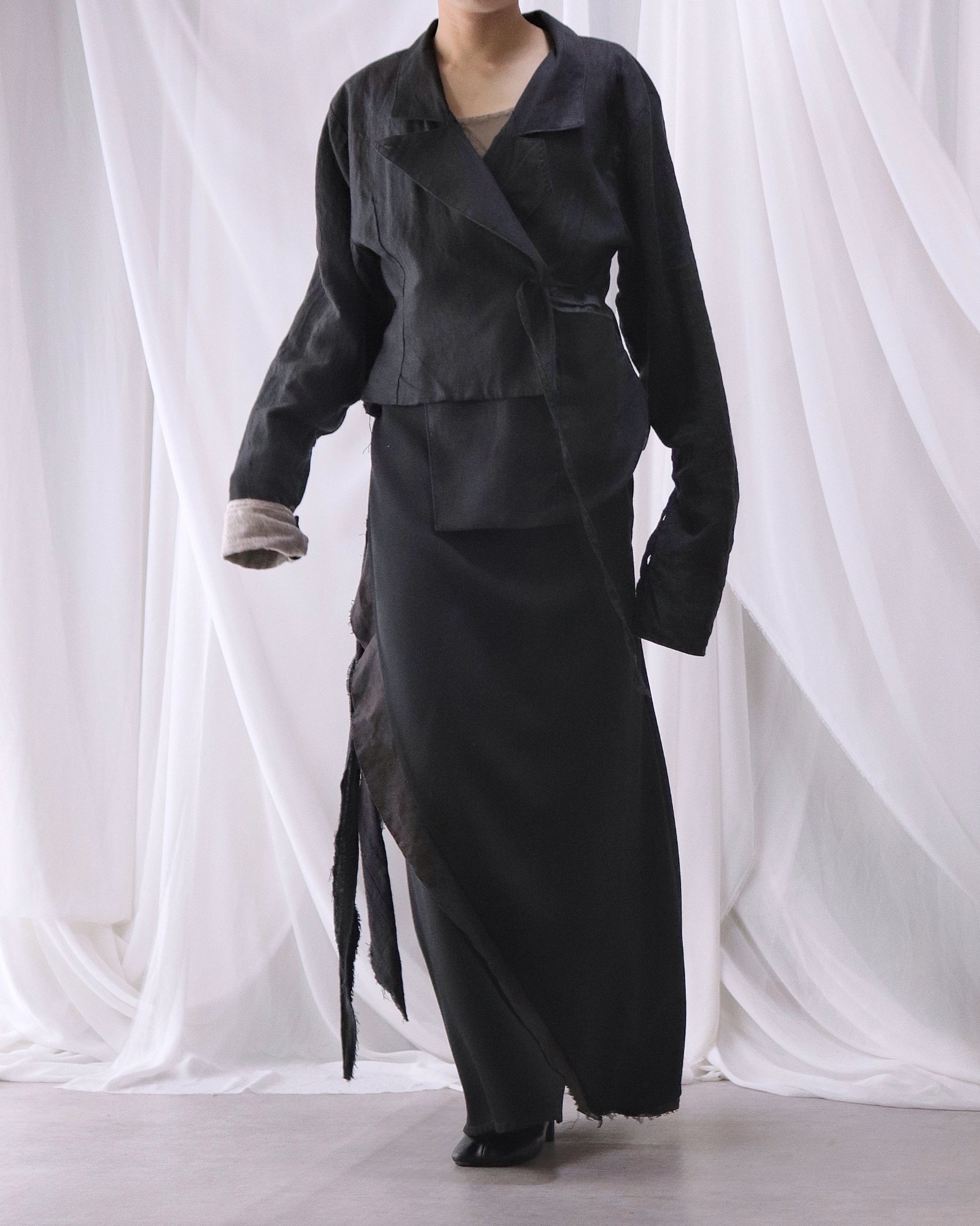 The front body, sleeves, and outer collar are made from different linen fabrics, while the back body and inner collar are made from dark grey wool. Each fabric is relatively lightweight and suitable for wear from spring through autumn.