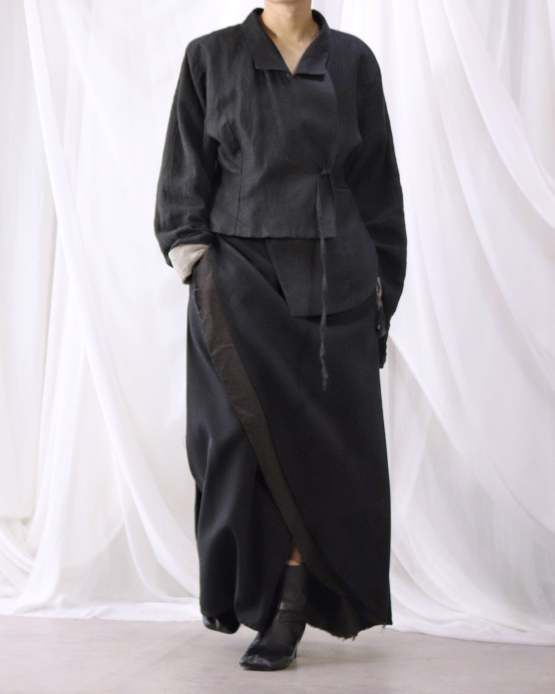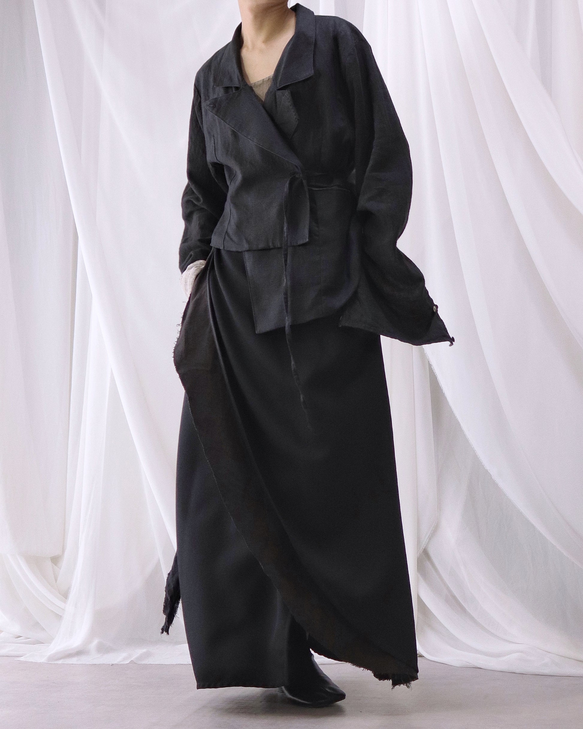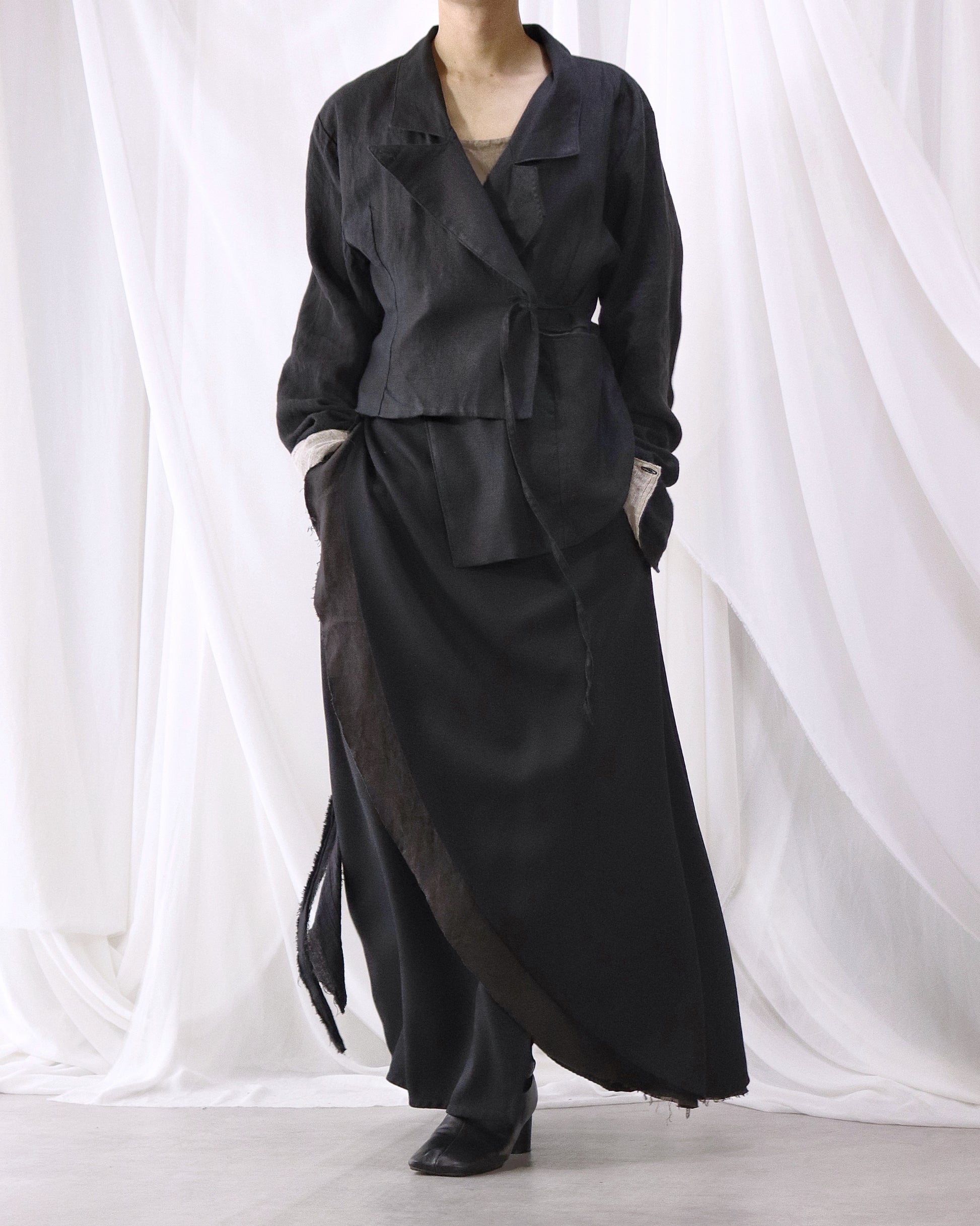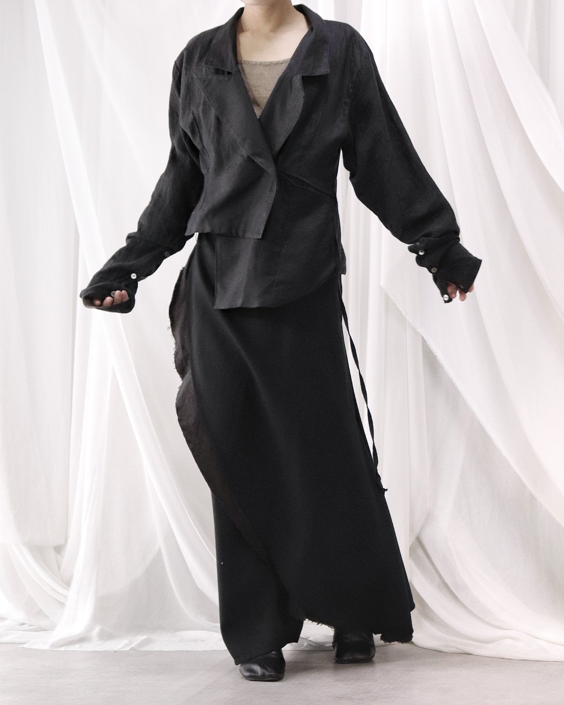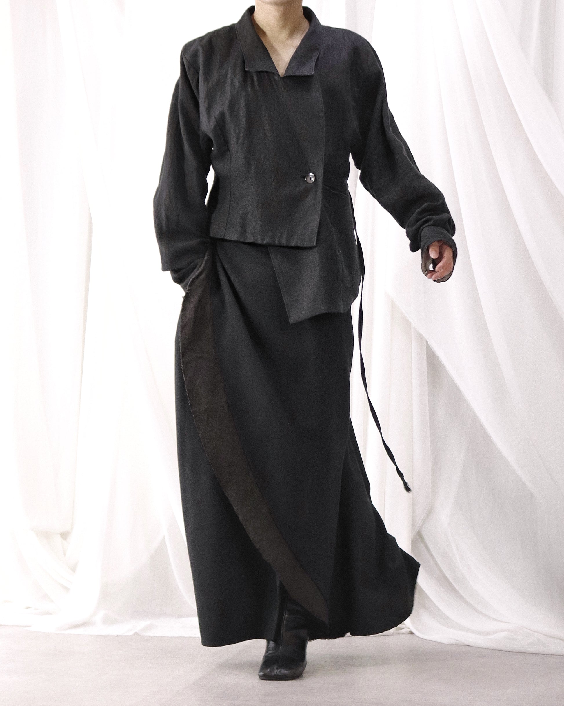 The front body, sleeves, and outer collar are made from different linen fabrics, while the back body and inner collar are made from dark grey wool. Each fabric is relatively lightweight and suitable for wear from spring through autumn.