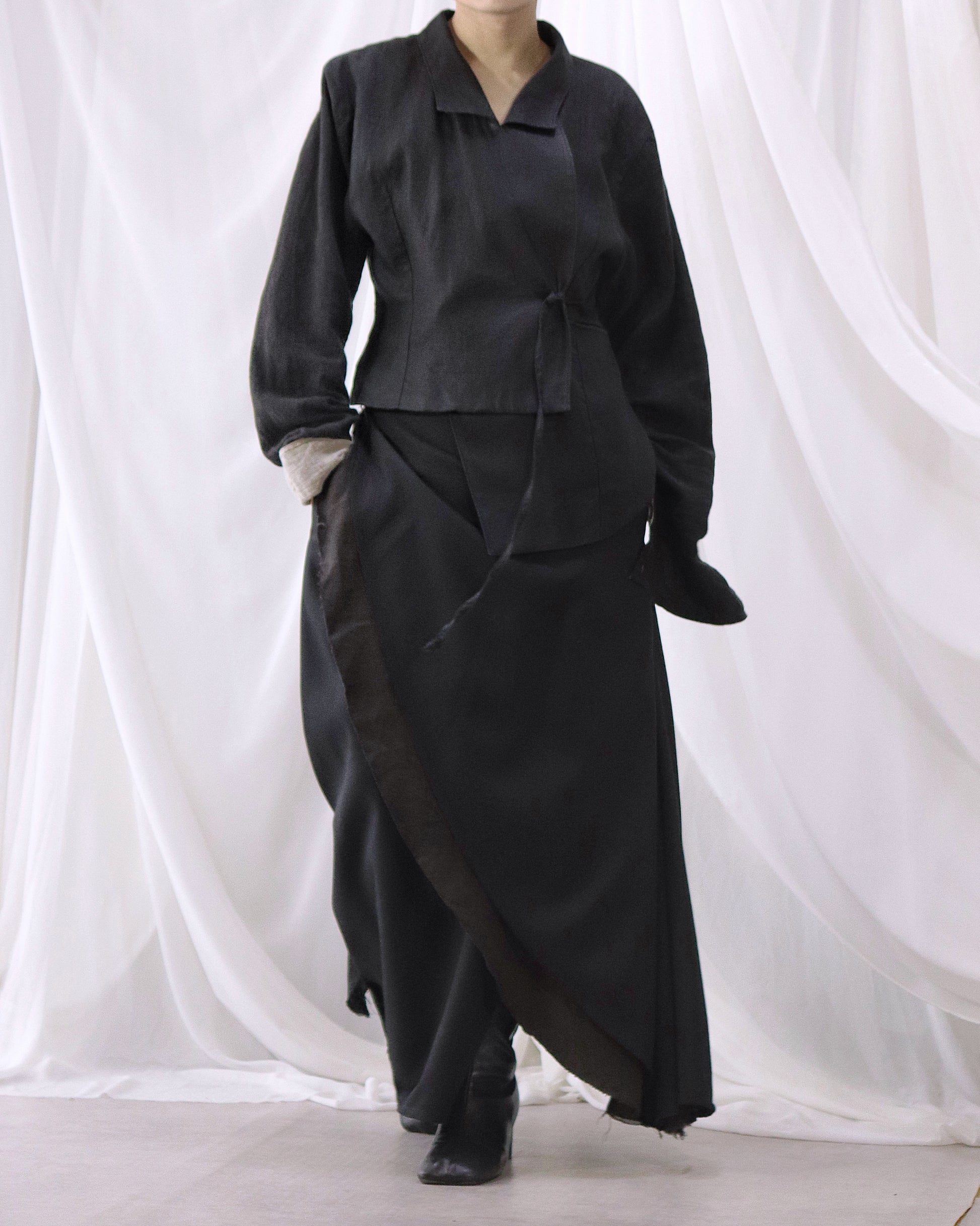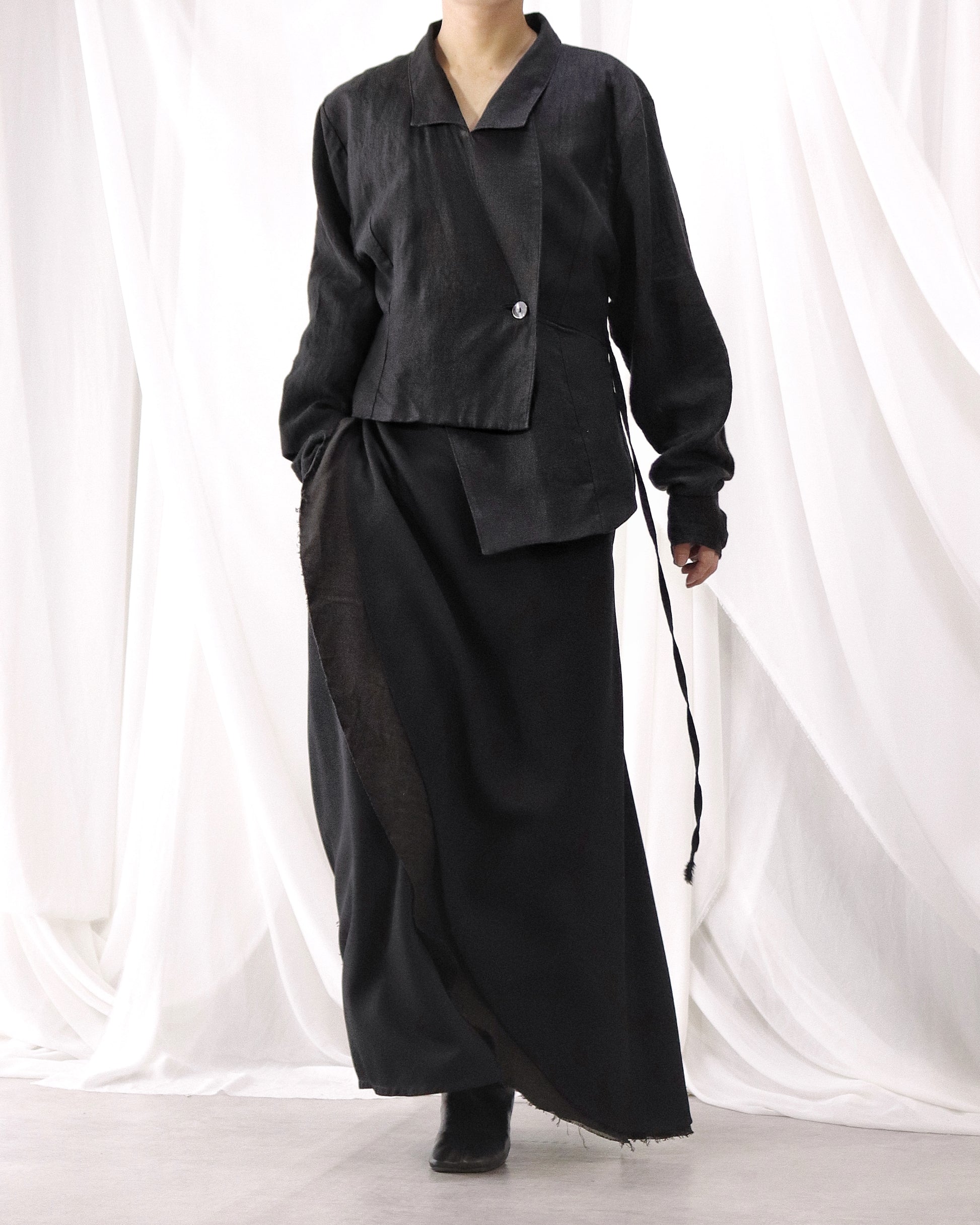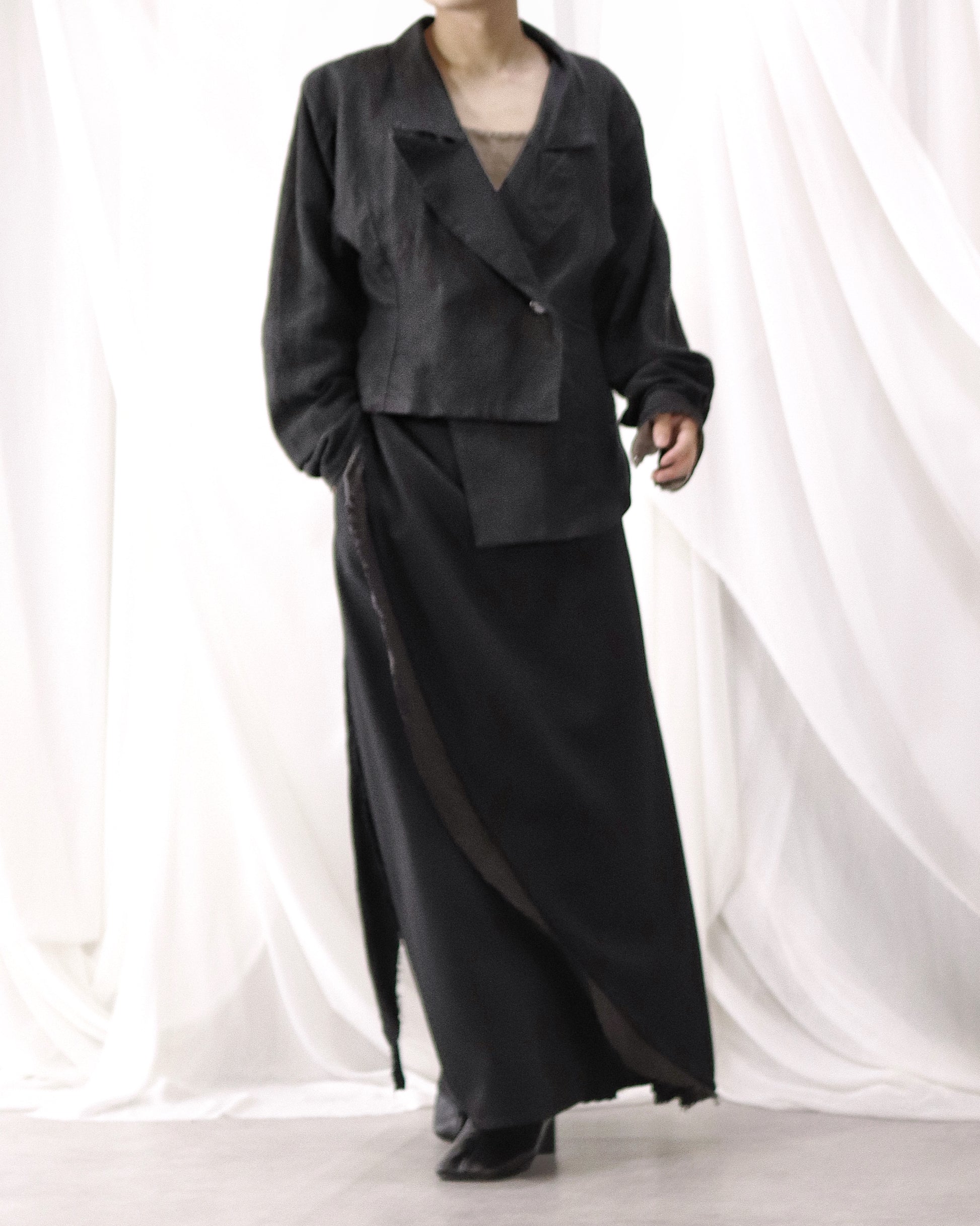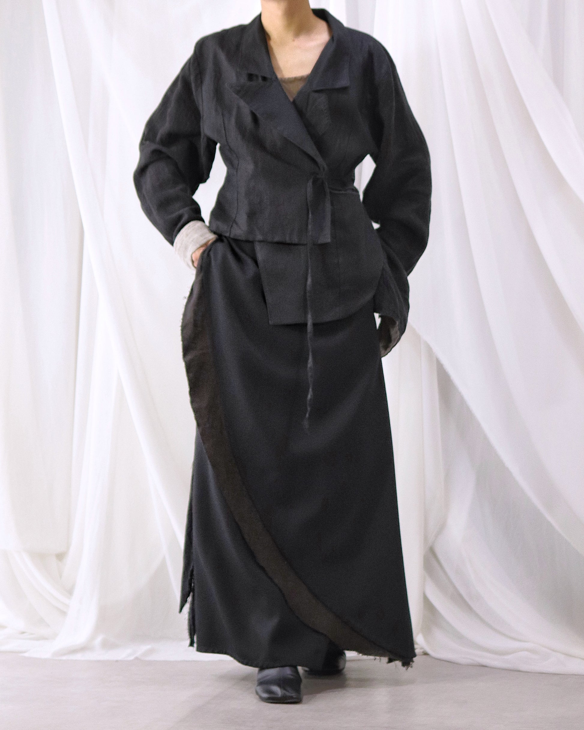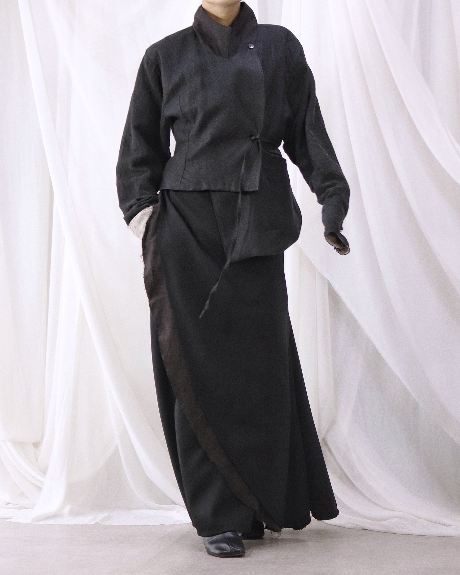 The front body, sleeves, and outer collar are made from different linen fabrics, while the back body and inner collar are made from dark grey wool. Each fabric is relatively lightweight and suitable for wear from spring through autumn.