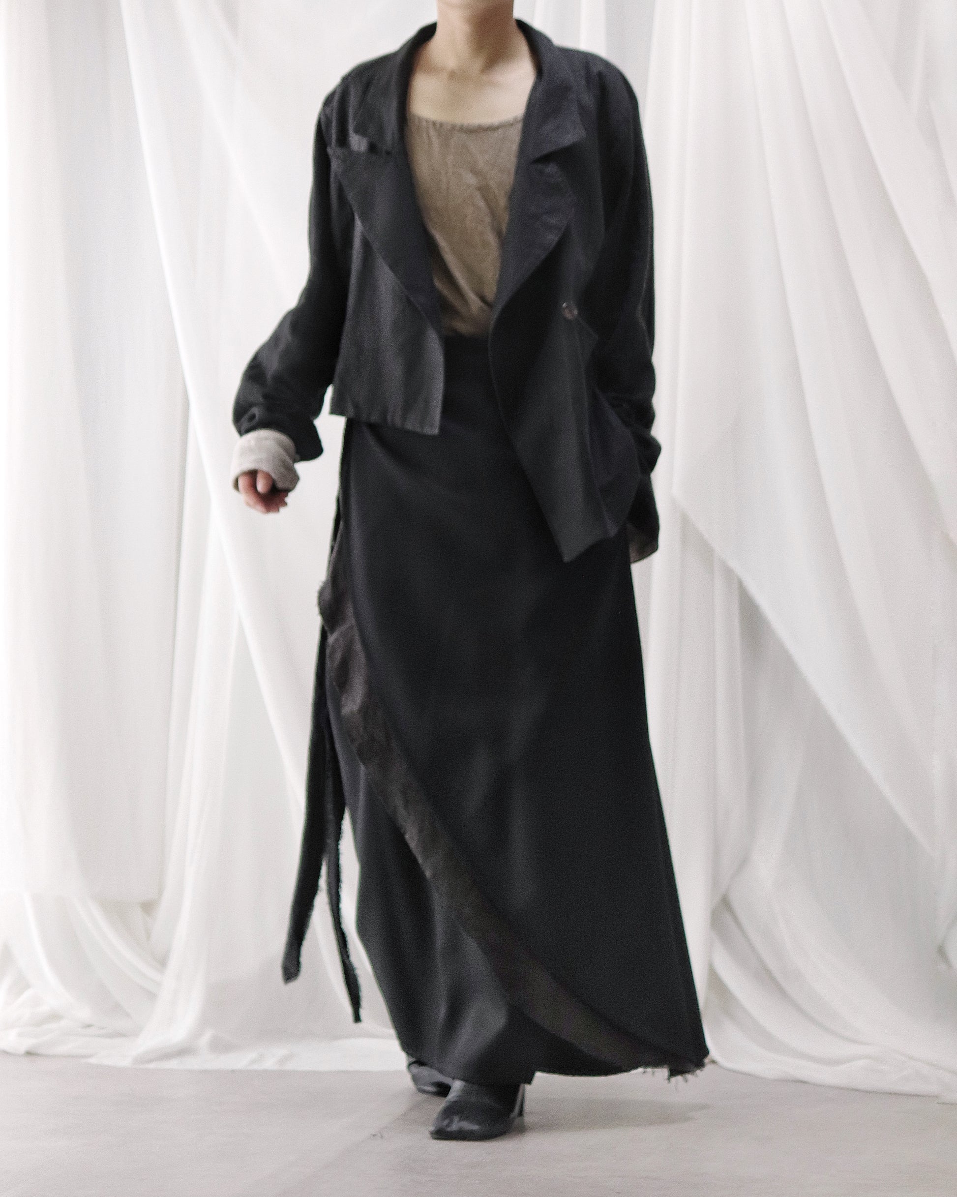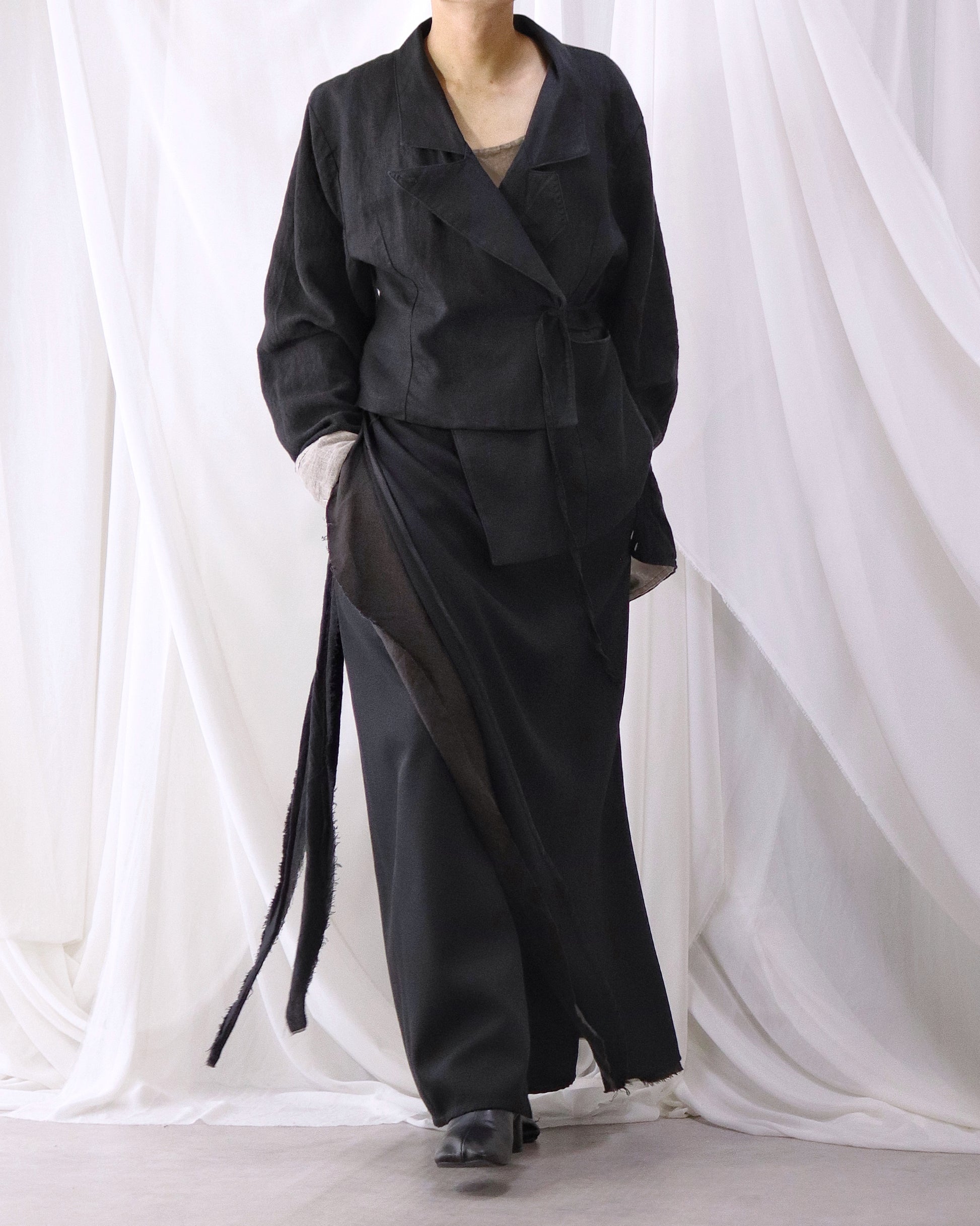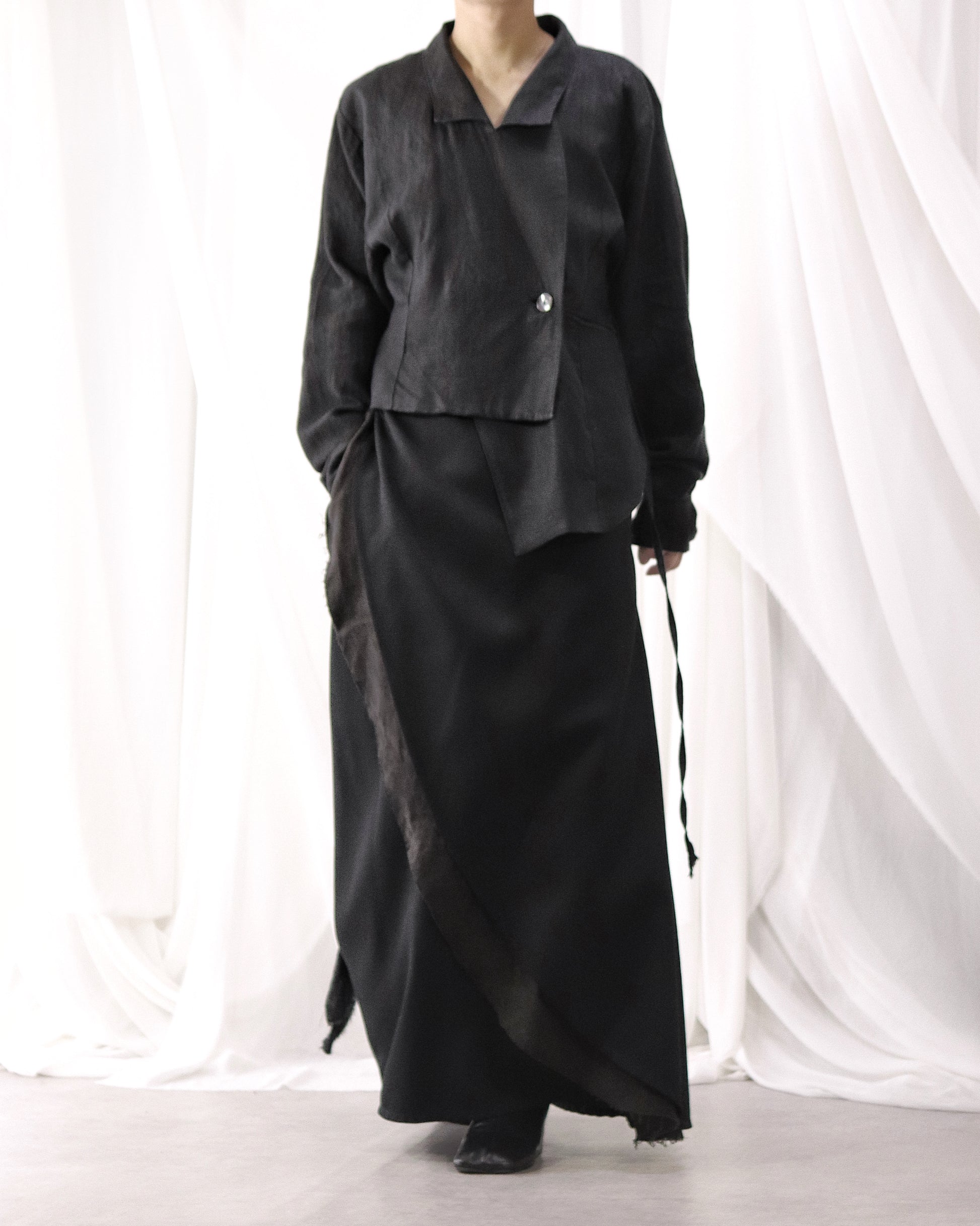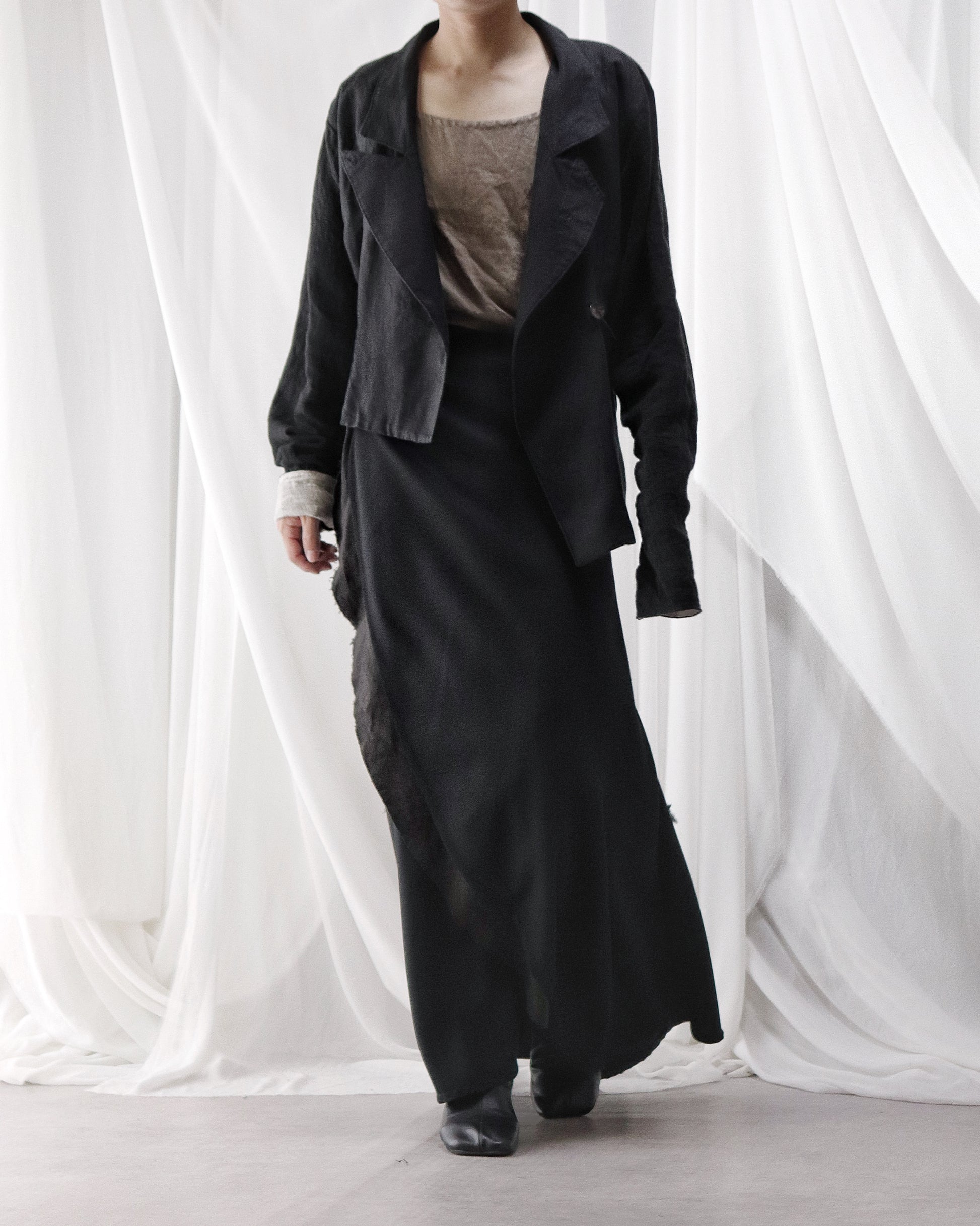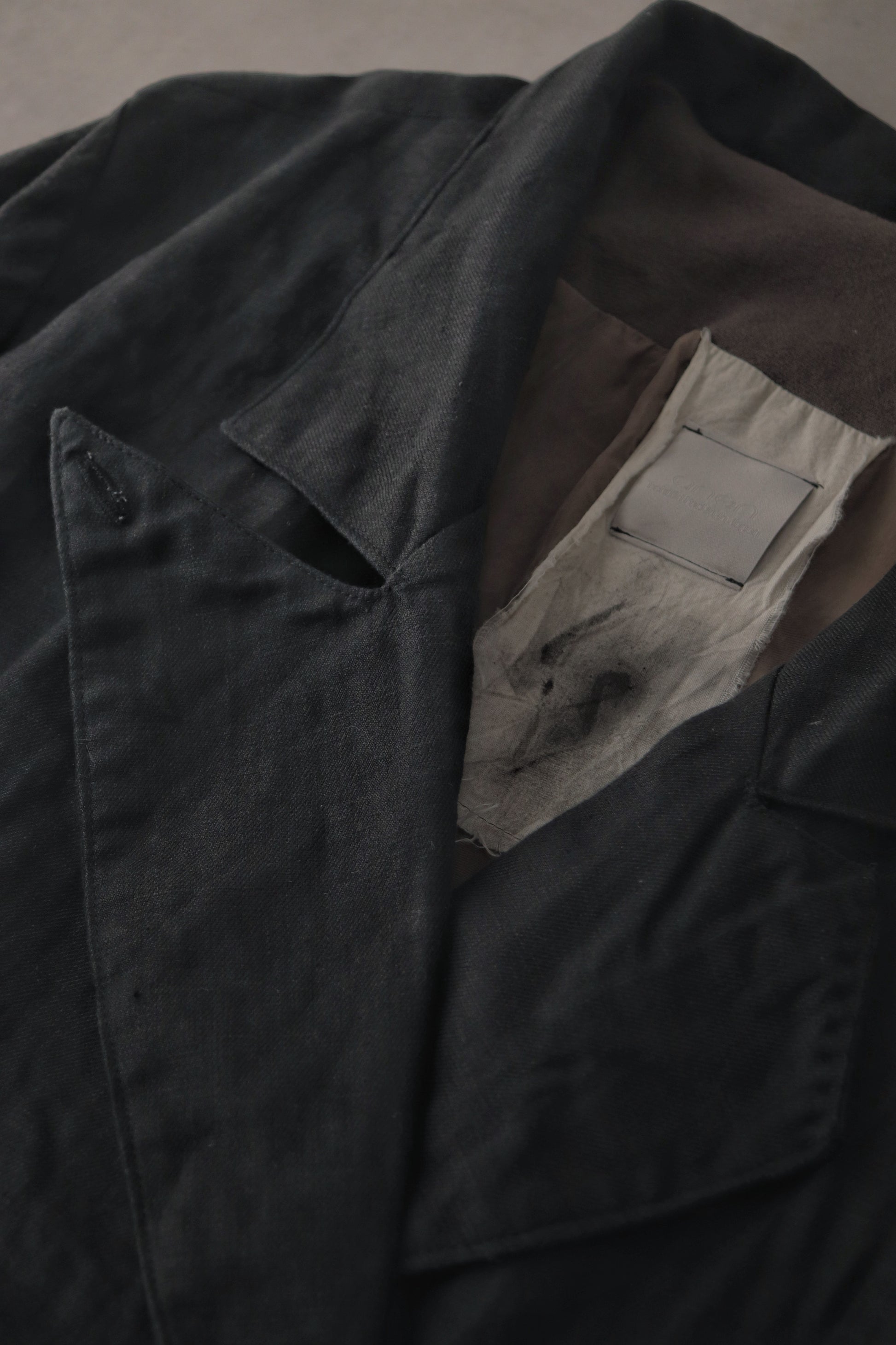The front body, sleeves, and outer collar are made from different linen fabrics, while the back body and inner collar are made from dark grey wool. Each fabric is relatively lightweight and suitable for wear from spring through autumn.