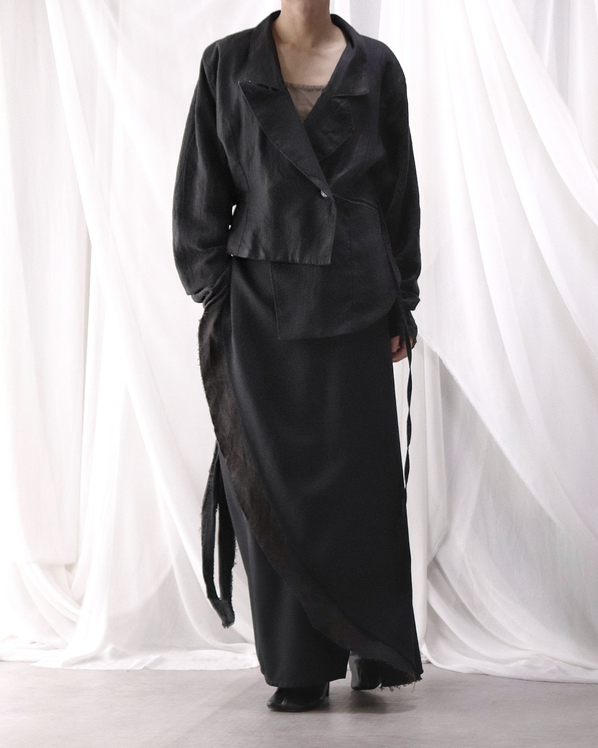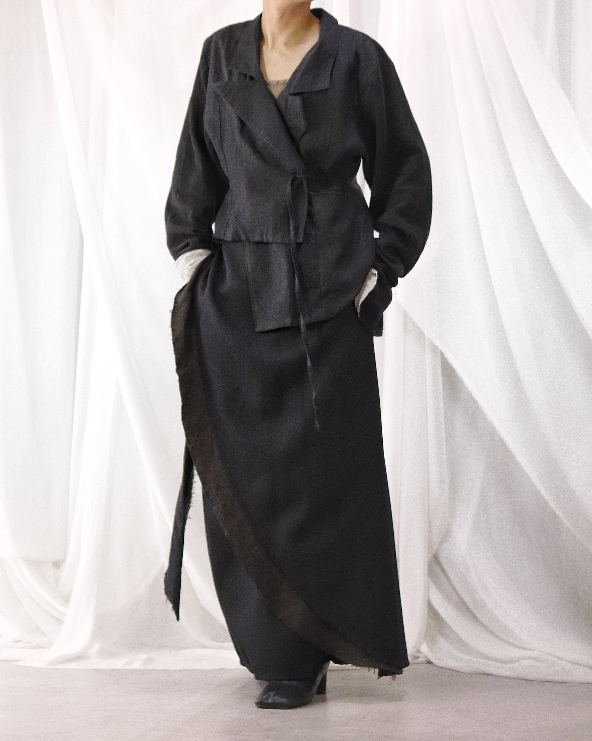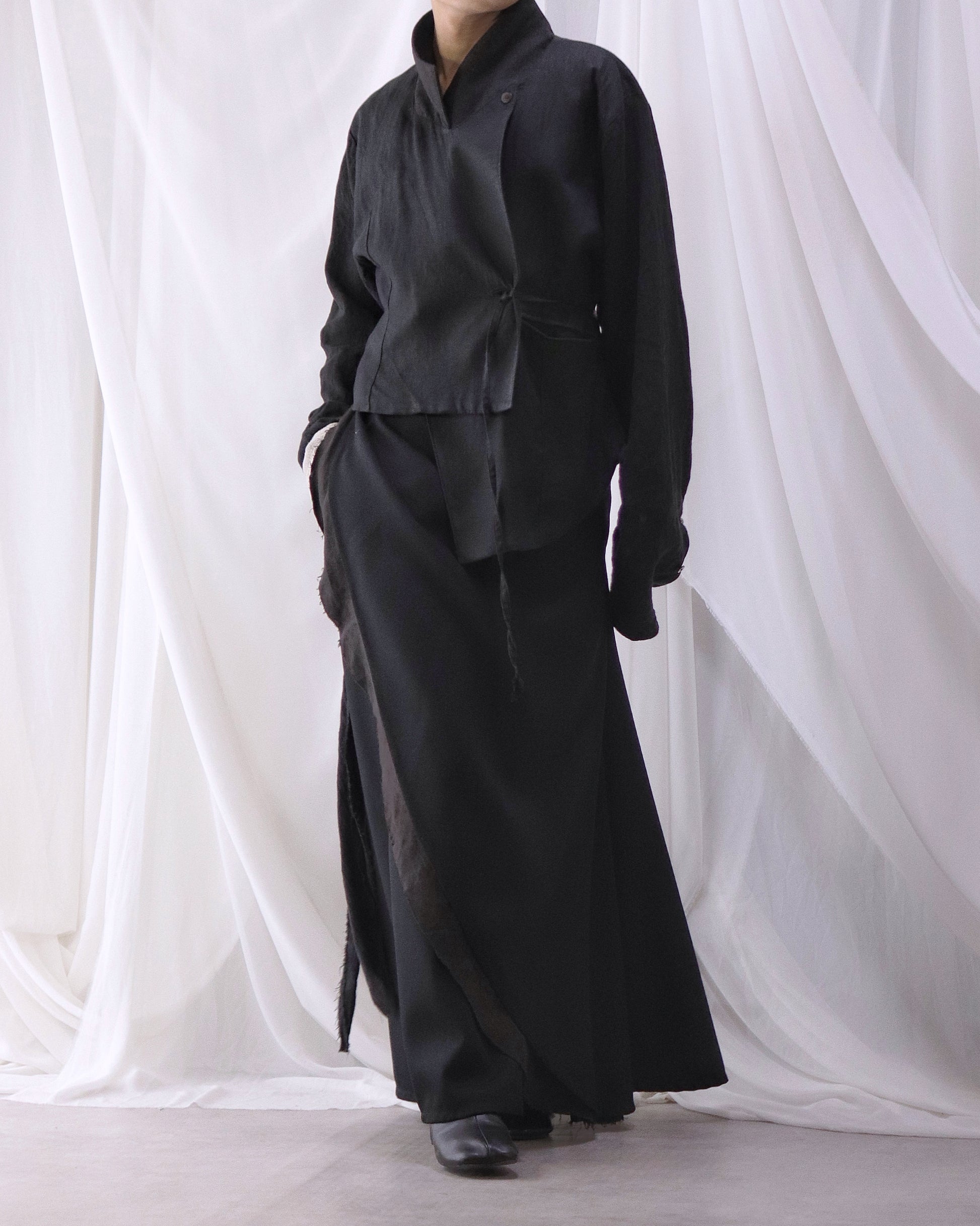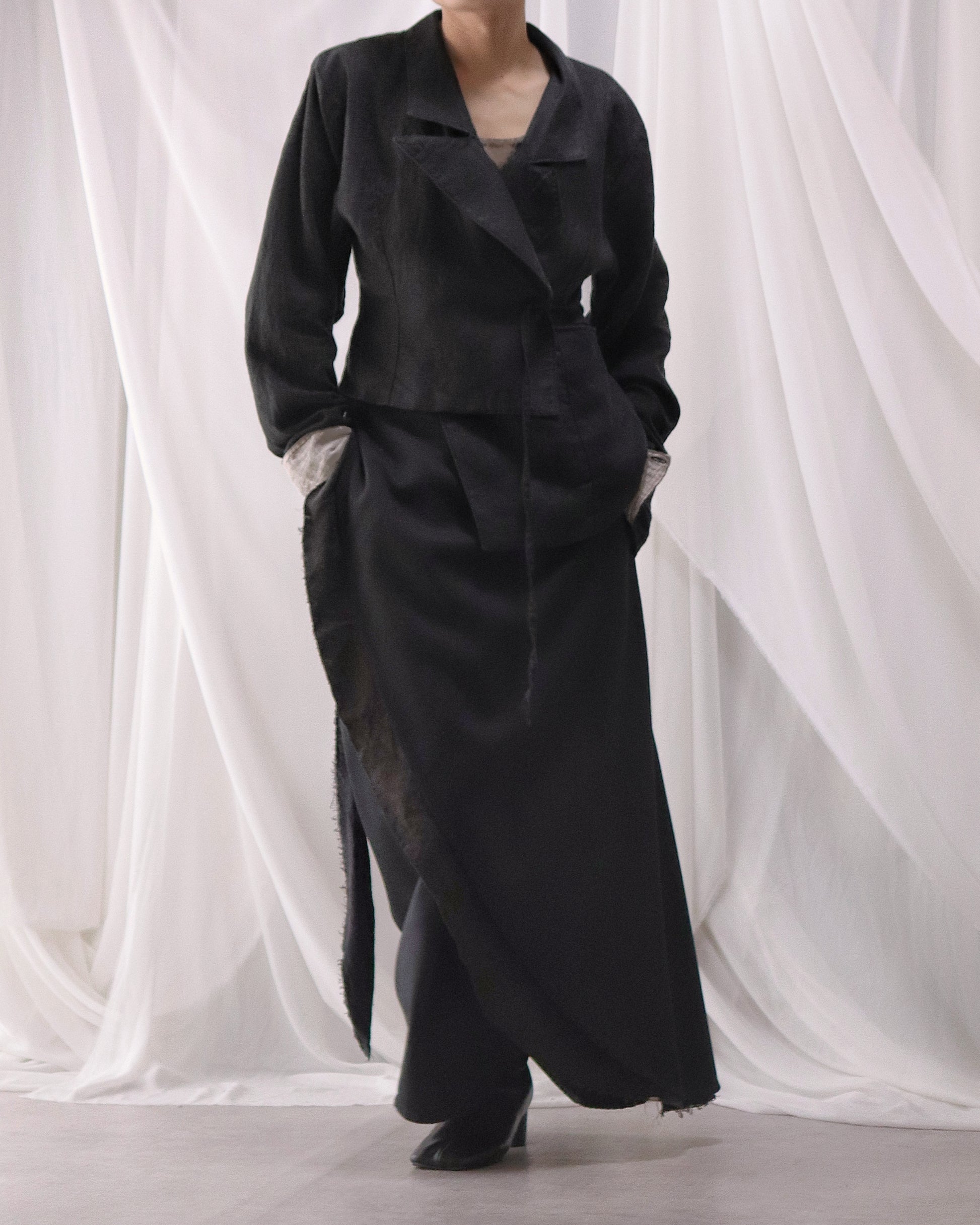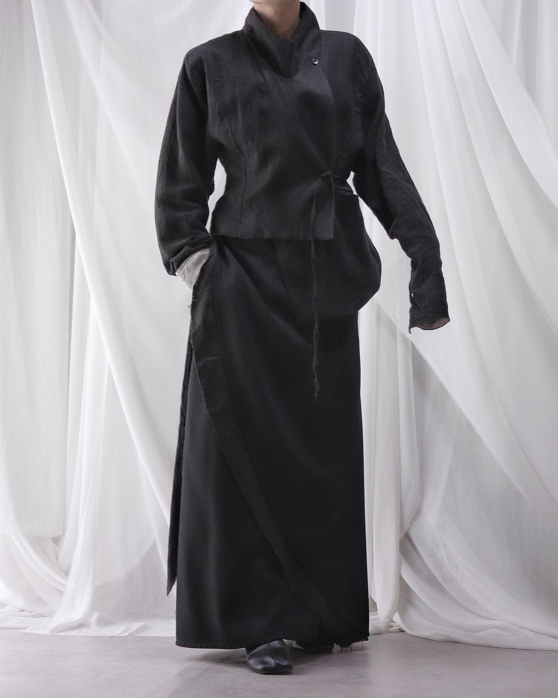 The front body, sleeves, and outer collar are made from different linen fabrics, while the back body and inner collar are made from dark grey wool. Each fabric is relatively lightweight and suitable for wear from spring through autumn.