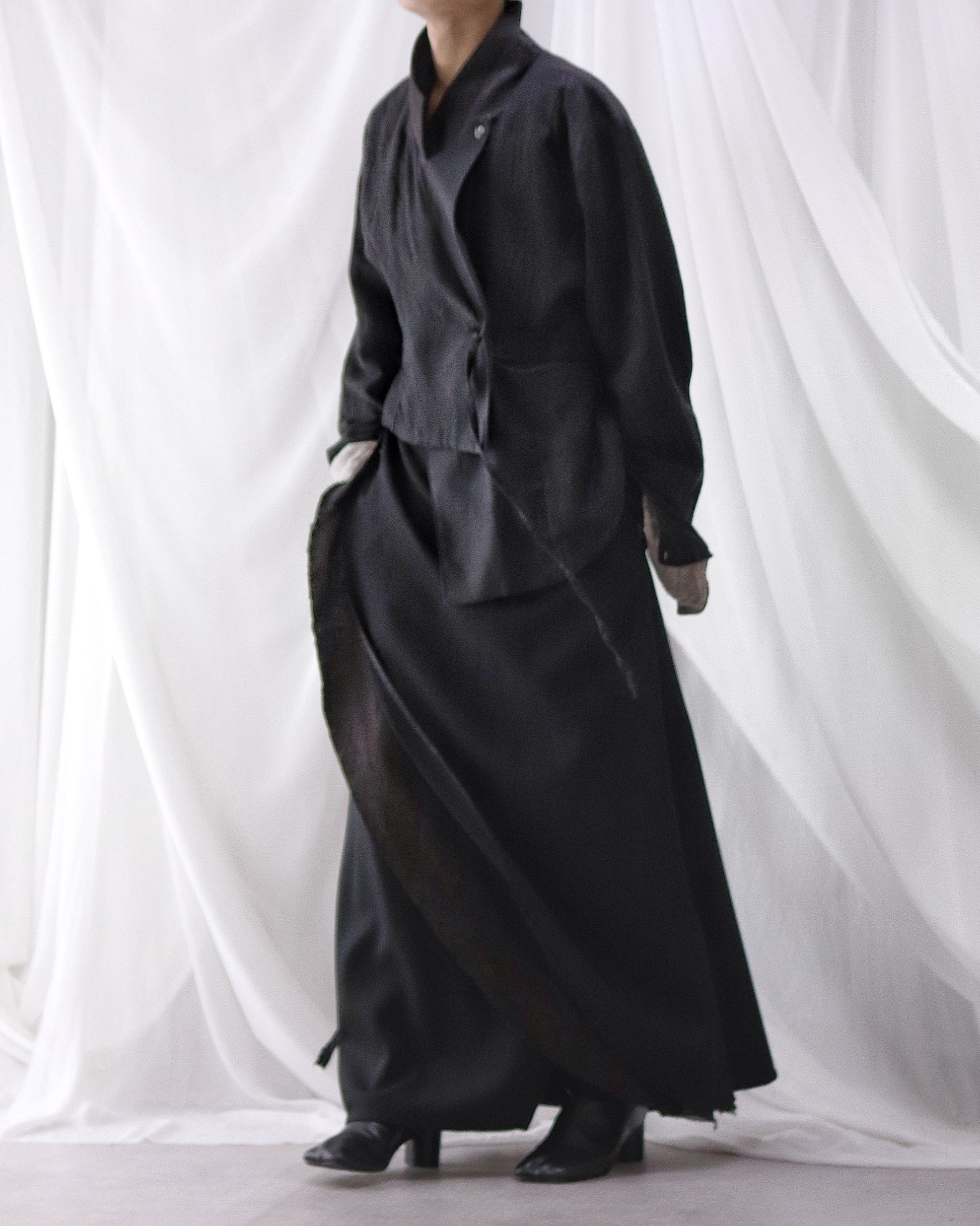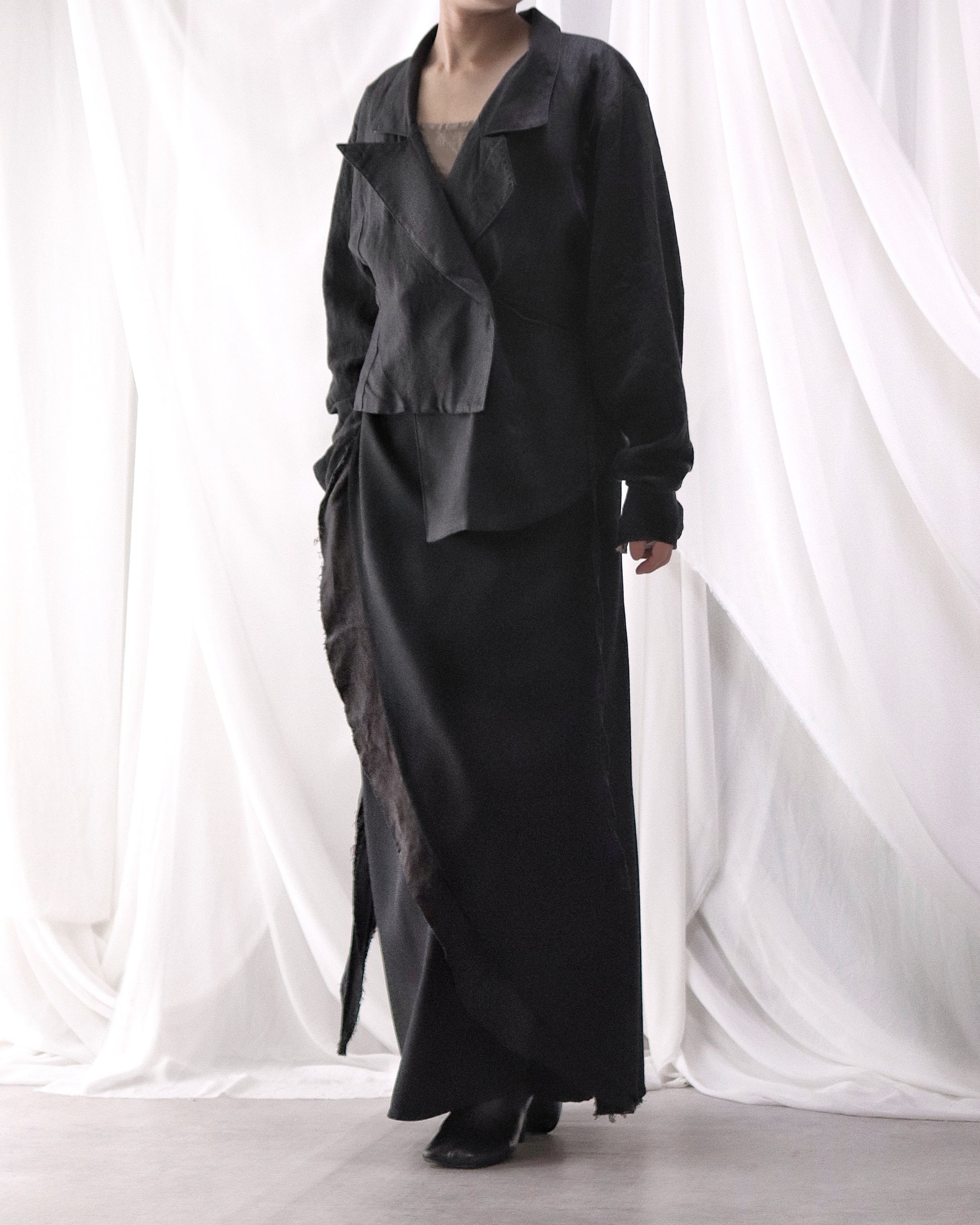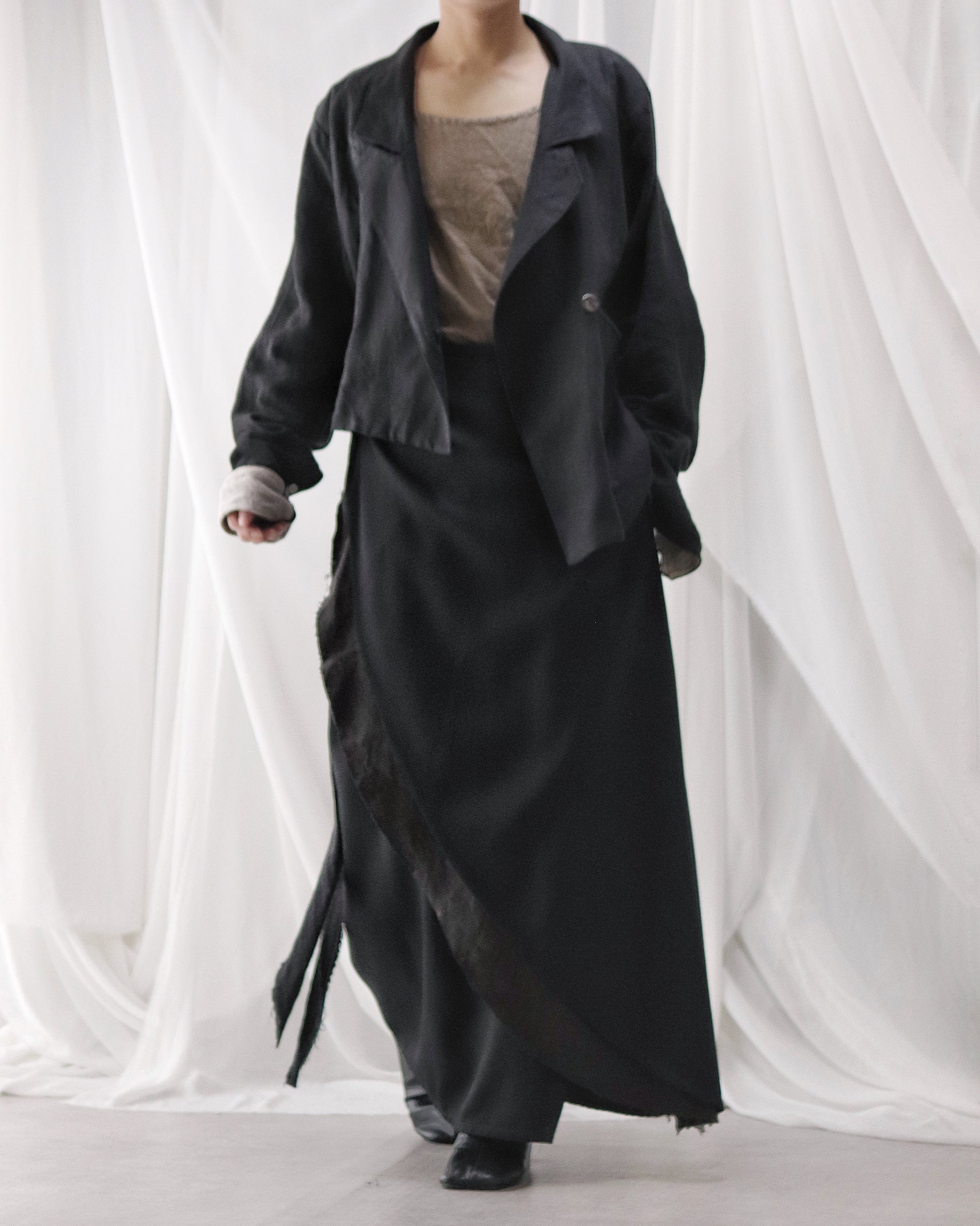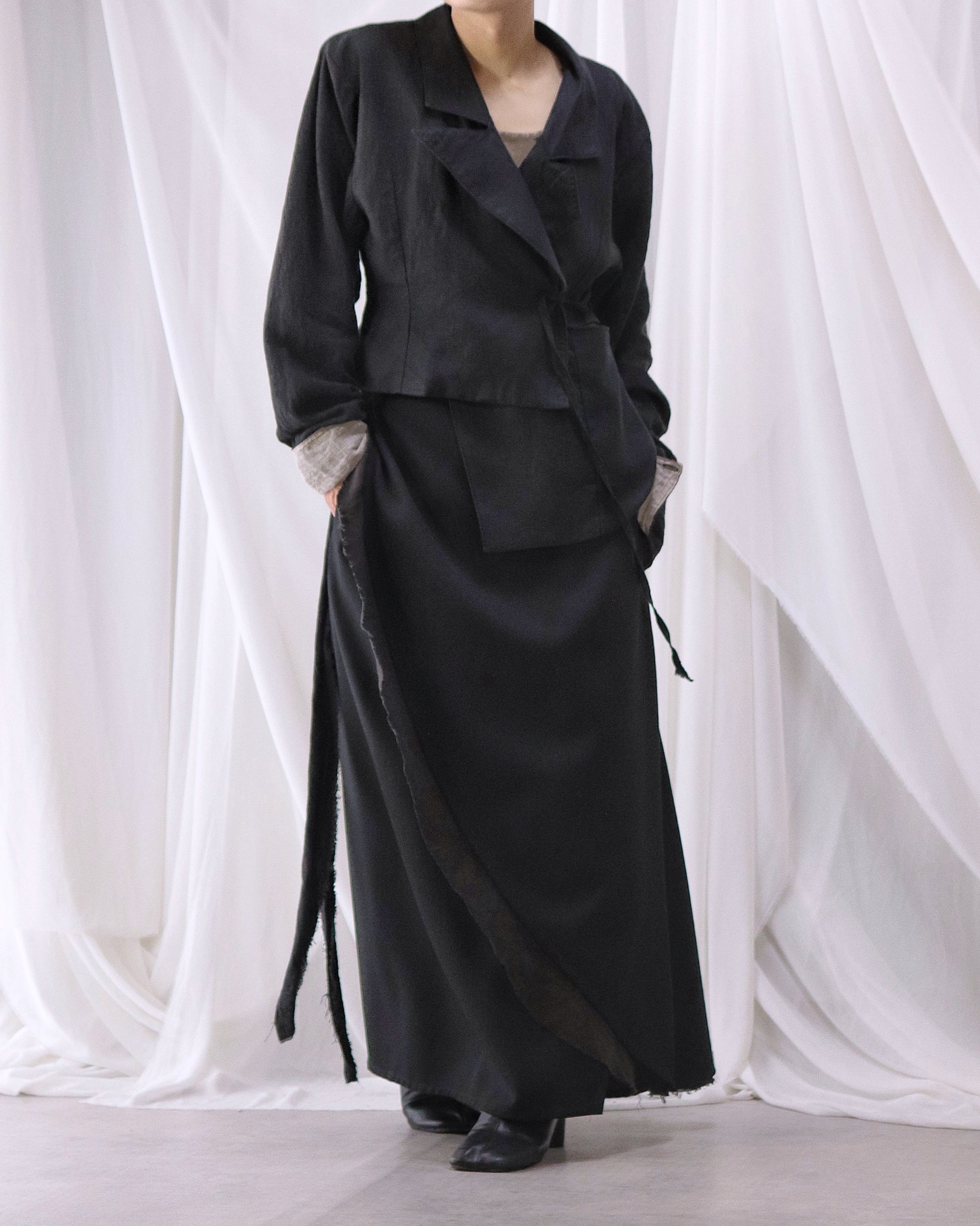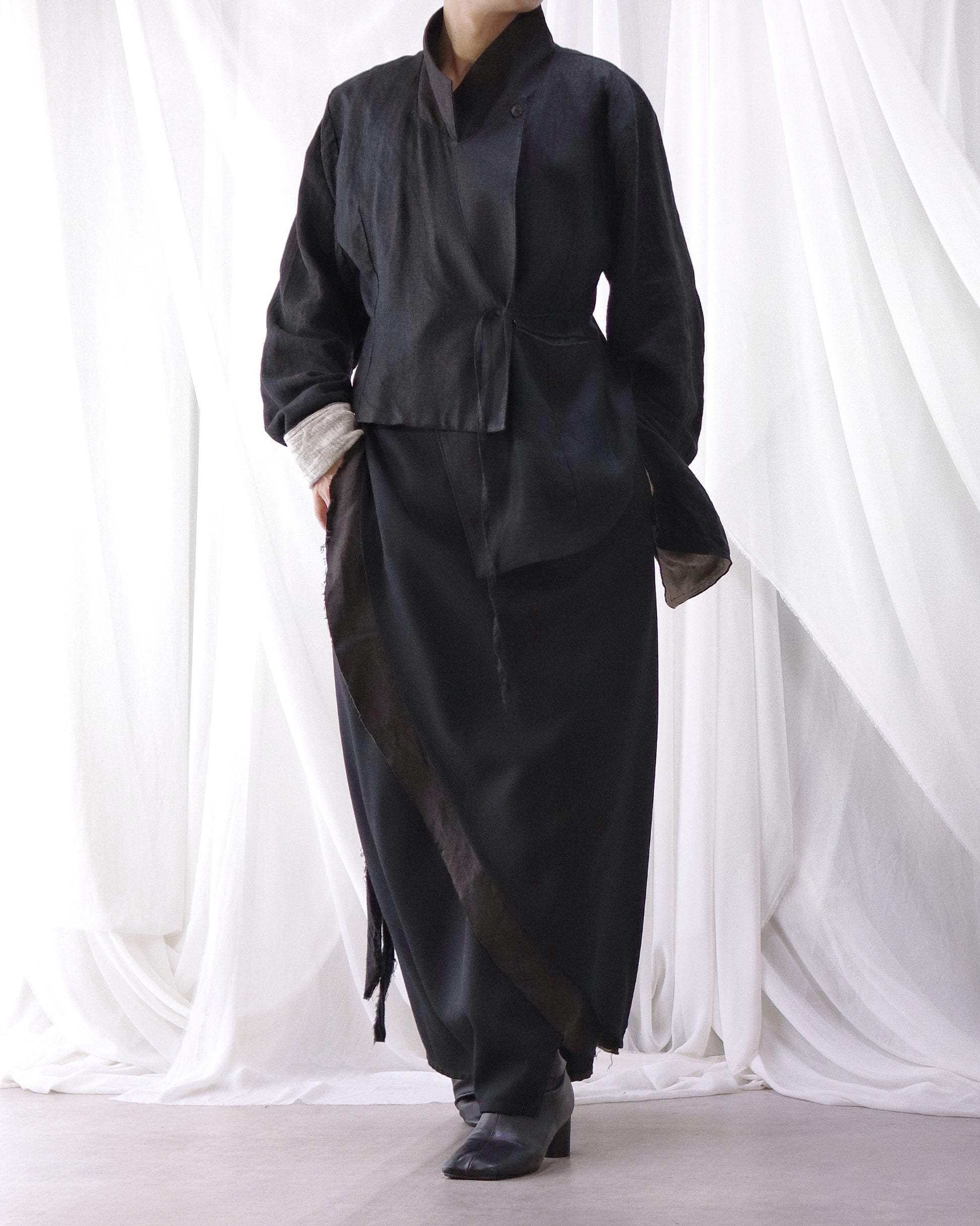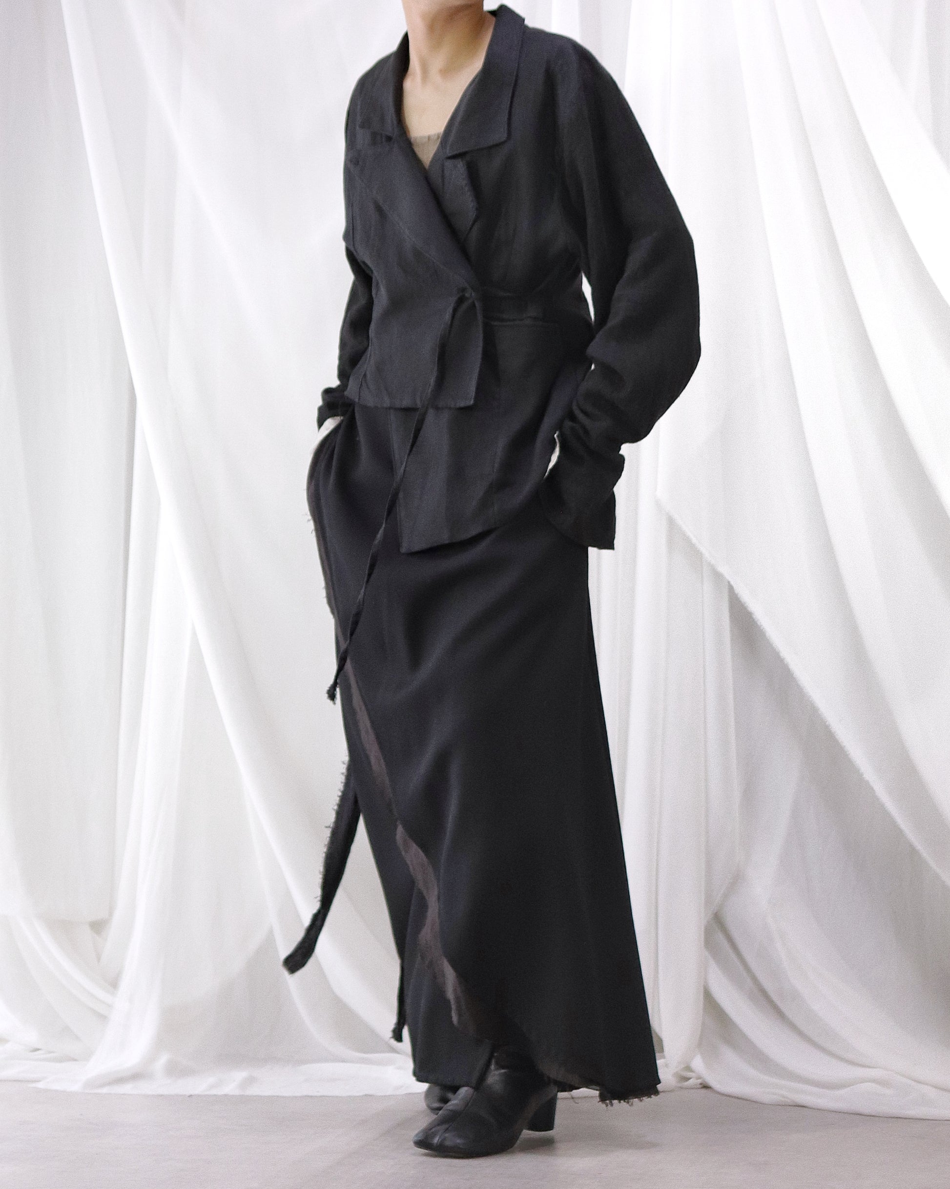 The front body, sleeves, and outer collar are made from different linen fabrics, while the back body and inner collar are made from dark grey wool. Each fabric is relatively lightweight and suitable for wear from spring through autumn.