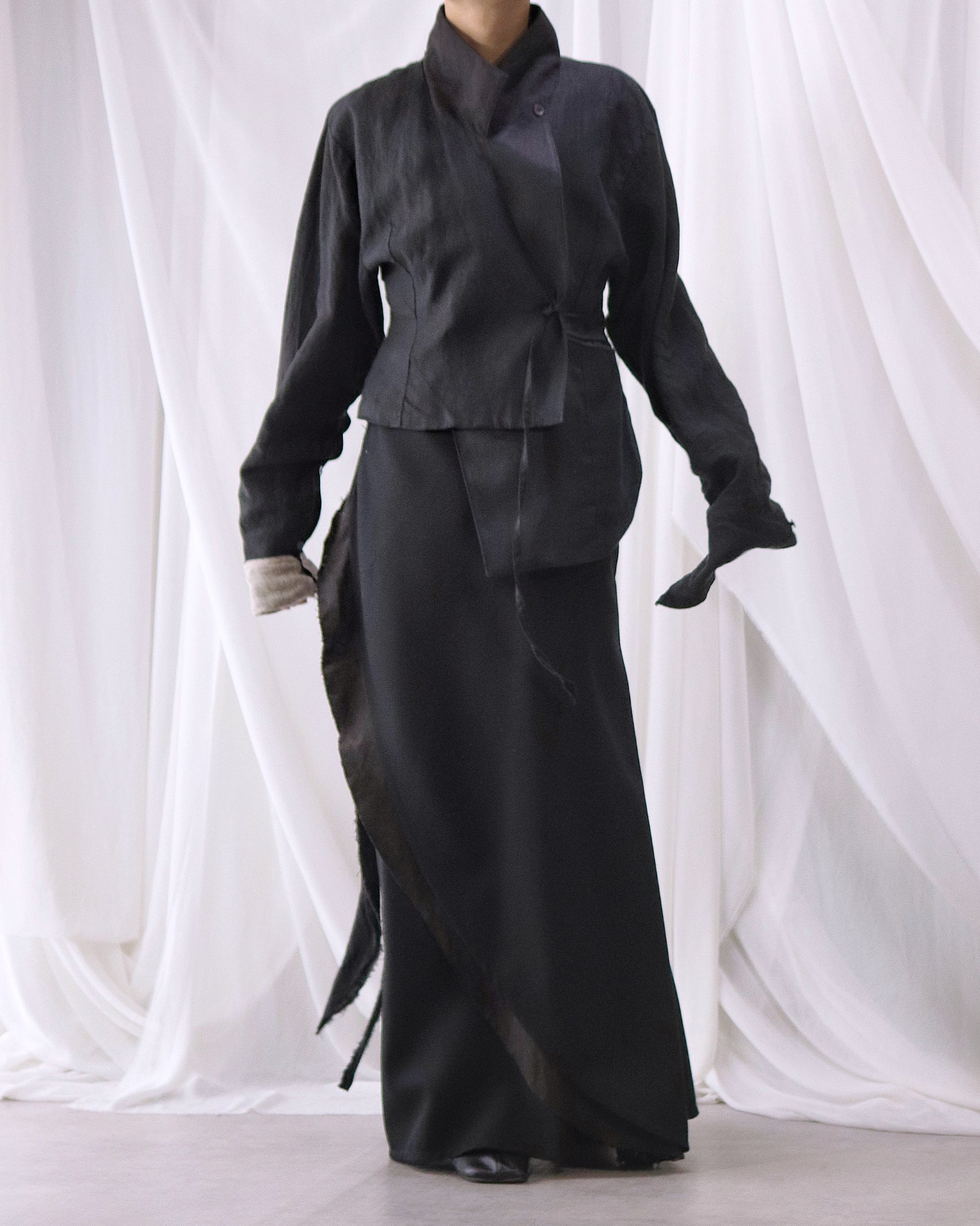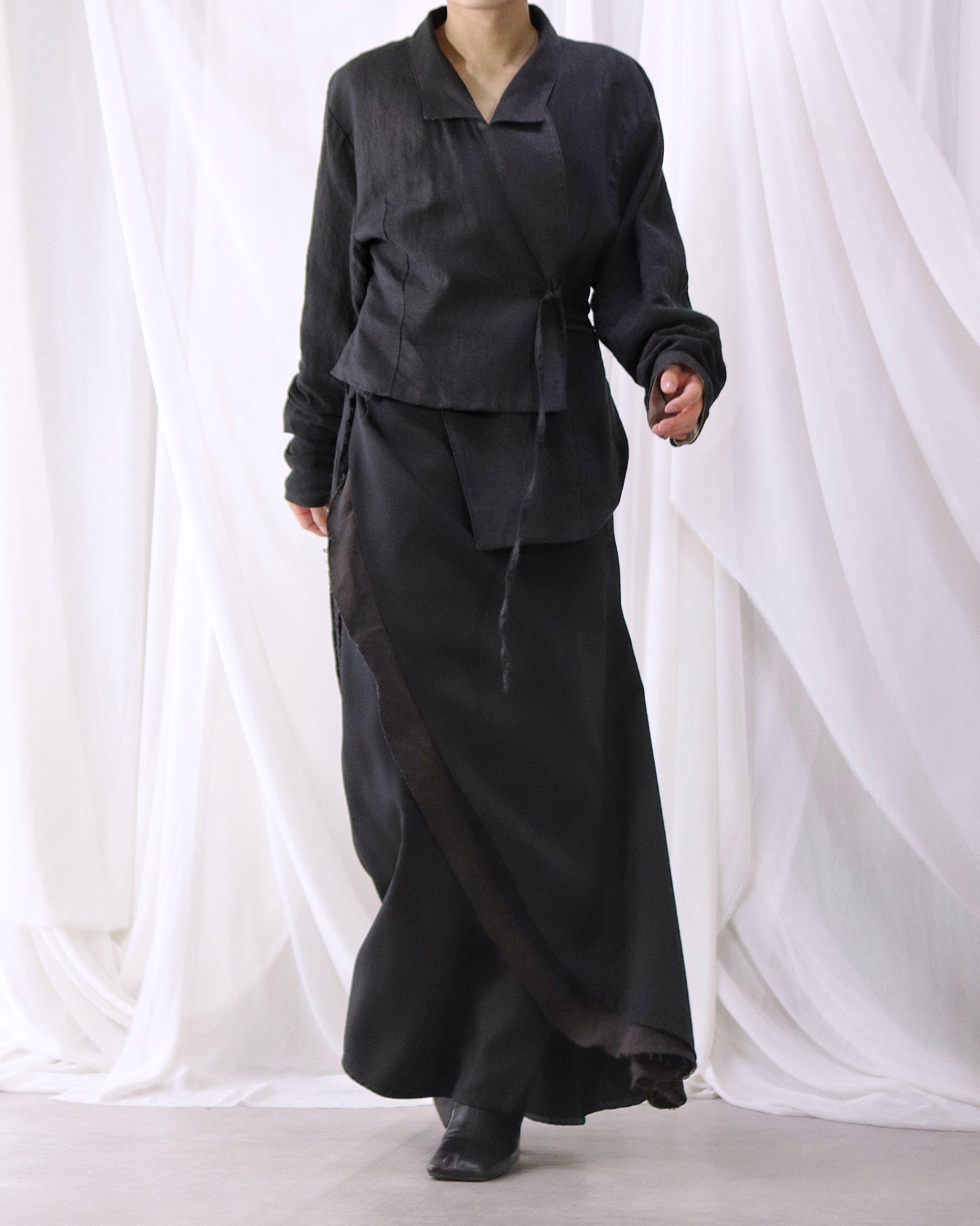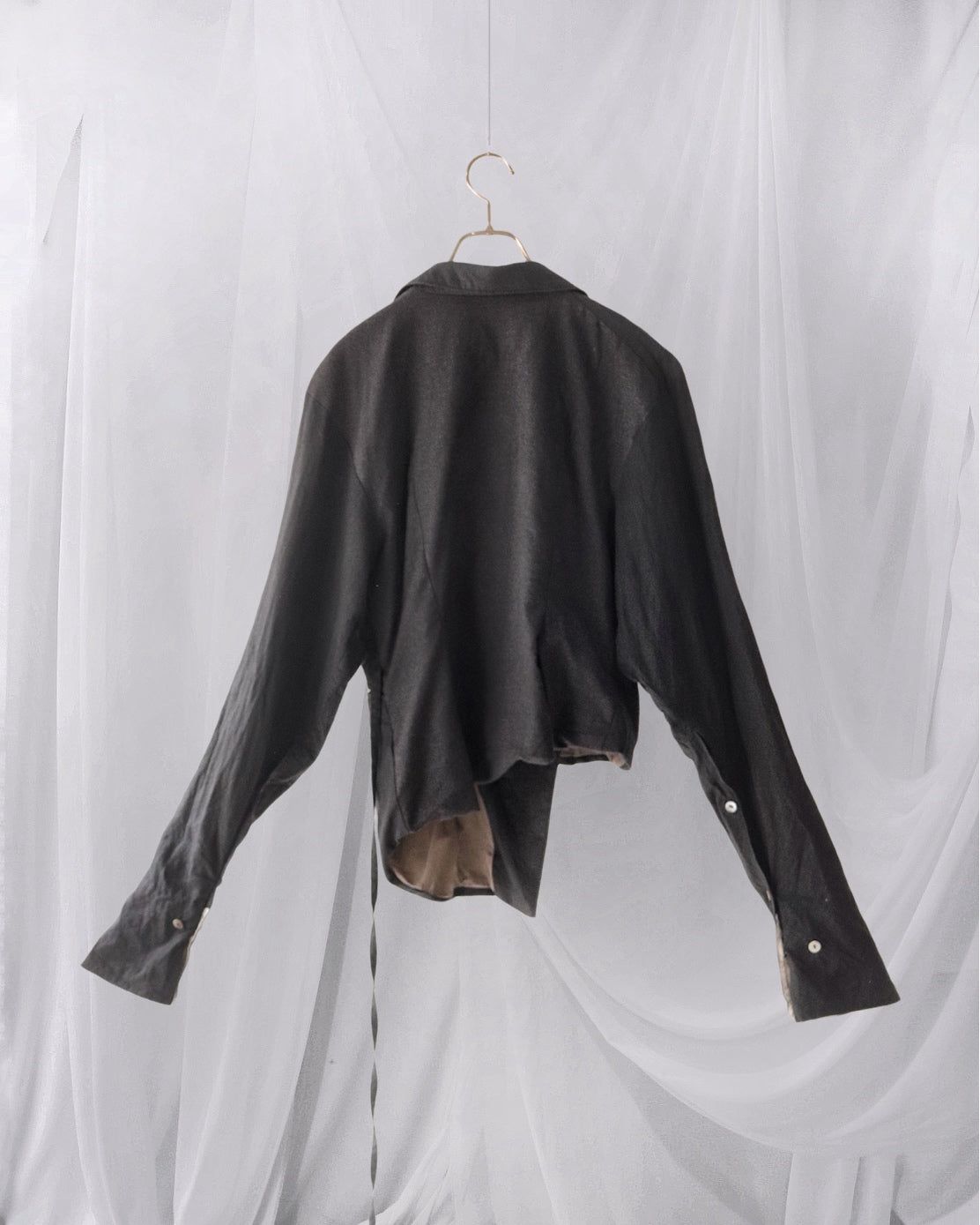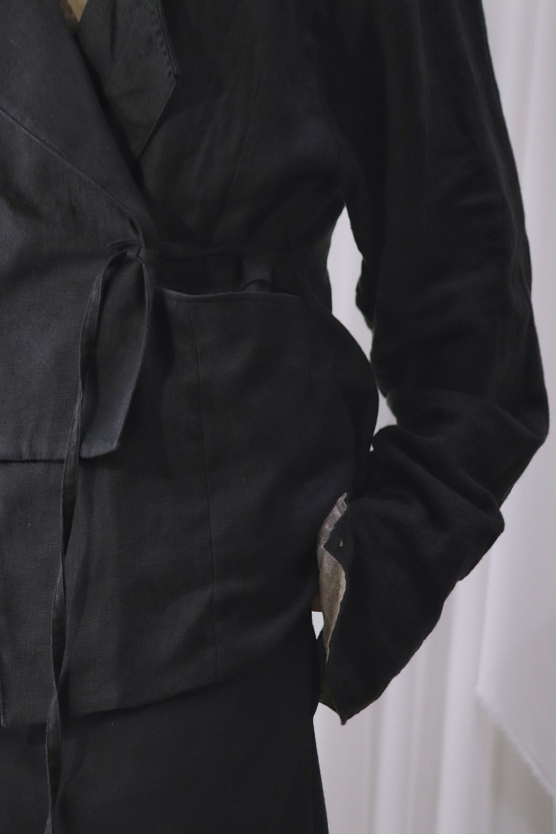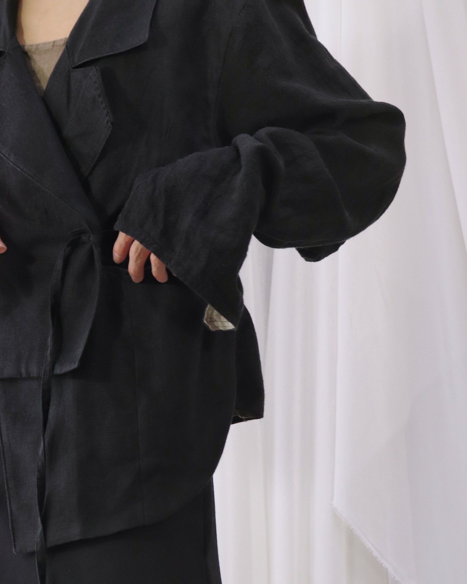 The front body, sleeves, and outer collar are made from different linen fabrics, while the back body and inner collar are made from dark grey wool. Each fabric is relatively lightweight and suitable for wear from spring through autumn.