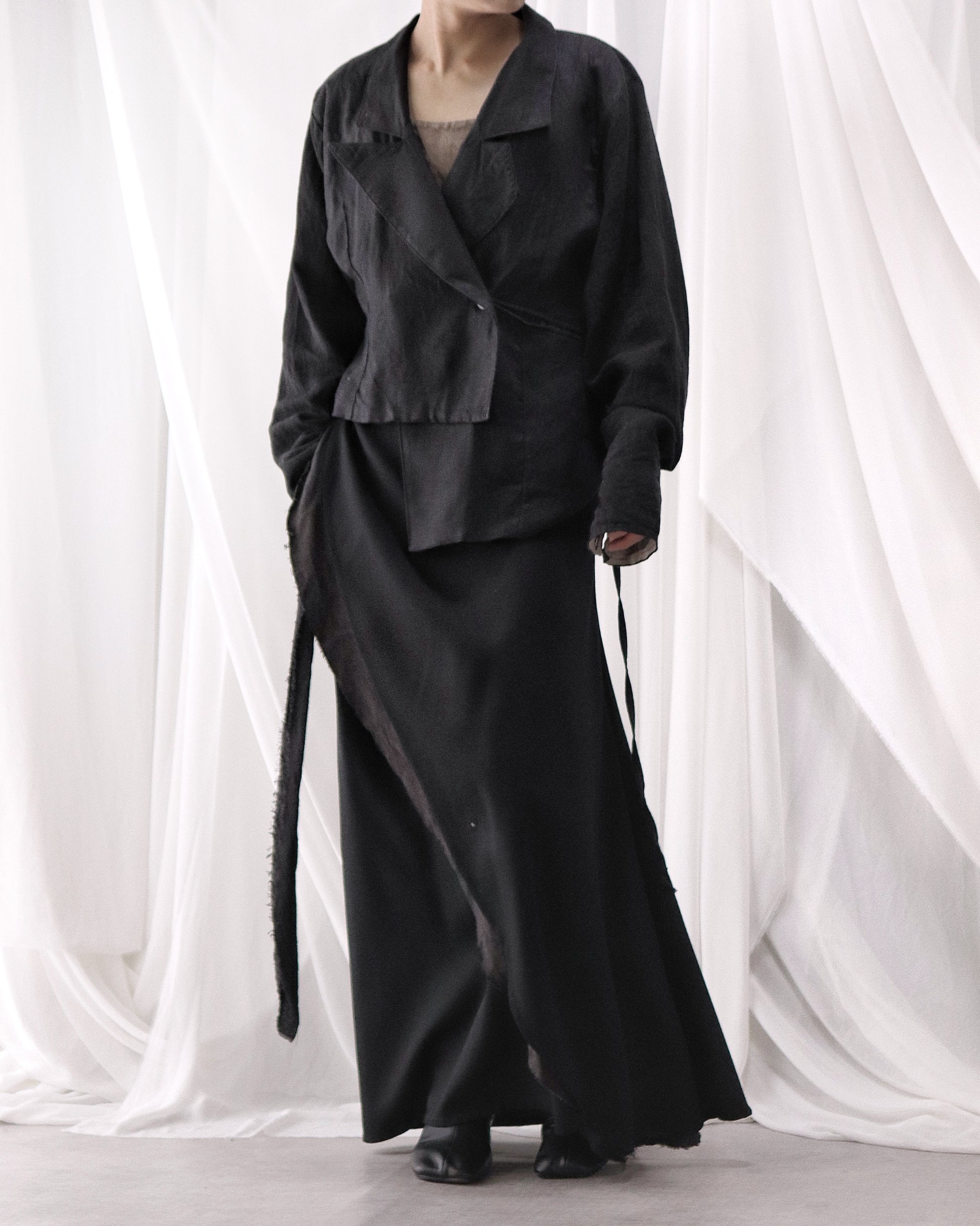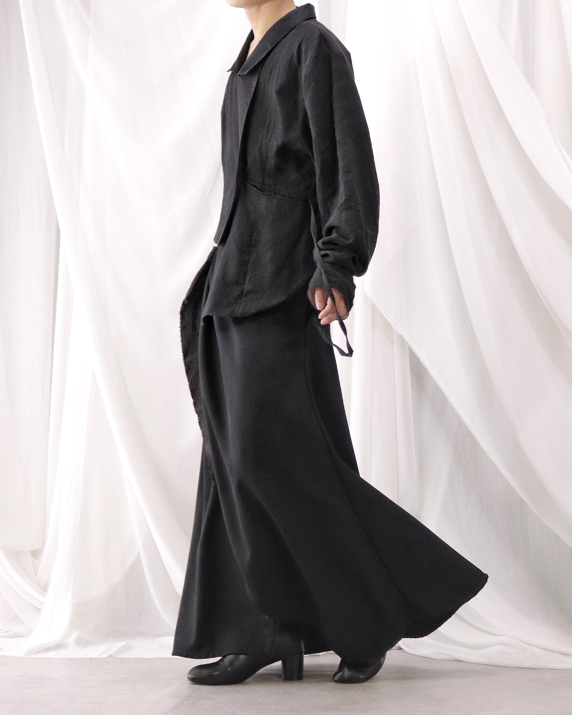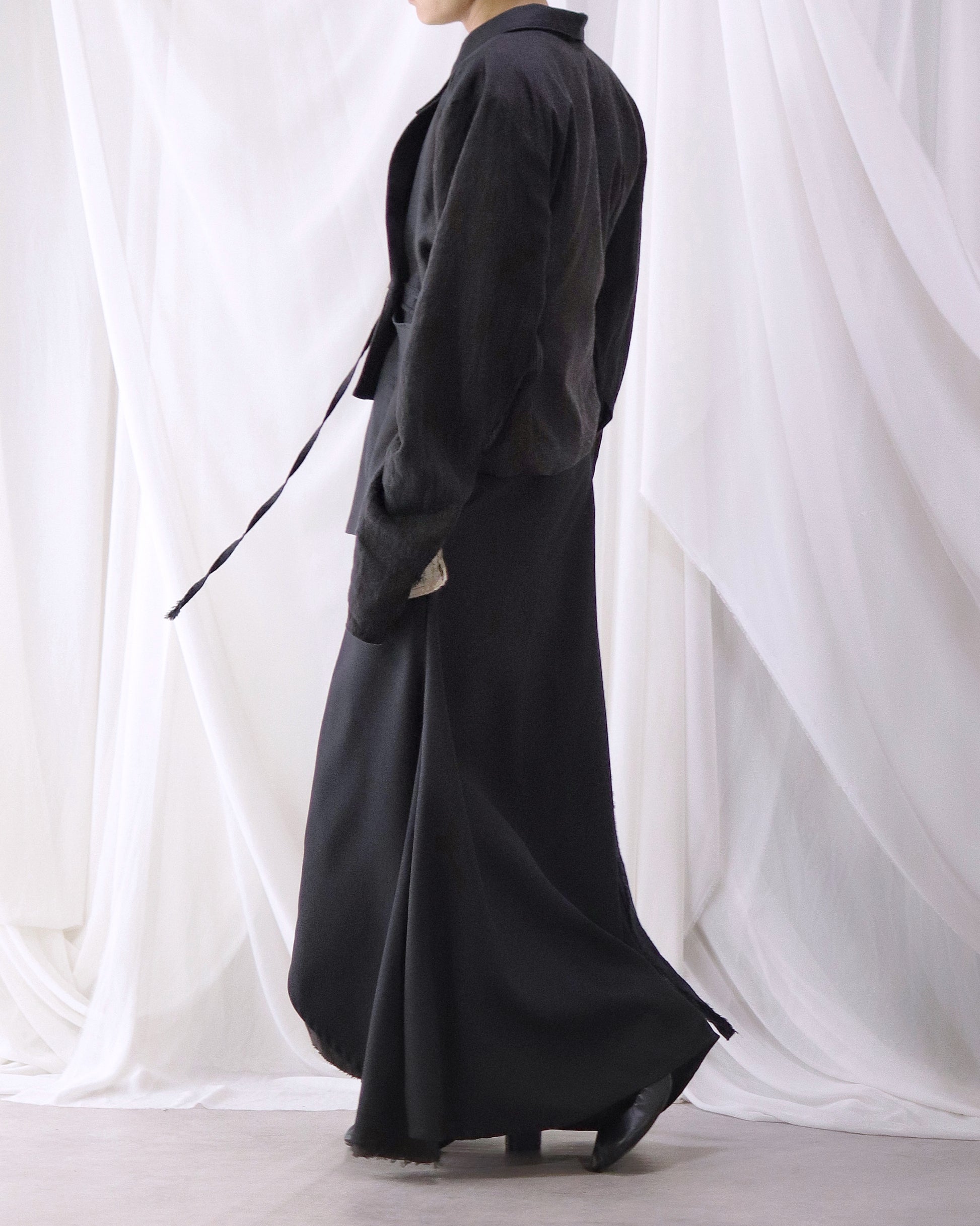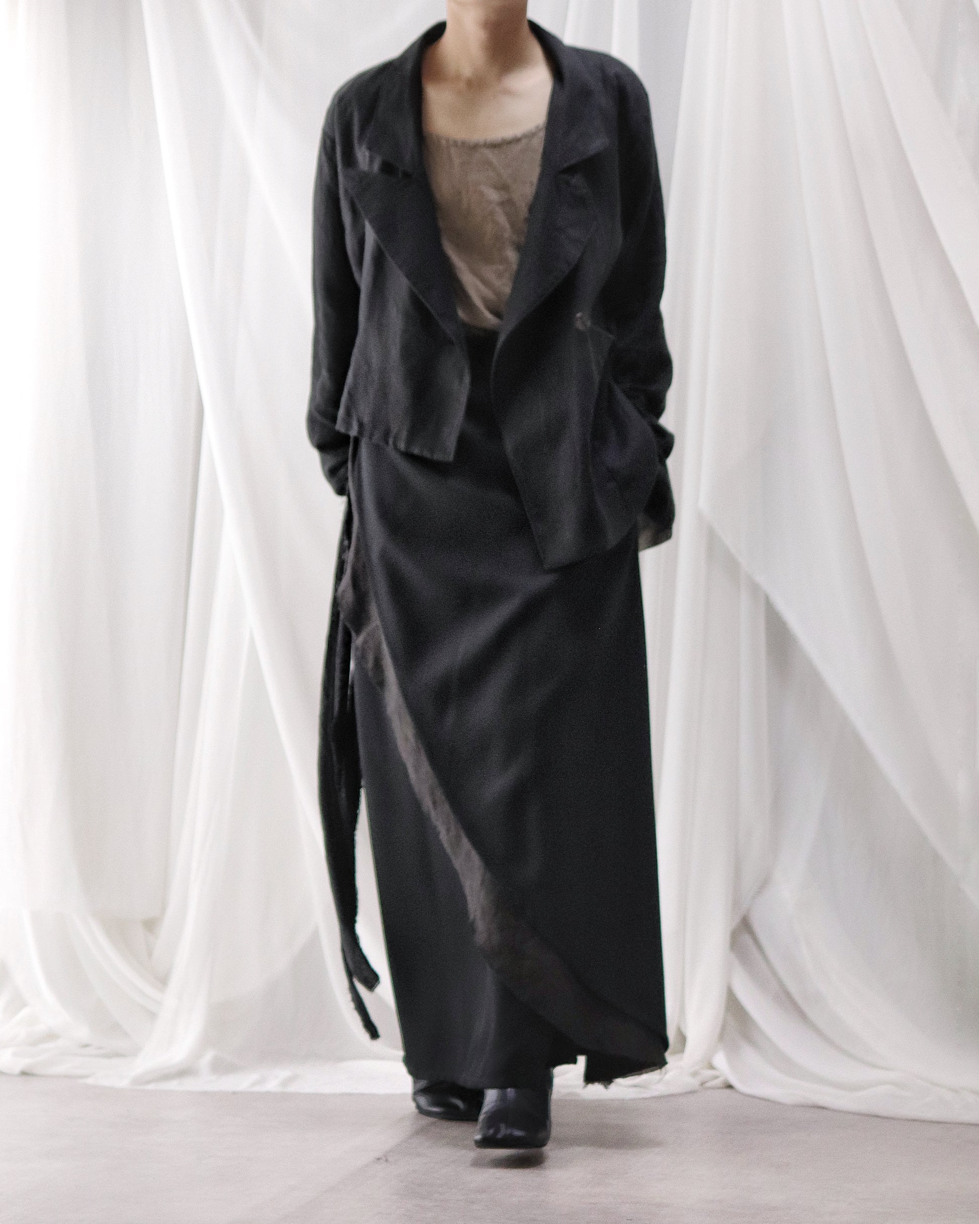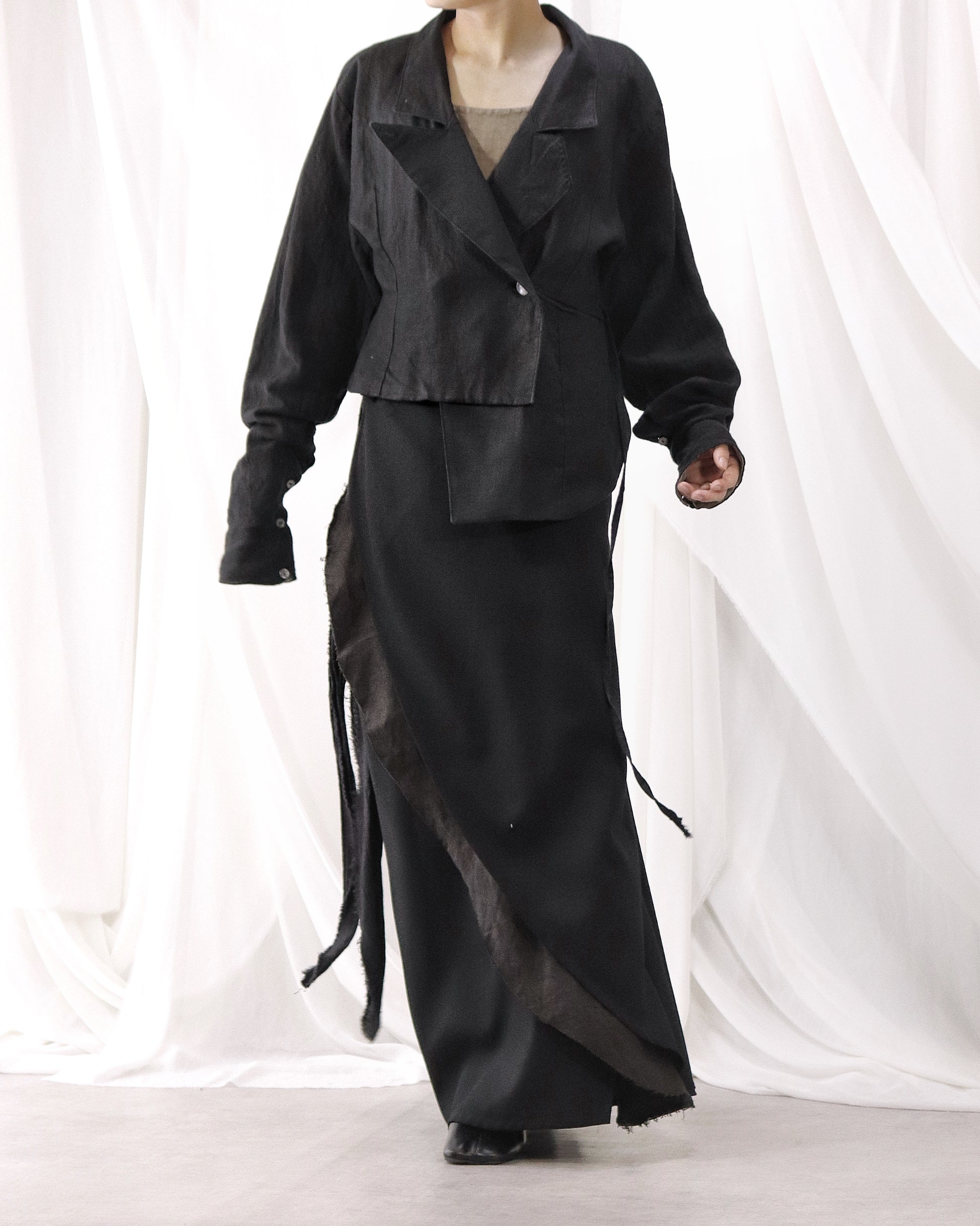 The front body, sleeves, and outer collar are made from different linen fabrics, while the back body and inner collar are made from dark grey wool. Each fabric is relatively lightweight and suitable for wear from spring through autumn.