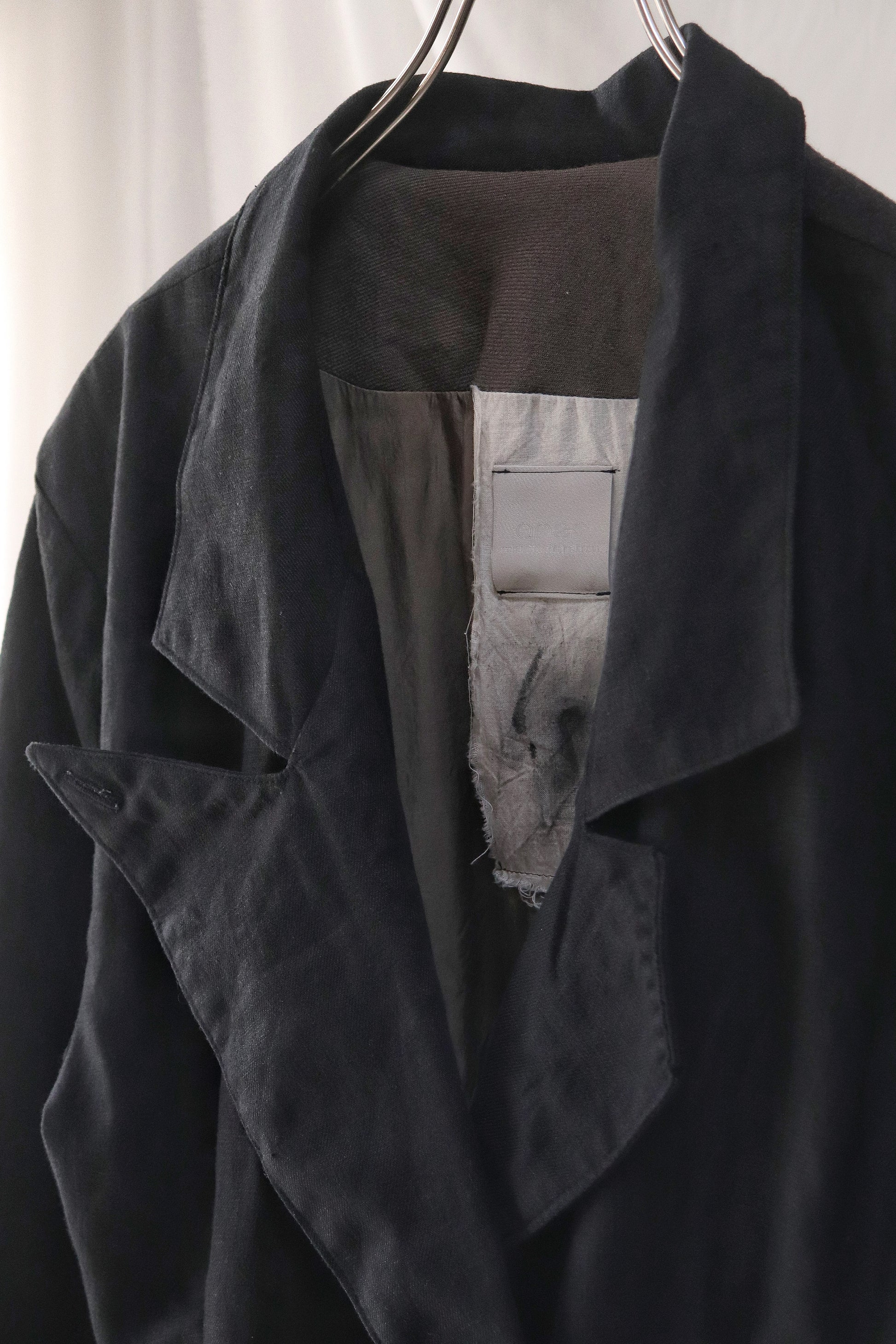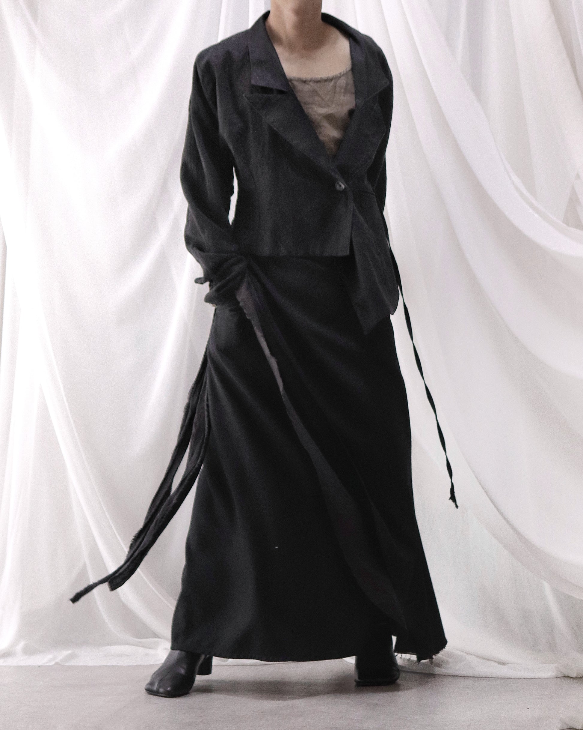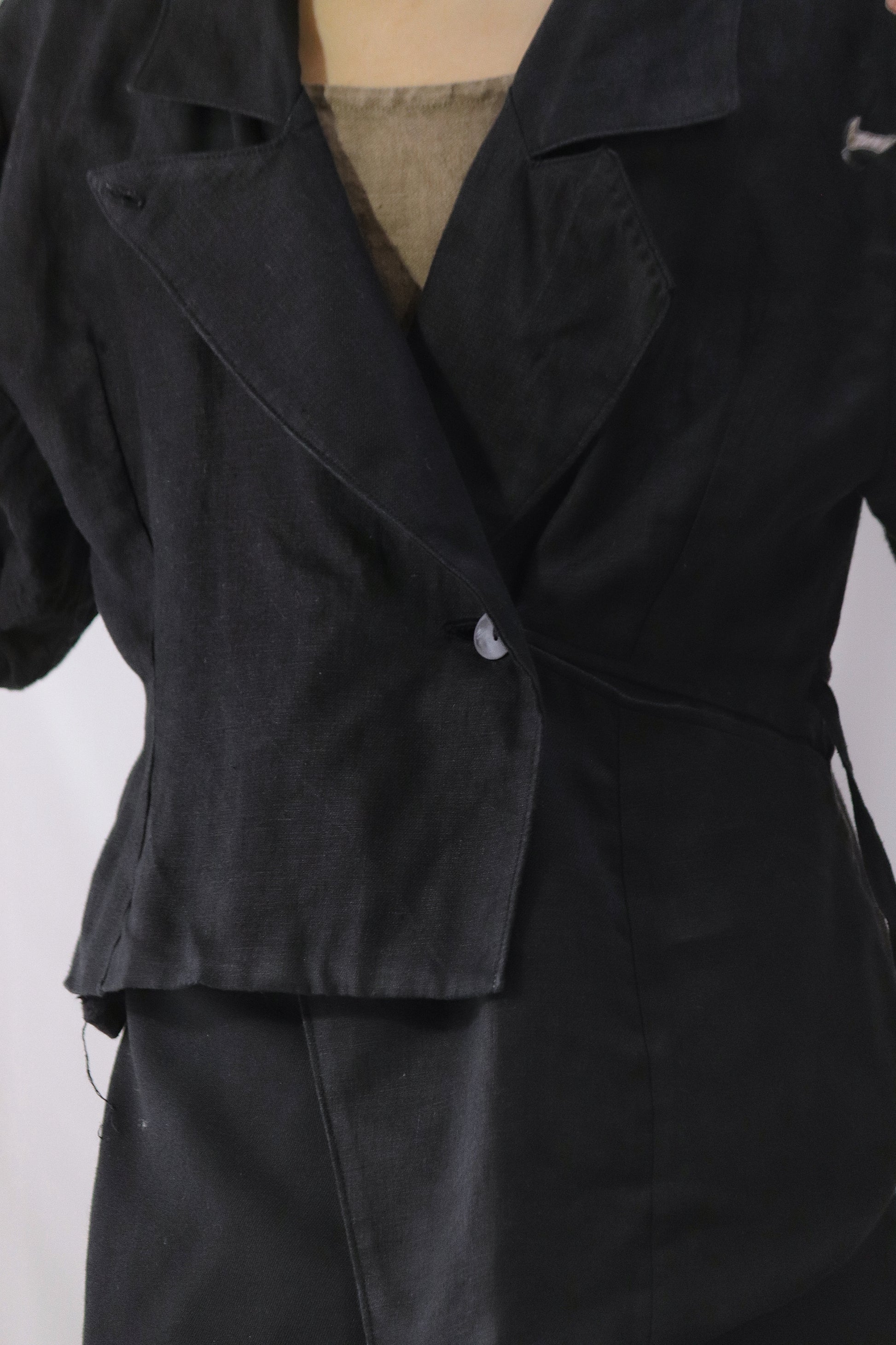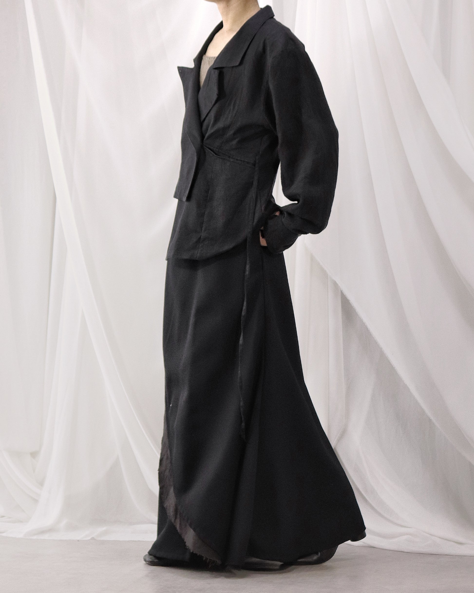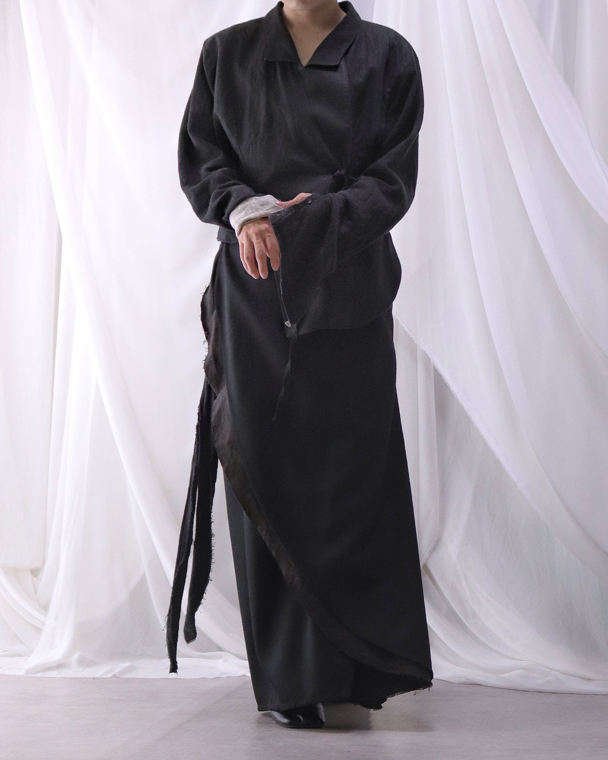 The front body, sleeves, and outer collar are made from different linen fabrics, while the back body and inner collar are made from dark grey wool. Each fabric is relatively lightweight and suitable for wear from spring through autumn.