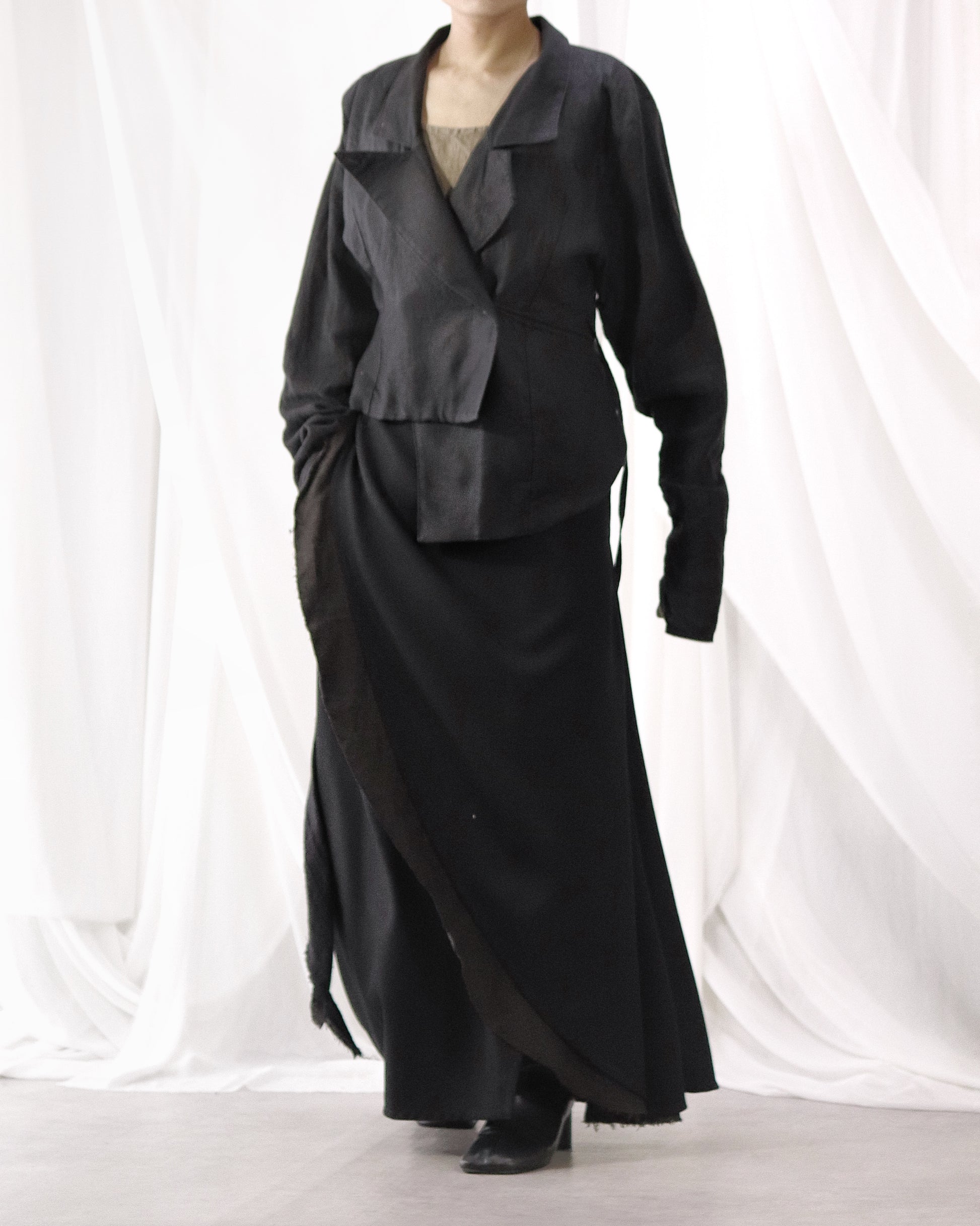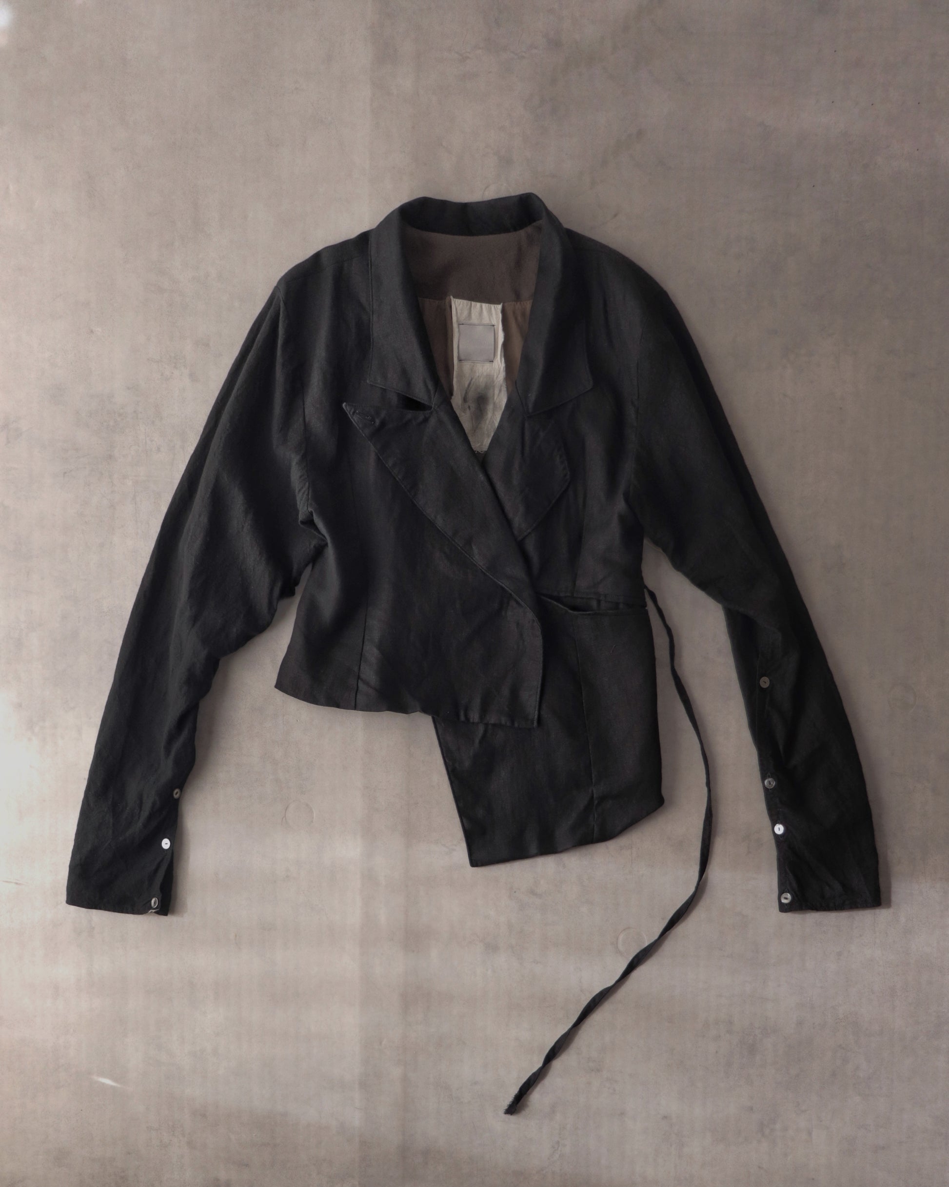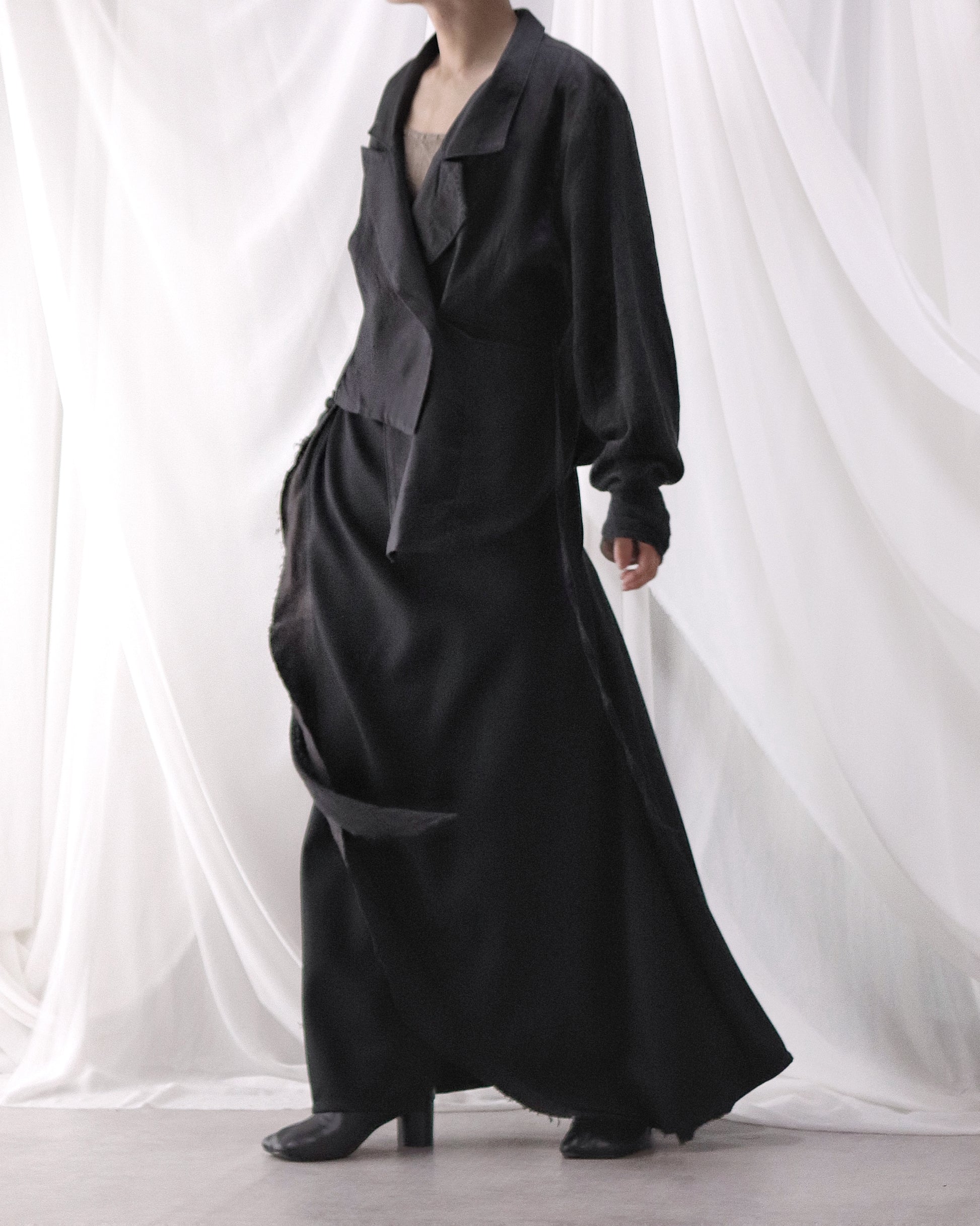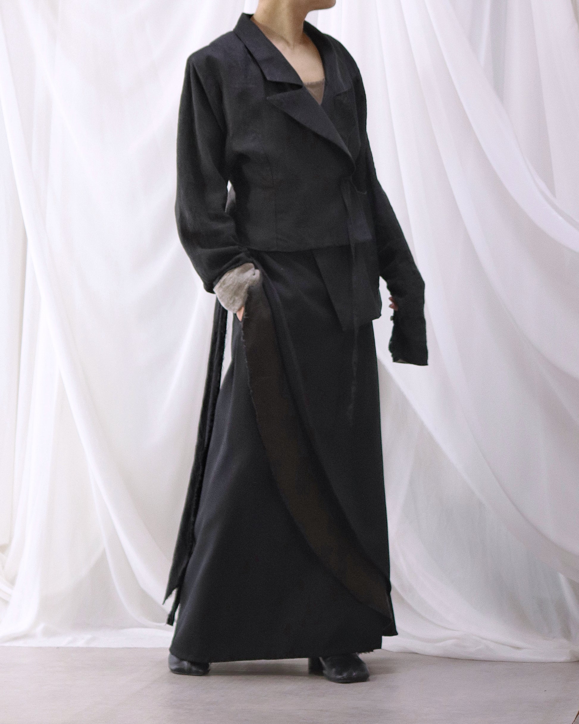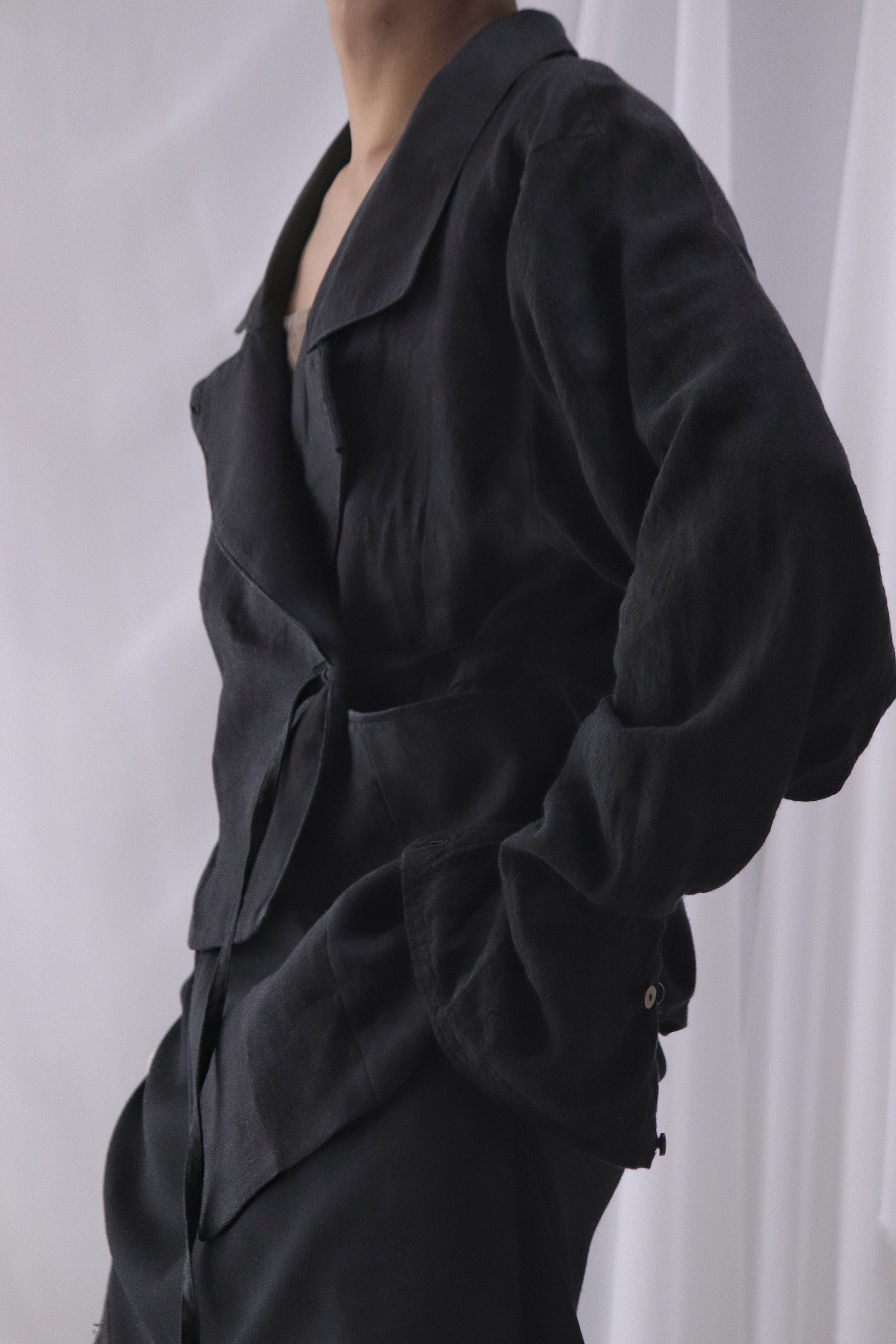 The tip of the left lapel is cut and reinserted in the opposite direction. The sleeves are intentionally long and can be worn folded back.