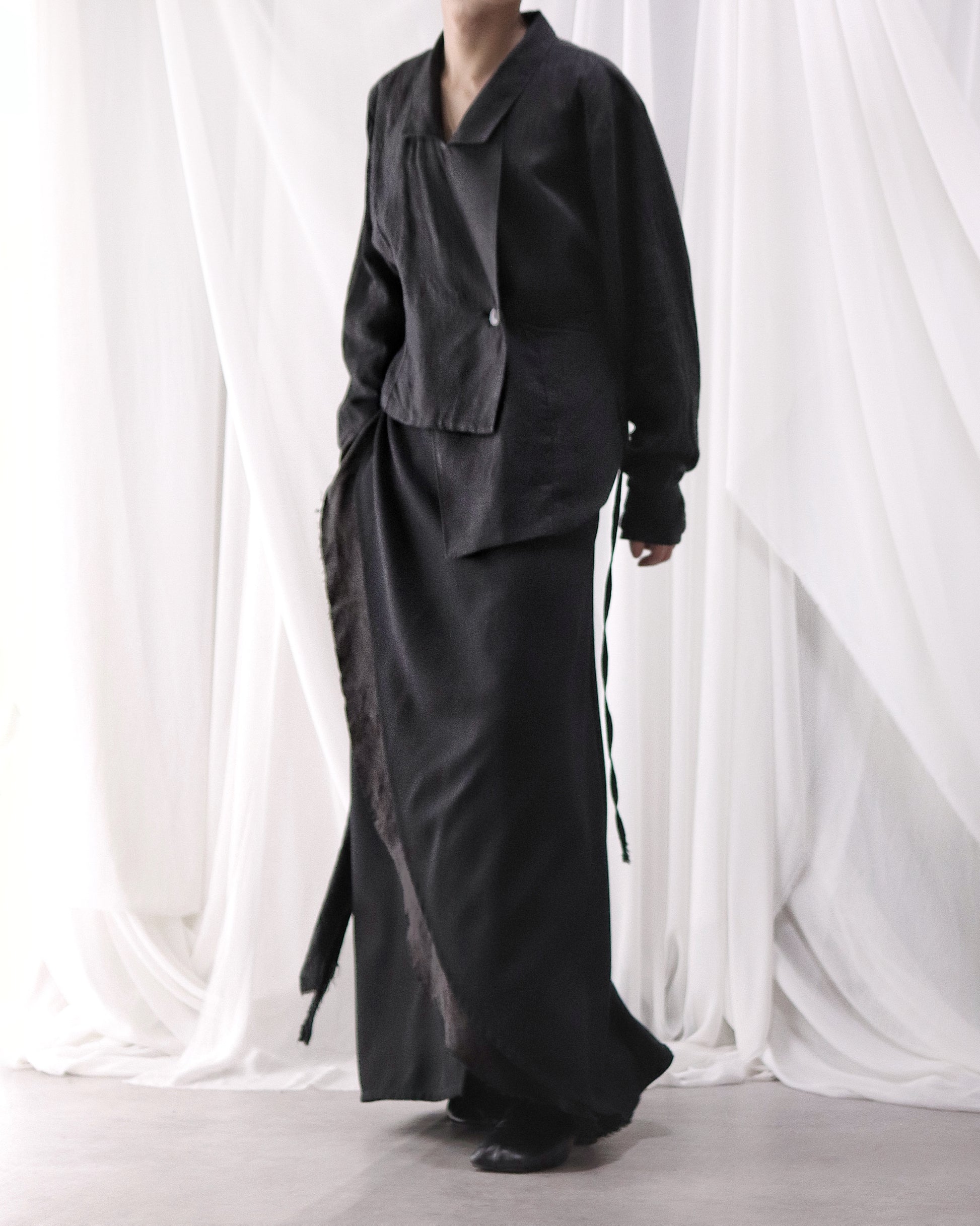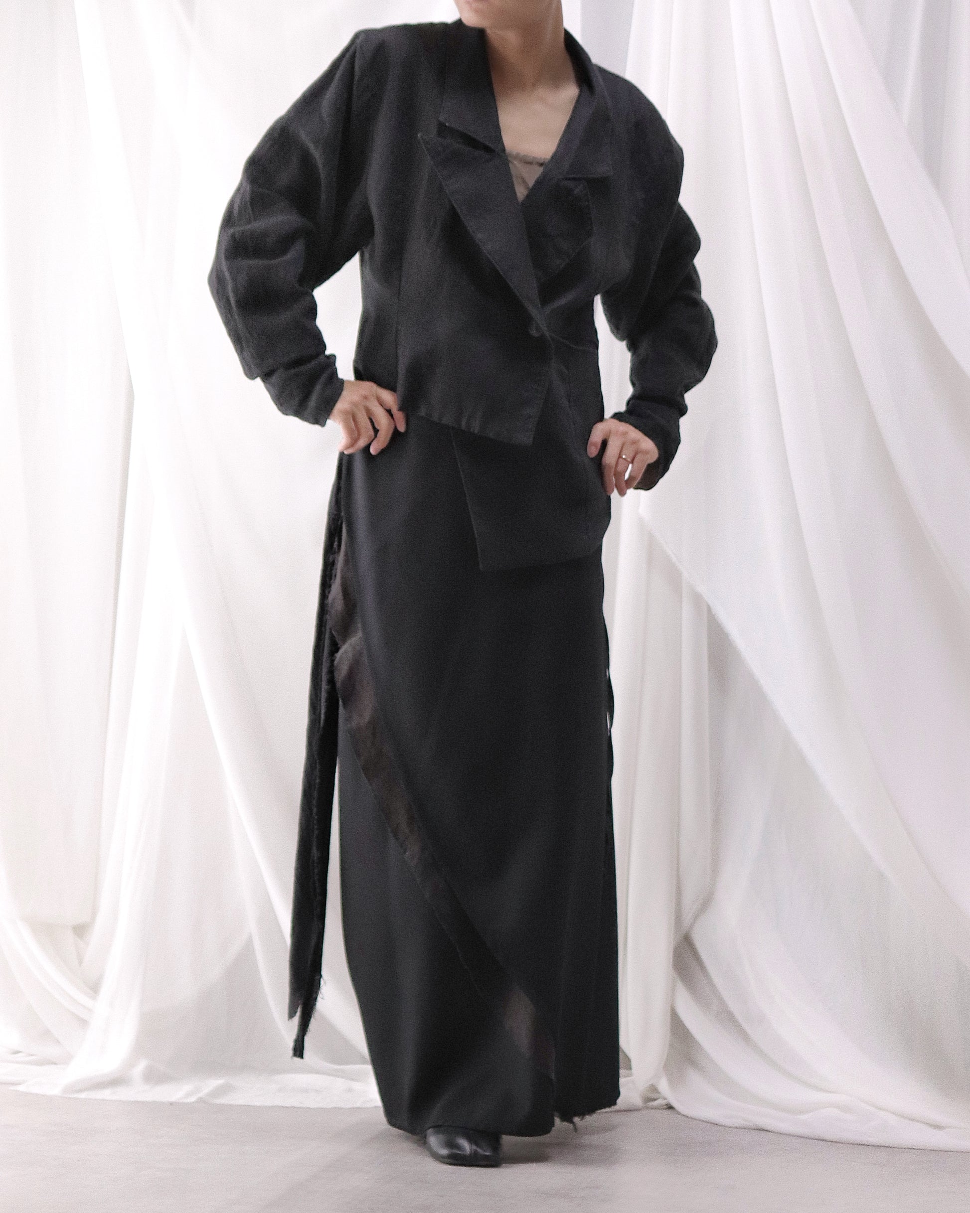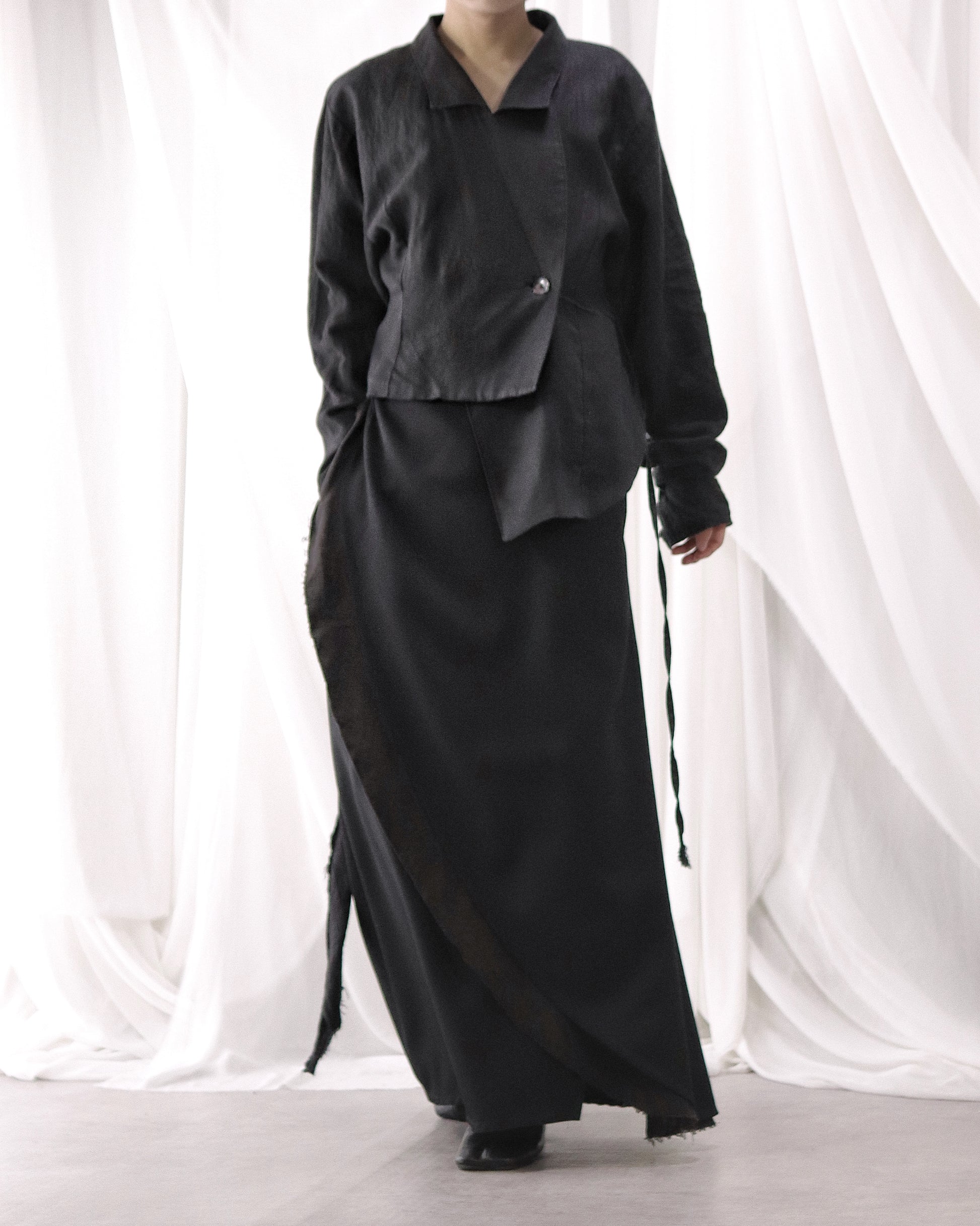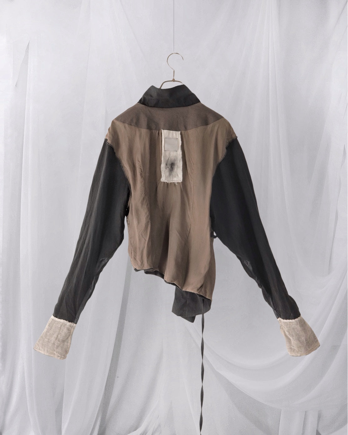 The tip of the left lapel is cut and reinserted in the opposite direction. The sleeves are intentionally long and can be worn folded back.