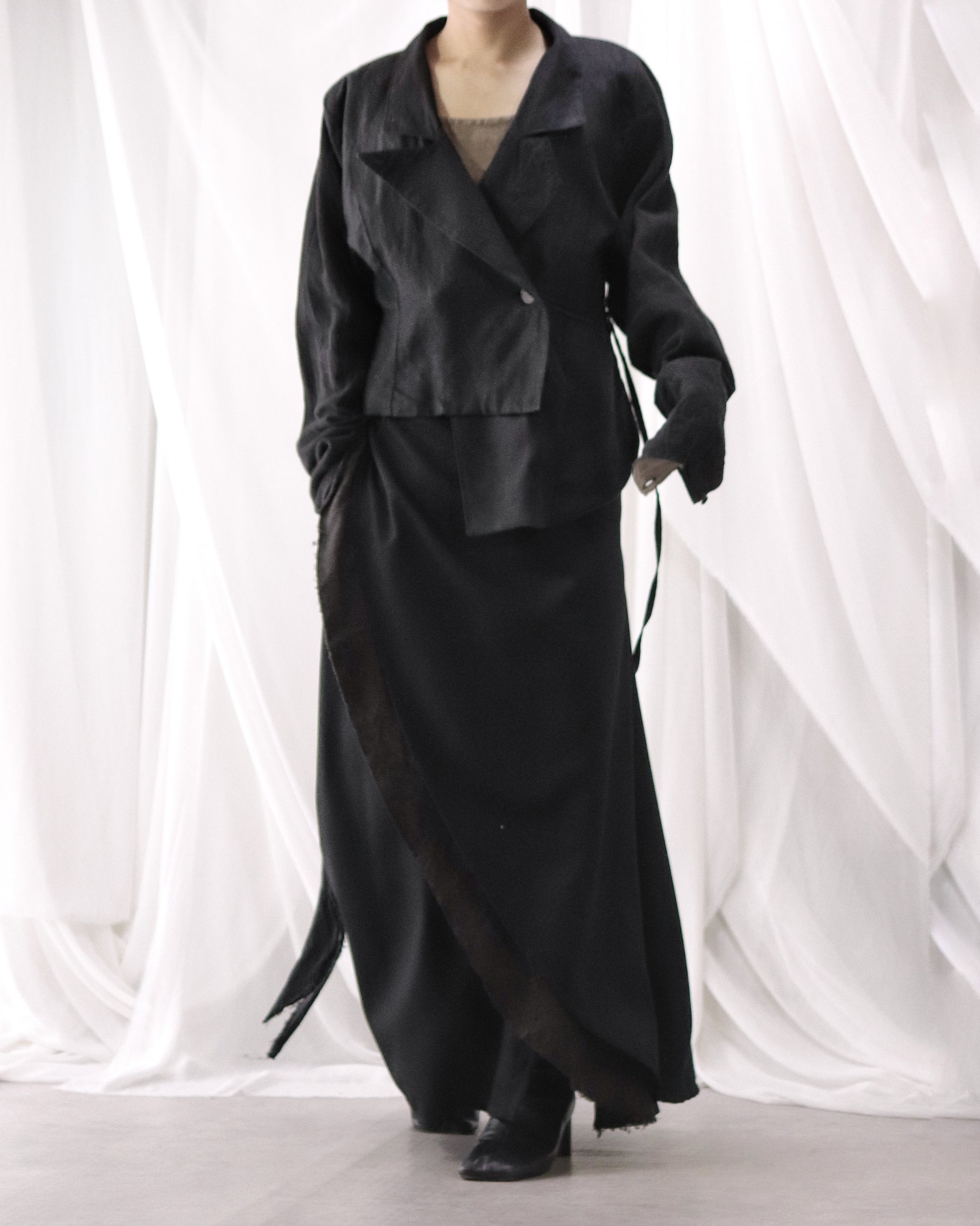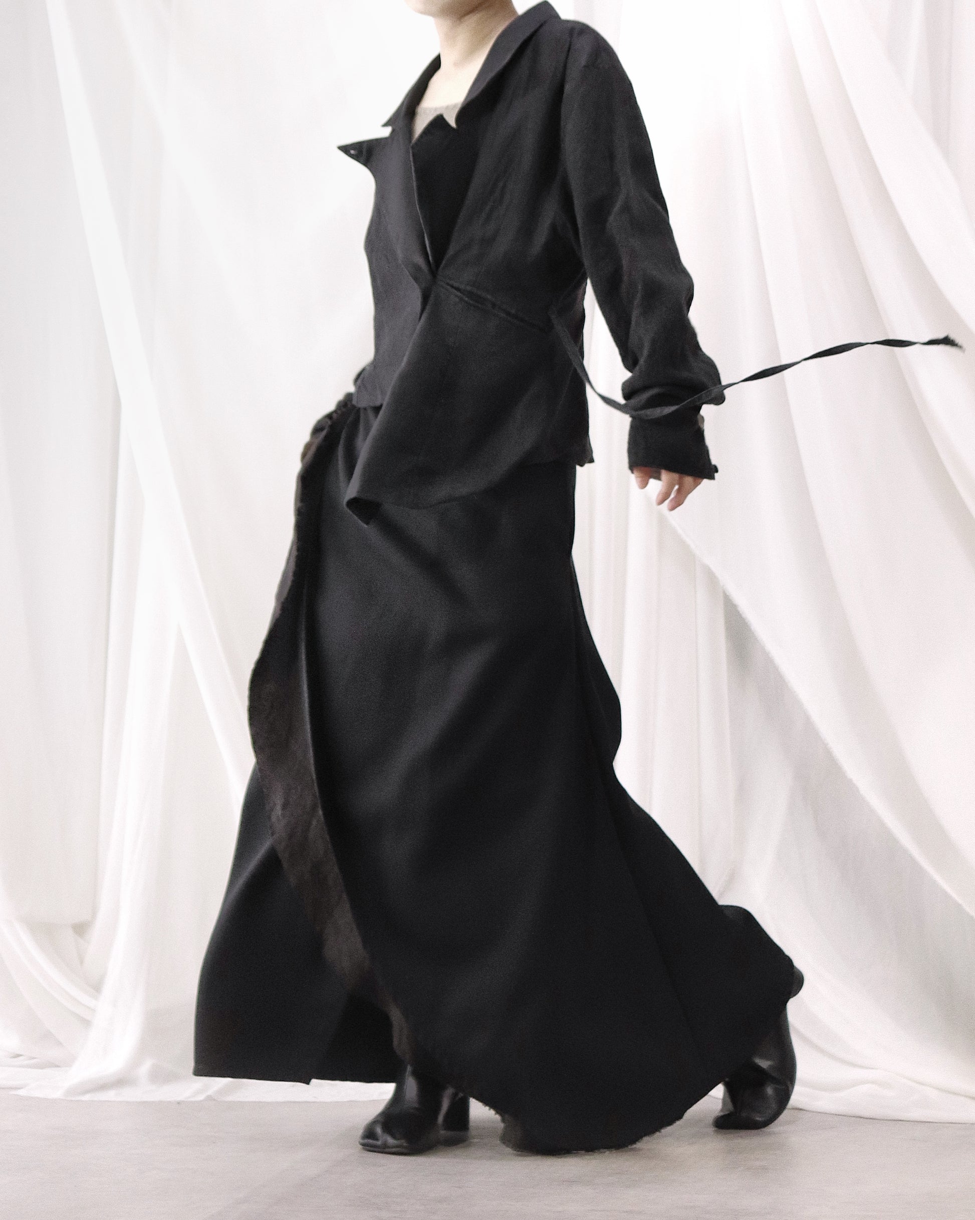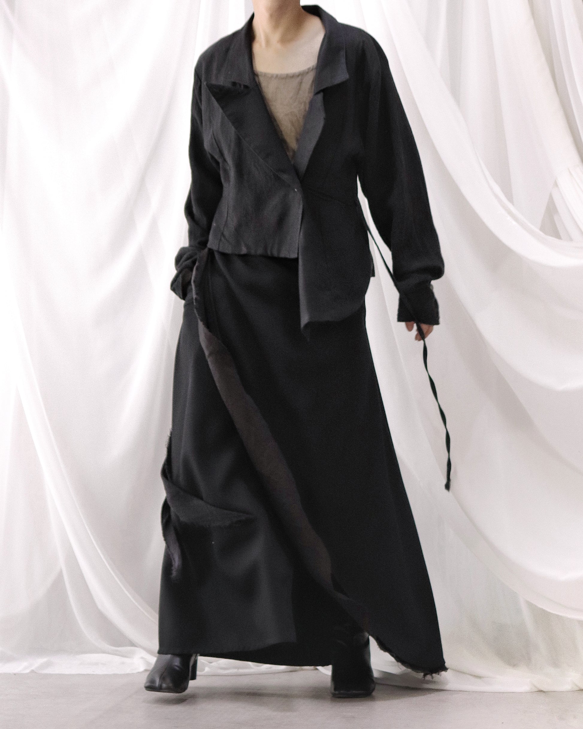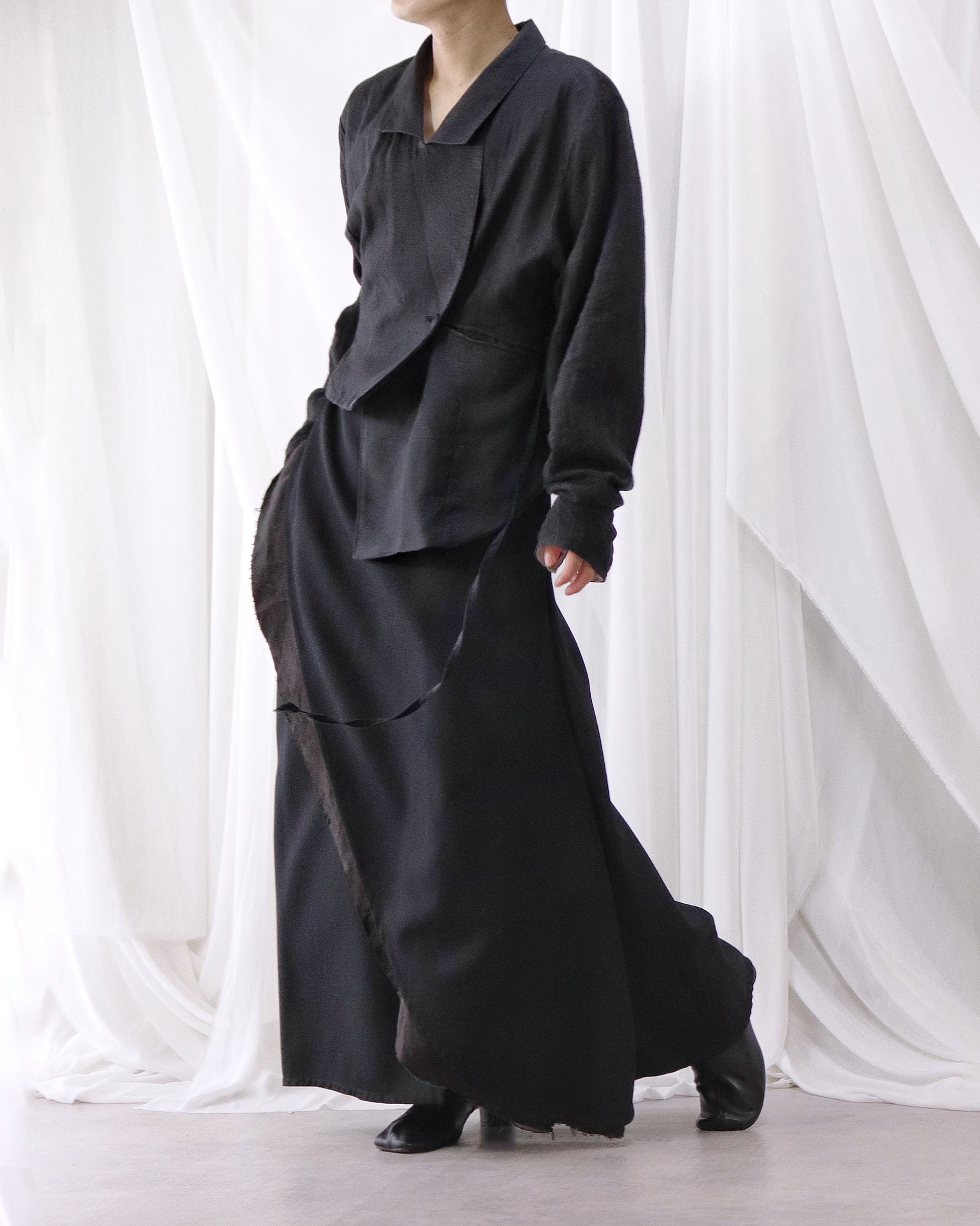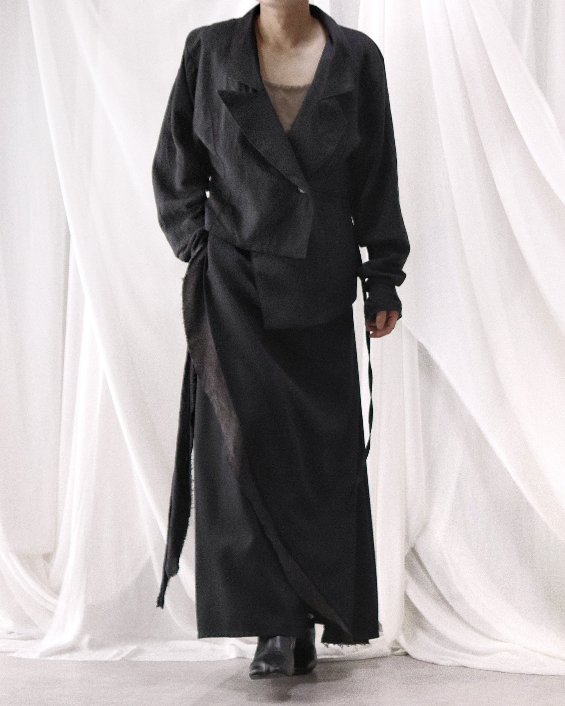 The tip of the left lapel is cut and reinserted in the opposite direction. The sleeves are intentionally long and can be worn folded back.