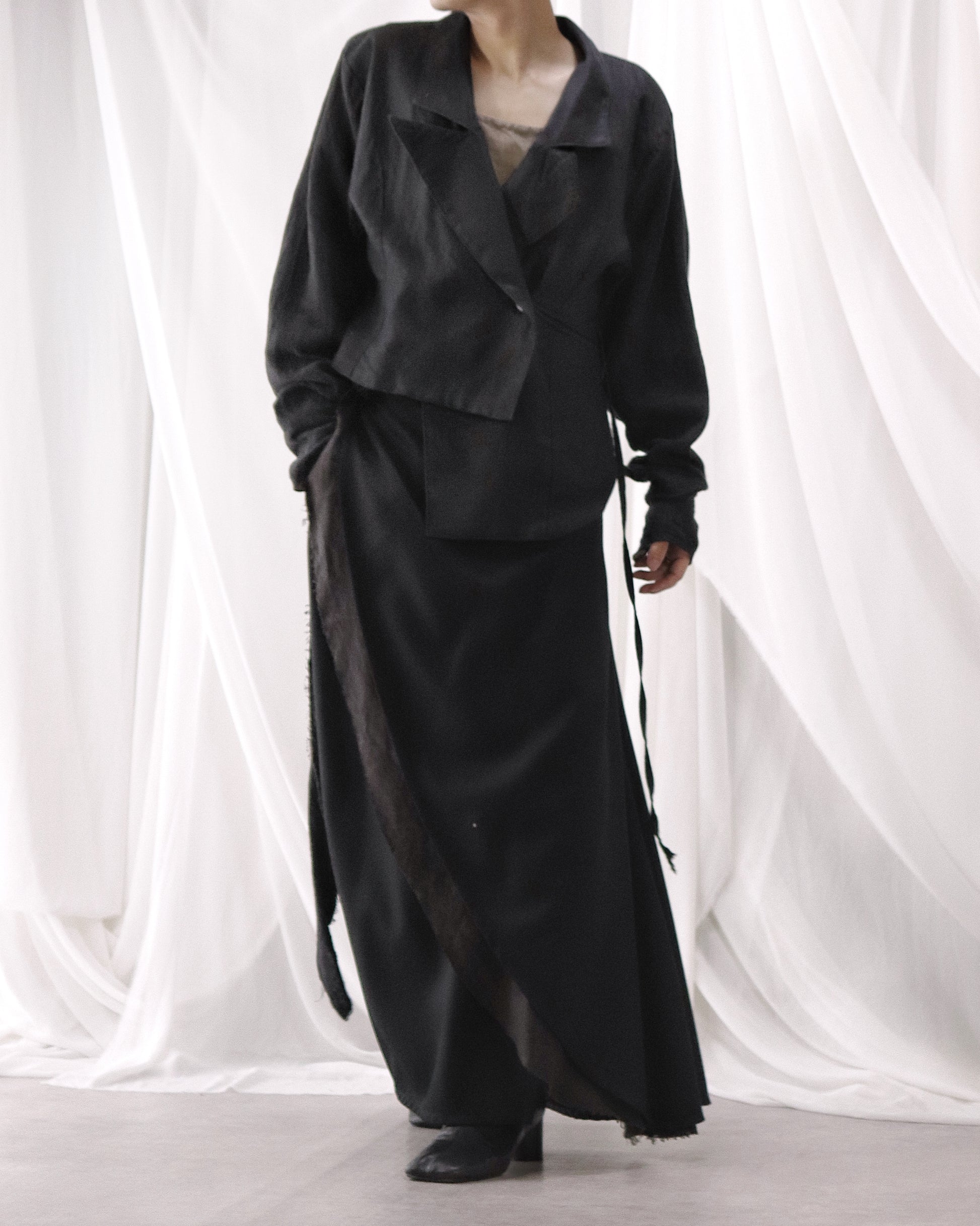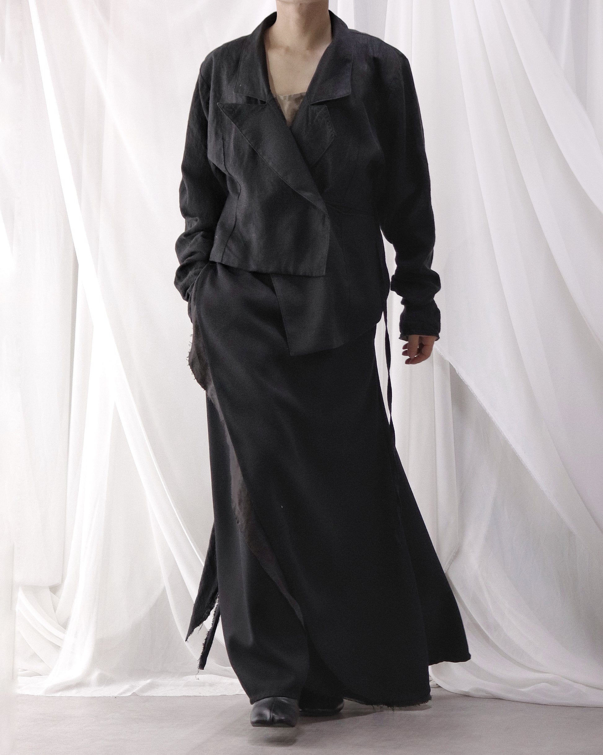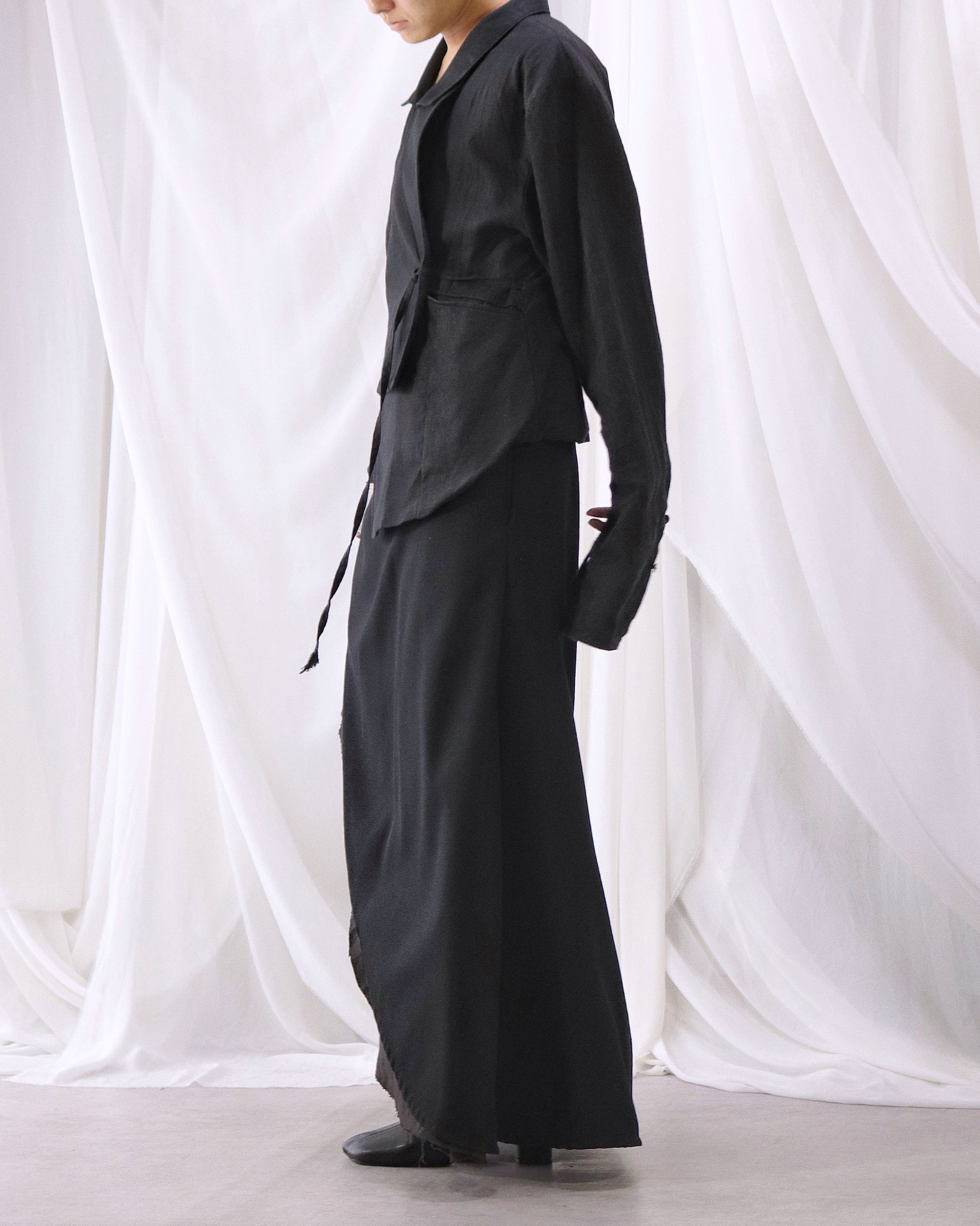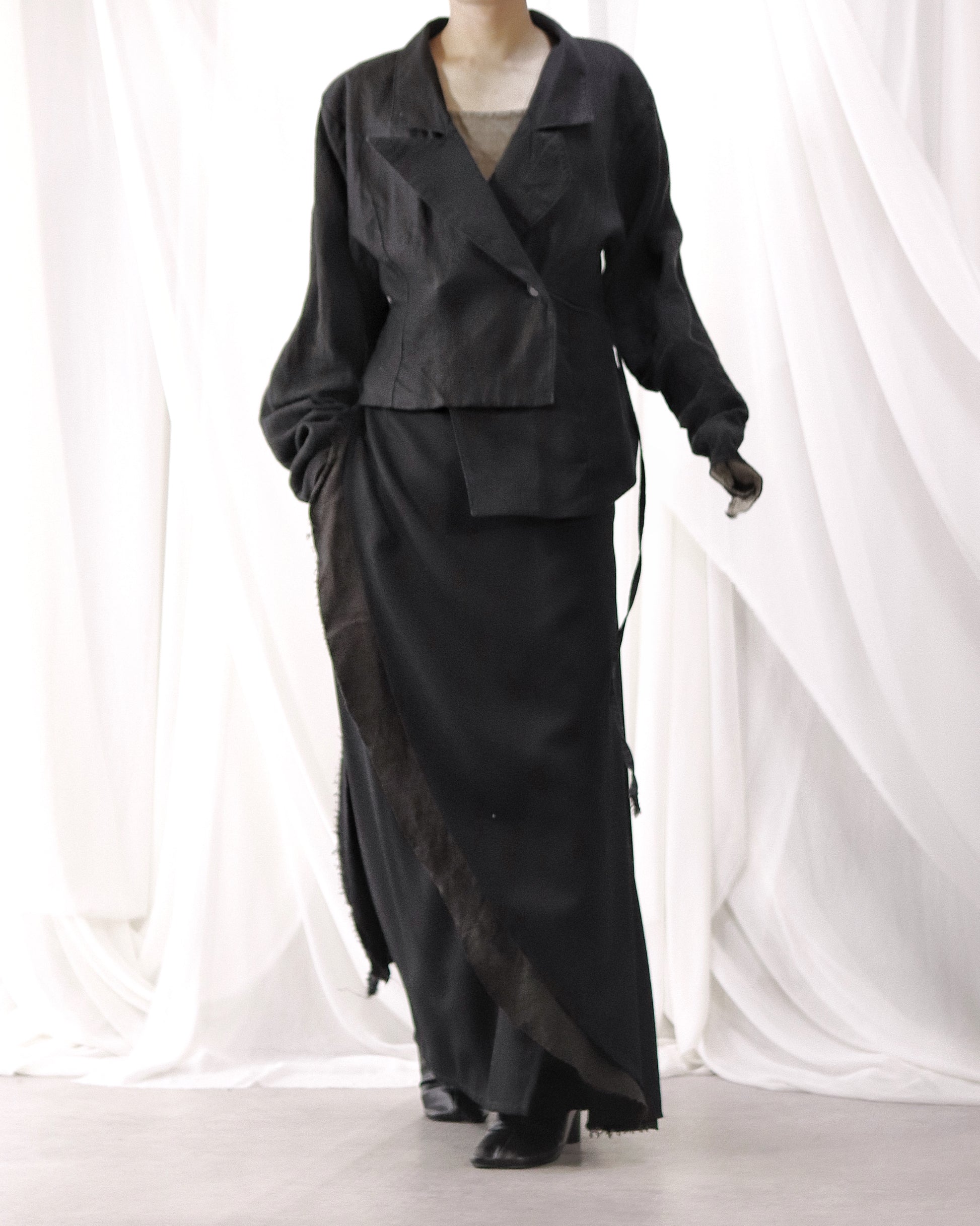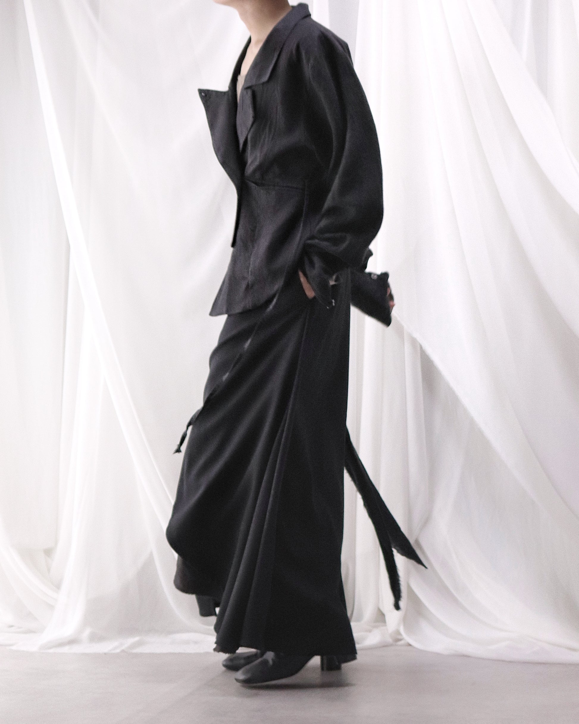 The tip of the left lapel is cut and reinserted in the opposite direction. The sleeves are intentionally long and can be worn folded back.