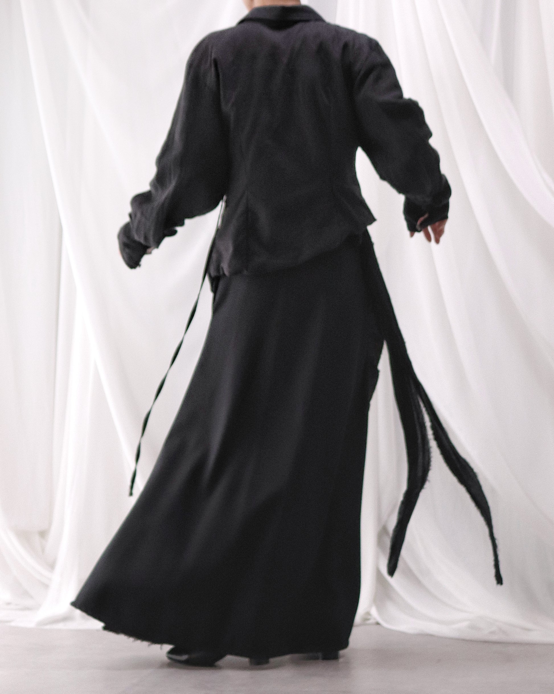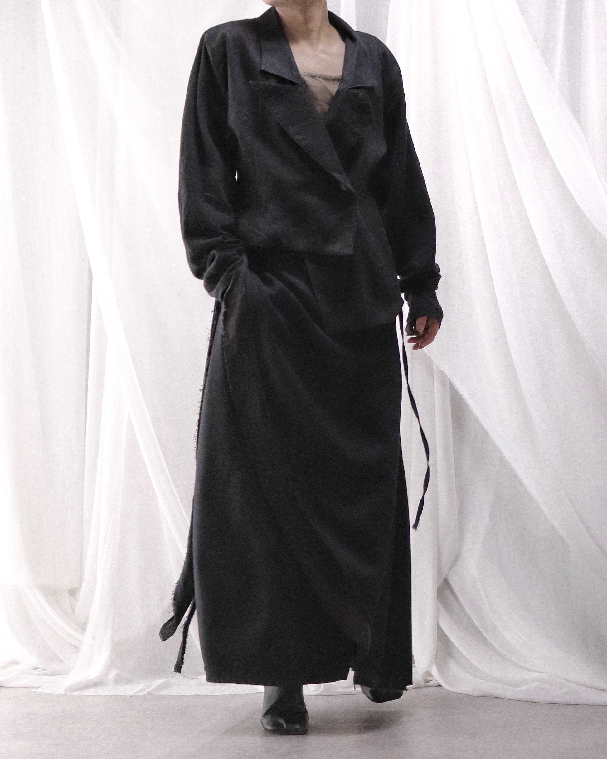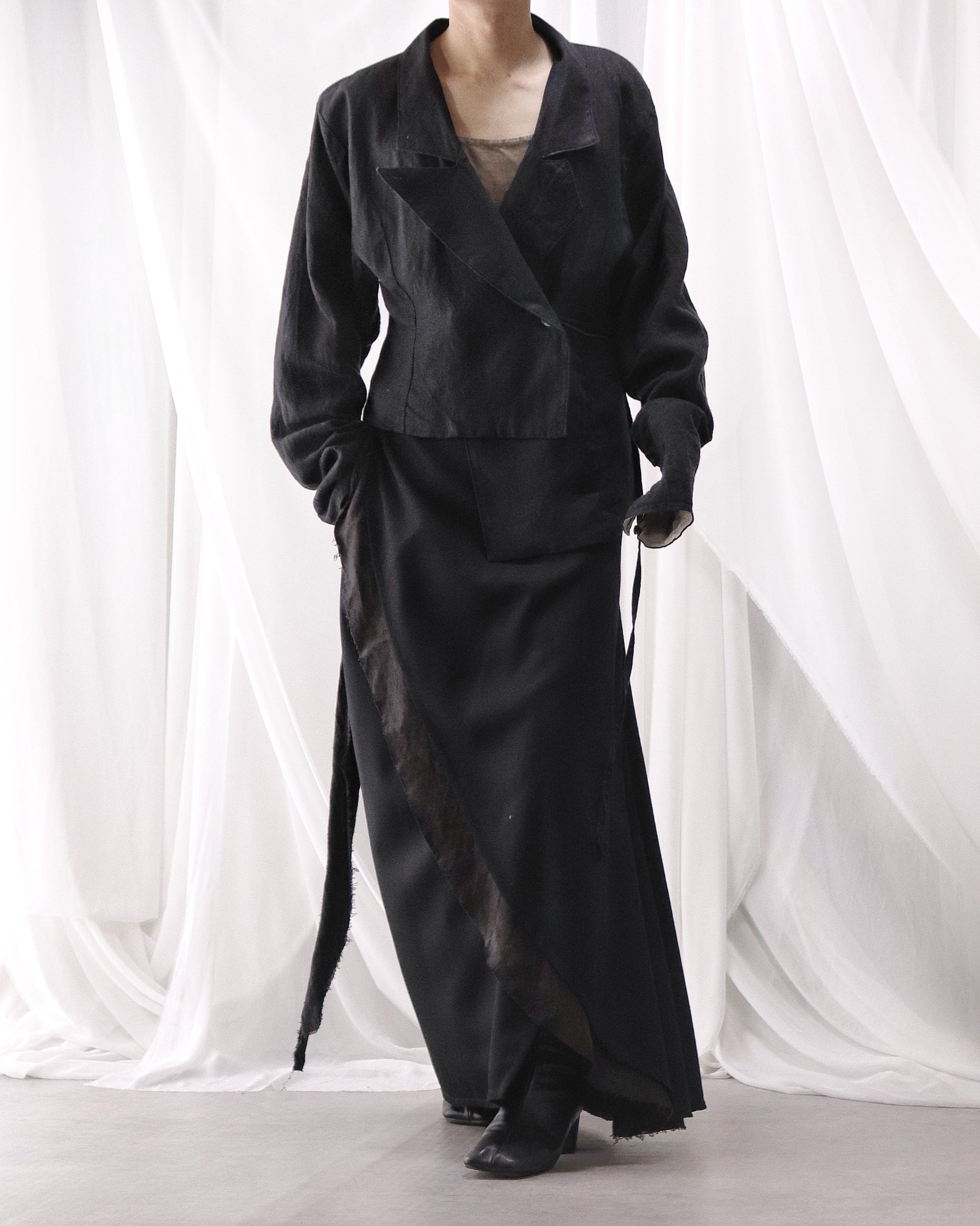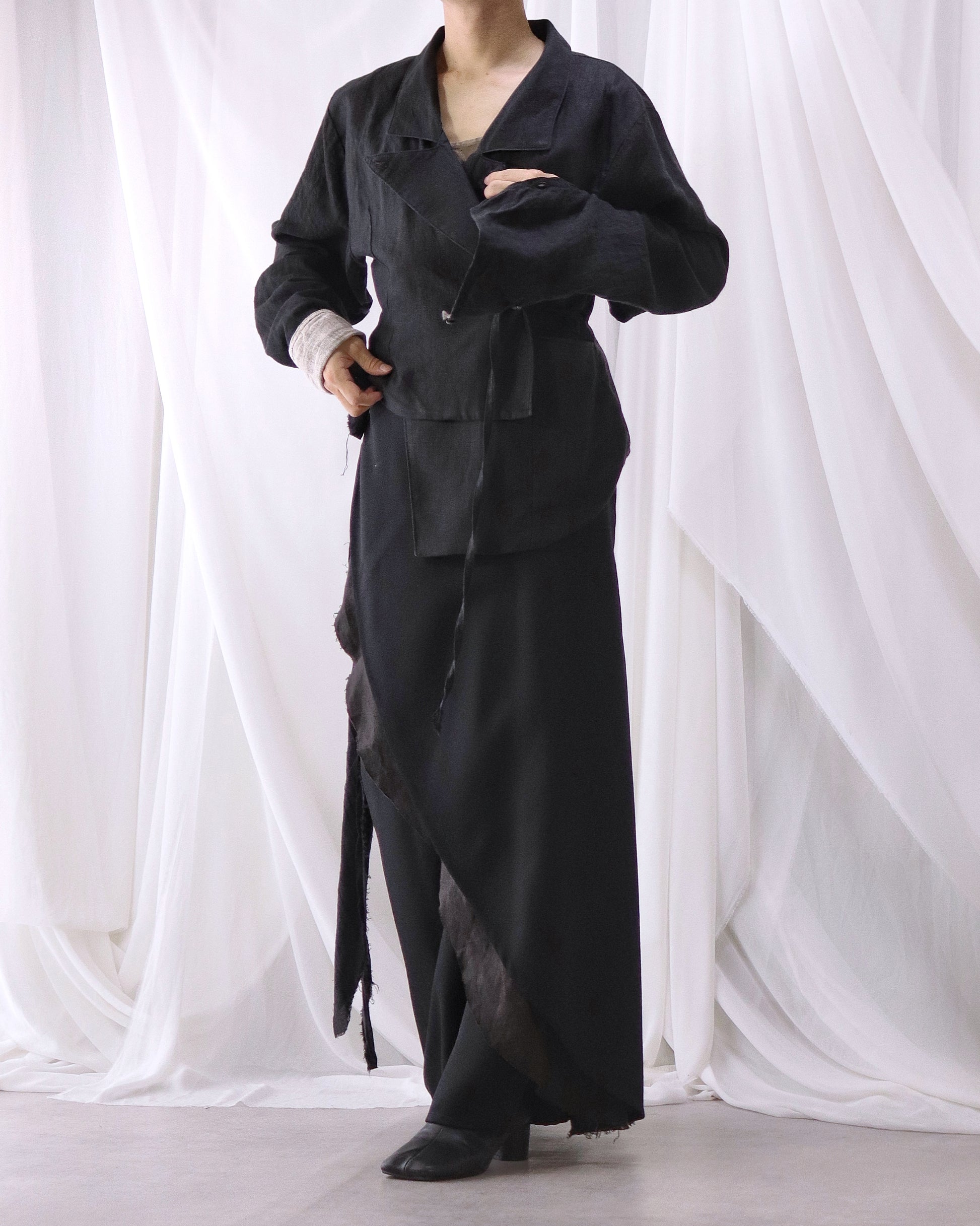 The tip of the left lapel is cut and reinserted in the opposite direction. The sleeves are intentionally long and can be worn folded back.