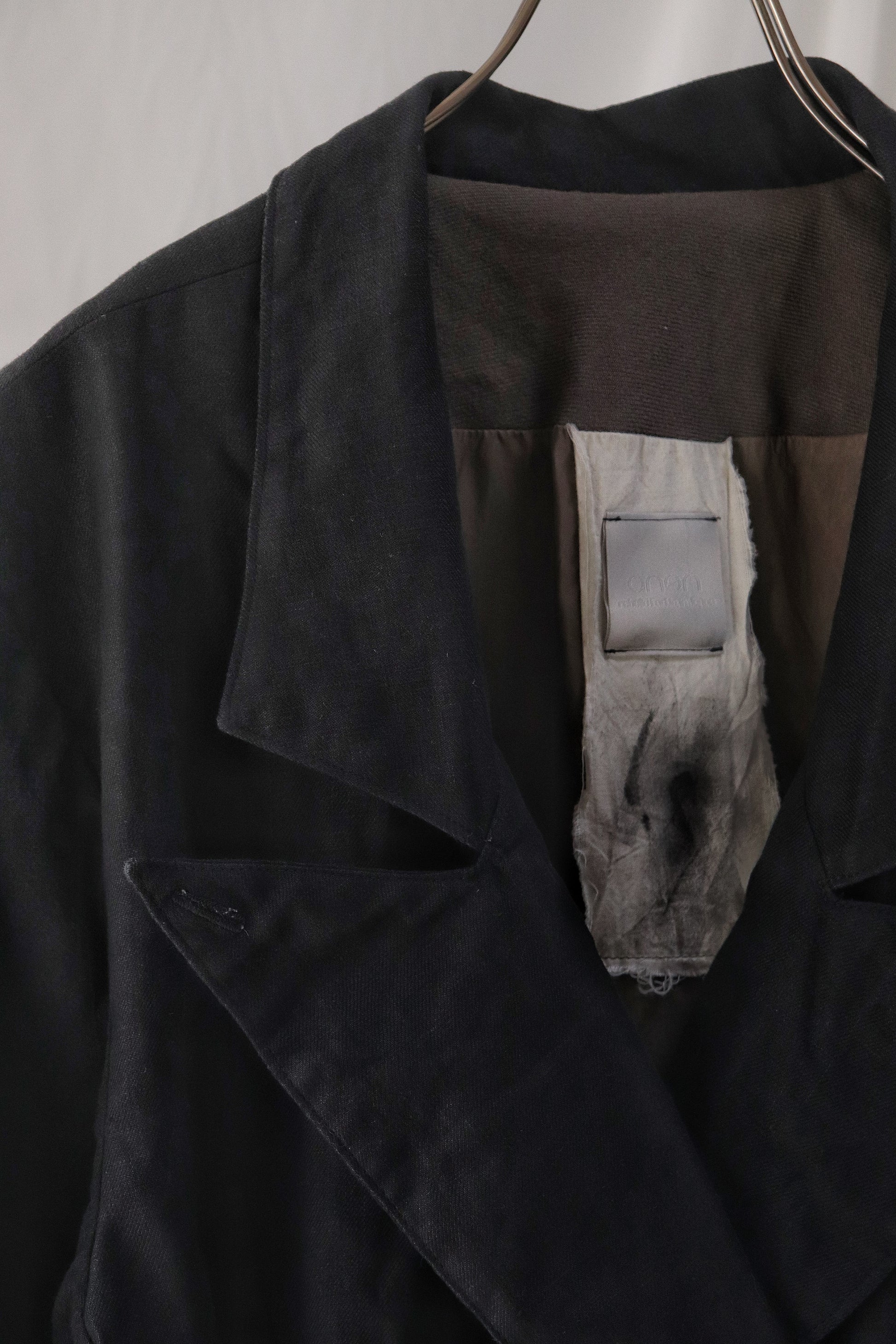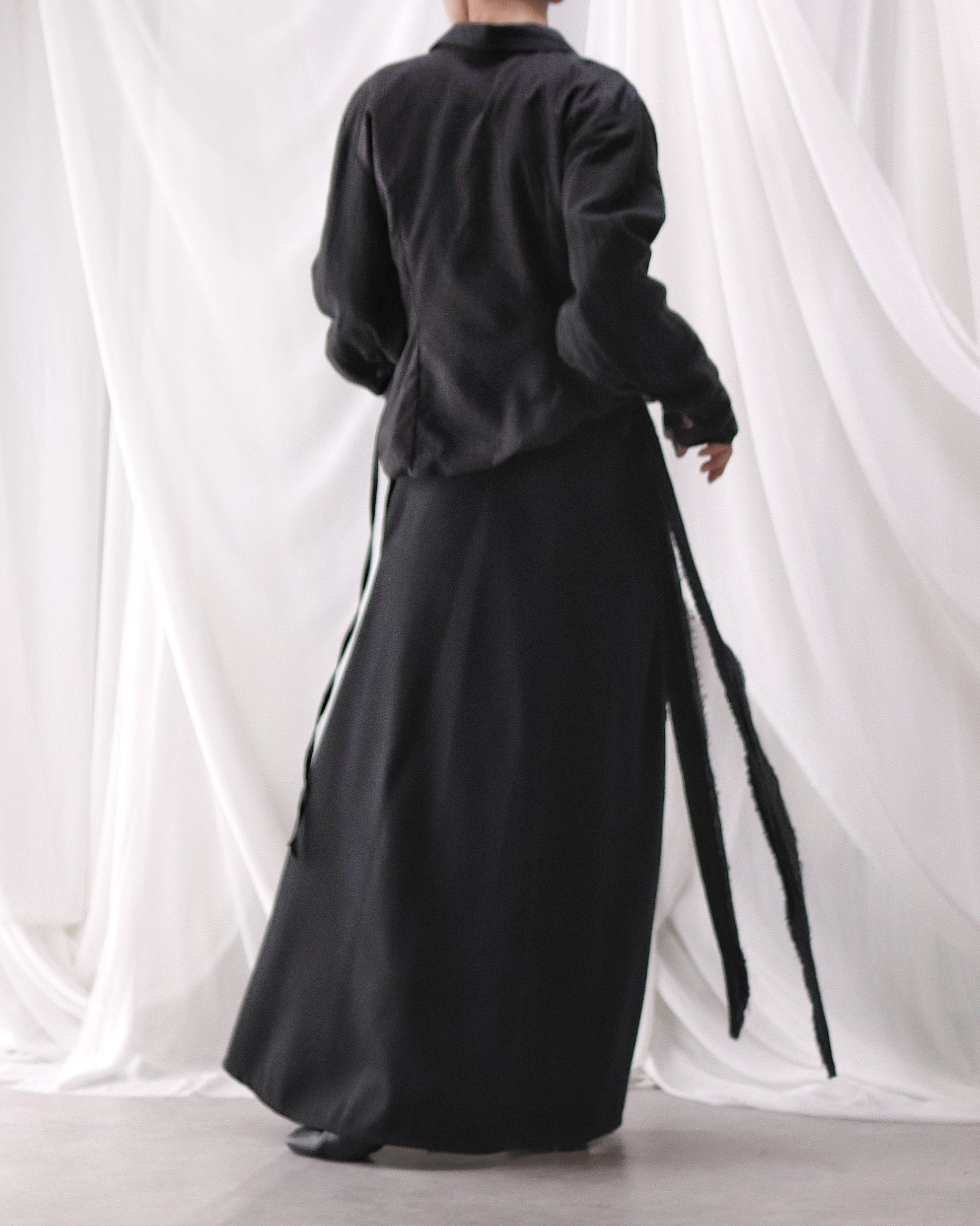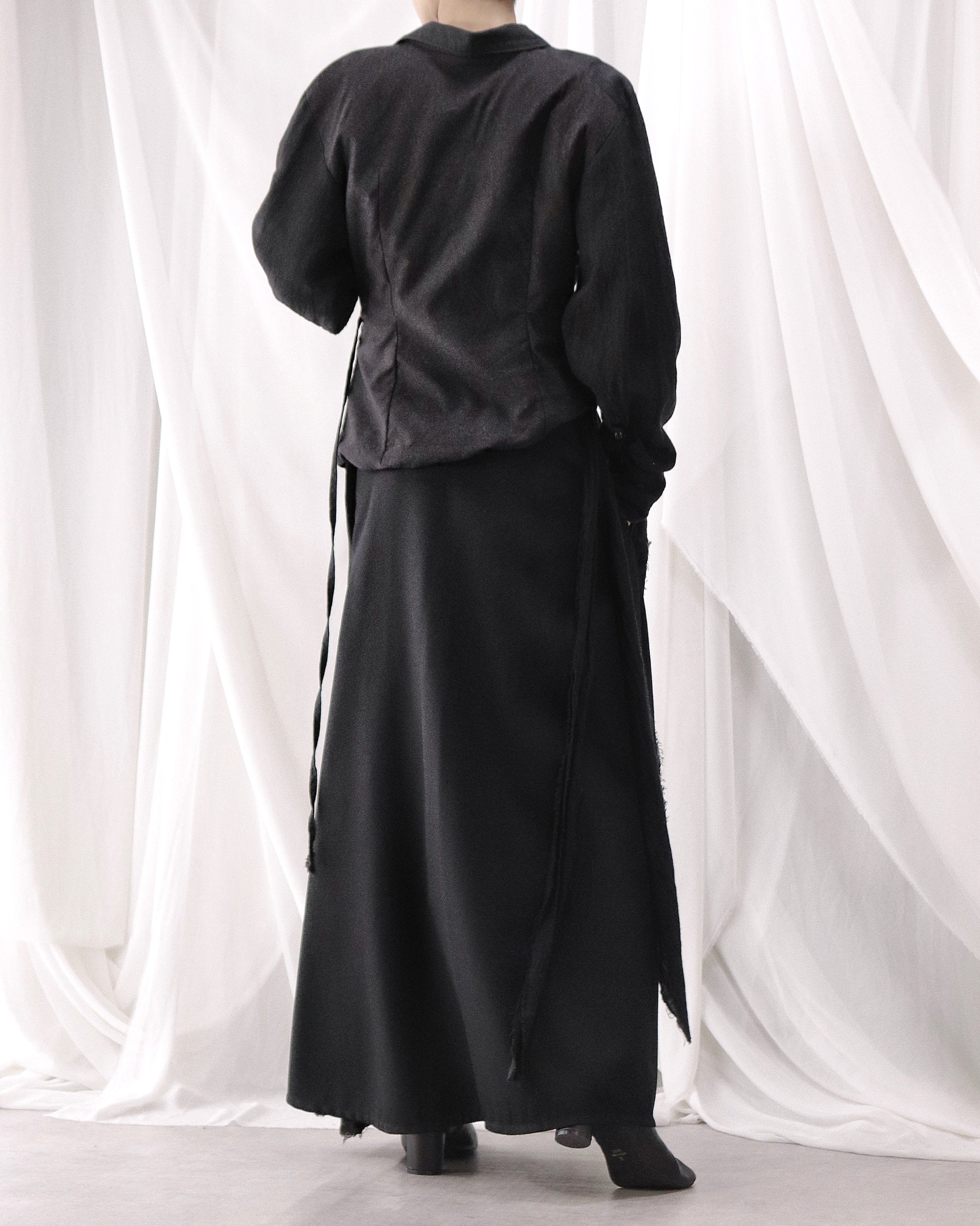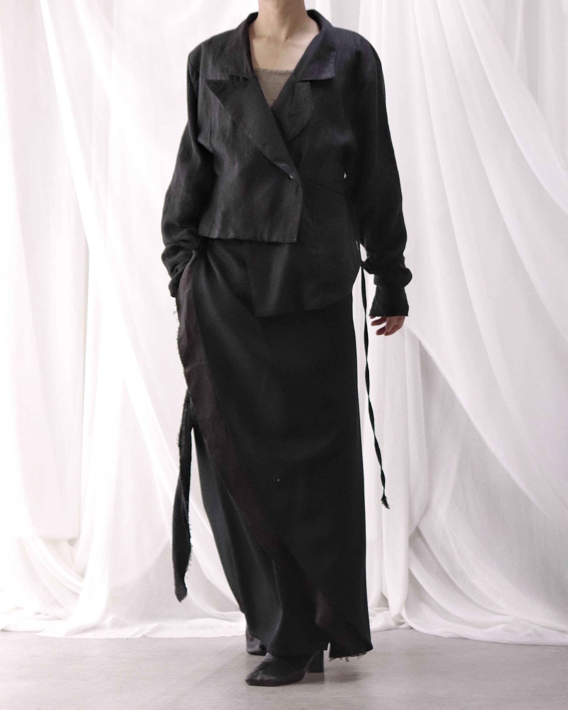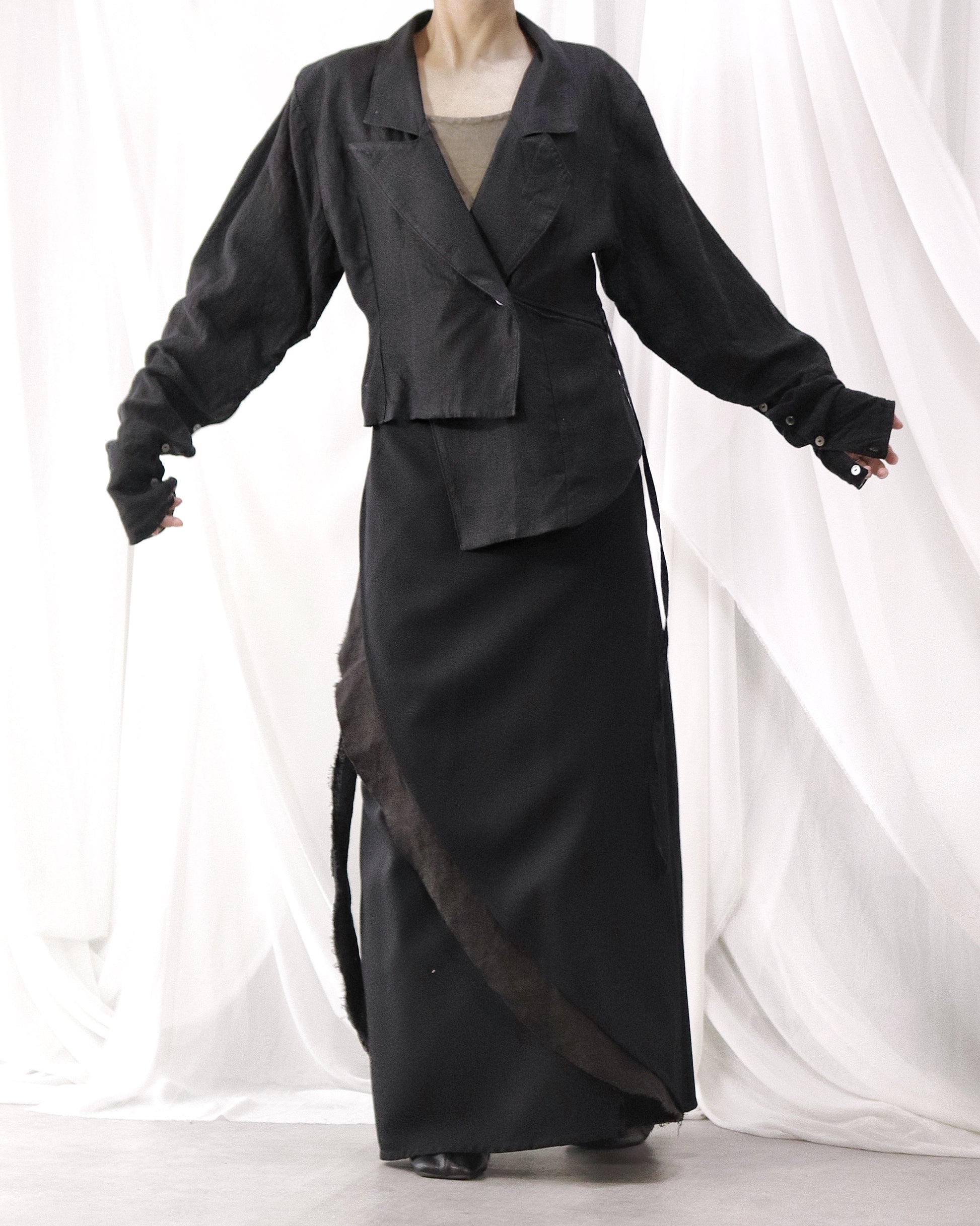 The tip of the left lapel is cut and reinserted in the opposite direction. The sleeves are intentionally long and can be worn folded back.