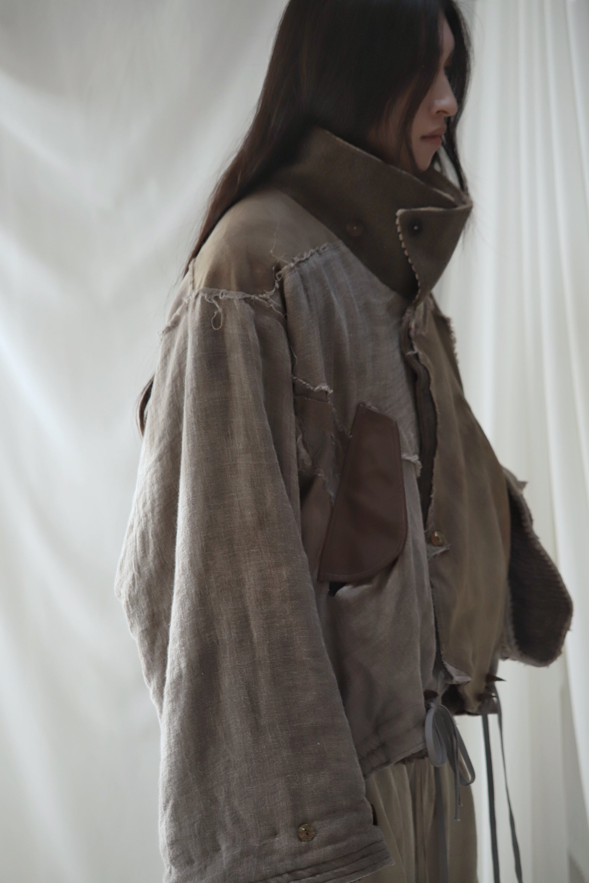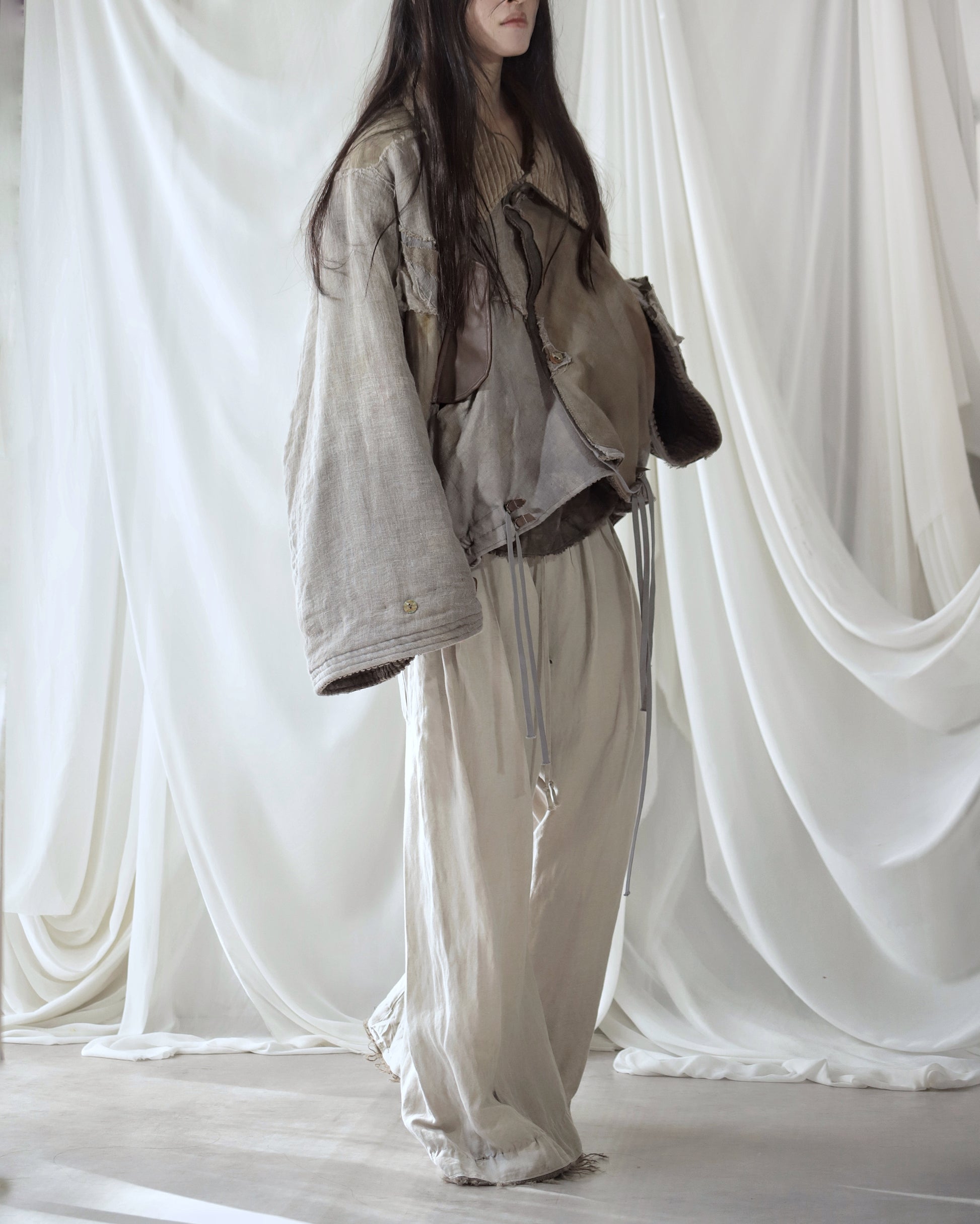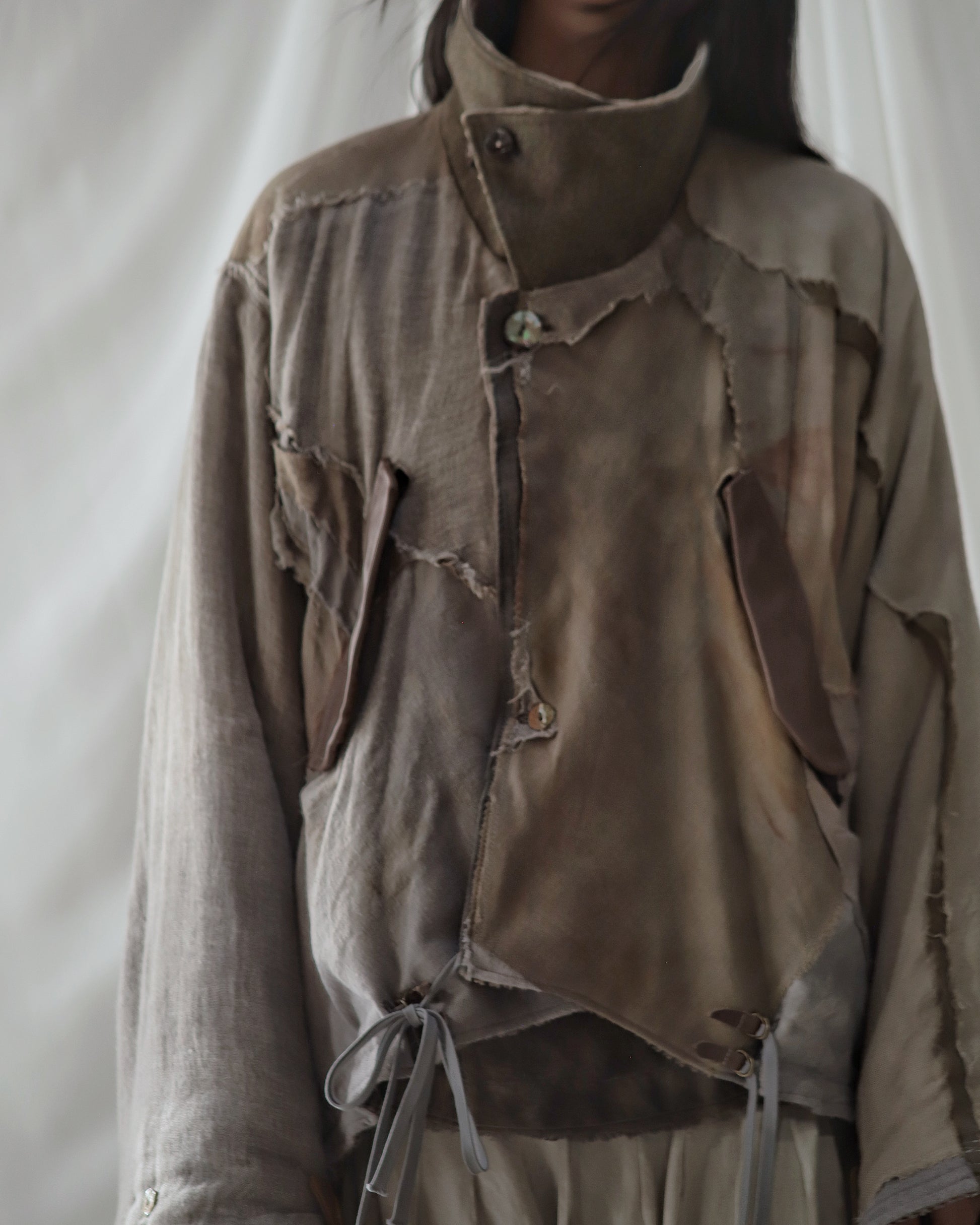 Linen gauze overlays the right sleeve and part of the body.
