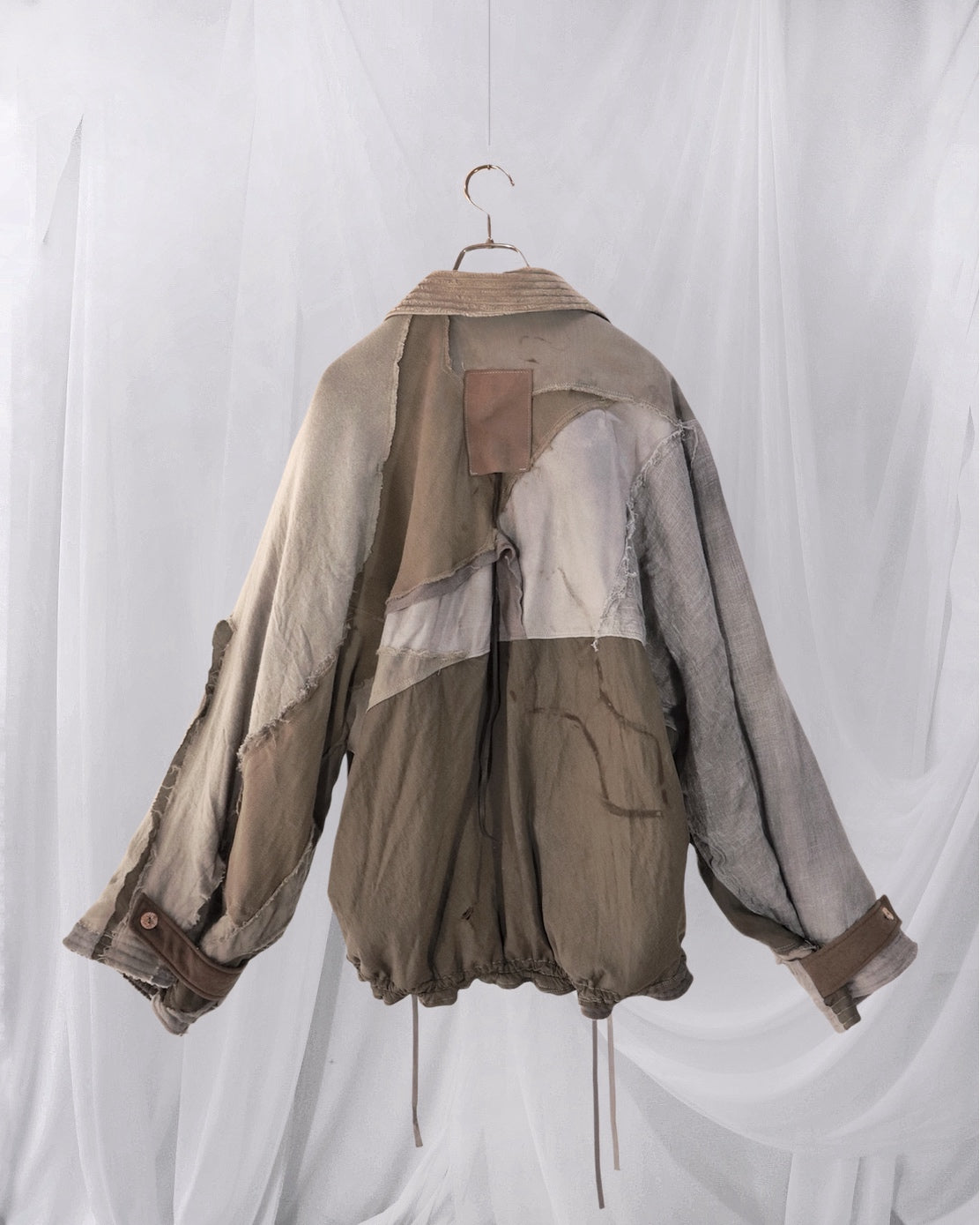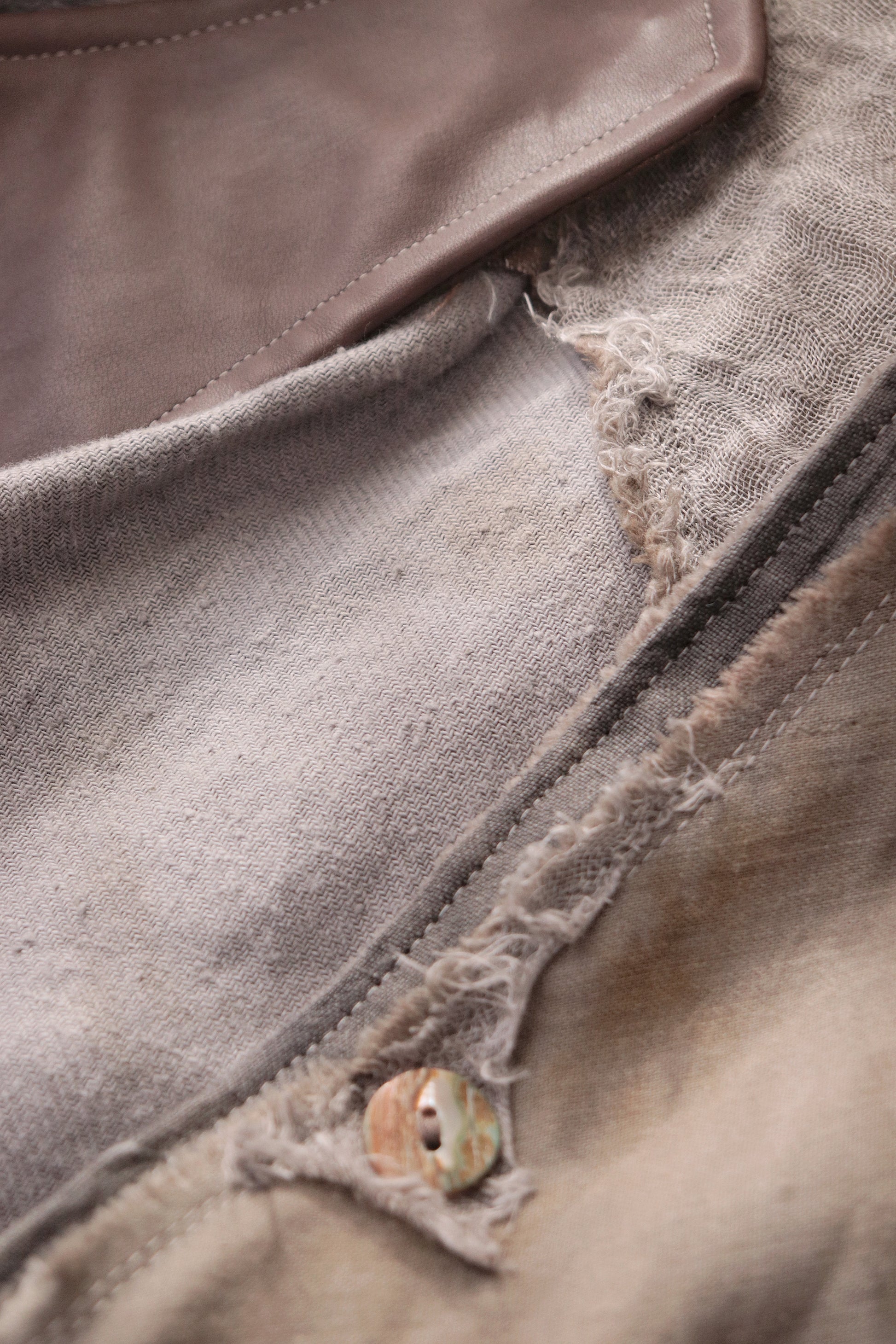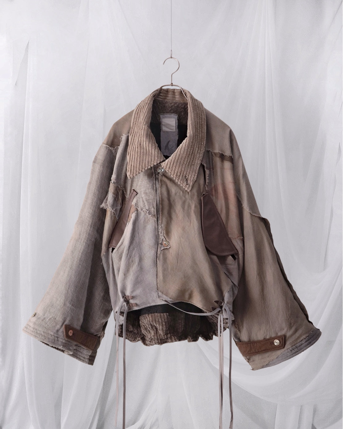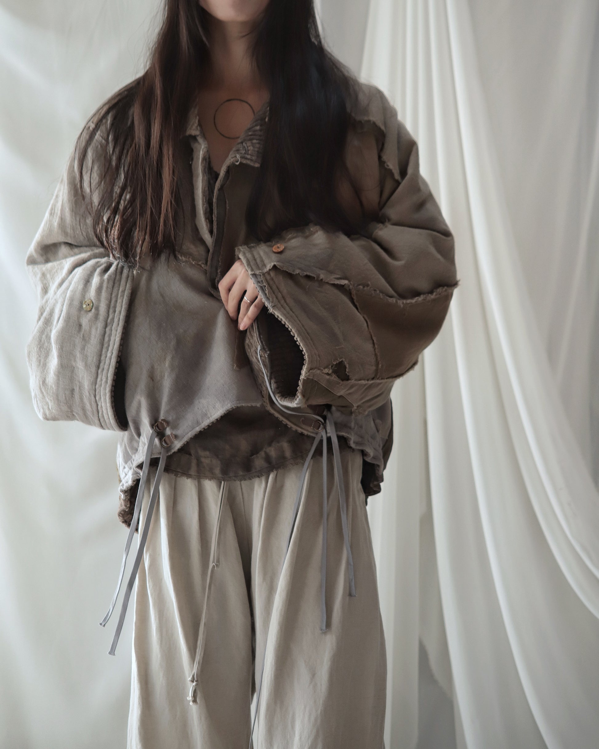 Linen gauze overlays the right sleeve and part of the body.