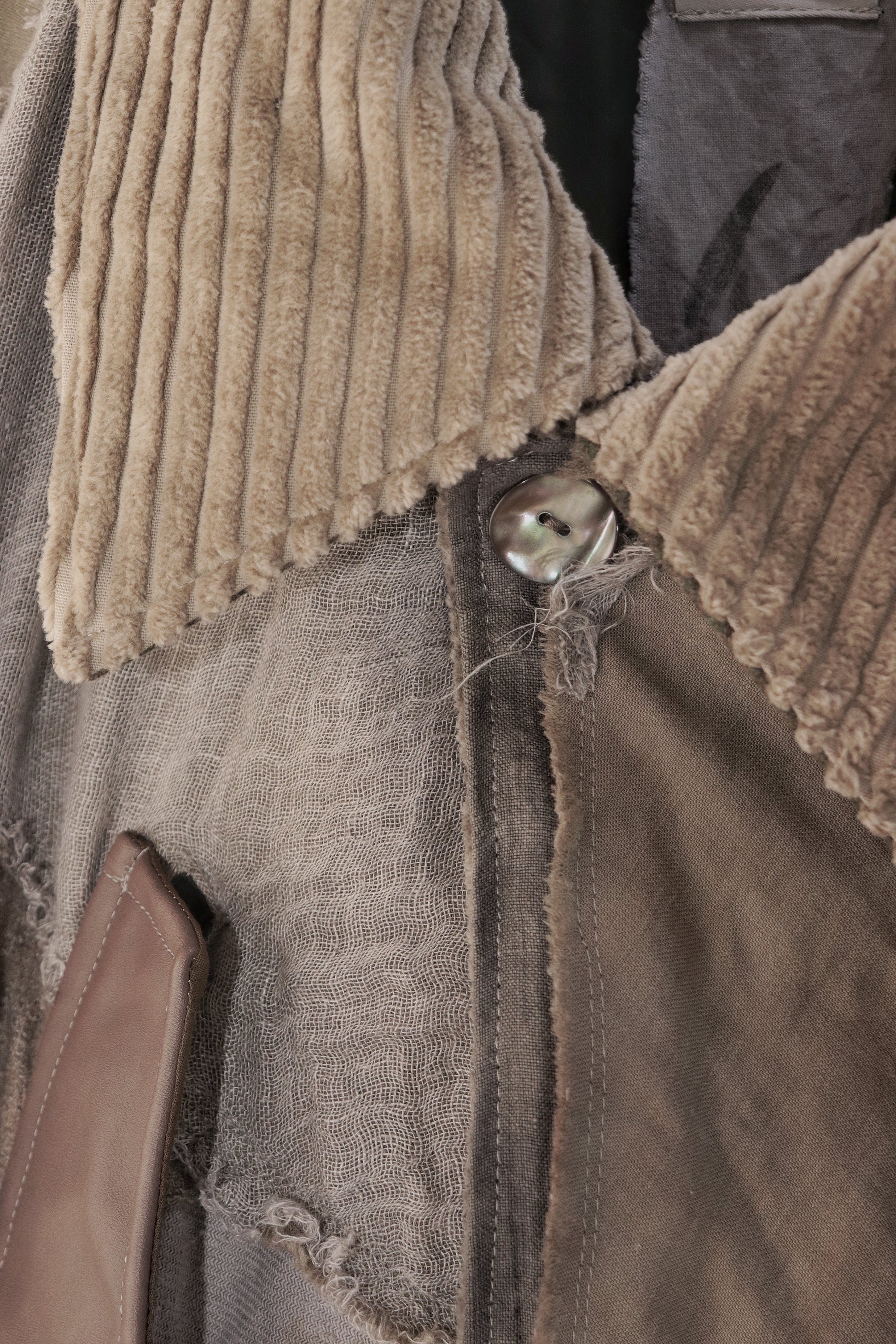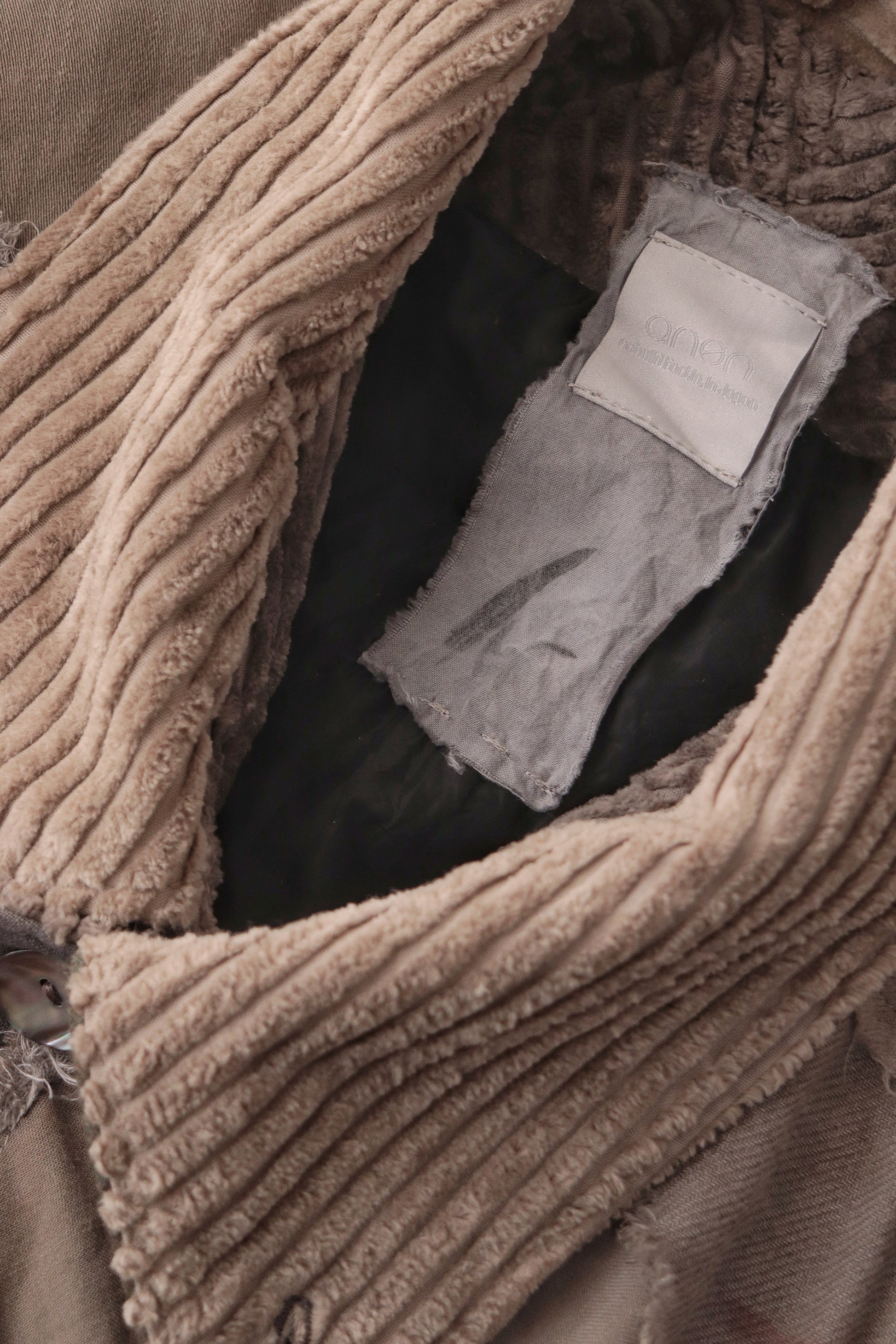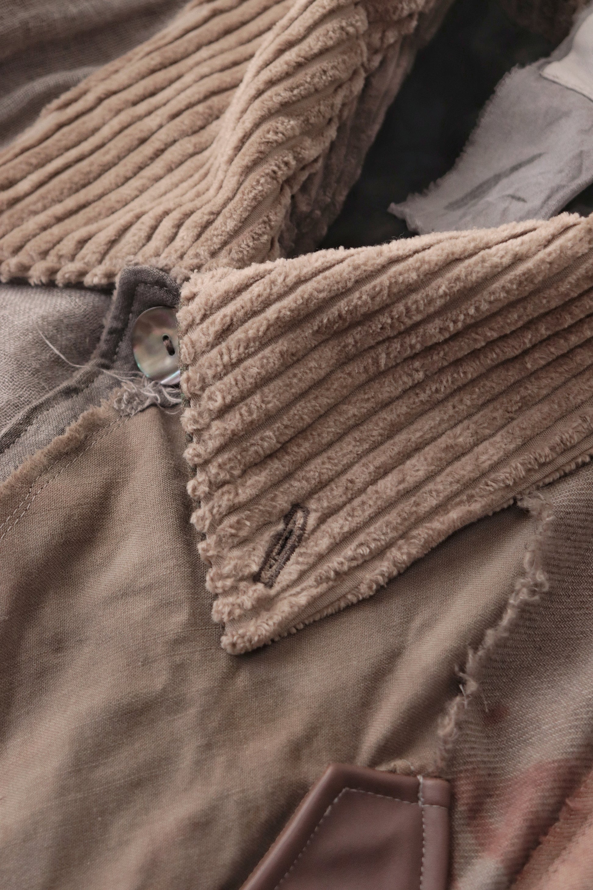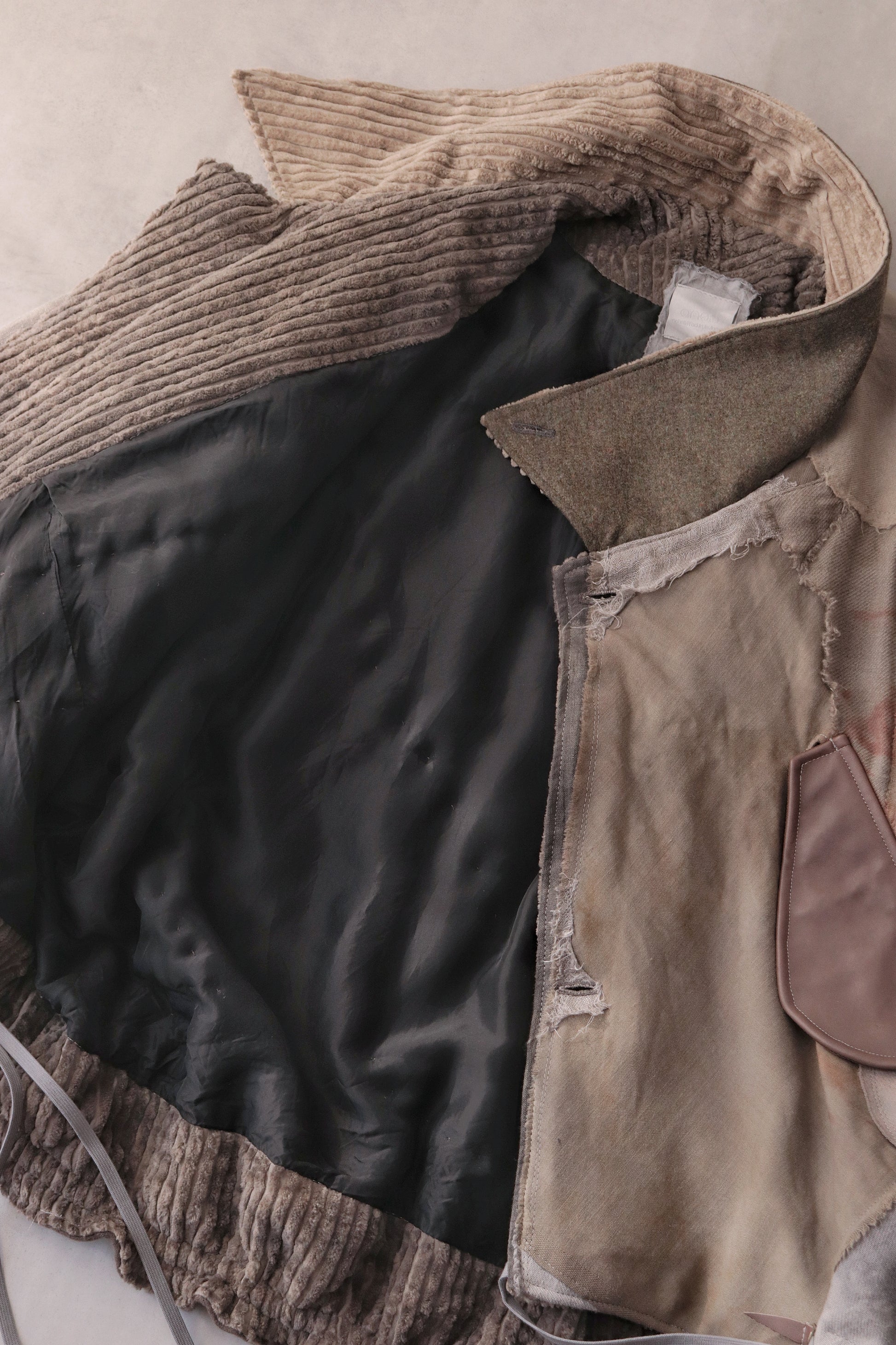Corduroy is used for the outer collar, sleeve linings, facings, and hem lining; the underside of the collar is fulled wool, and the pocket flaps are made of cowhide leather.