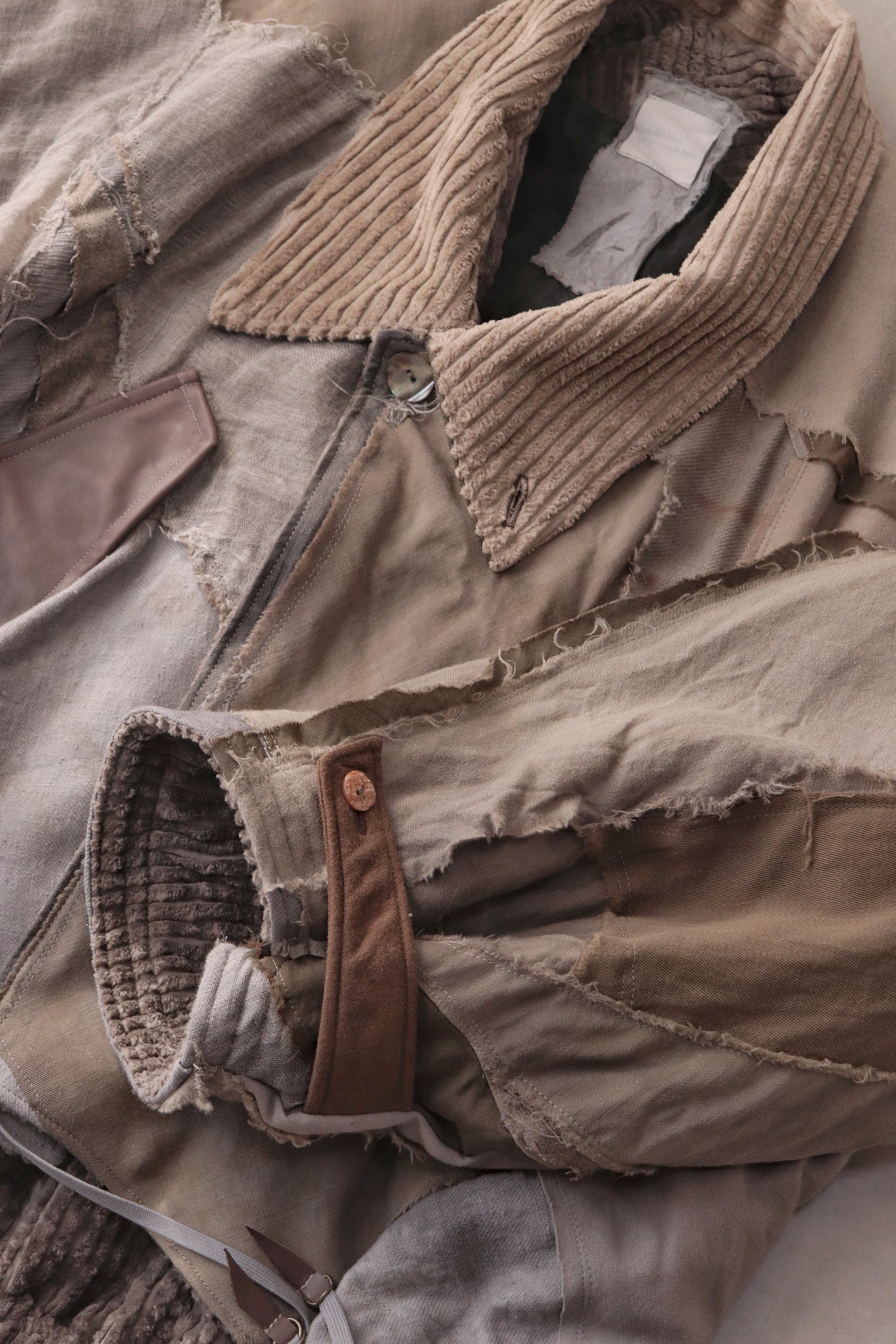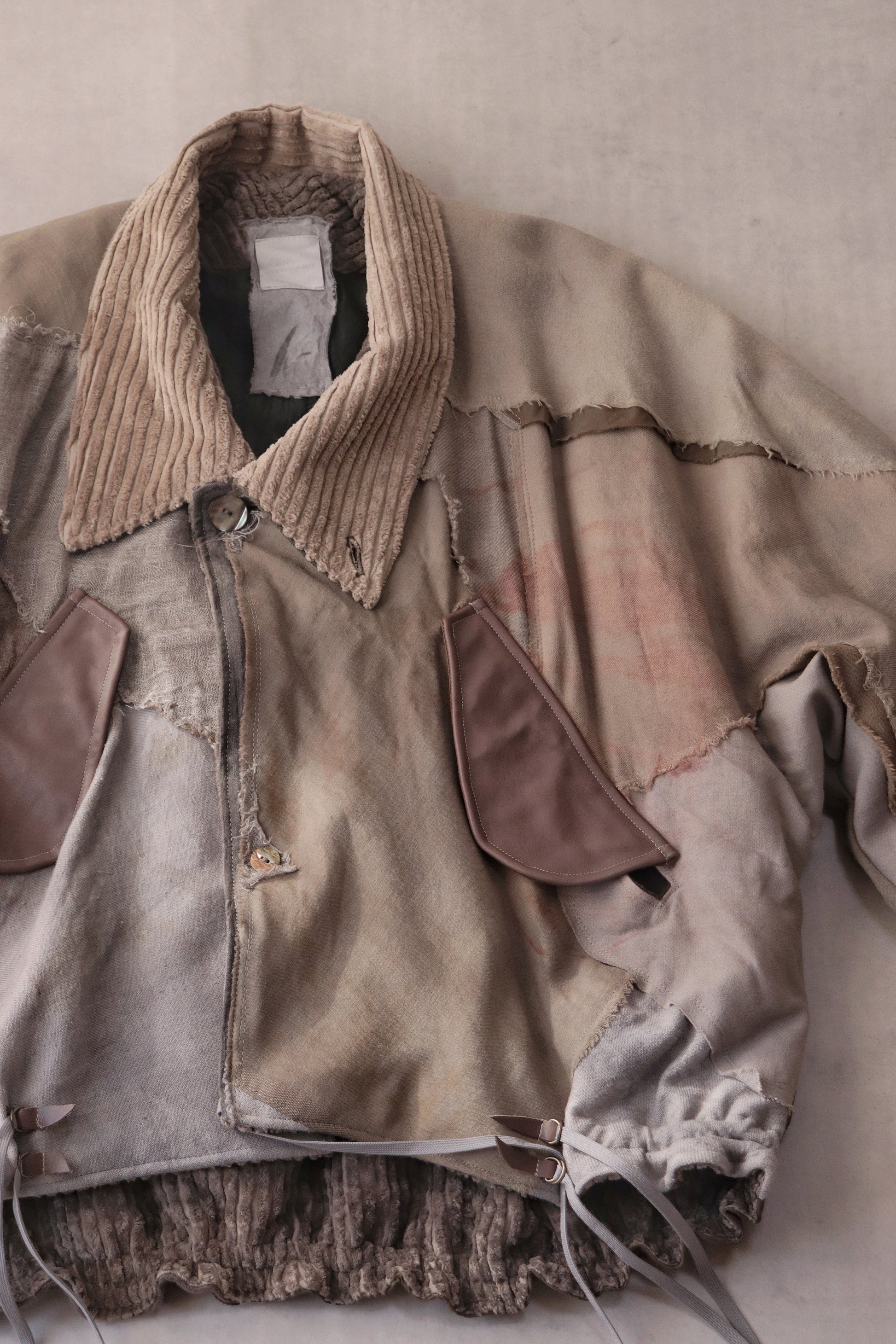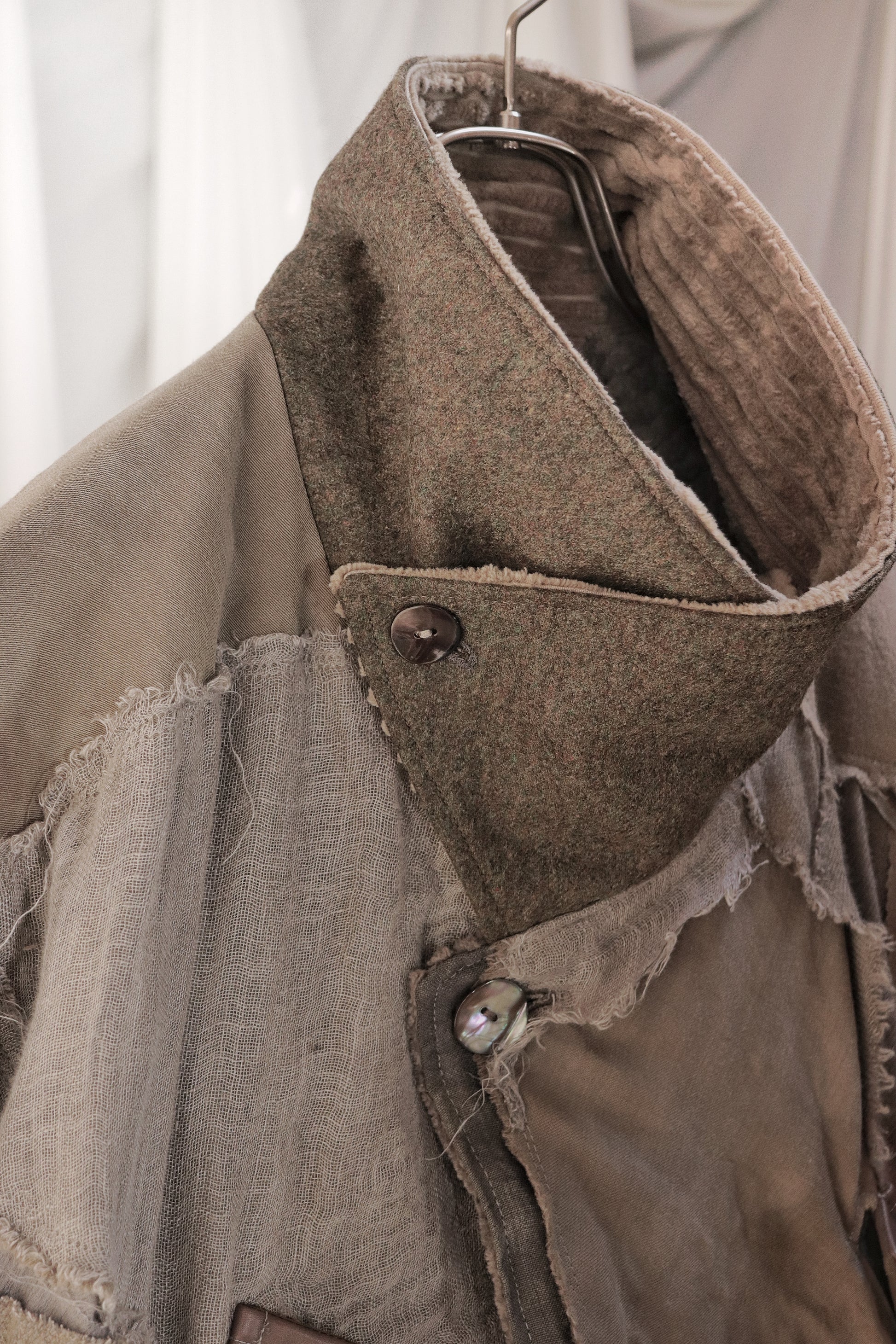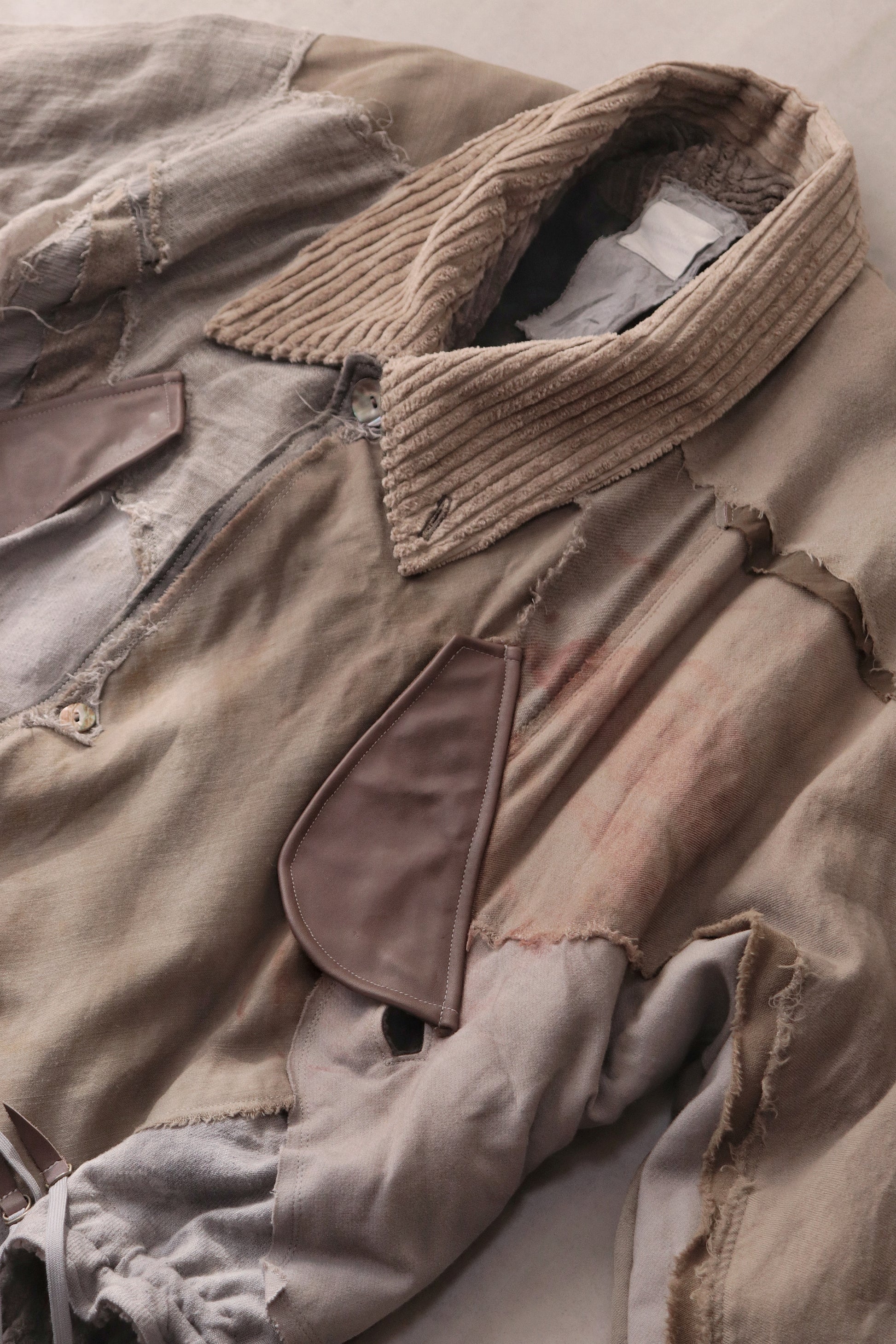 Corduroy is used for the outer collar, sleeve linings, facings, and hem lining; the underside of the collar is fulled wool, and the pocket flaps are made of cowhide leather.
