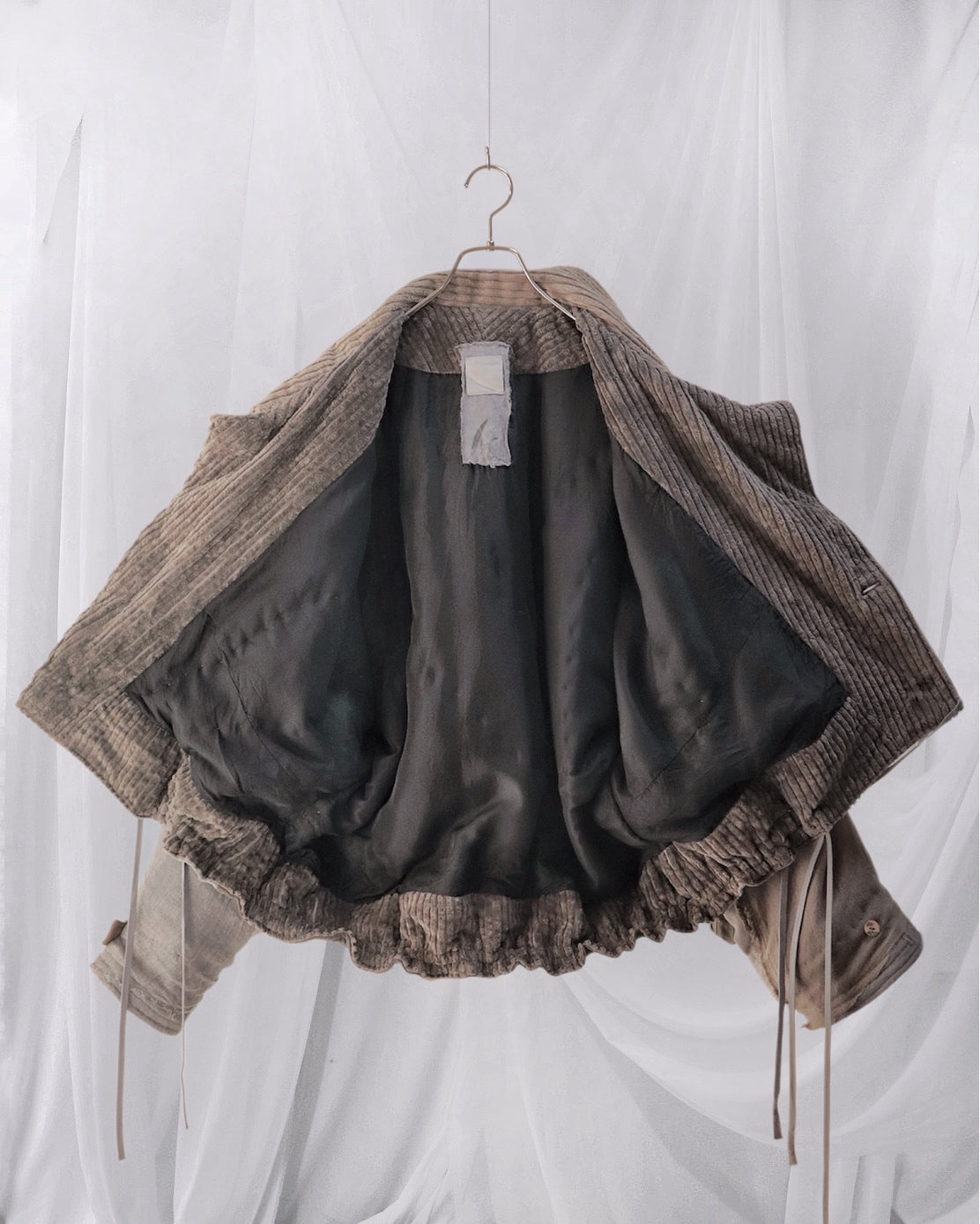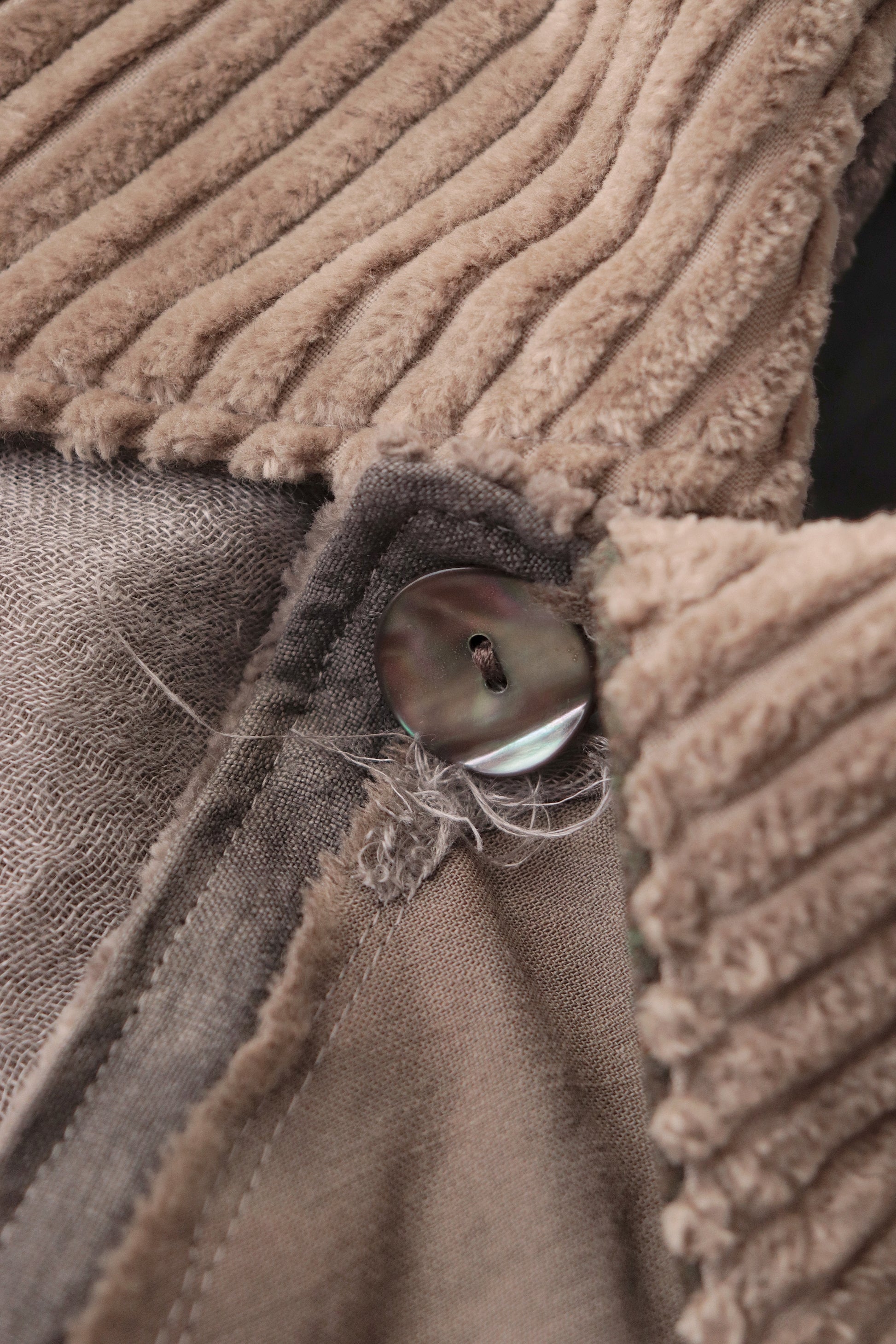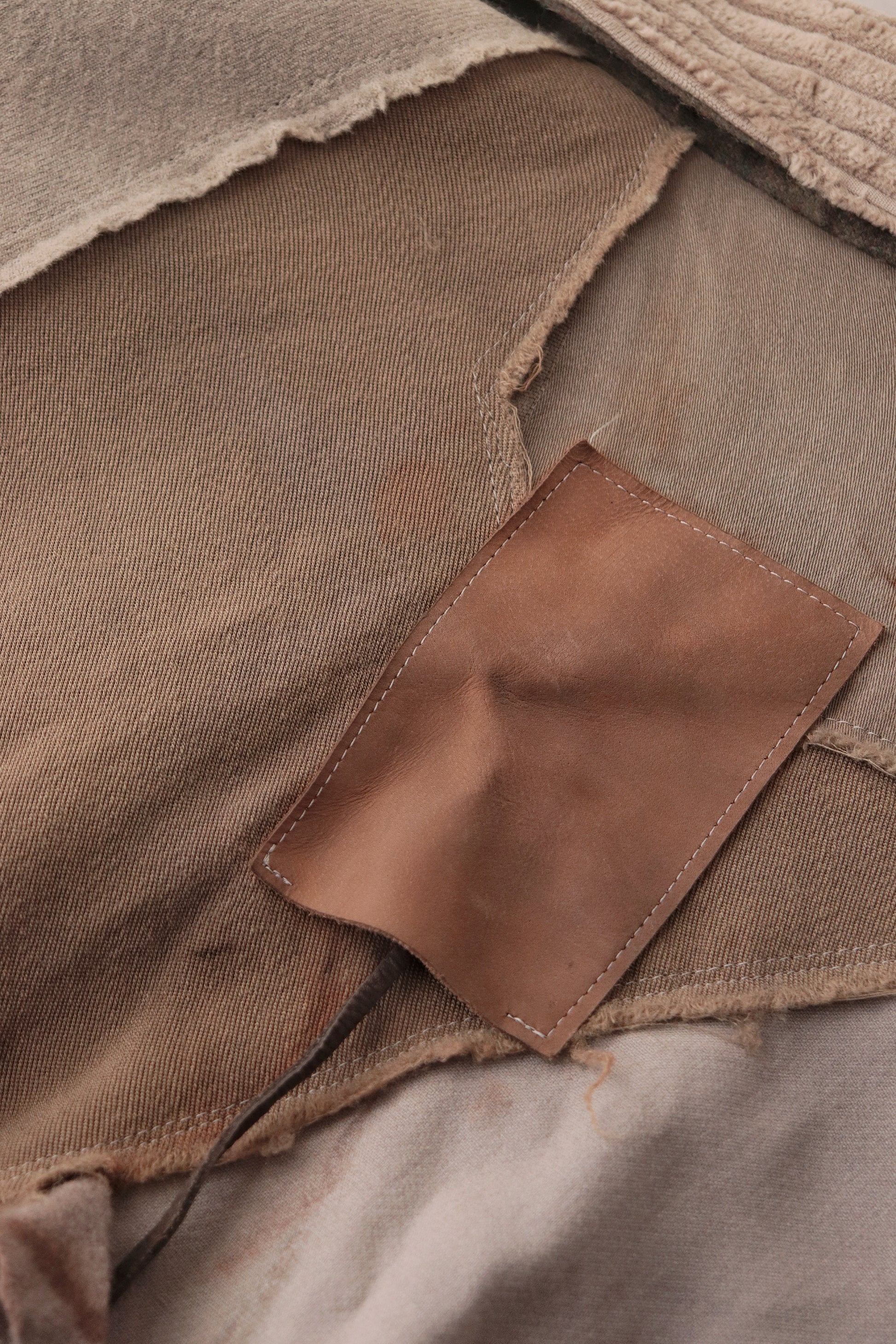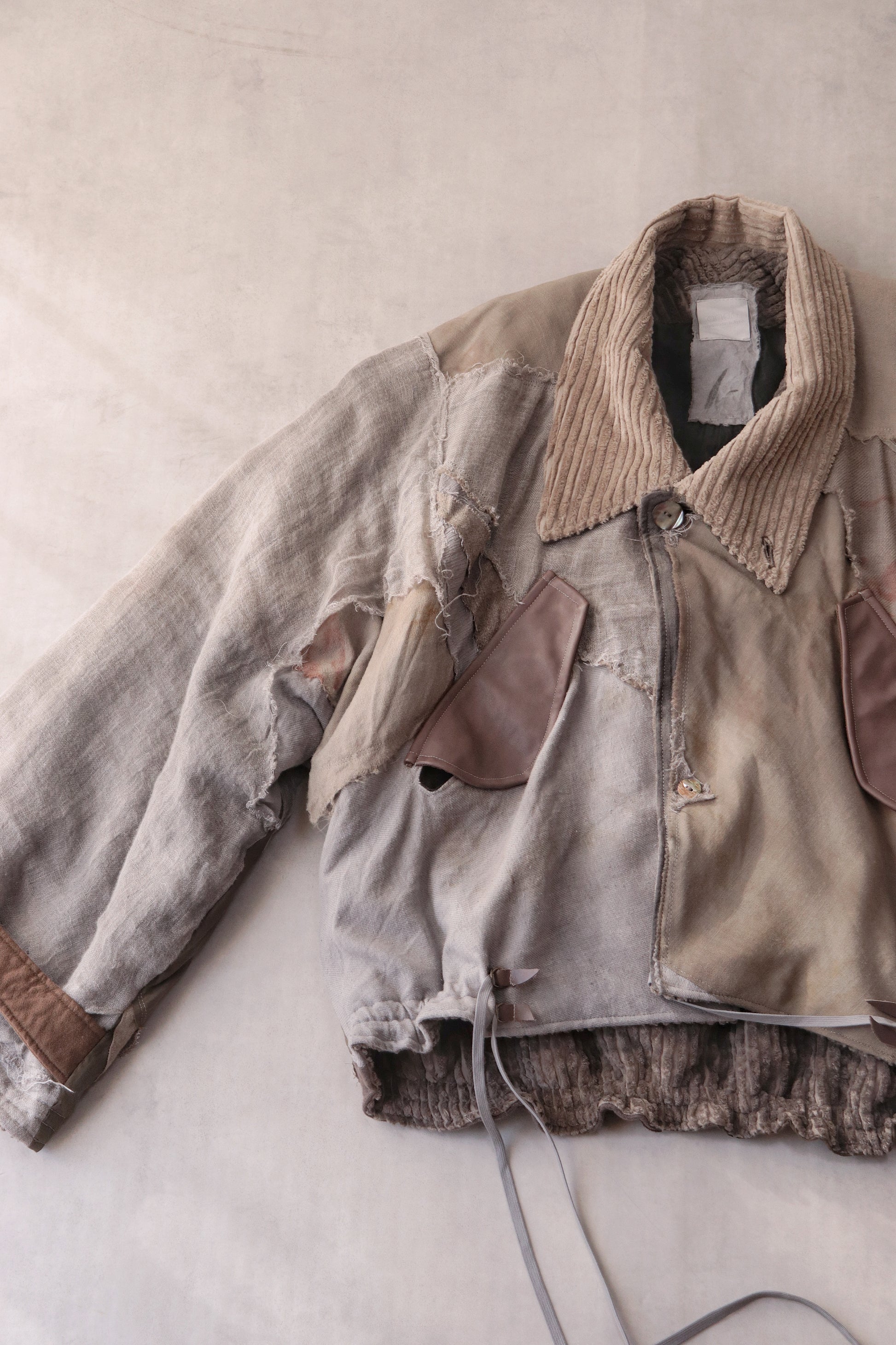Corduroy is used for the outer collar, sleeve linings, facings, and hem lining; the underside of the collar is fulled wool, and the pocket flaps are made of cowhide leather.