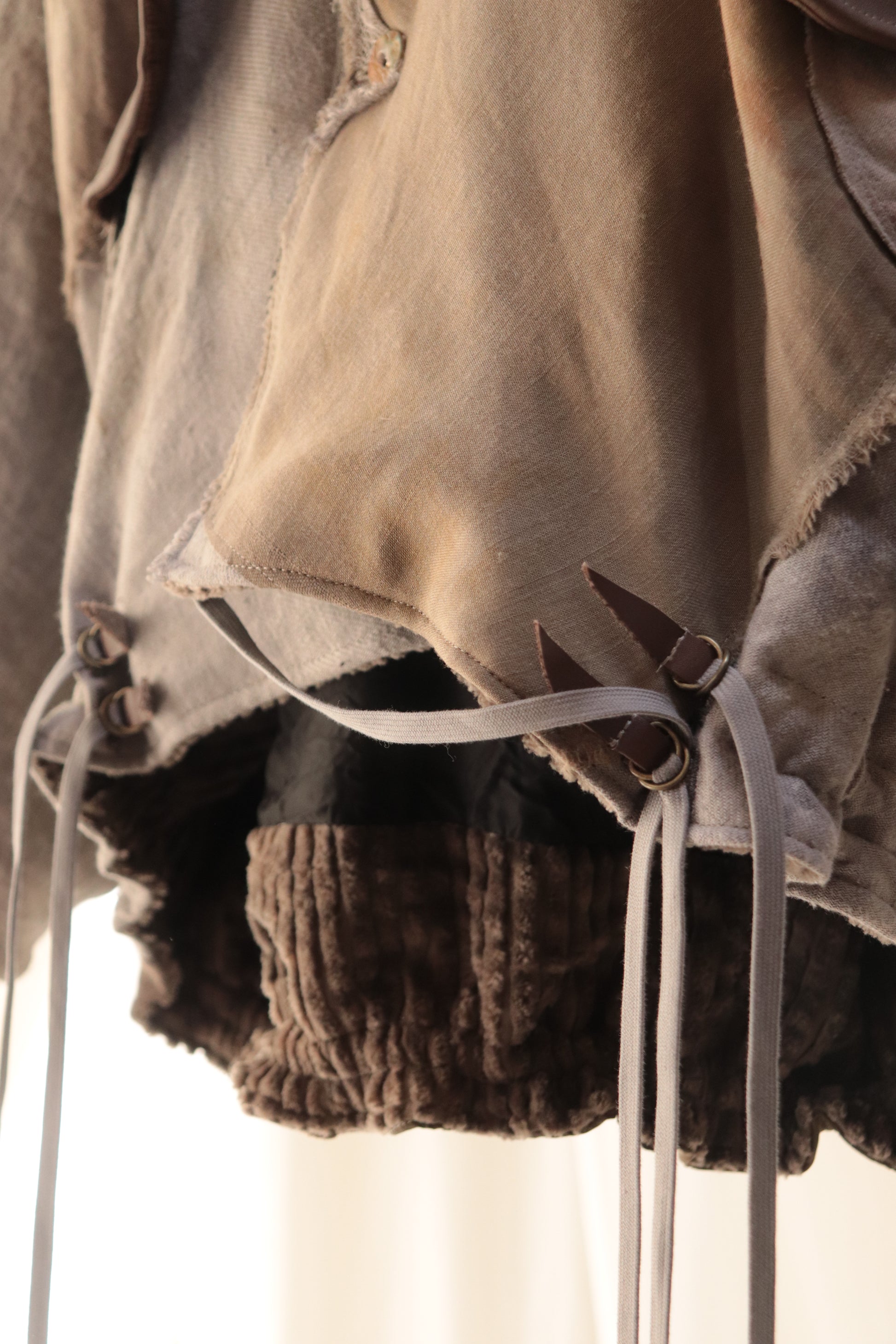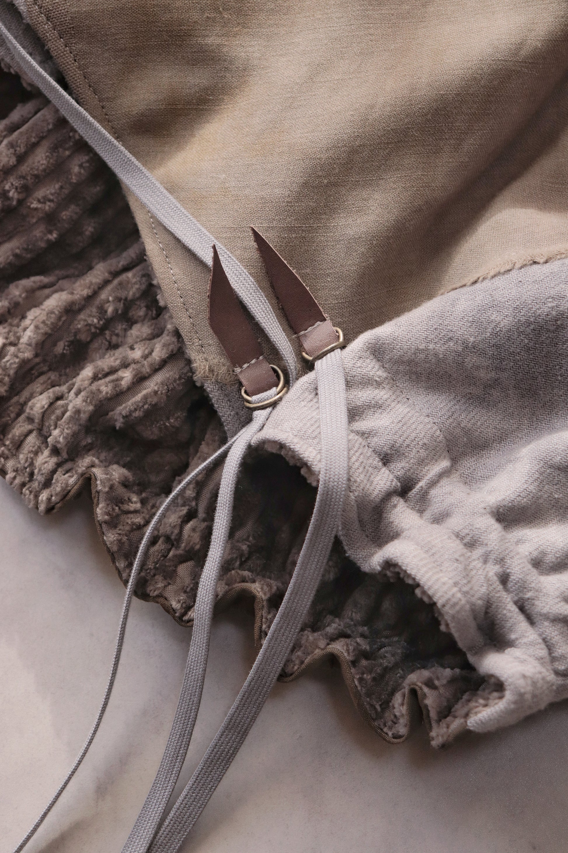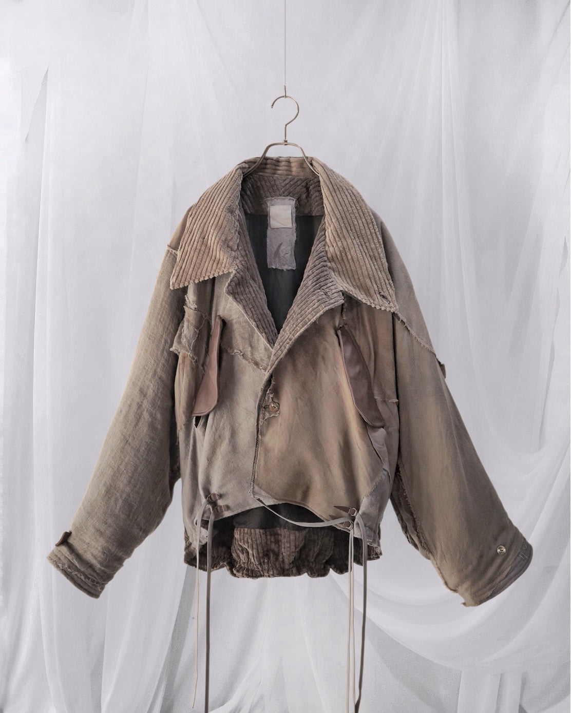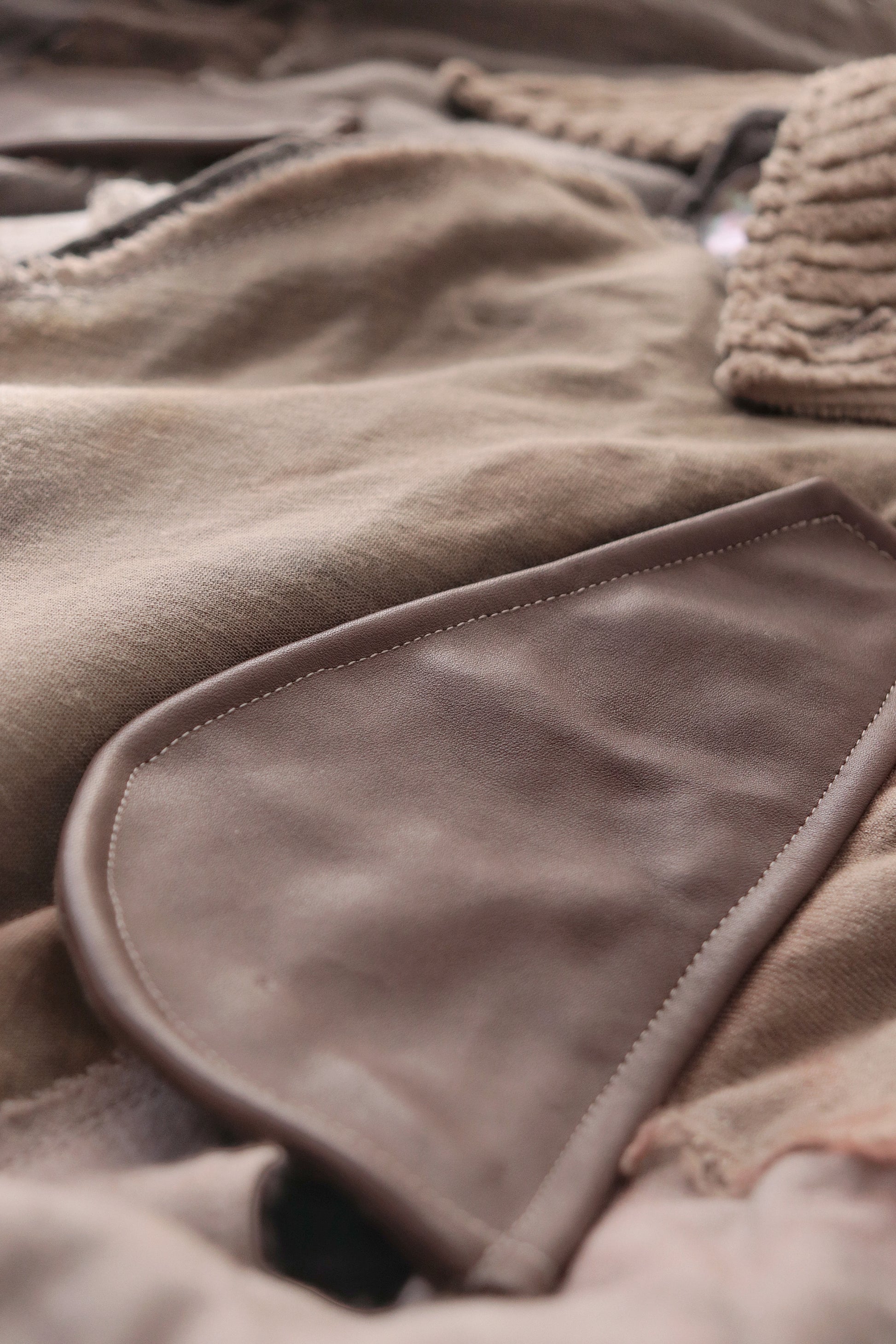 Corduroy is used for the outer collar, sleeve linings, facings, and hem lining; the underside of the collar is fulled wool, and the pocket flaps are made of cowhide leather.