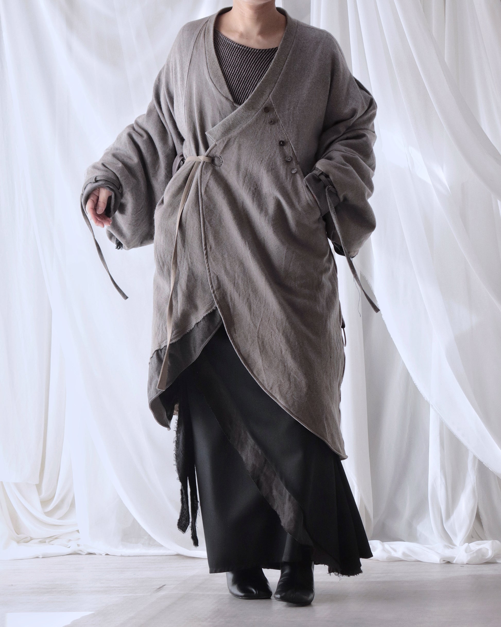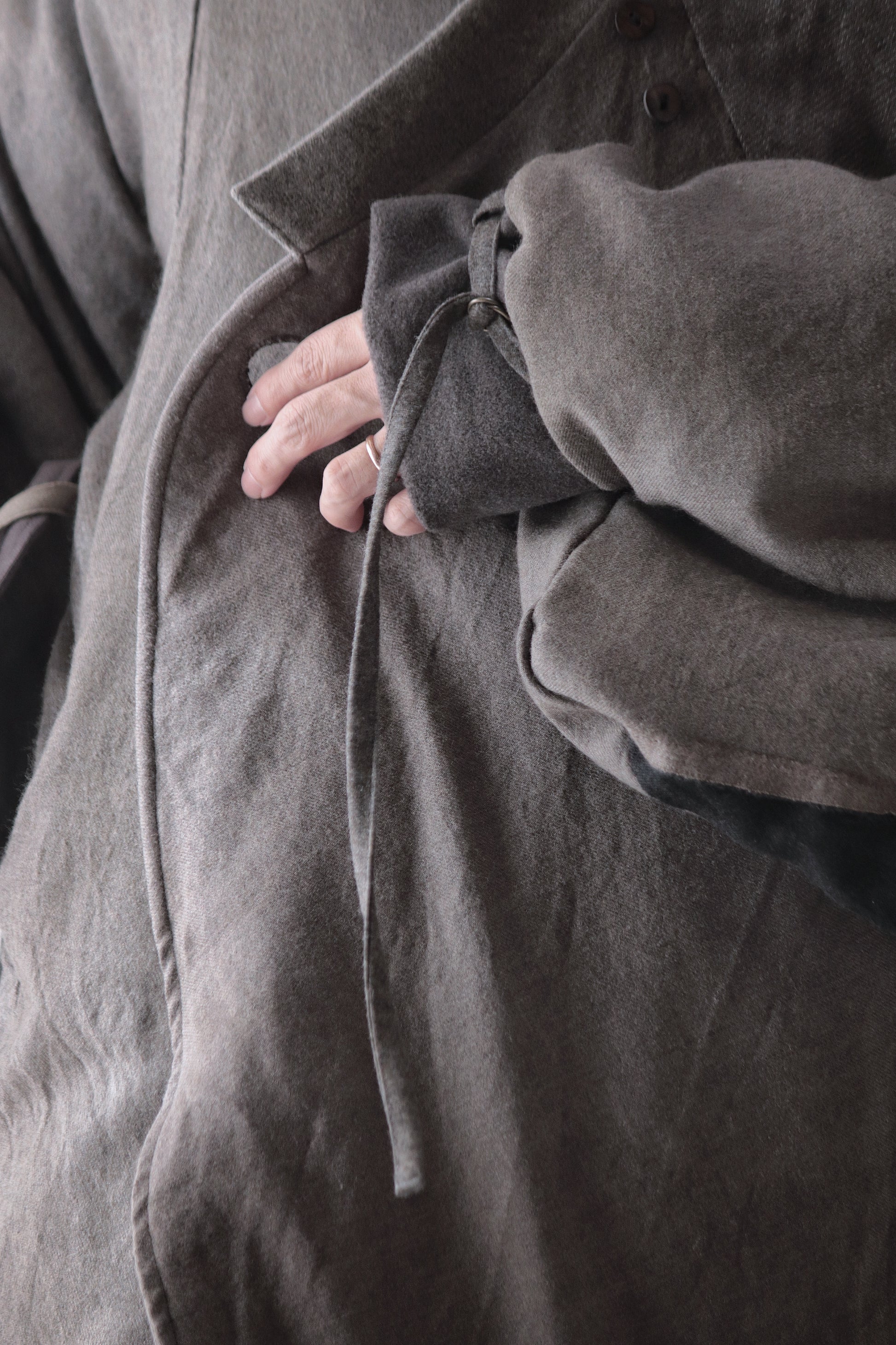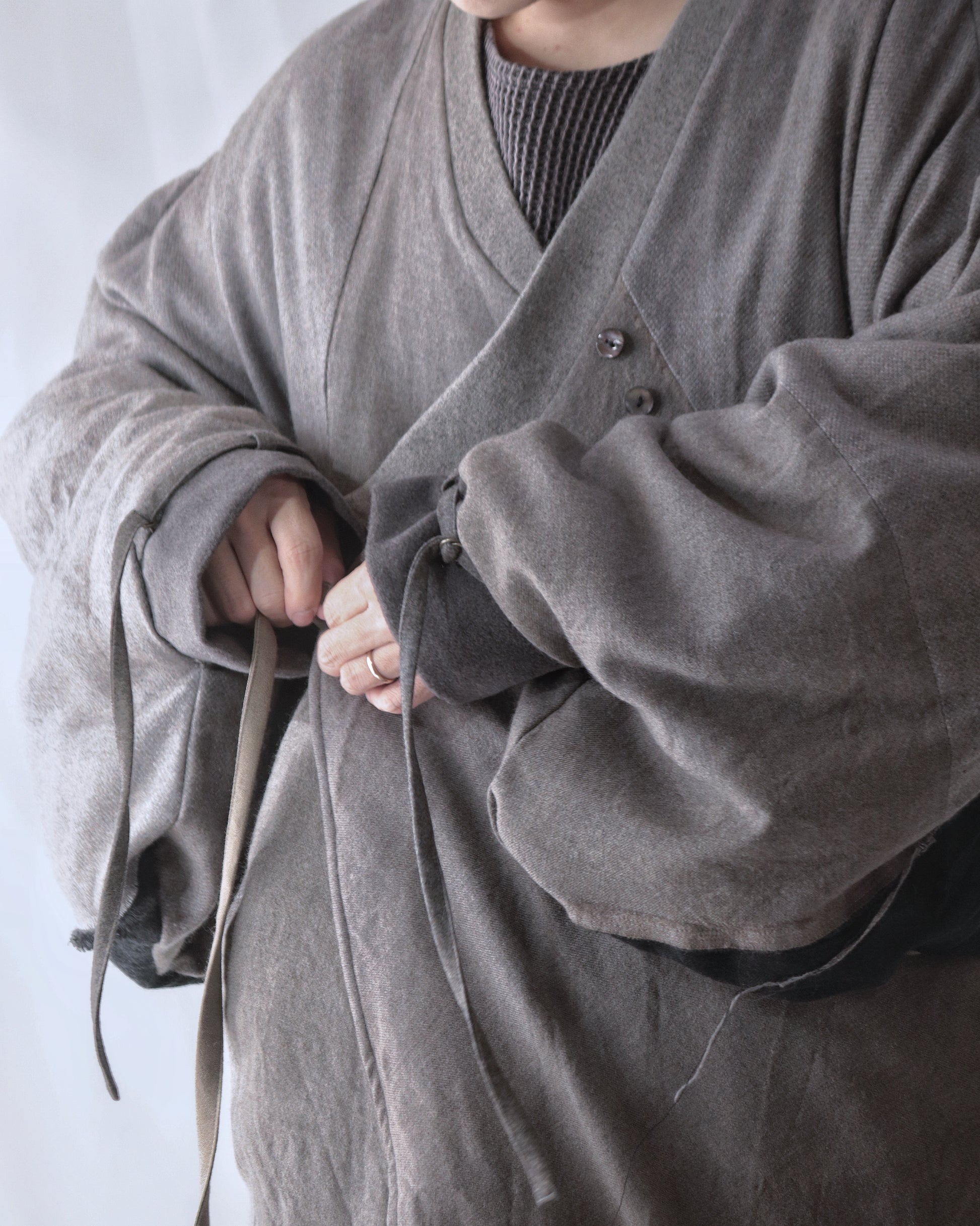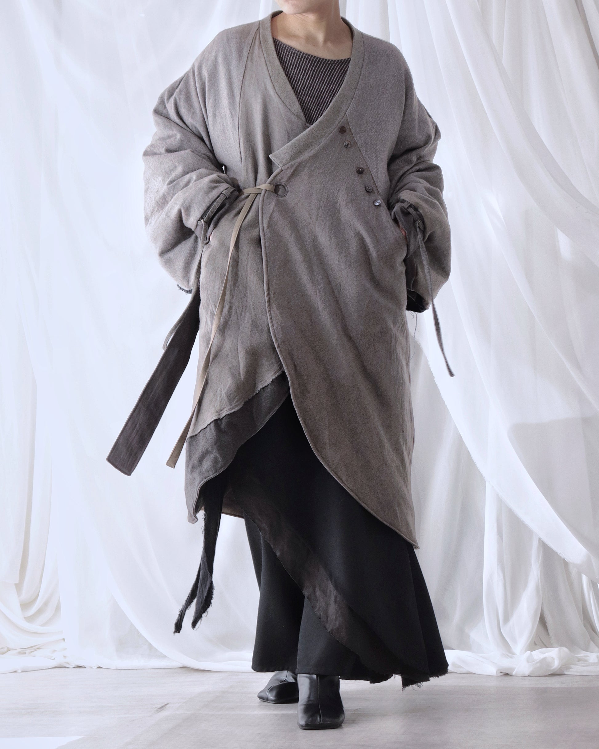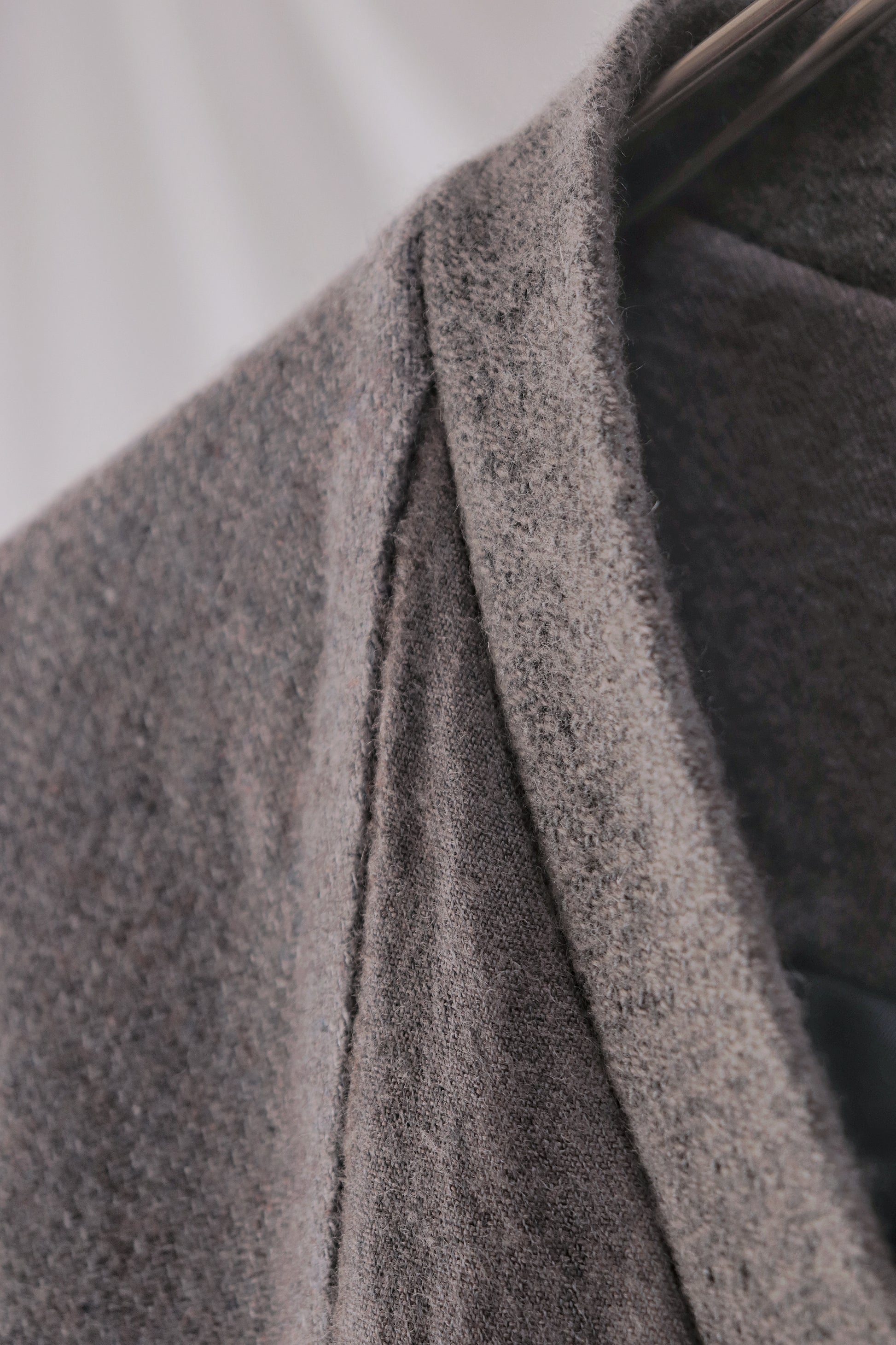 8種の、柔らかく軽めのウールを合わせ、染め、中綿をキュプラ裏地で縫い閉じた総裏地付き。
