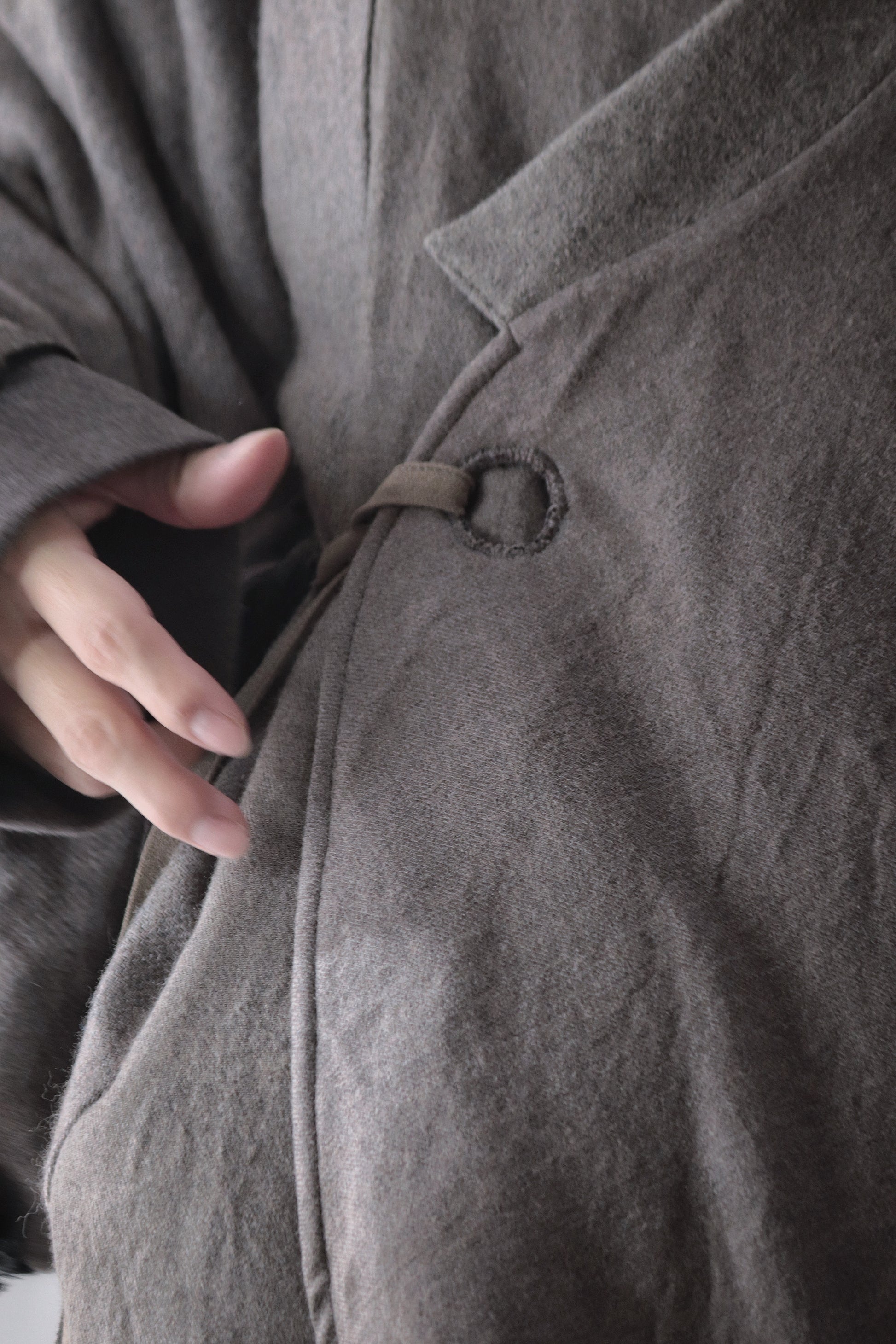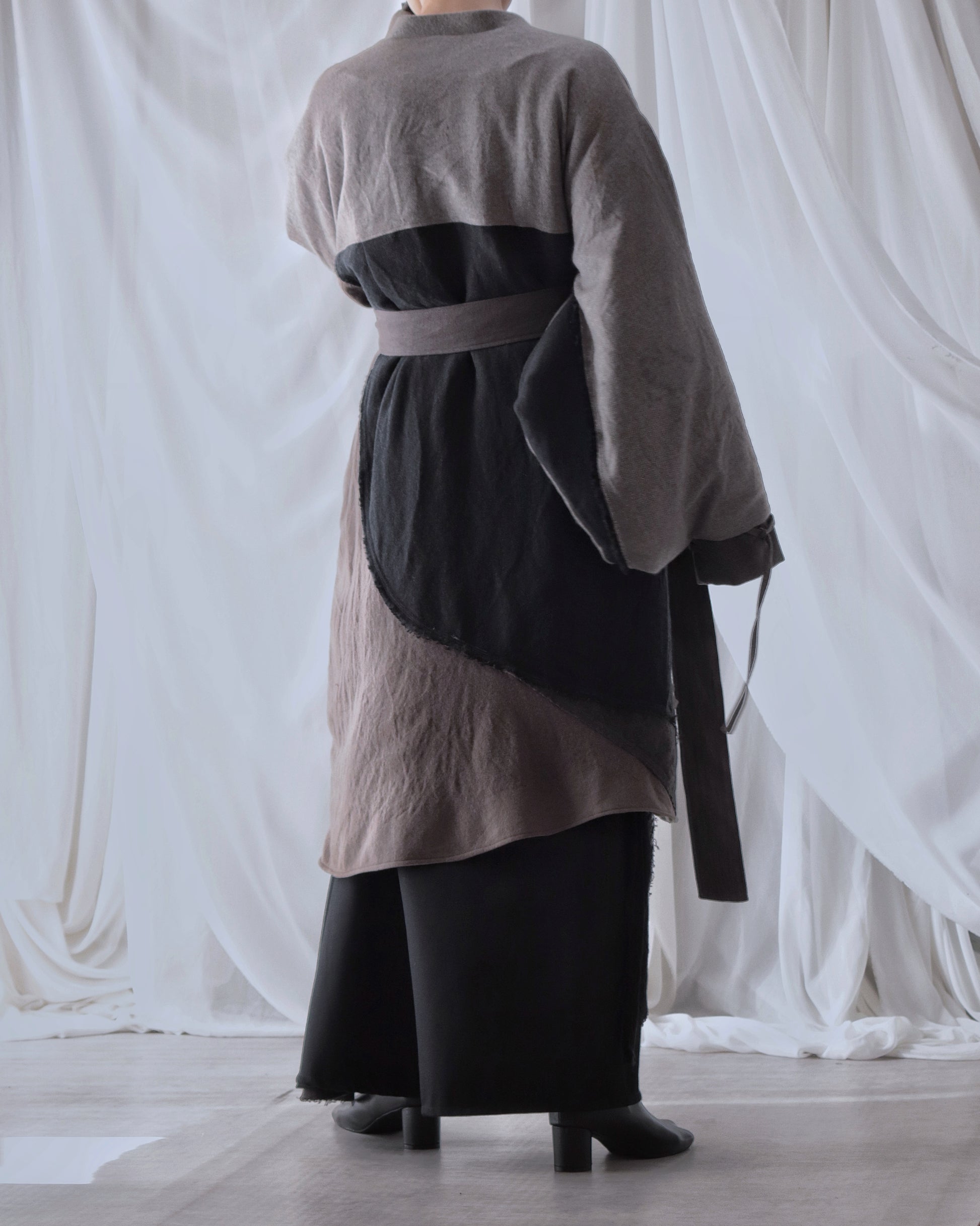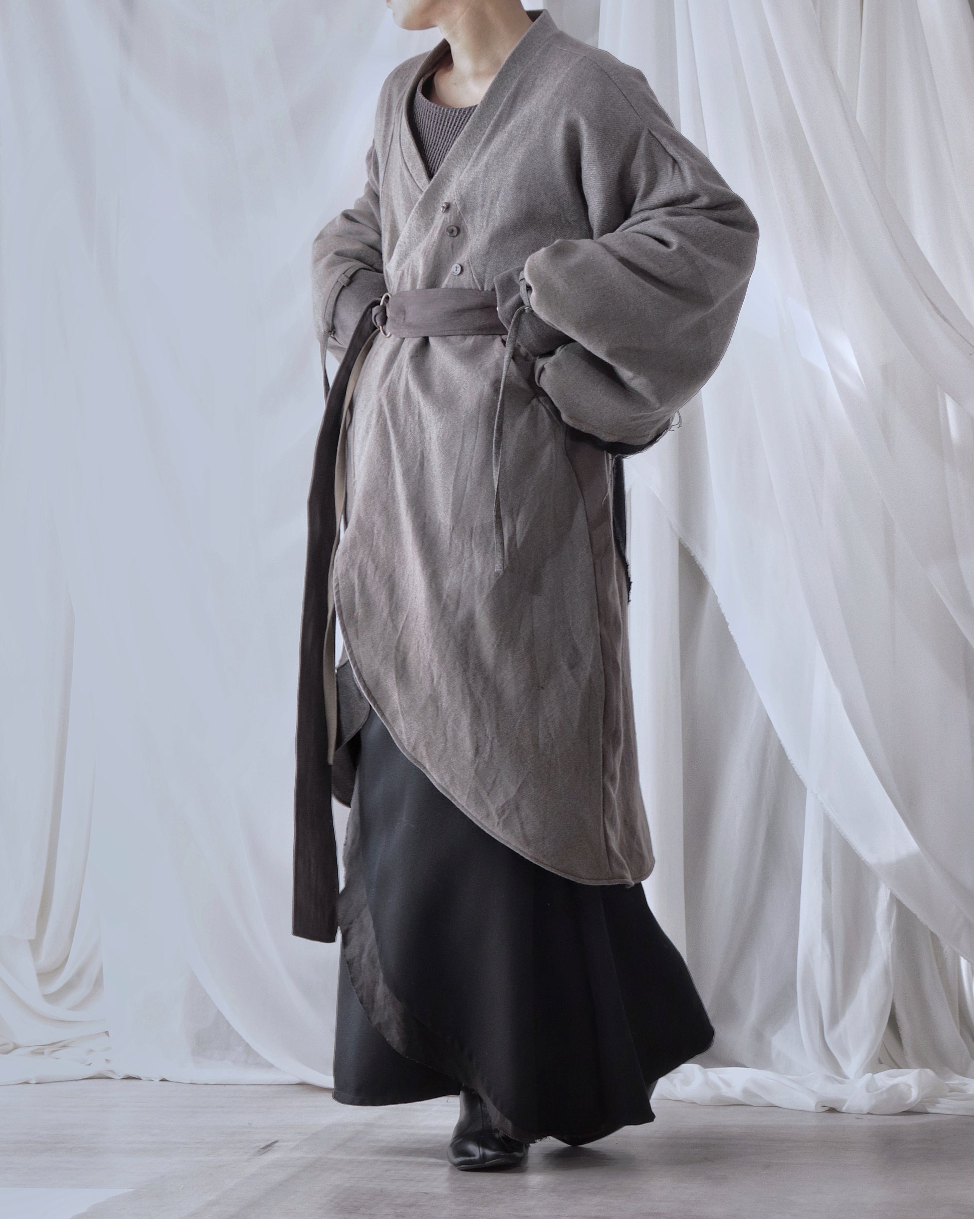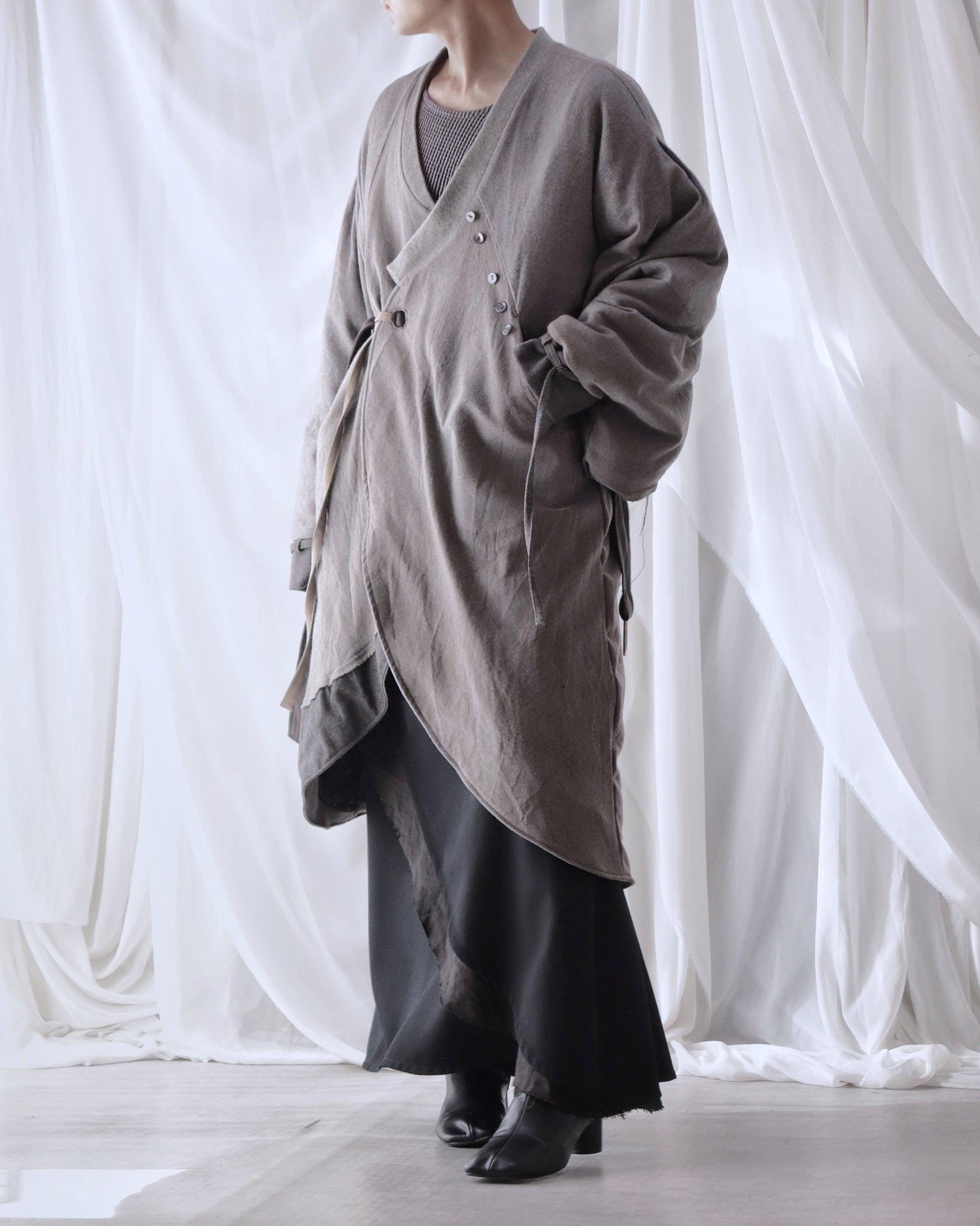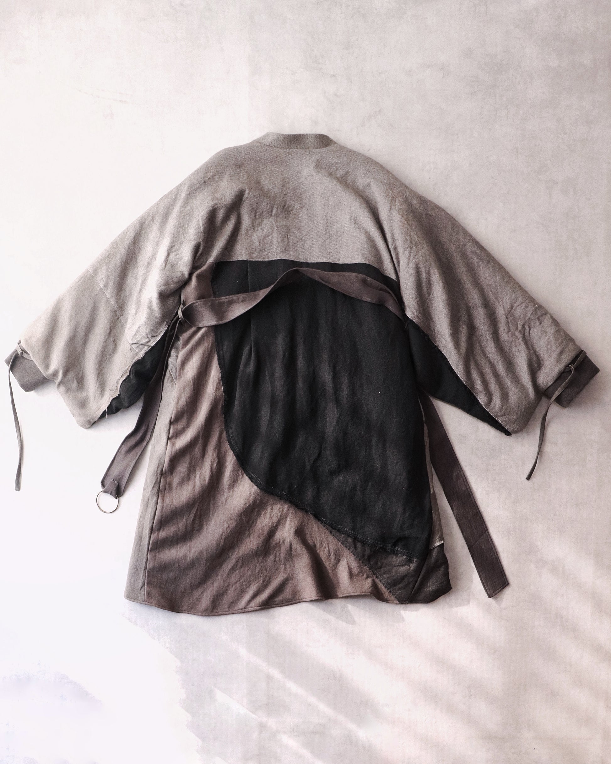 8種の、柔らかく軽めのウールを合わせ、染め、中綿をキュプラ裏地で縫い閉じた総裏地付き。