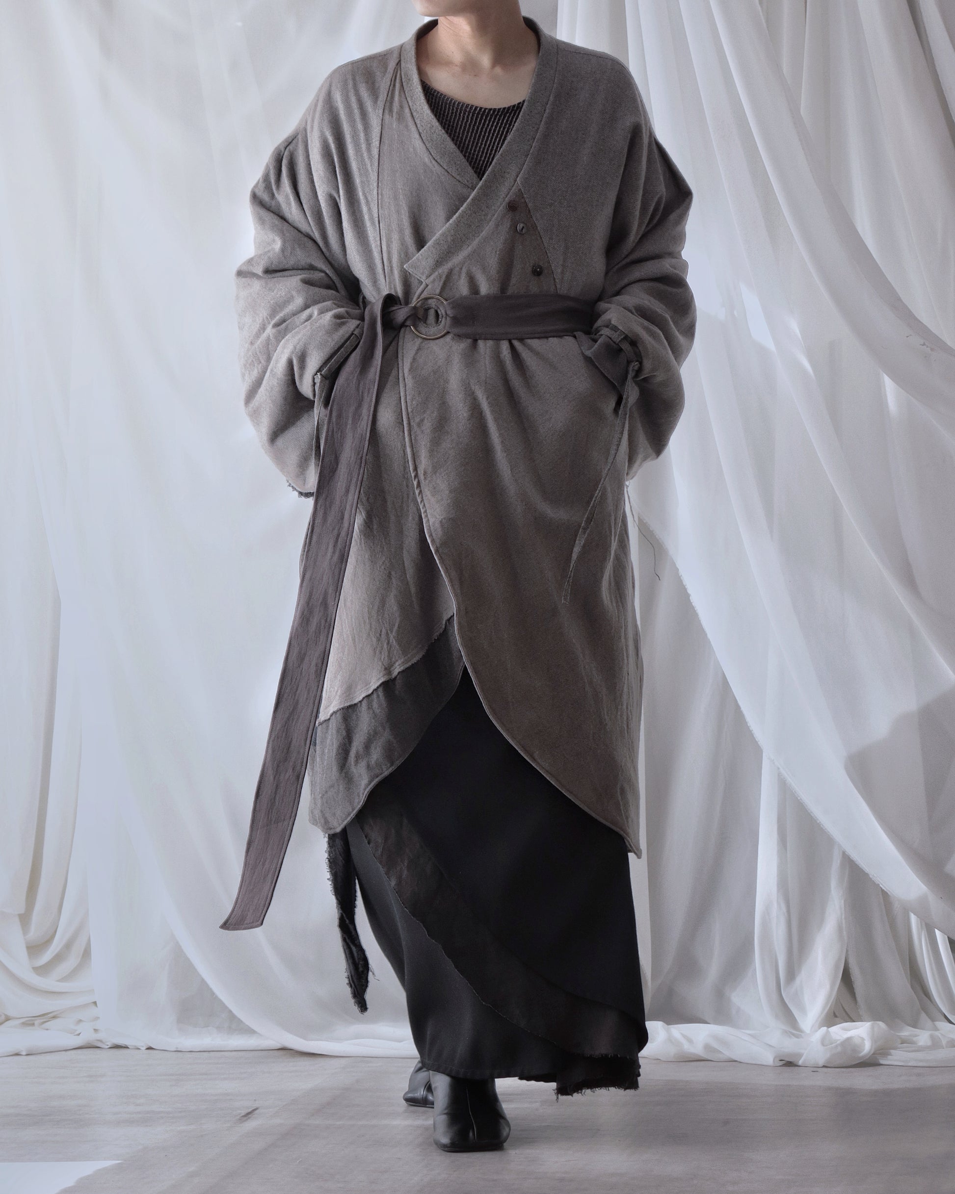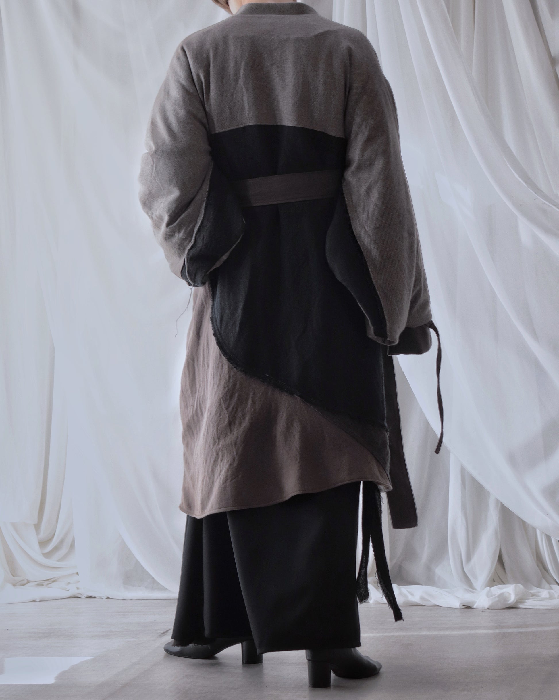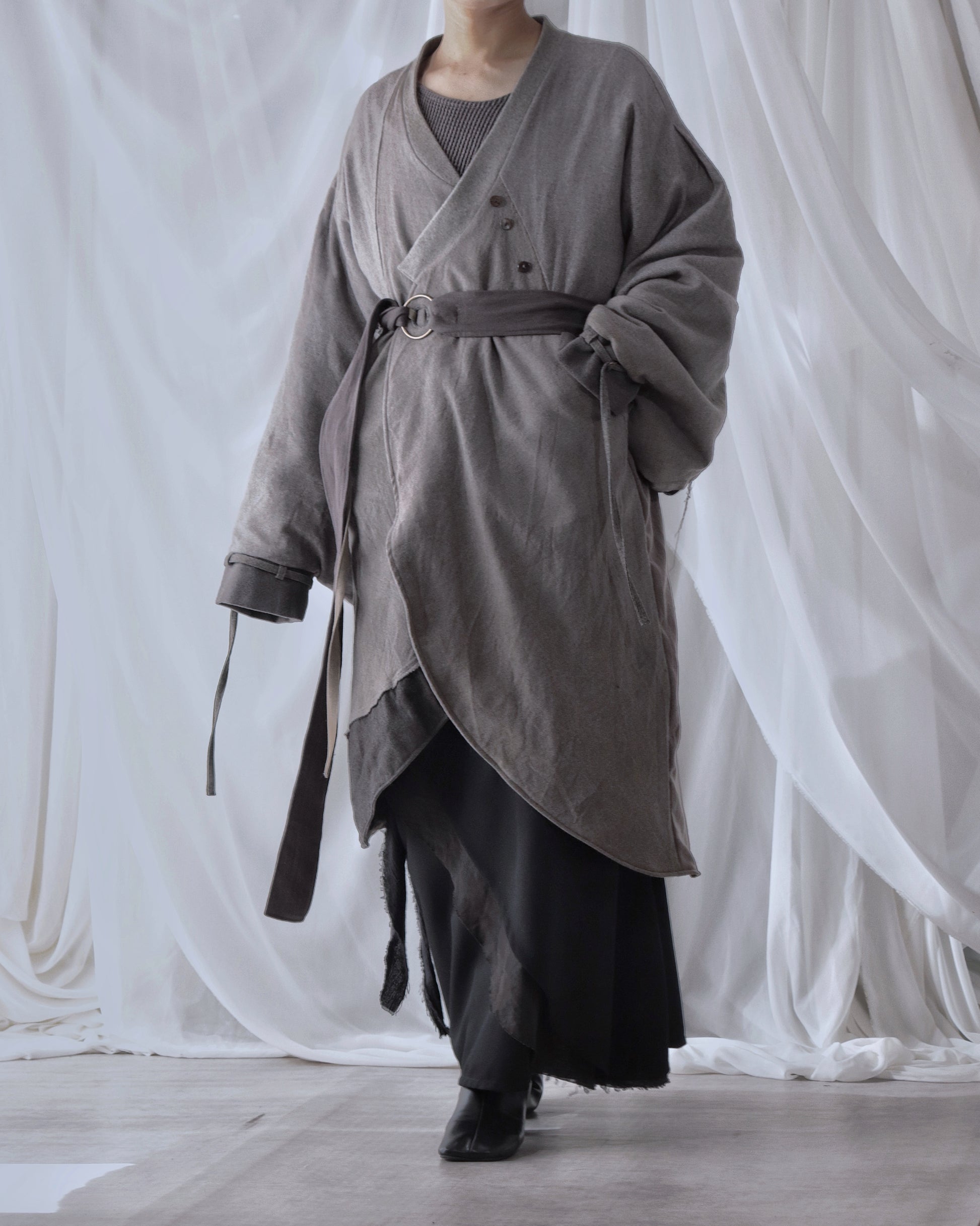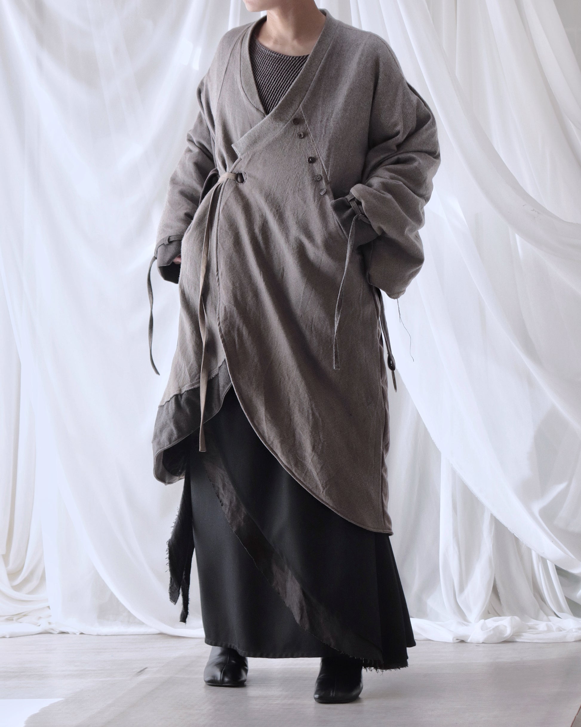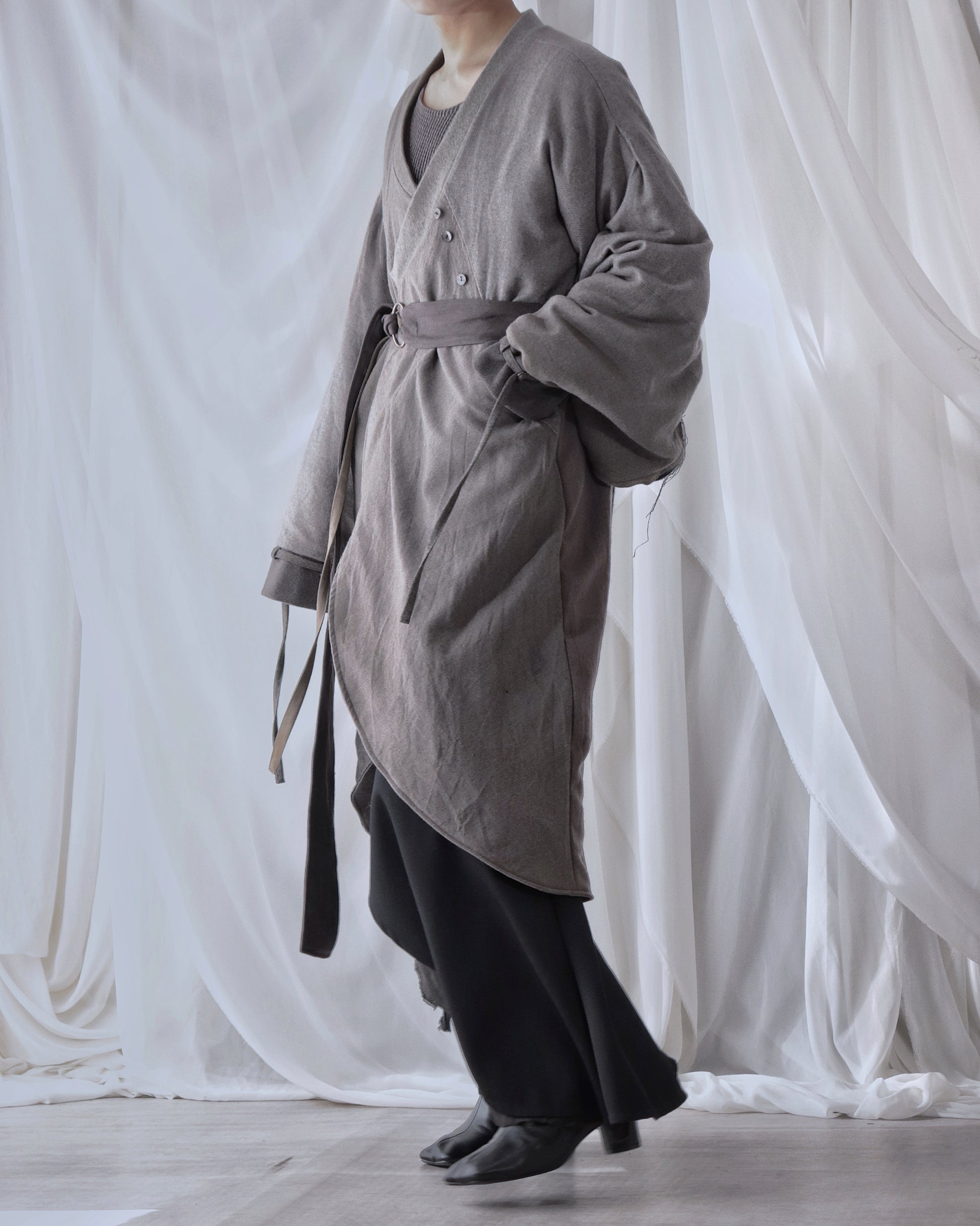 8種の、柔らかく軽めのウールを合わせ、染め、中綿をキュプラ裏地で縫い閉じた総裏地付き。