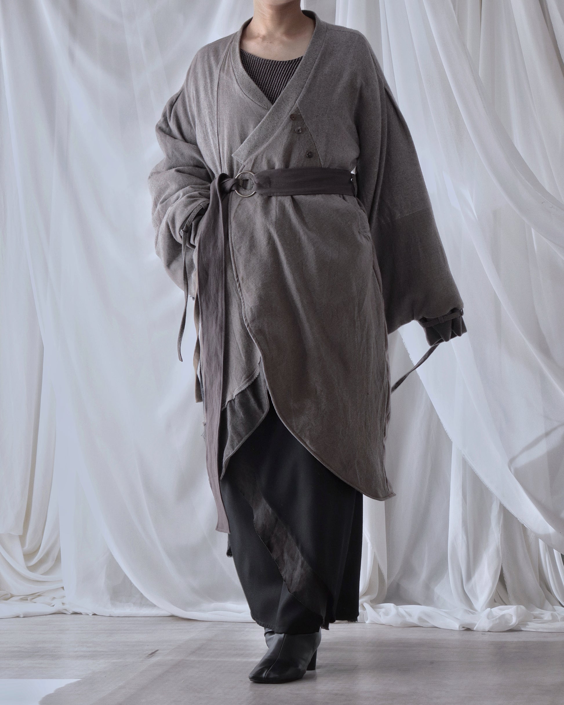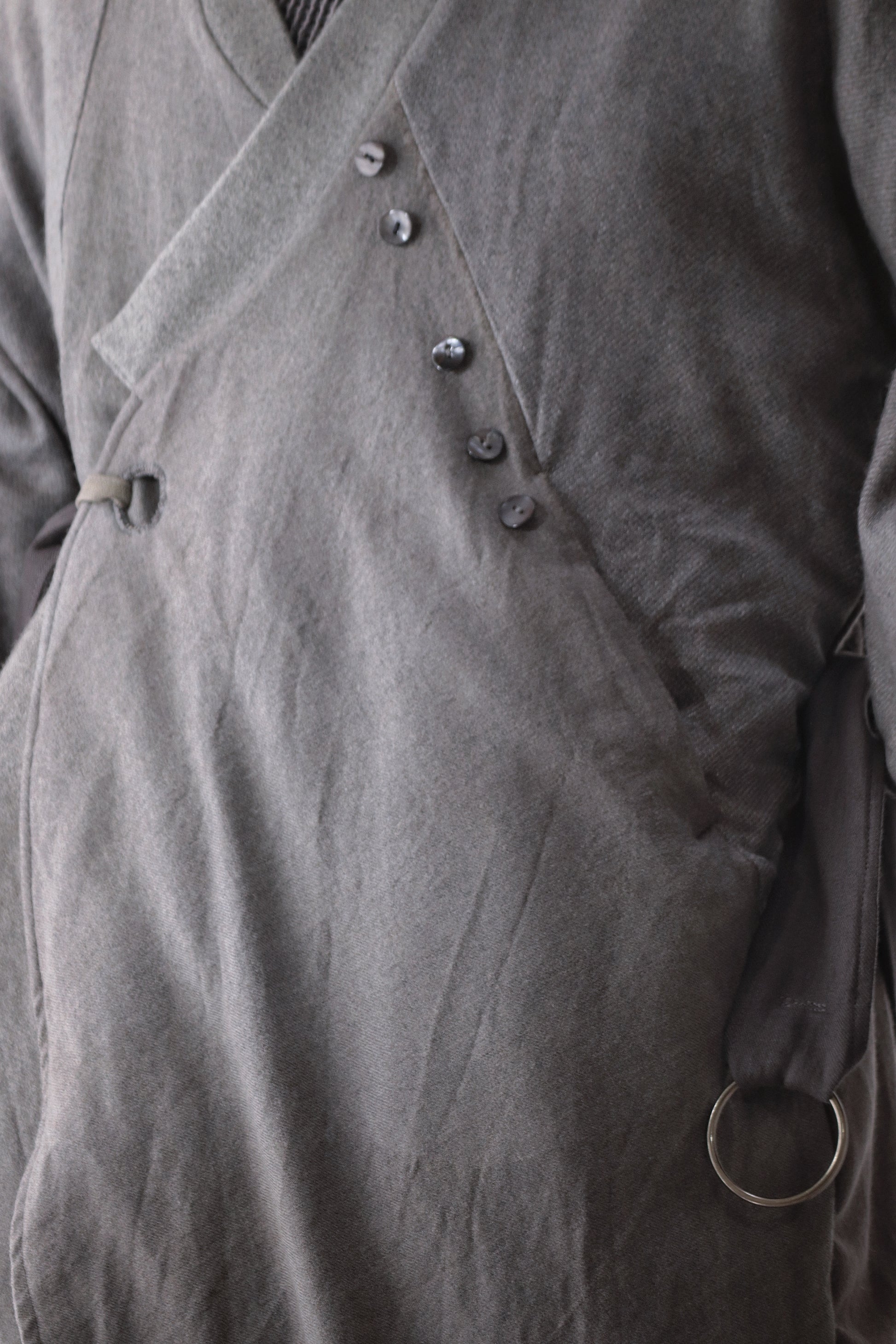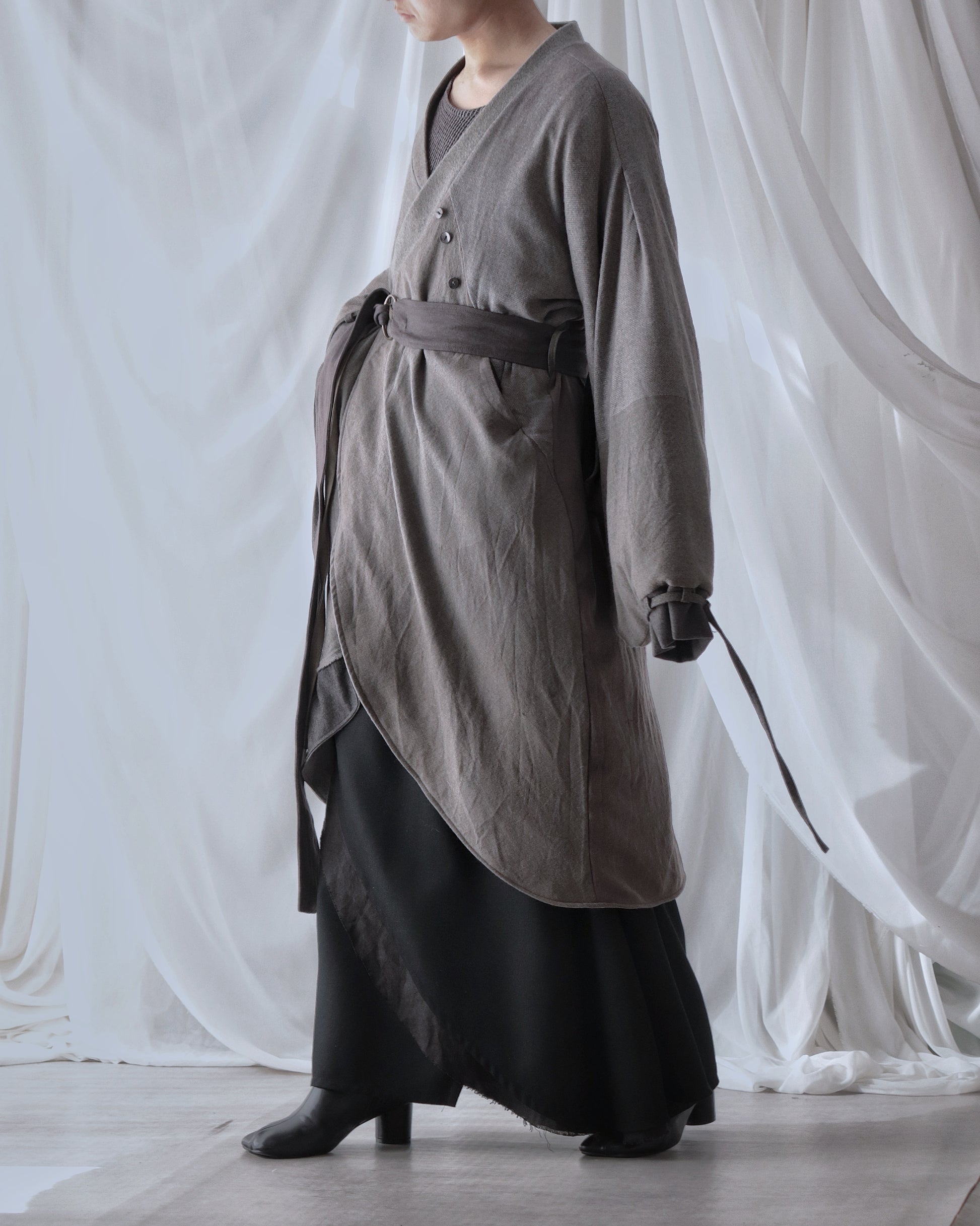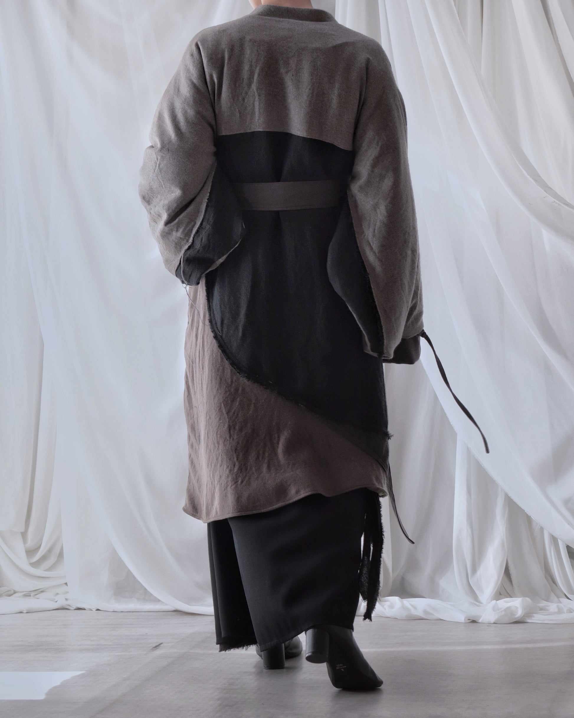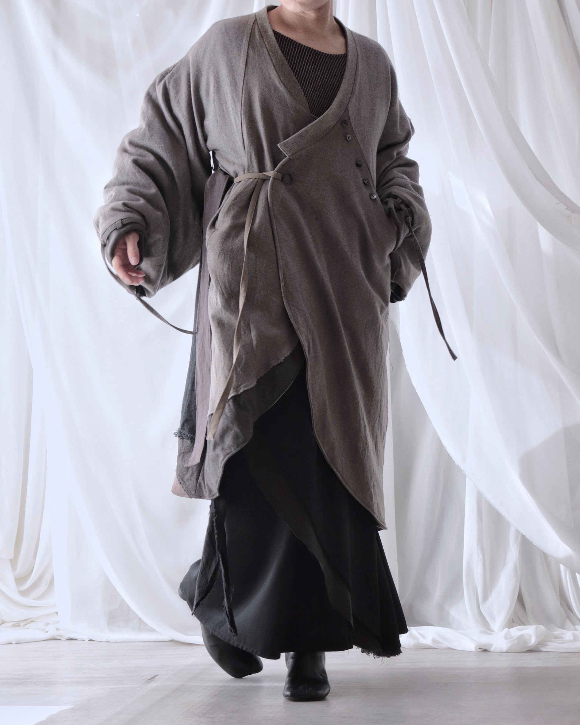 8種の、柔らかく軽めのウールを合わせ、染め、中綿をキュプラ裏地で縫い閉じた総裏地付き。