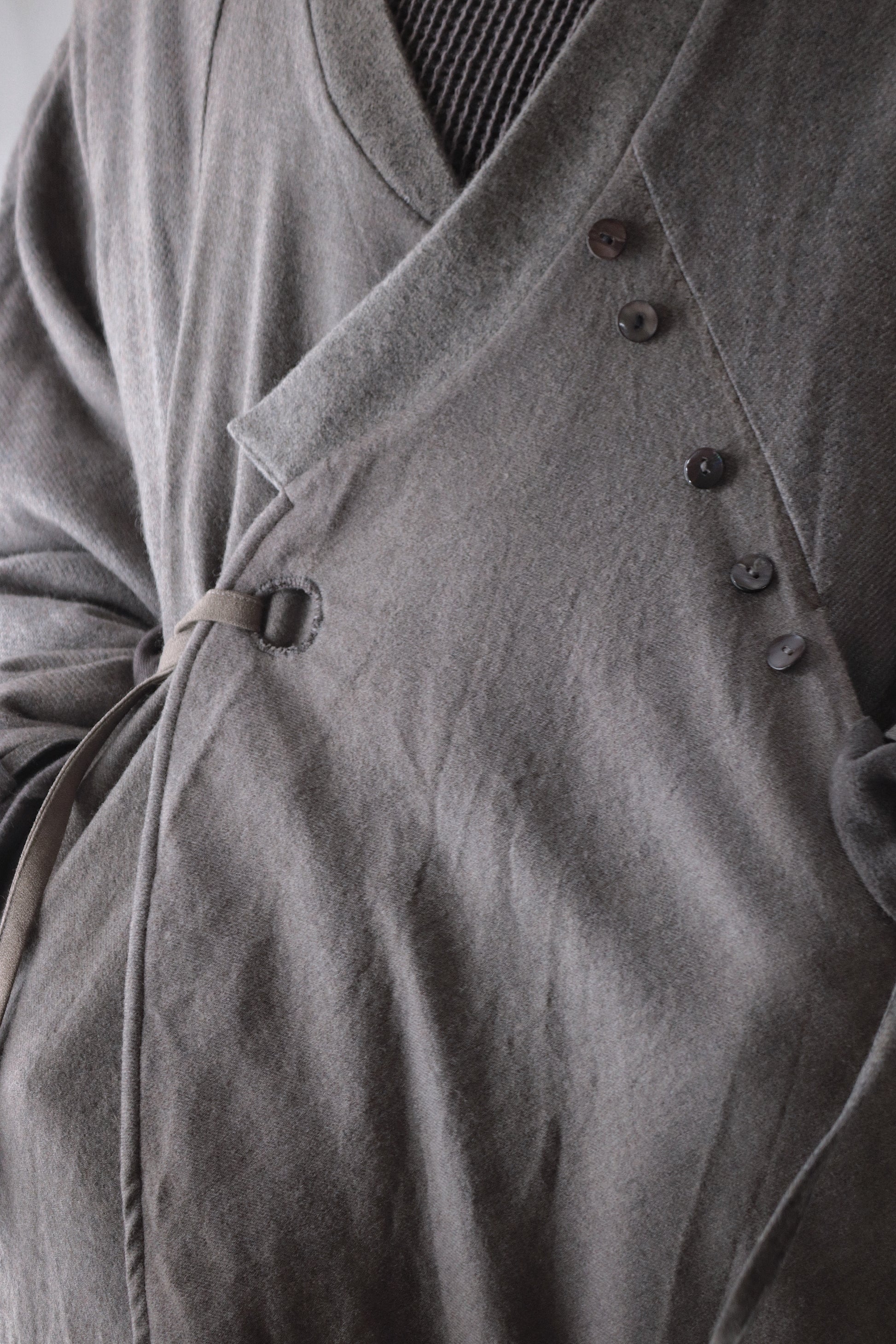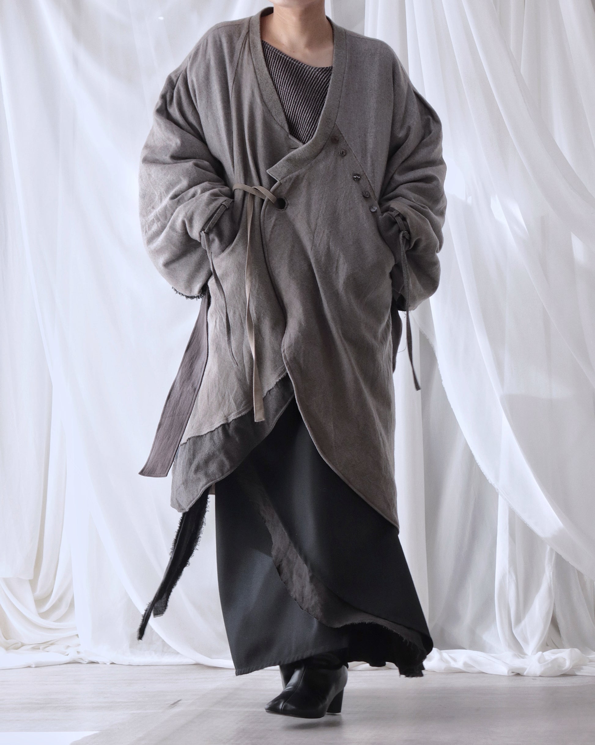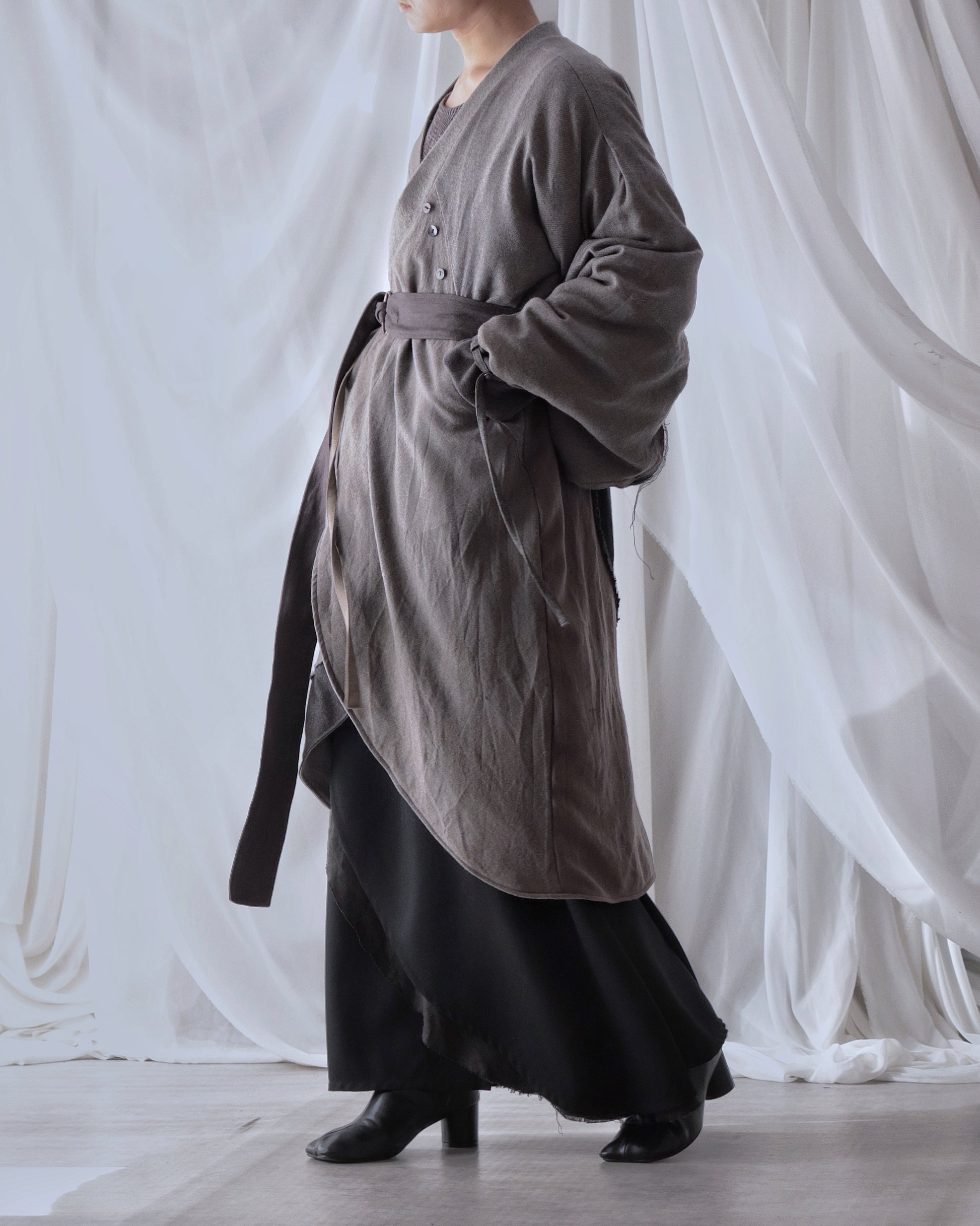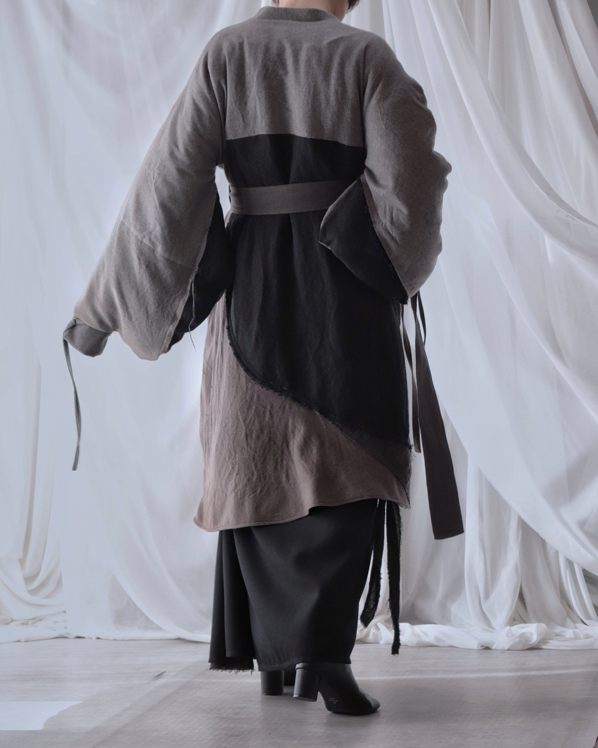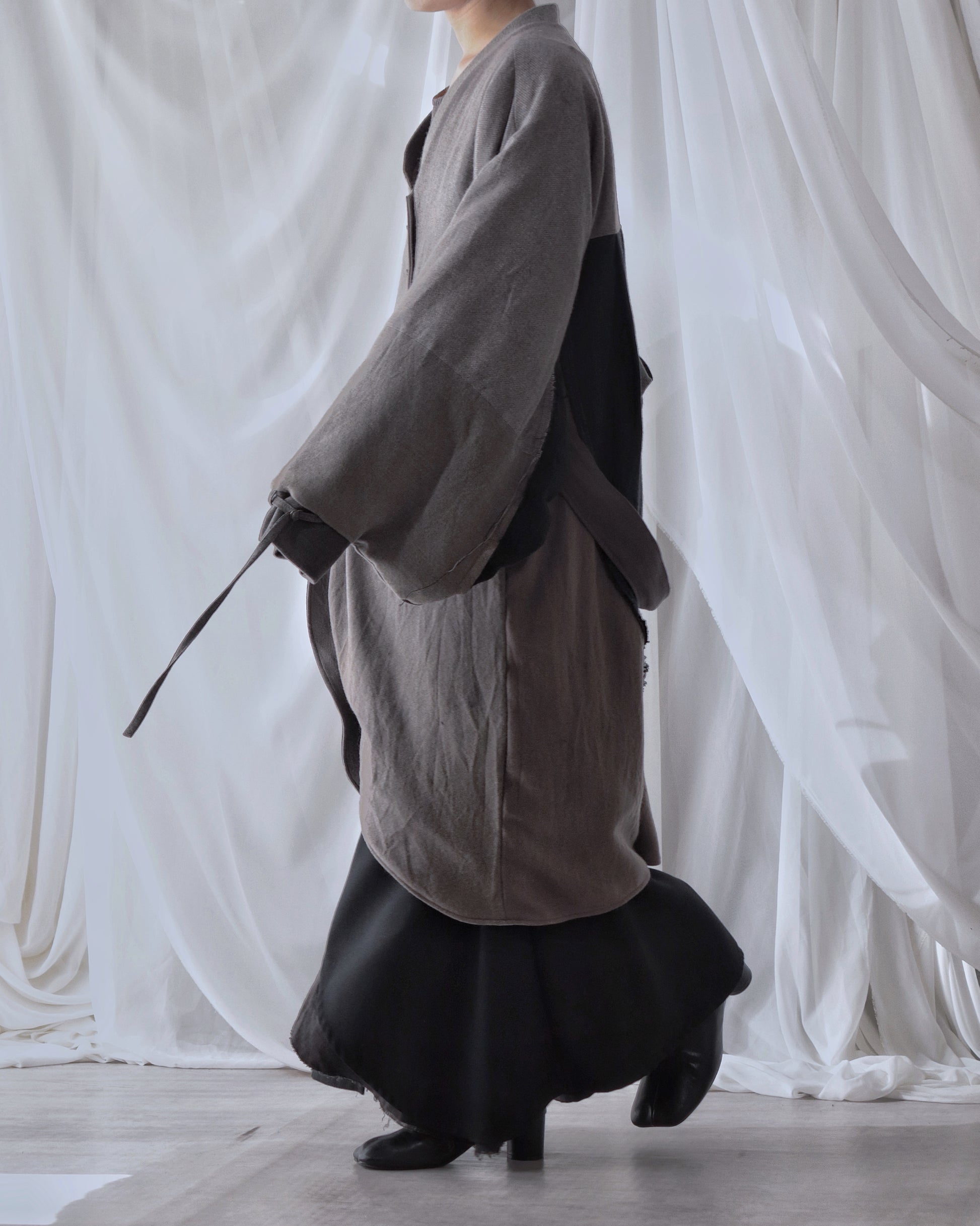 8種の、柔らかく軽めのウールを合わせ、染め、中綿をキュプラ裏地で縫い閉じた総裏地付き。