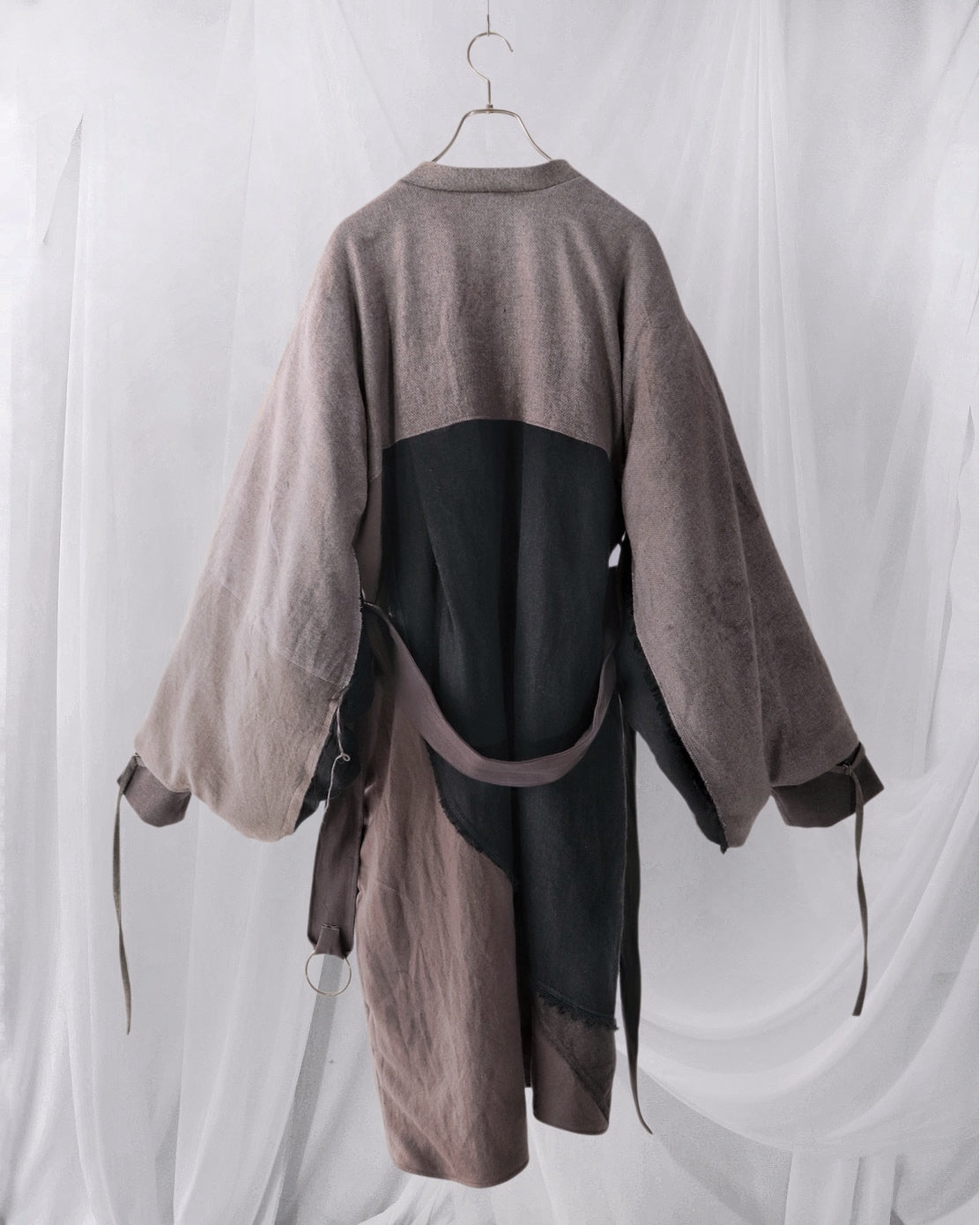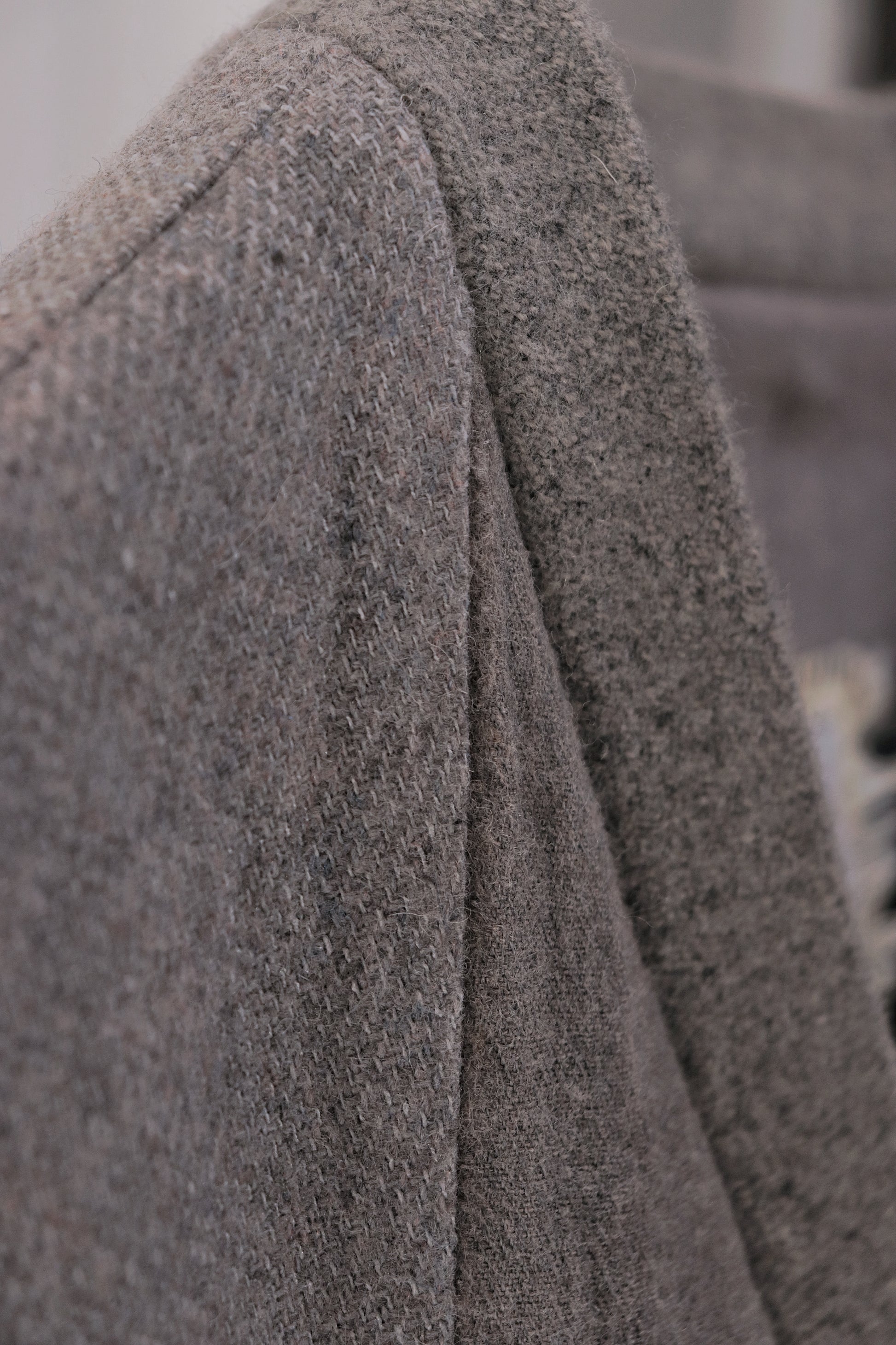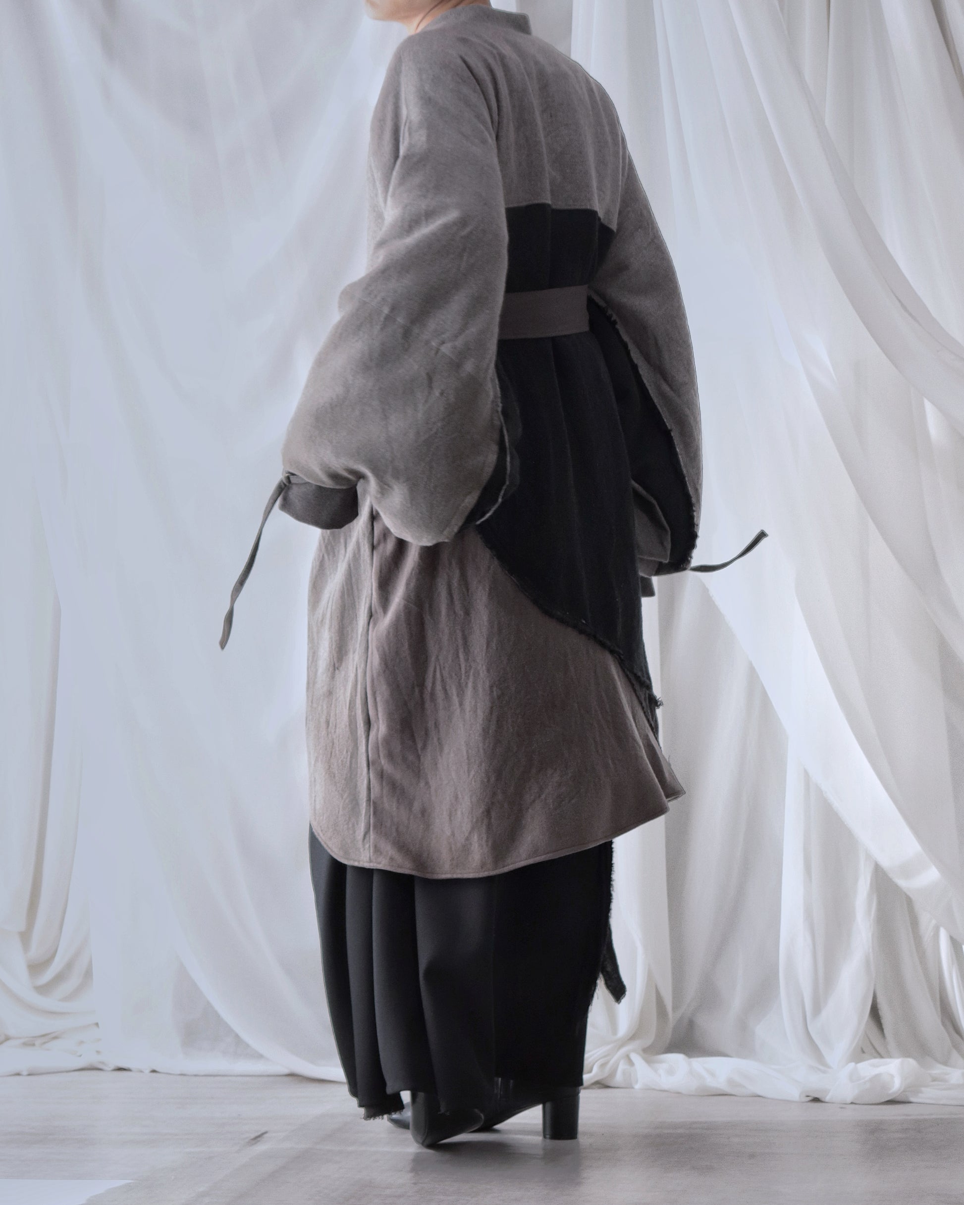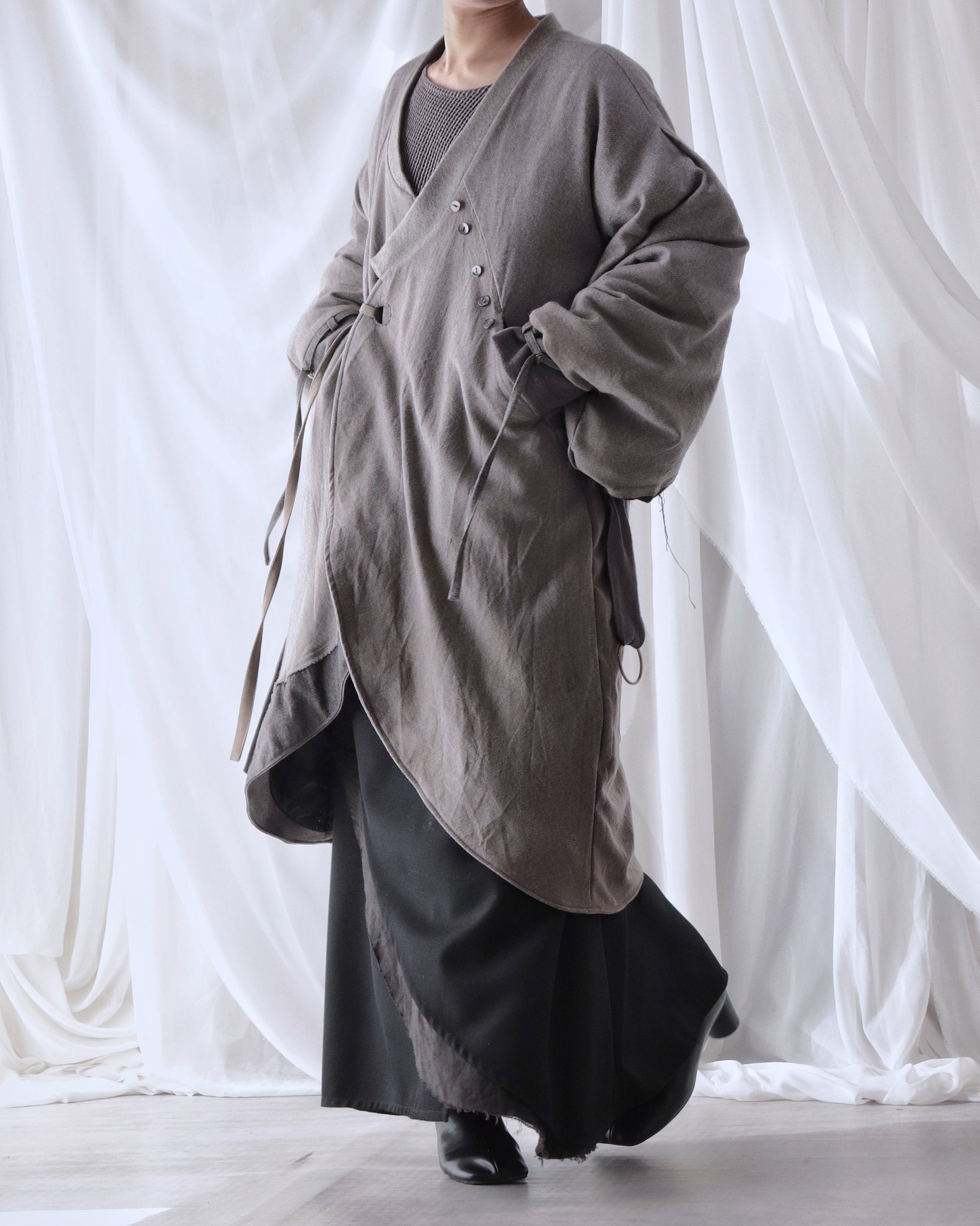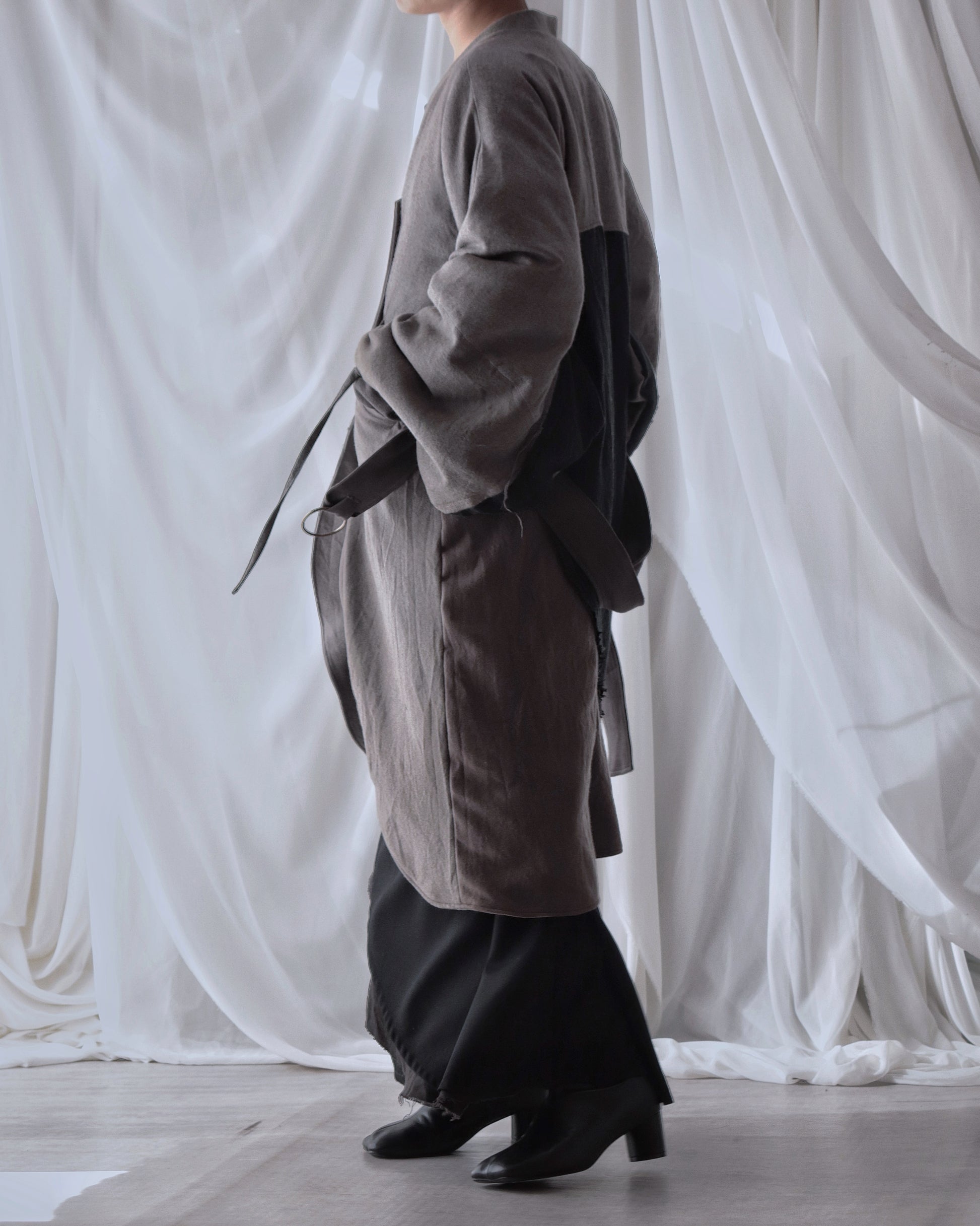 8種の、柔らかく軽めのウールを合わせ、染め、中綿をキュプラ裏地で縫い閉じた総裏地付き。