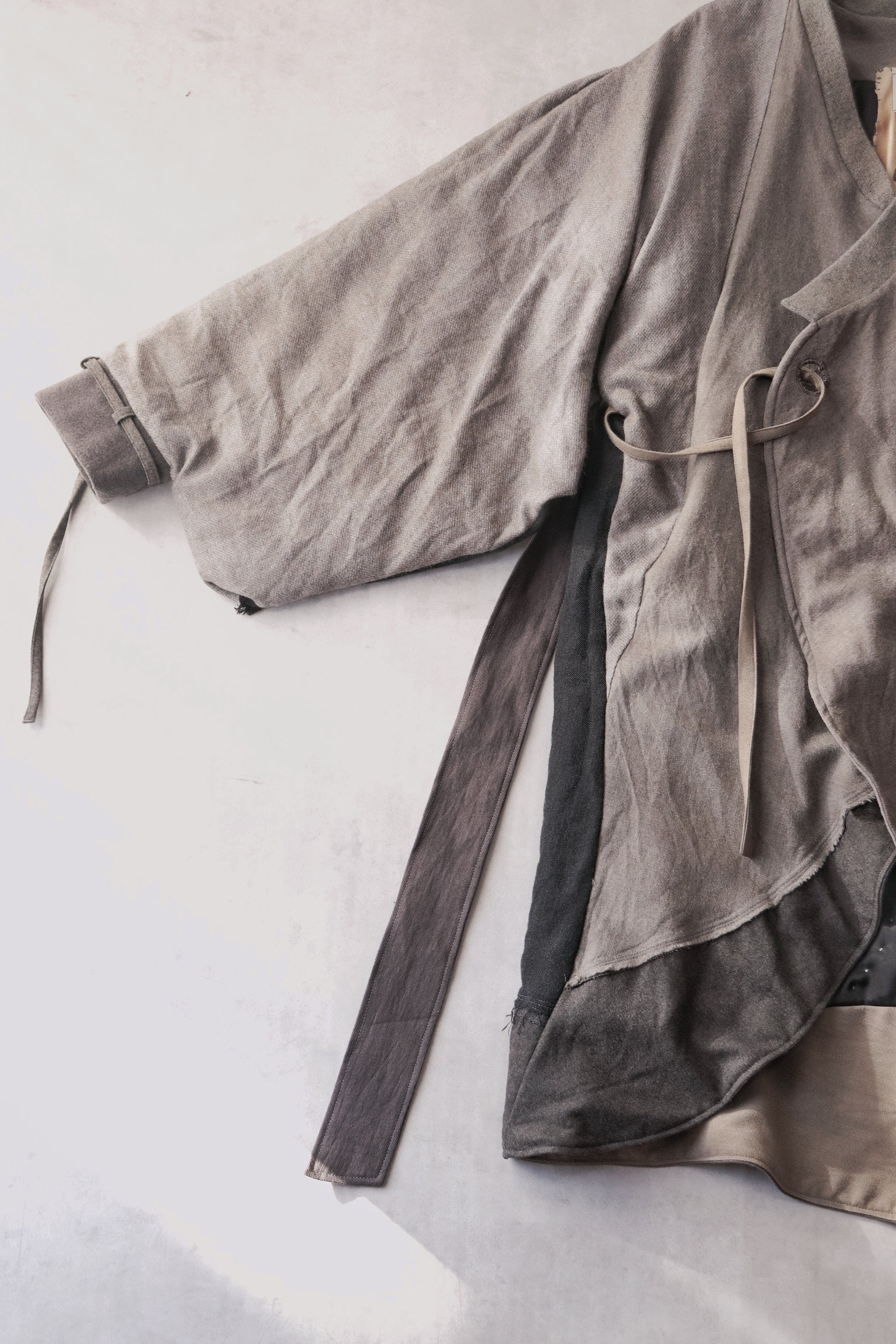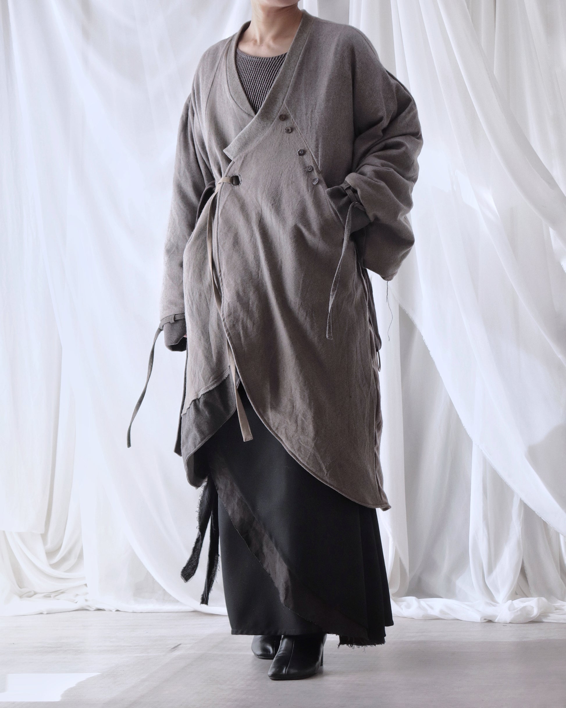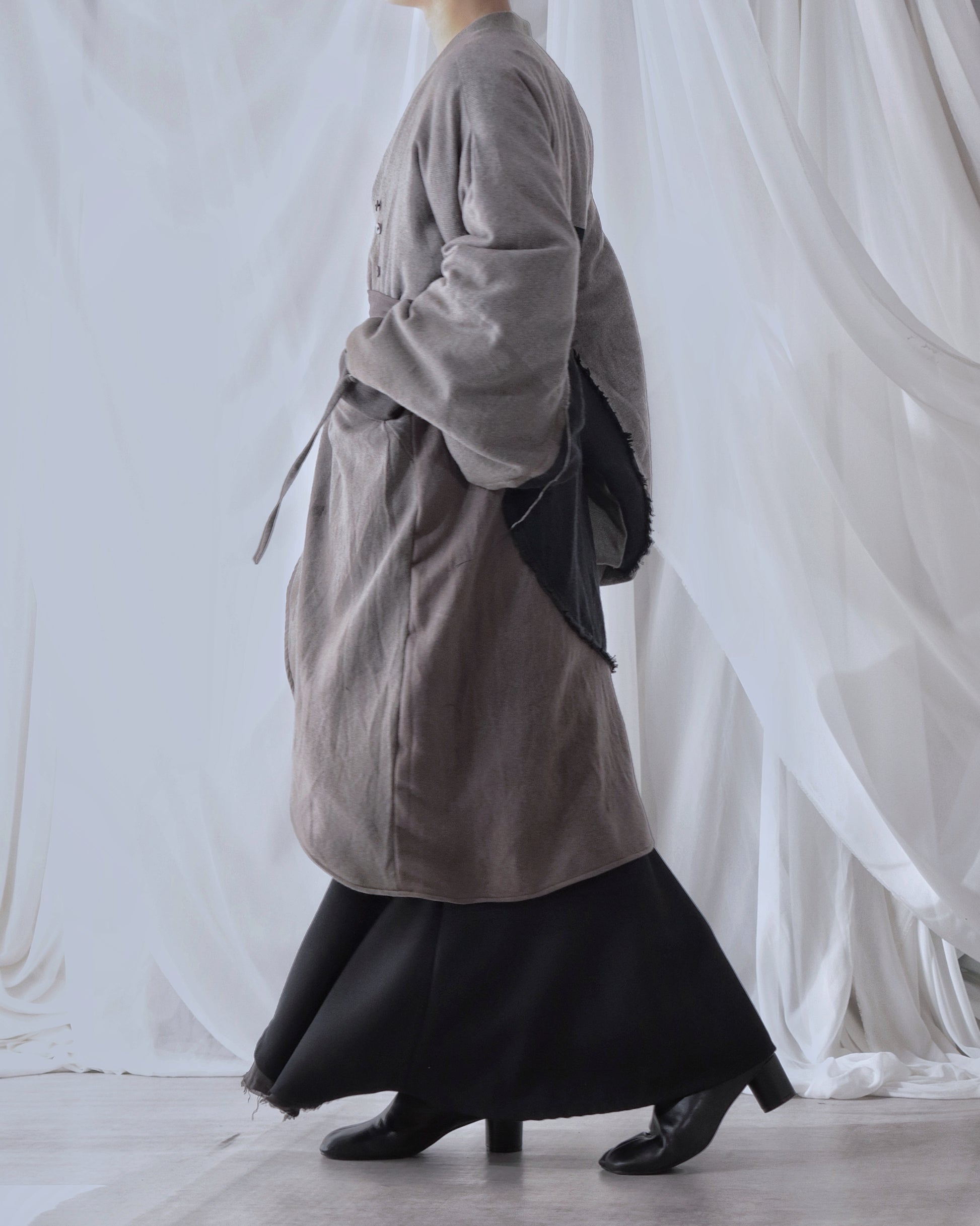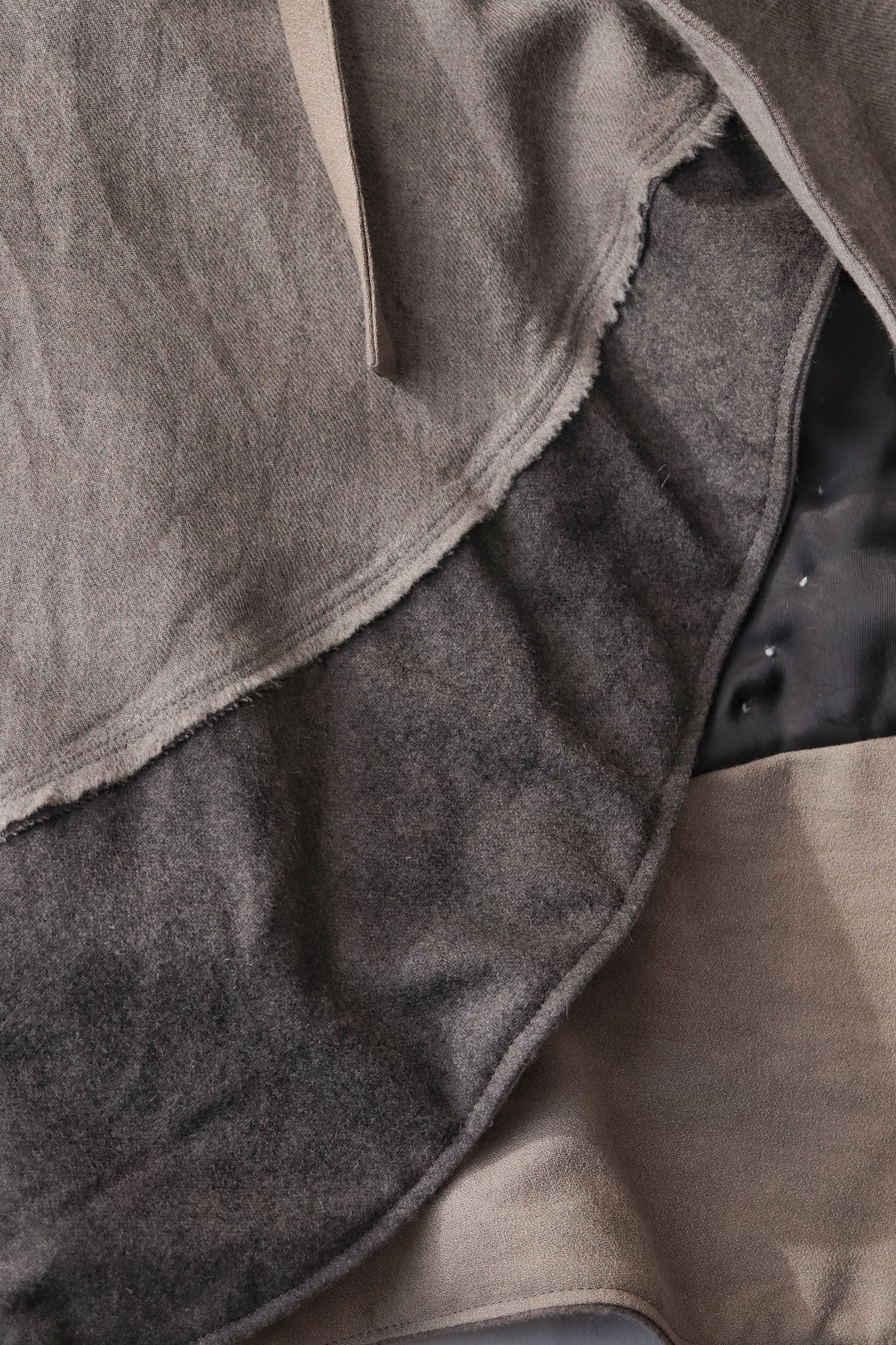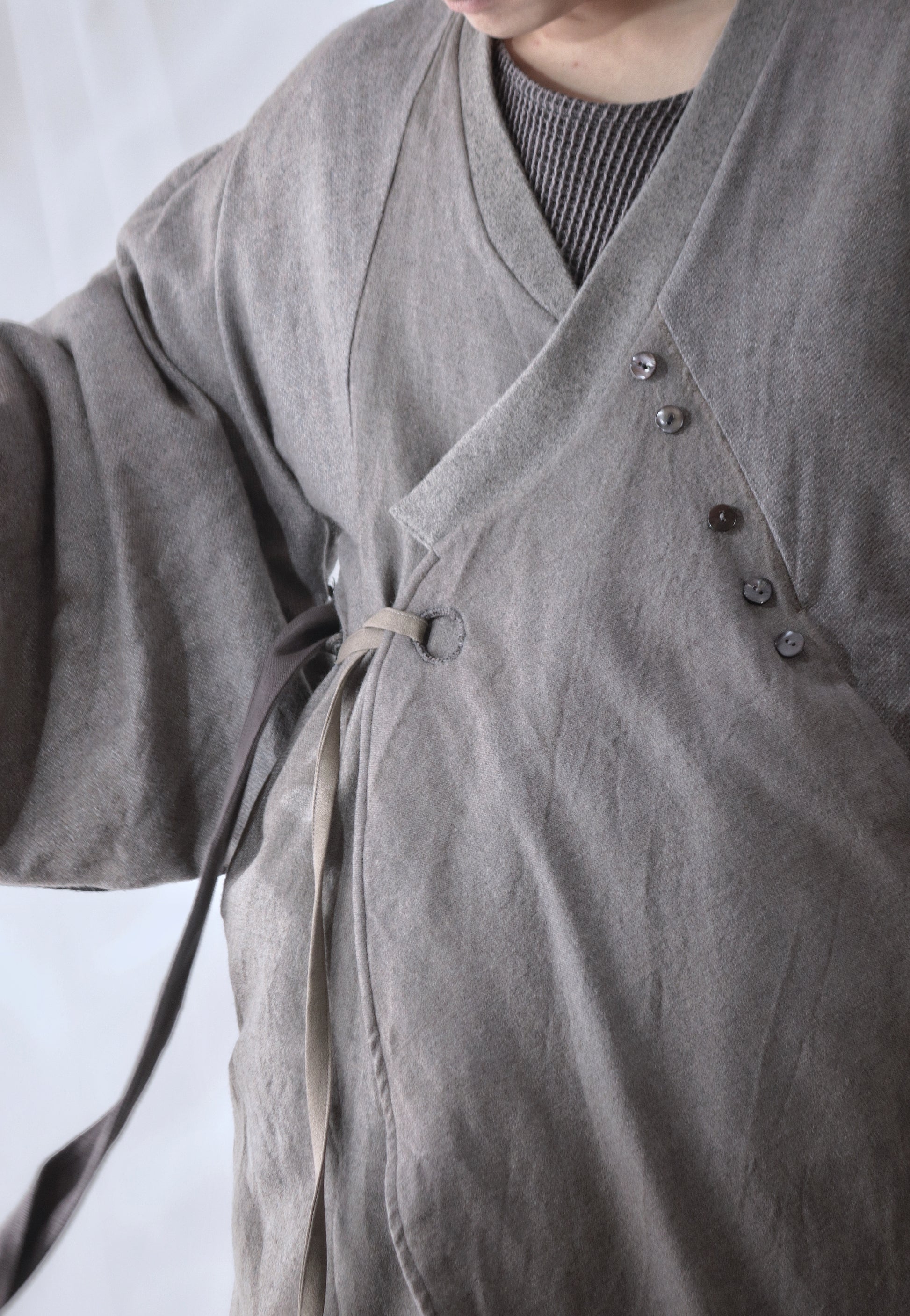 8種の、柔らかく軽めのウールを合わせ、染め、中綿をキュプラ裏地で縫い閉じた総裏地付き。