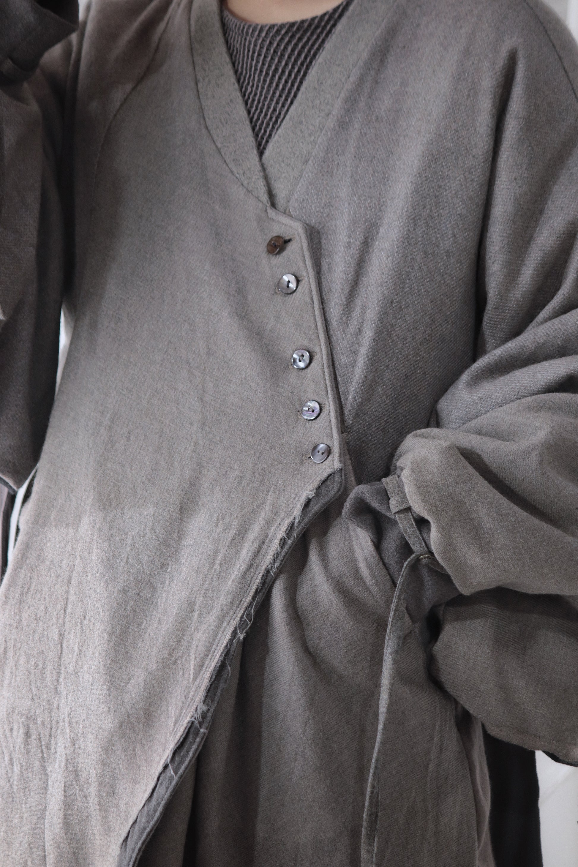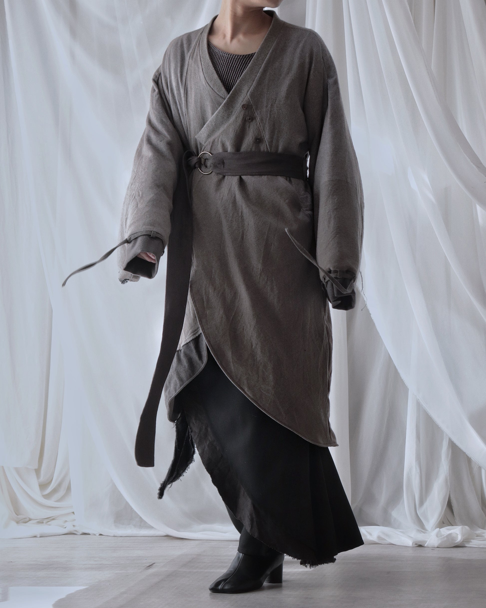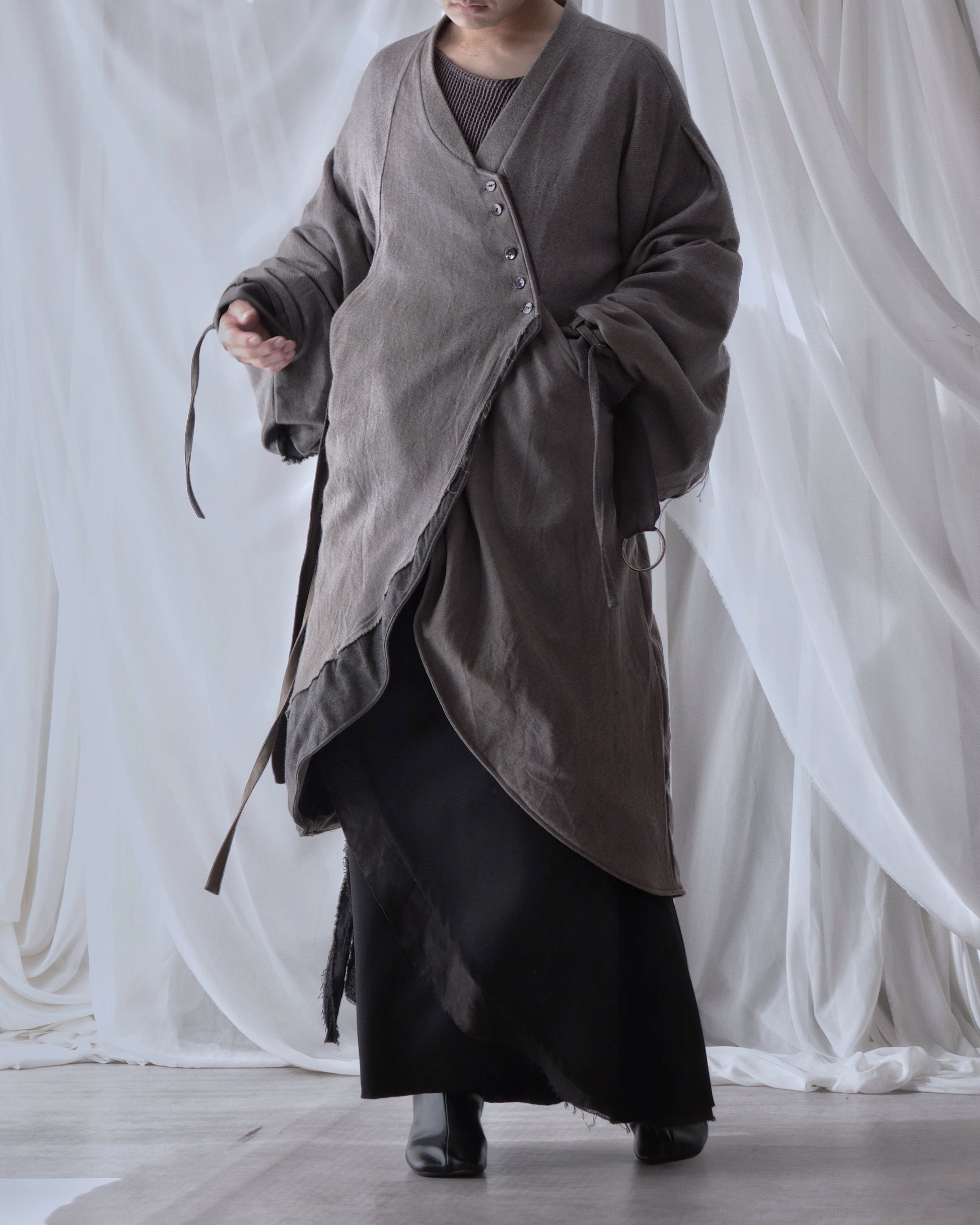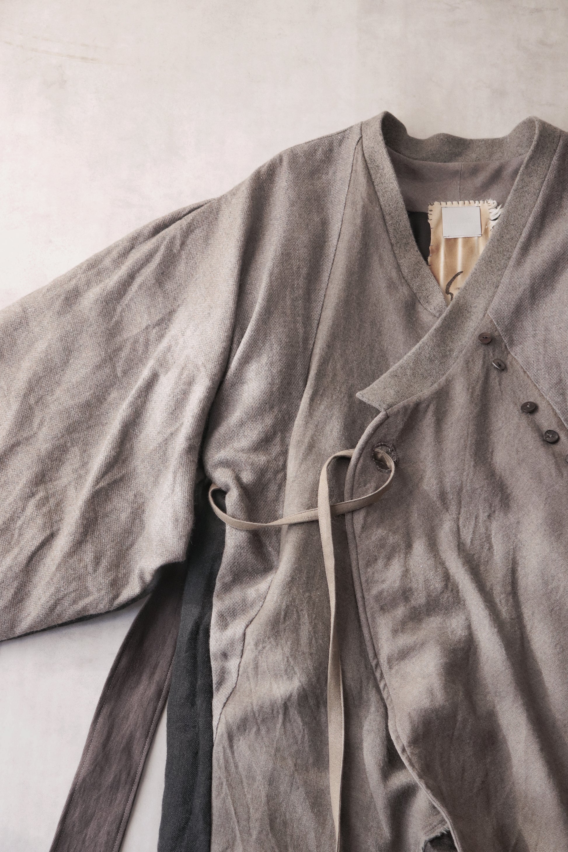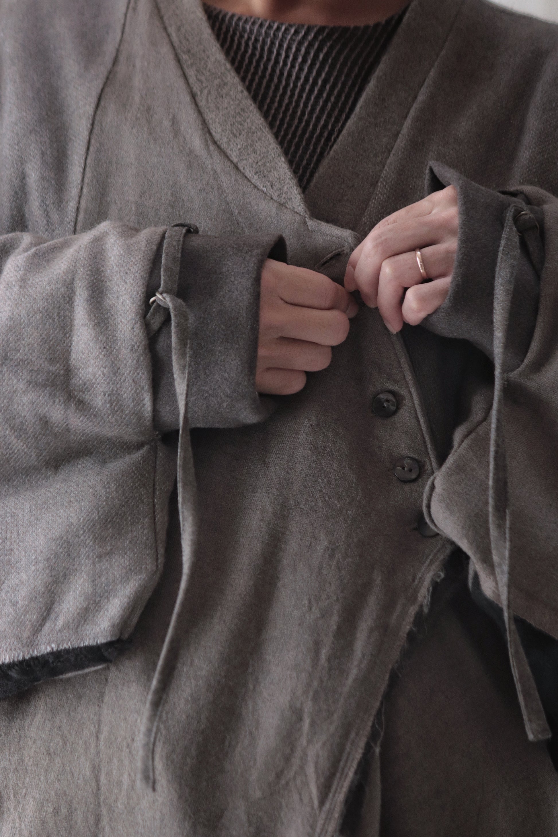 8種の、柔らかく軽めのウールを合わせ、染め、中綿をキュプラ裏地で縫い閉じた総裏地付き。
