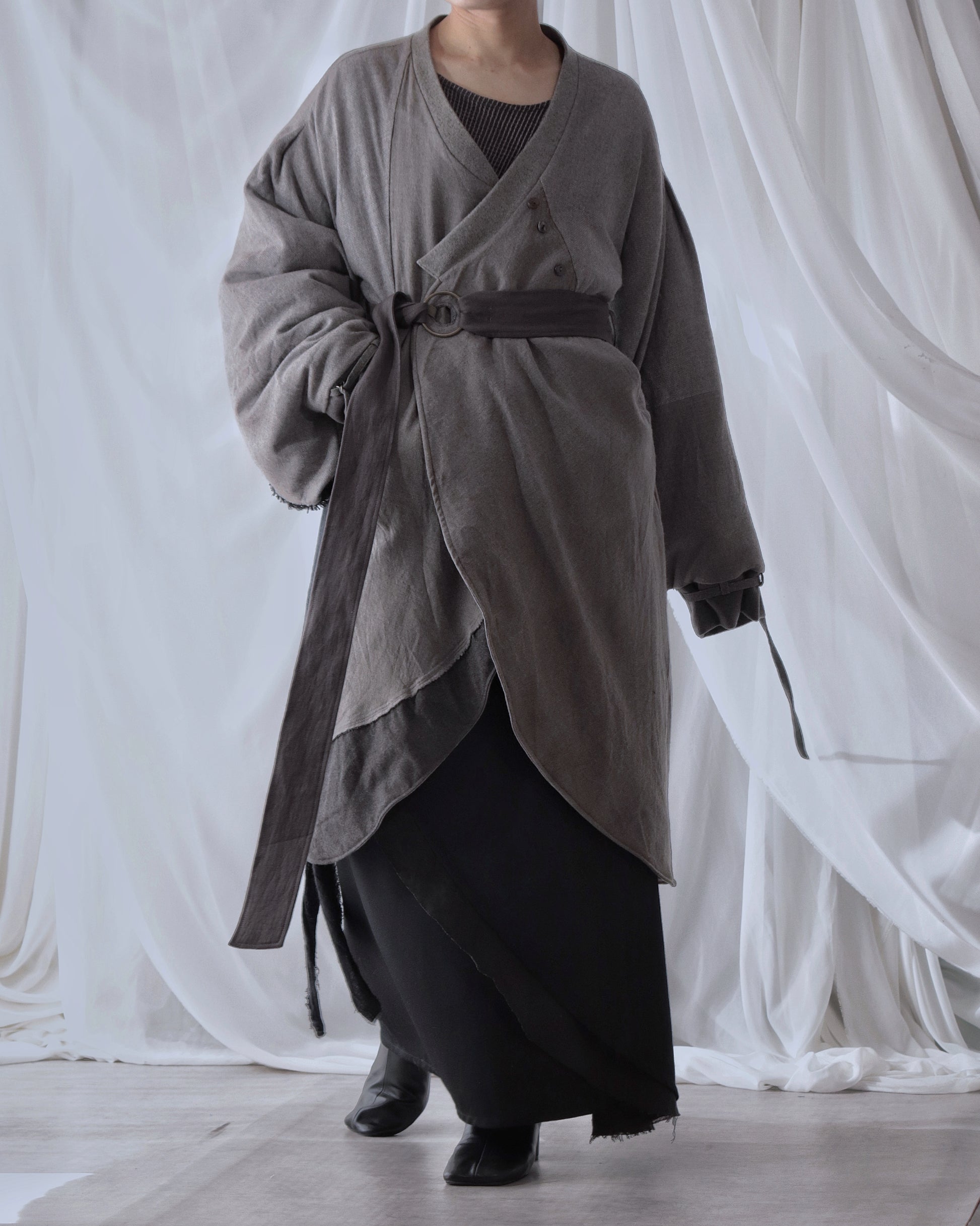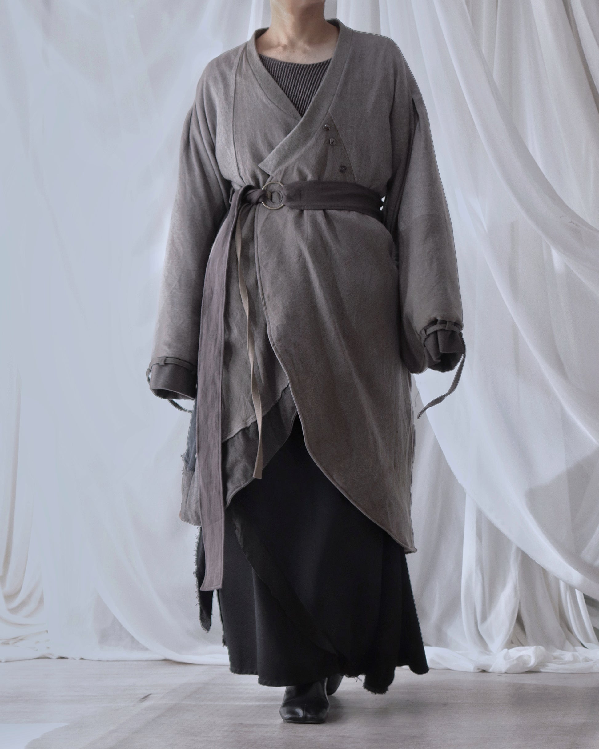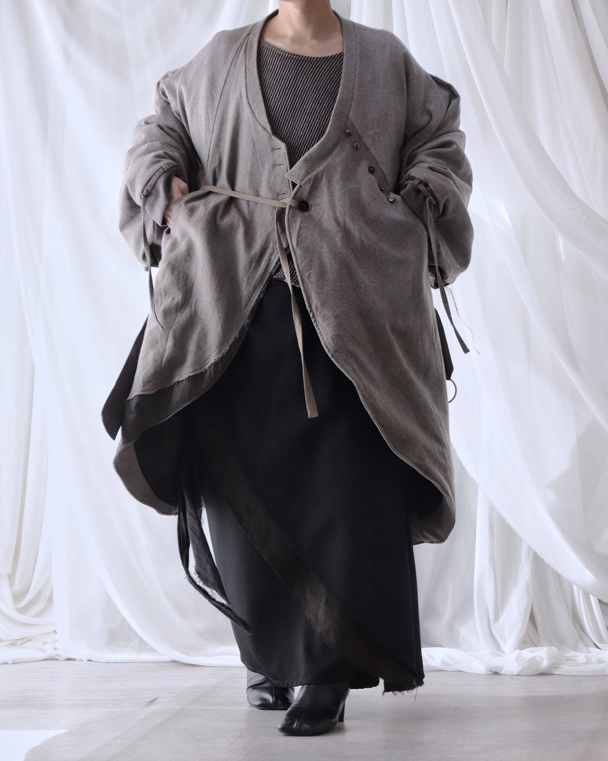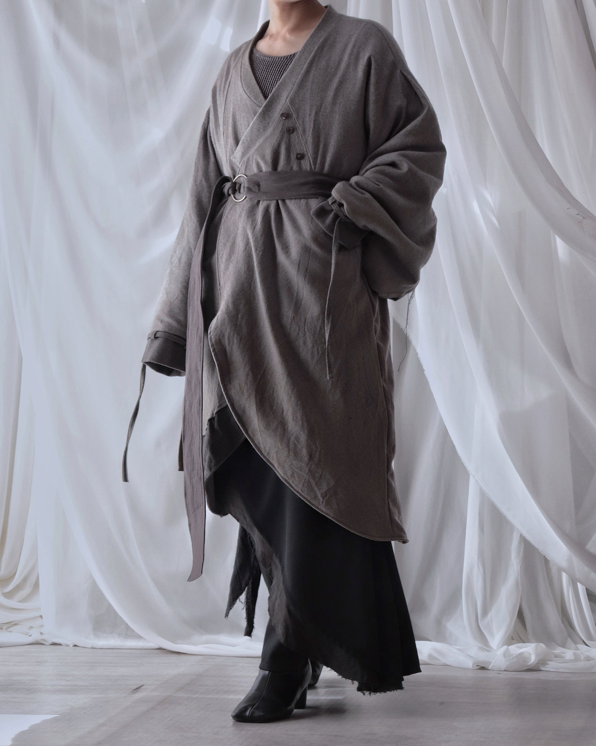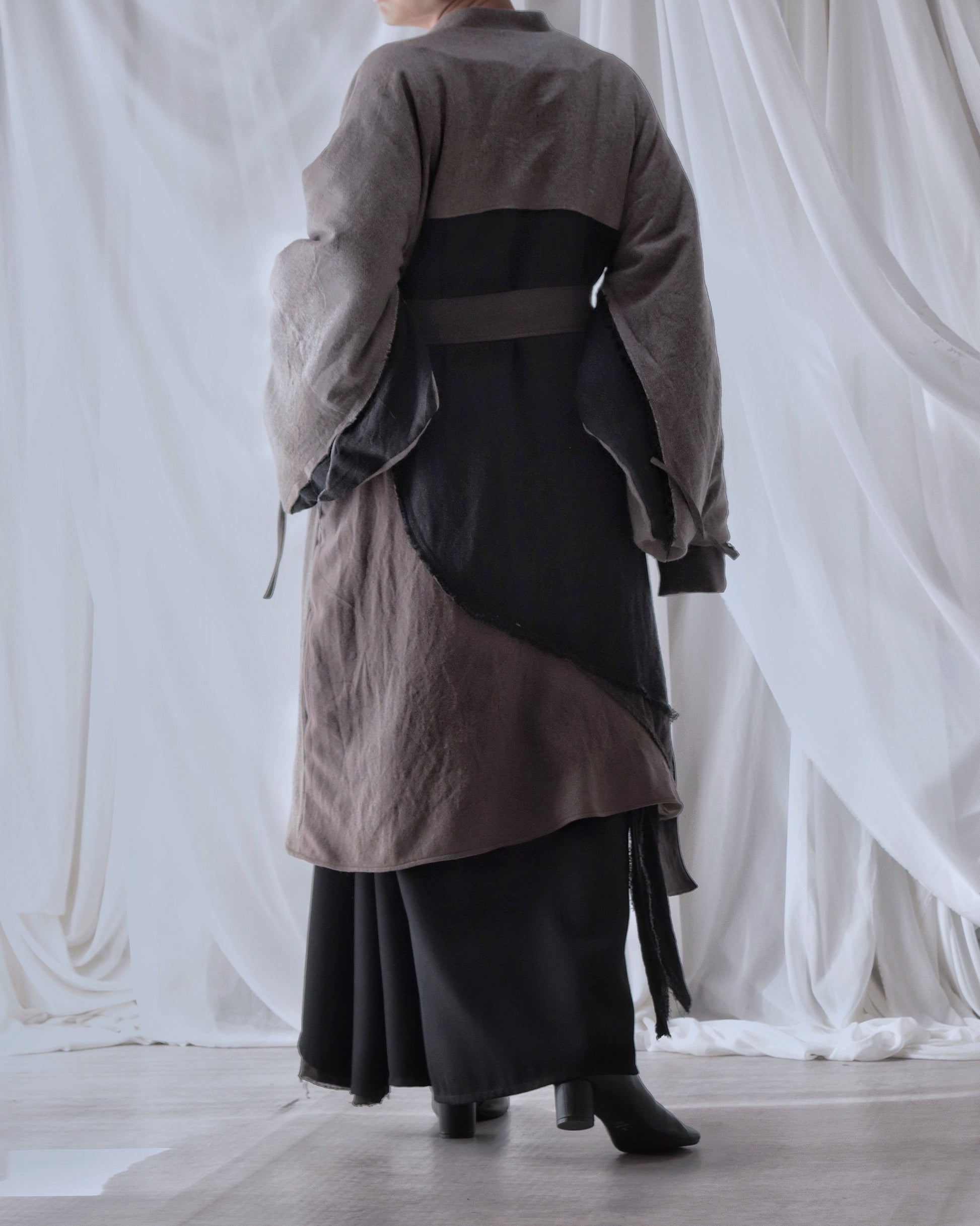 8種の、柔らかく軽めのウールを合わせ、染め、中綿をキュプラ裏地で縫い閉じた総裏地付き。