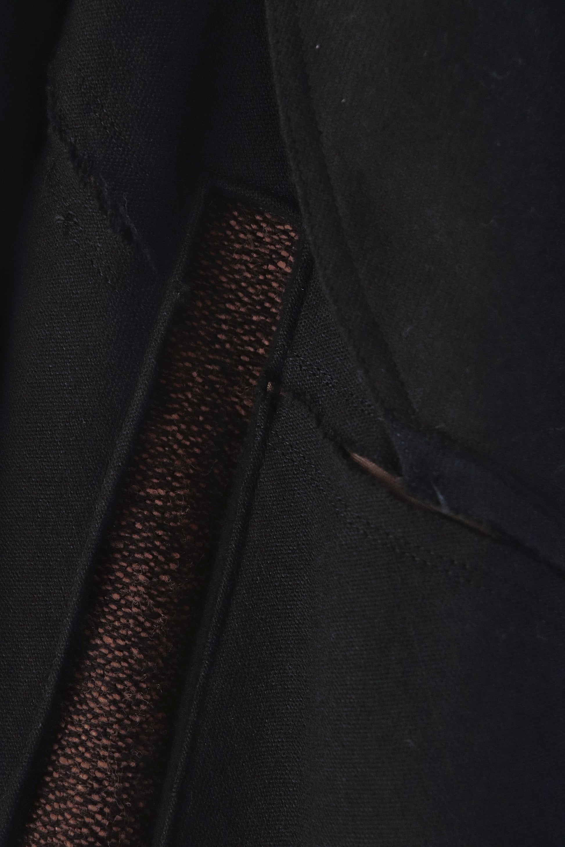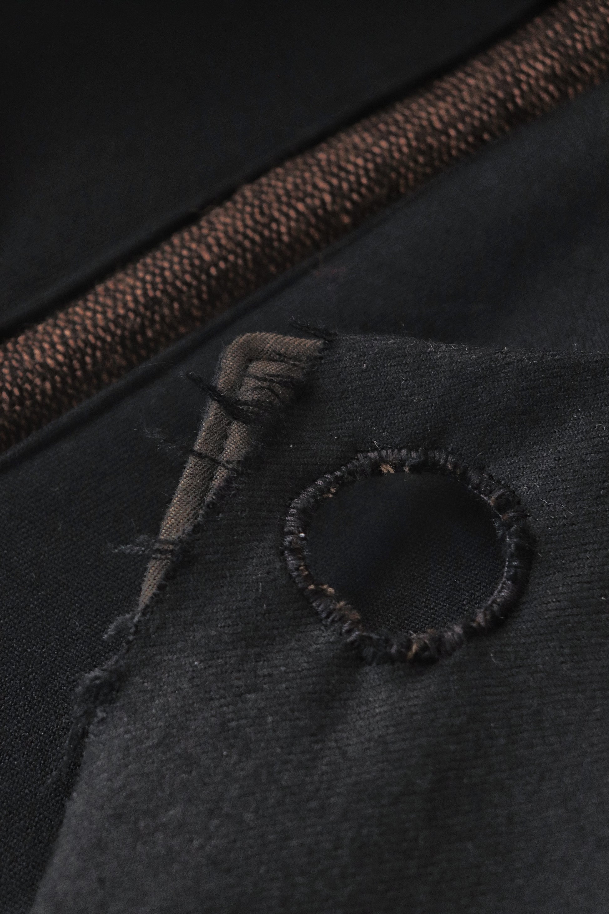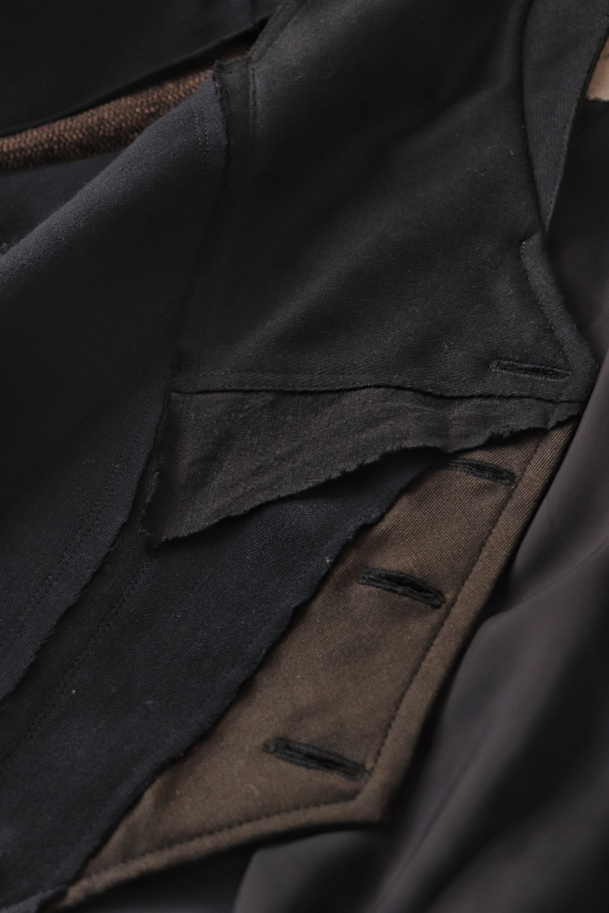 The sleeve linings are rayon velveteen, and the left back panel uses linen.