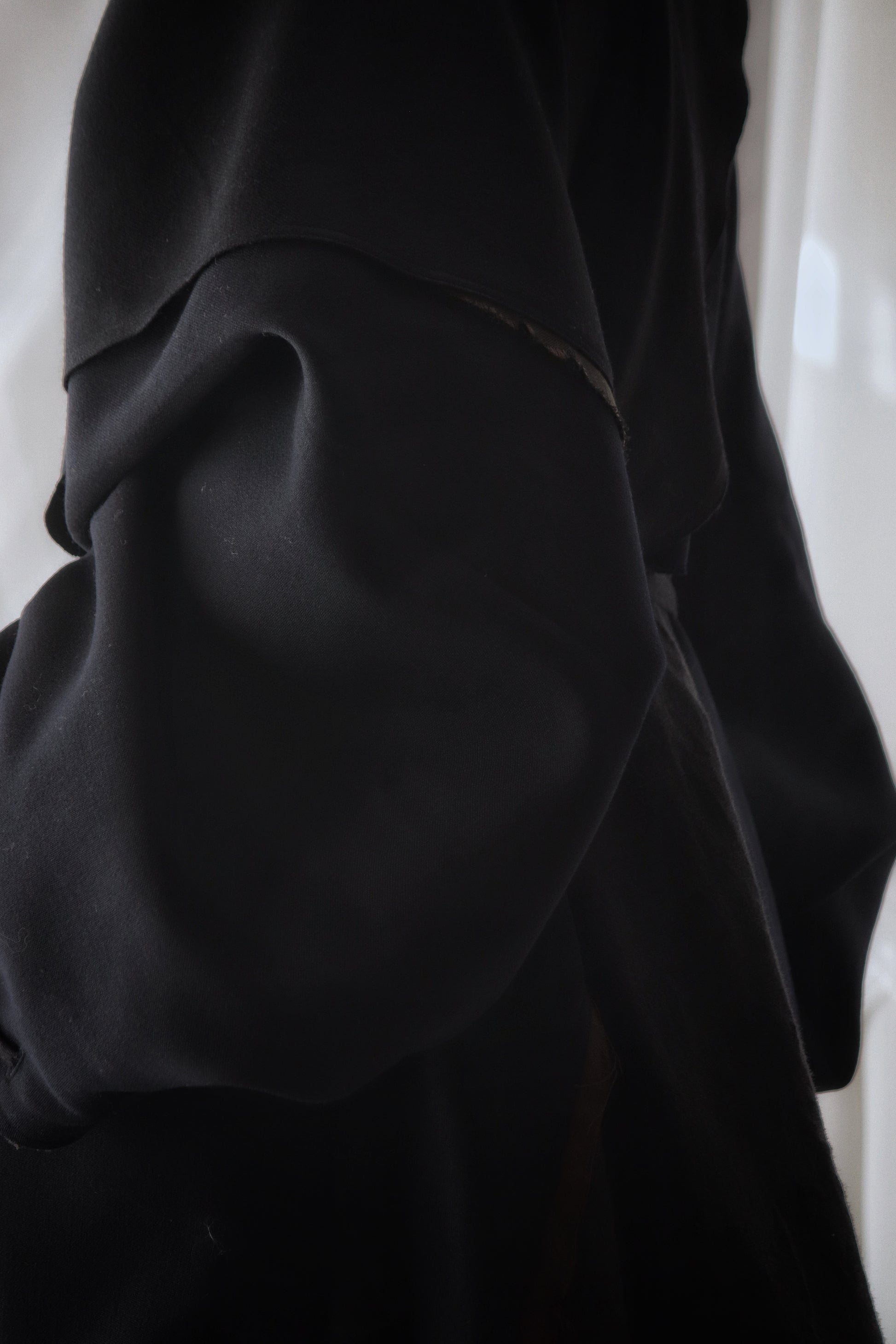 There is a tuck around the back of the sleeve at the elbow, giving the sleeve a loose, baggy shape.