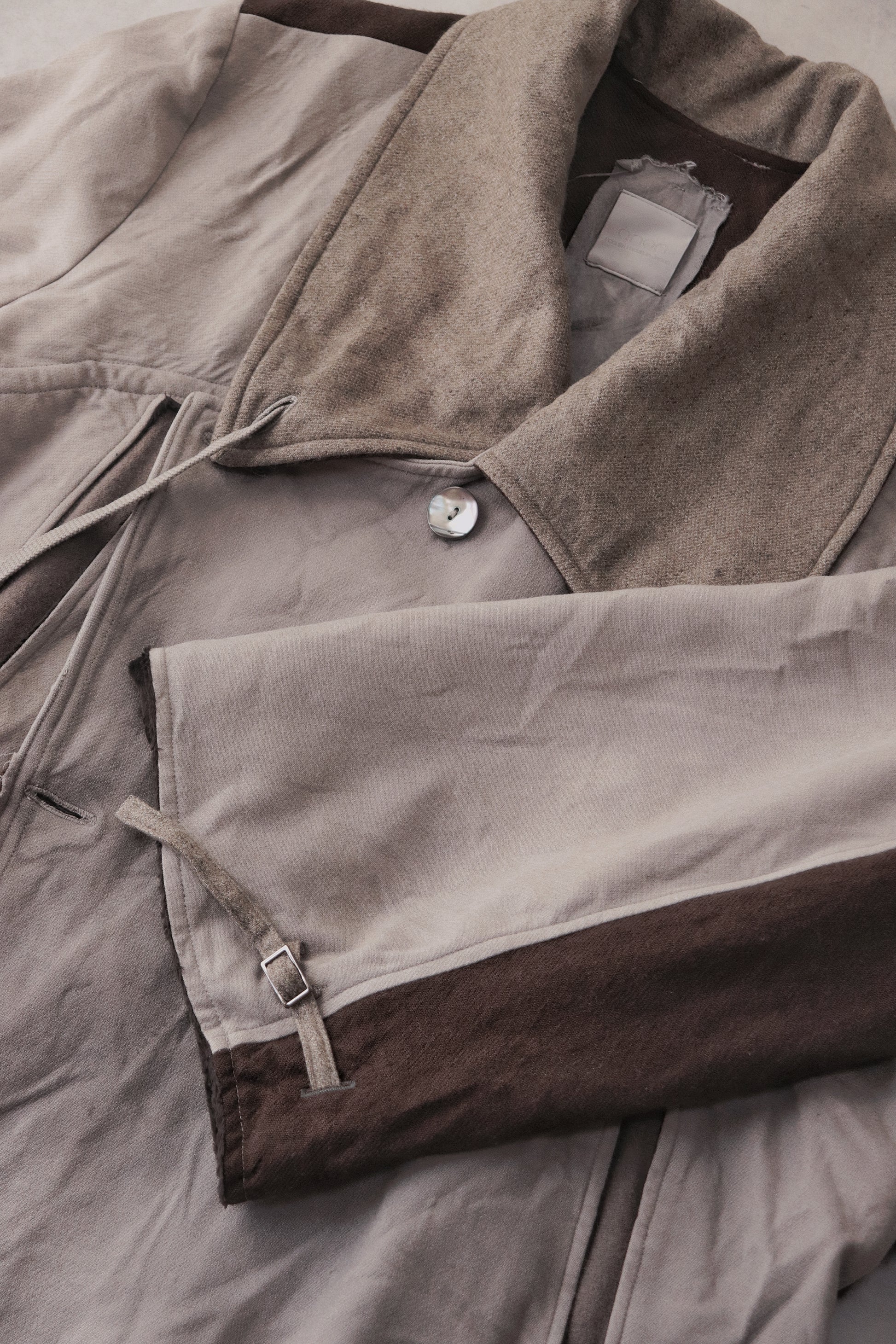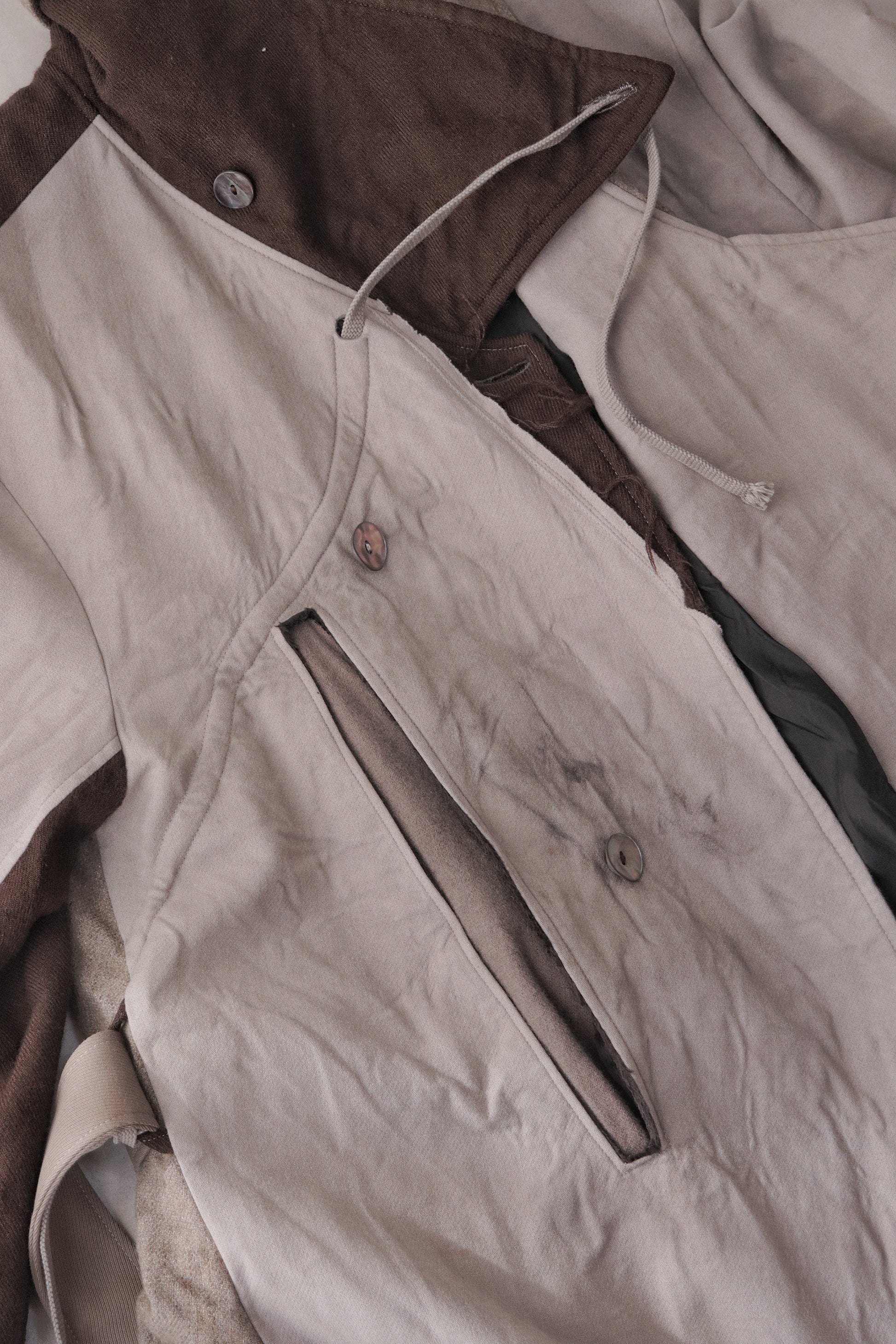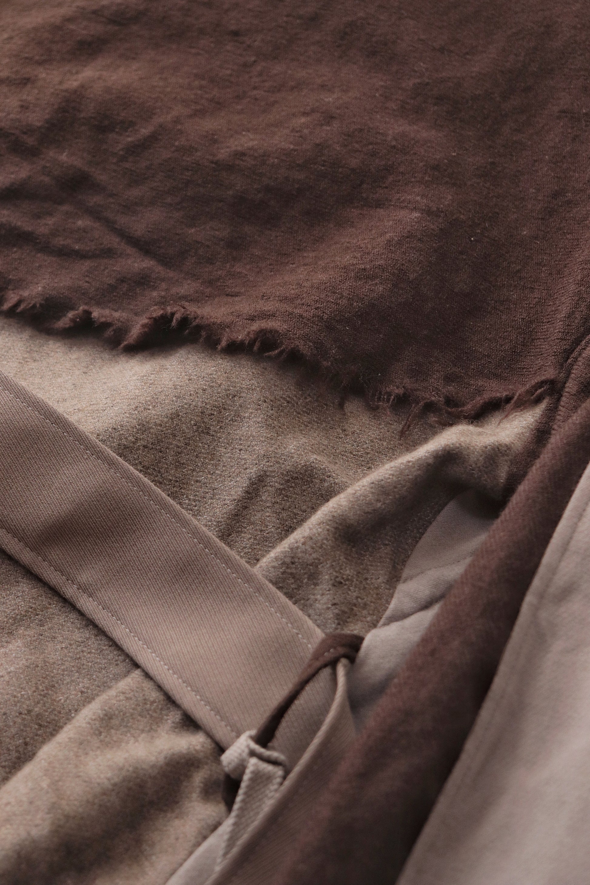 Pulling the cord at the right side of the collar draws in the garment toward the right side of the hem.